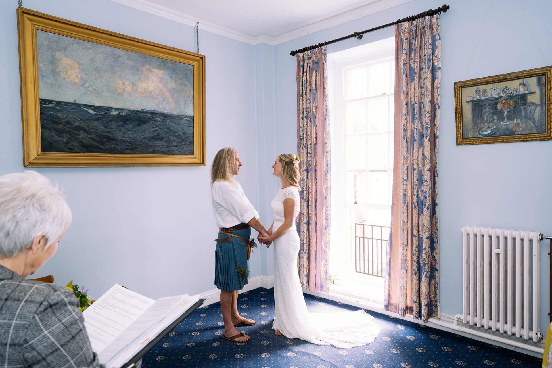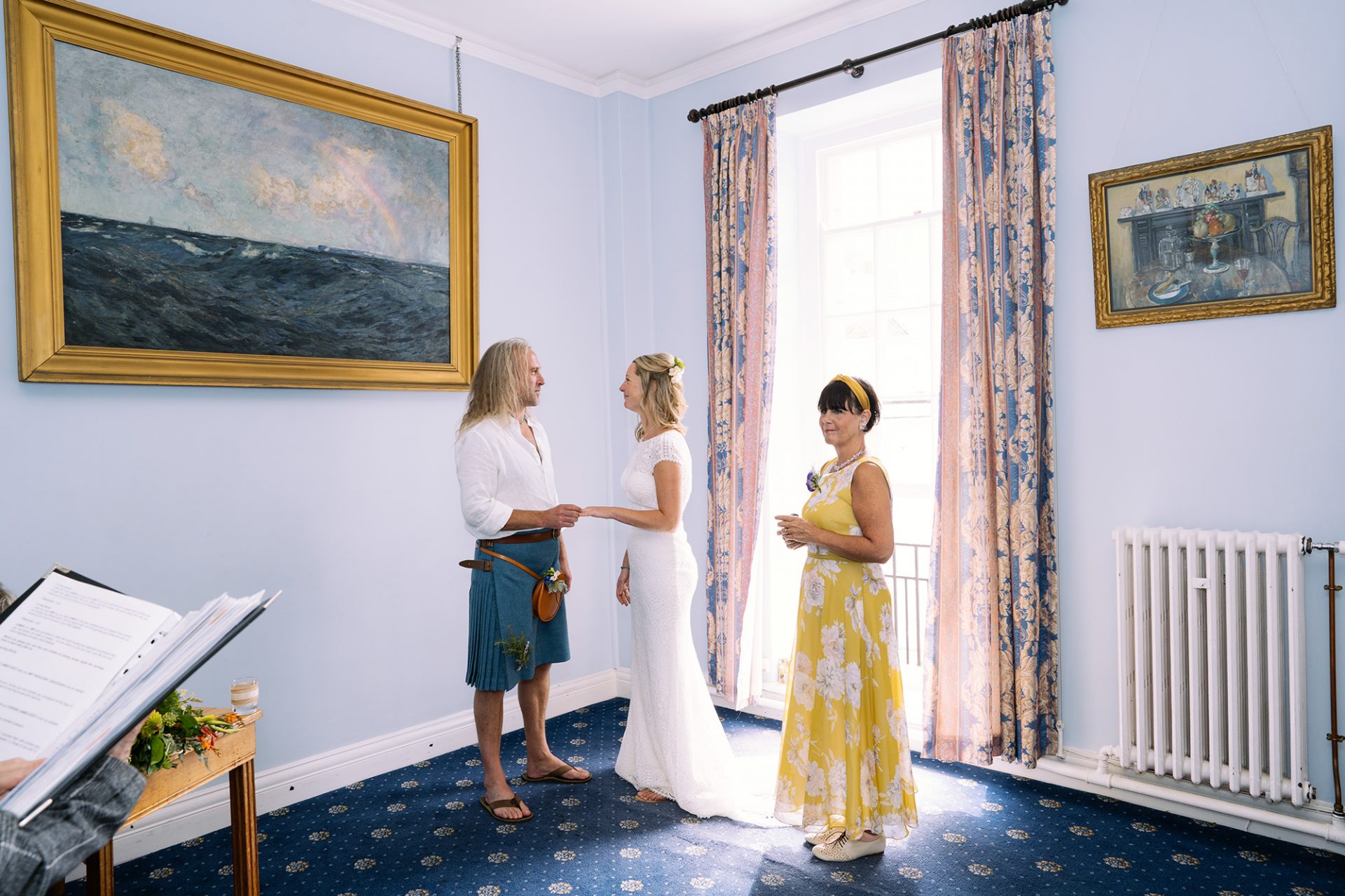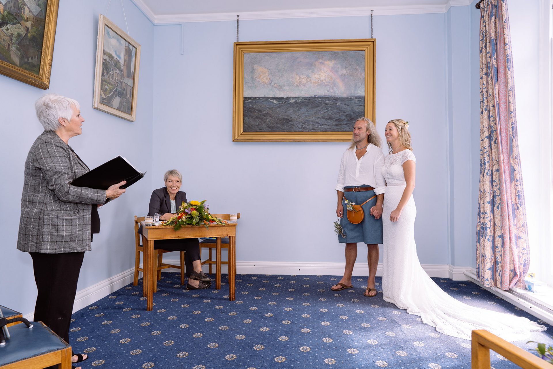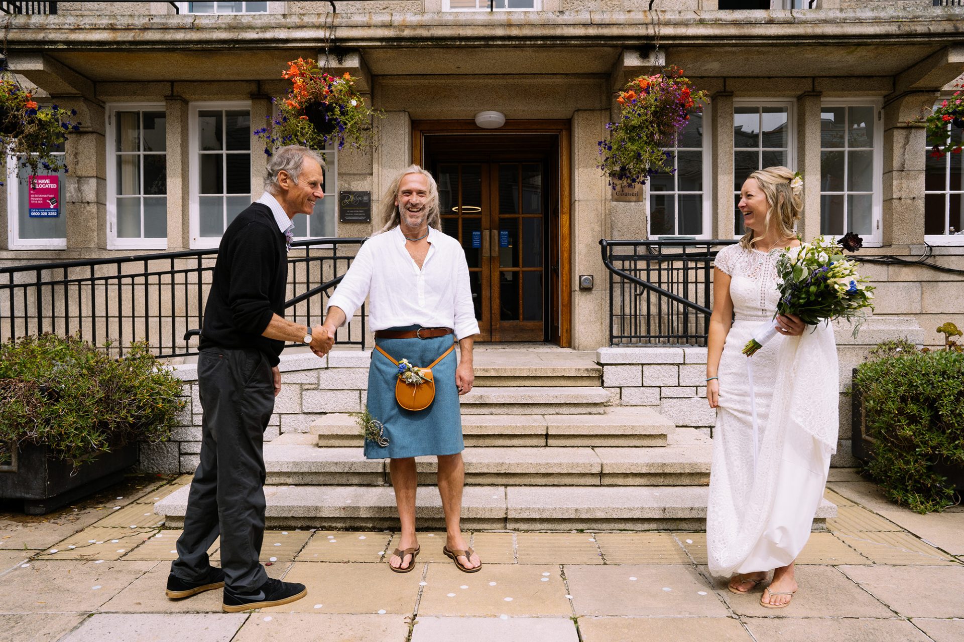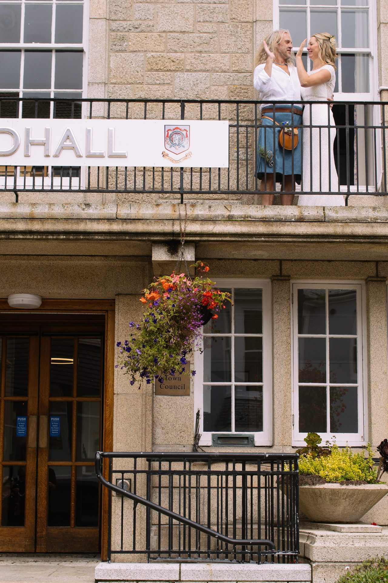 Amy and James got wed at St Ives Guildhall on a blustery summer’s day in Cornwall. I’ve known James Eddy for a fair old while now. Indeed, I already have some great memories of fun times with him. Therefore his own personal love story: ‘a tale of proposal and acceptance’ was music to my ears. He’d met a girl called Amy. They’d fallen in love. They were getting married. In other words the age old love story which meant it was a time for celebration! What better place for James and Amy to tie the knot than St Ives Guildhall.
