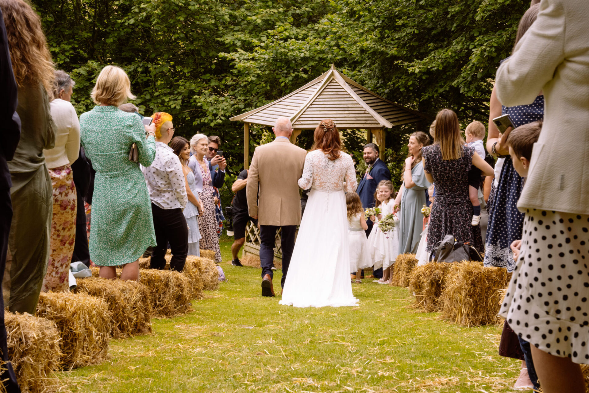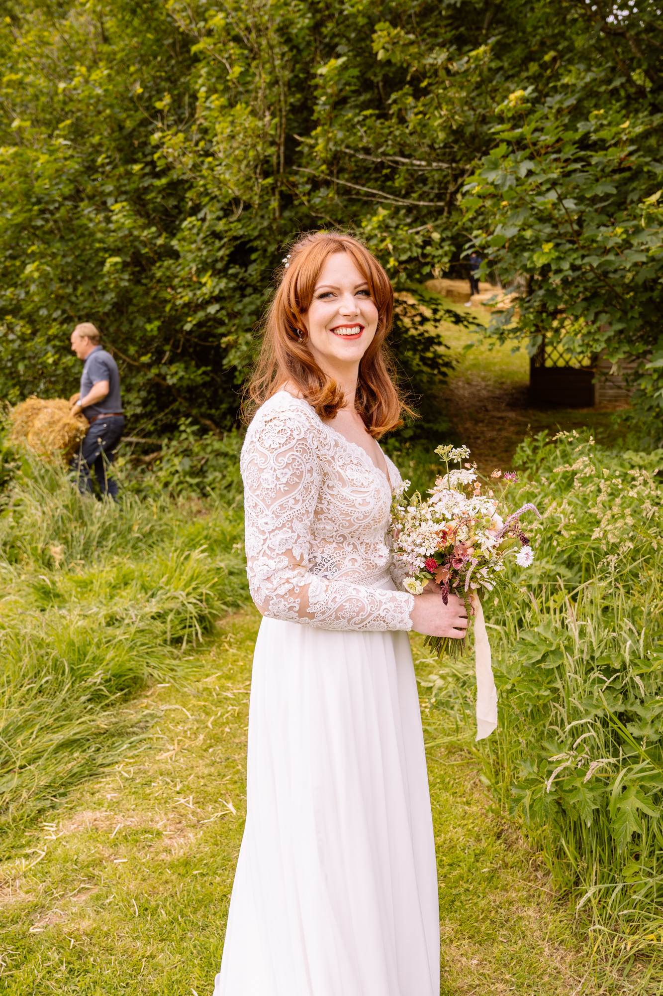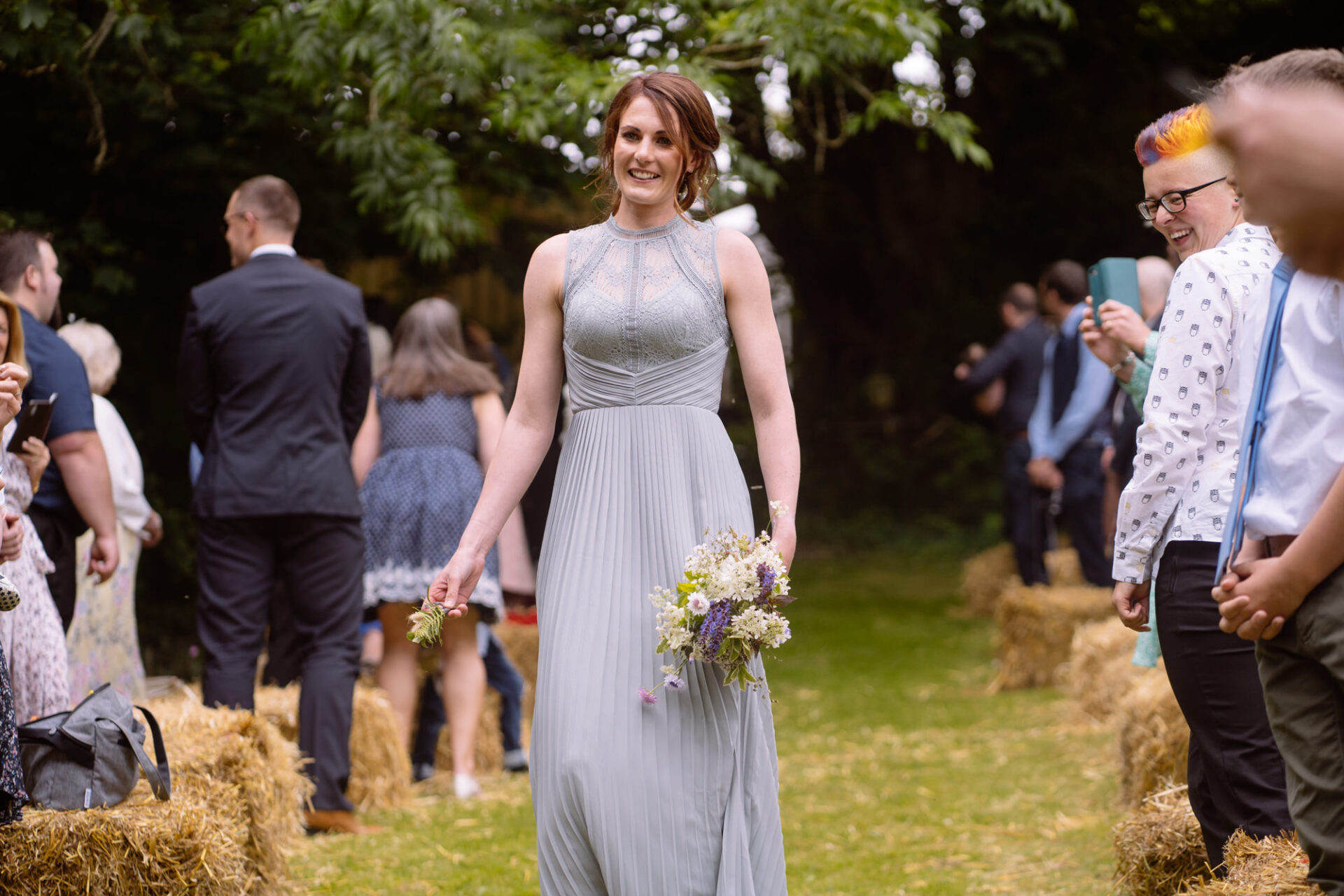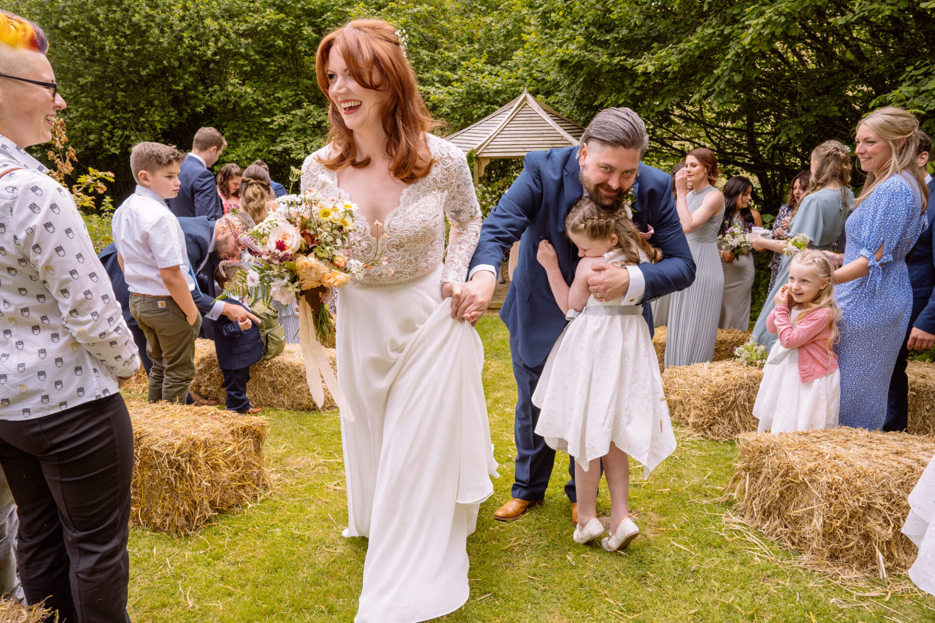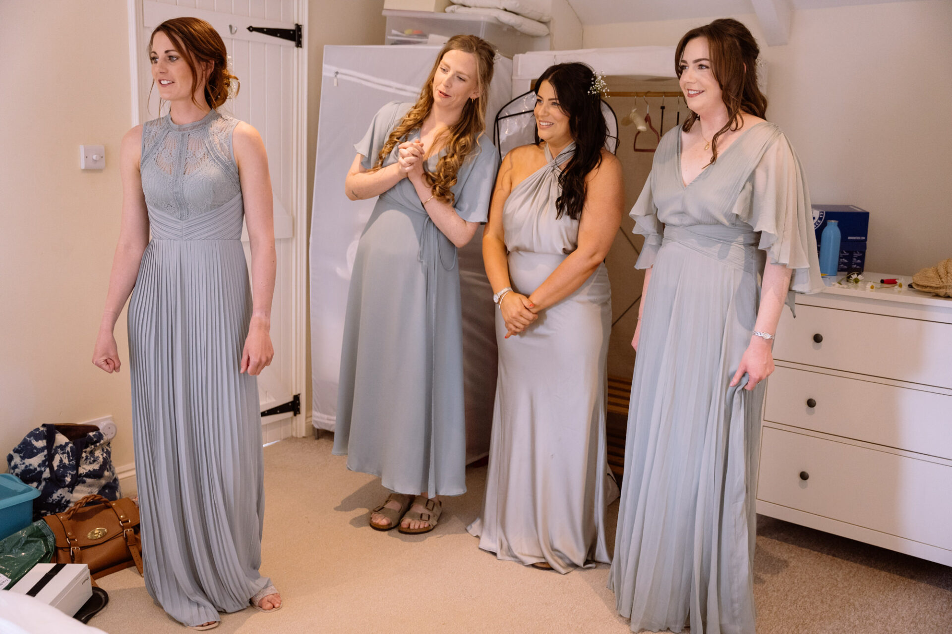 The beautiful area reserved for the ceremony at Barons Hill Farm is on a fairly steep hill. On the morning of Harriet and Mike’s wedding, the dew was taking a while to lift. Therefore the slightly damp grass was a more than a little greasy. This could have proved disasterous for anyone wearing any kind of high-heeled footwear. Namely, the entire bridal party! A phone call to one of the bridesmaids’ partners later and we had a pair of Birkenstock sandals for everyone!