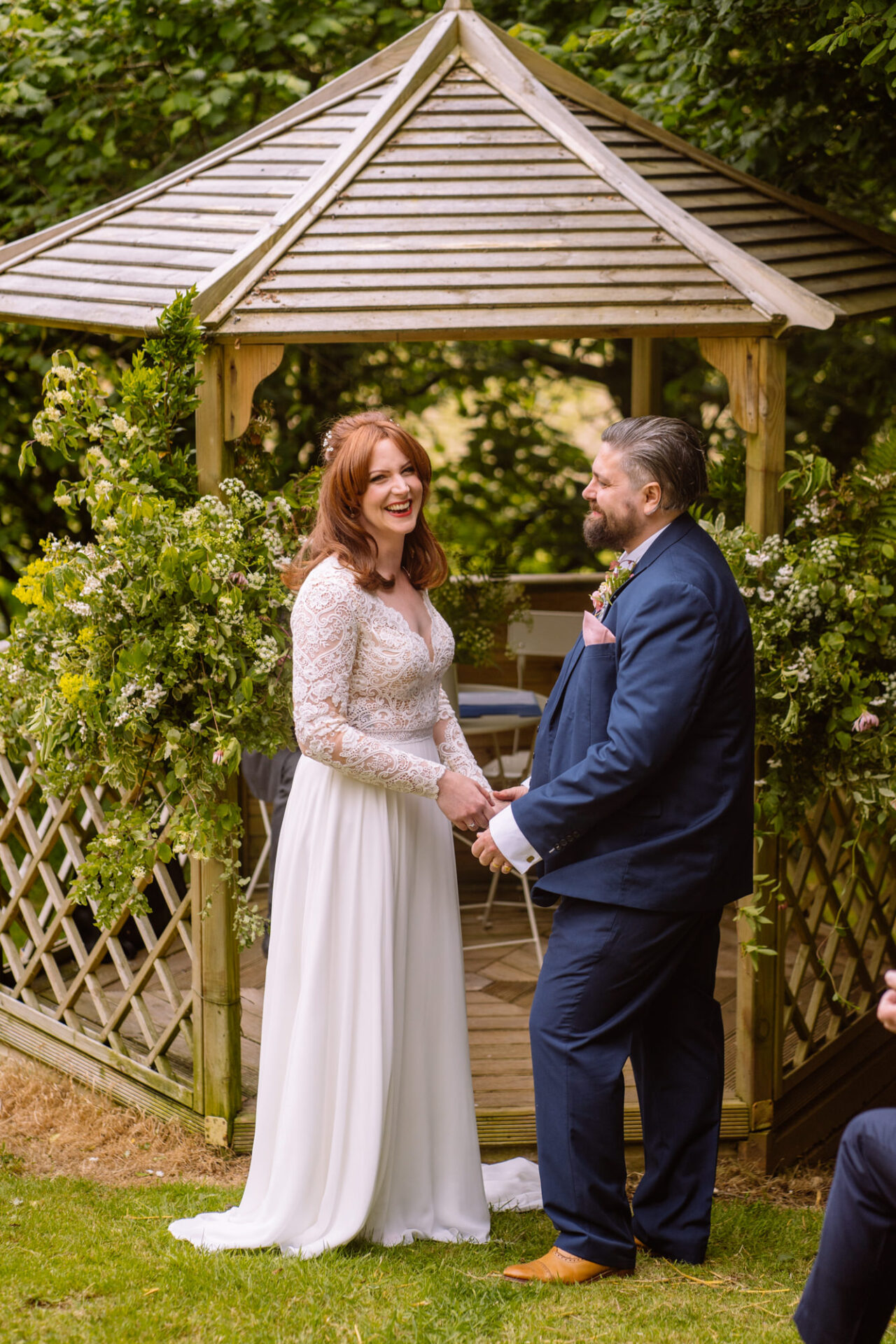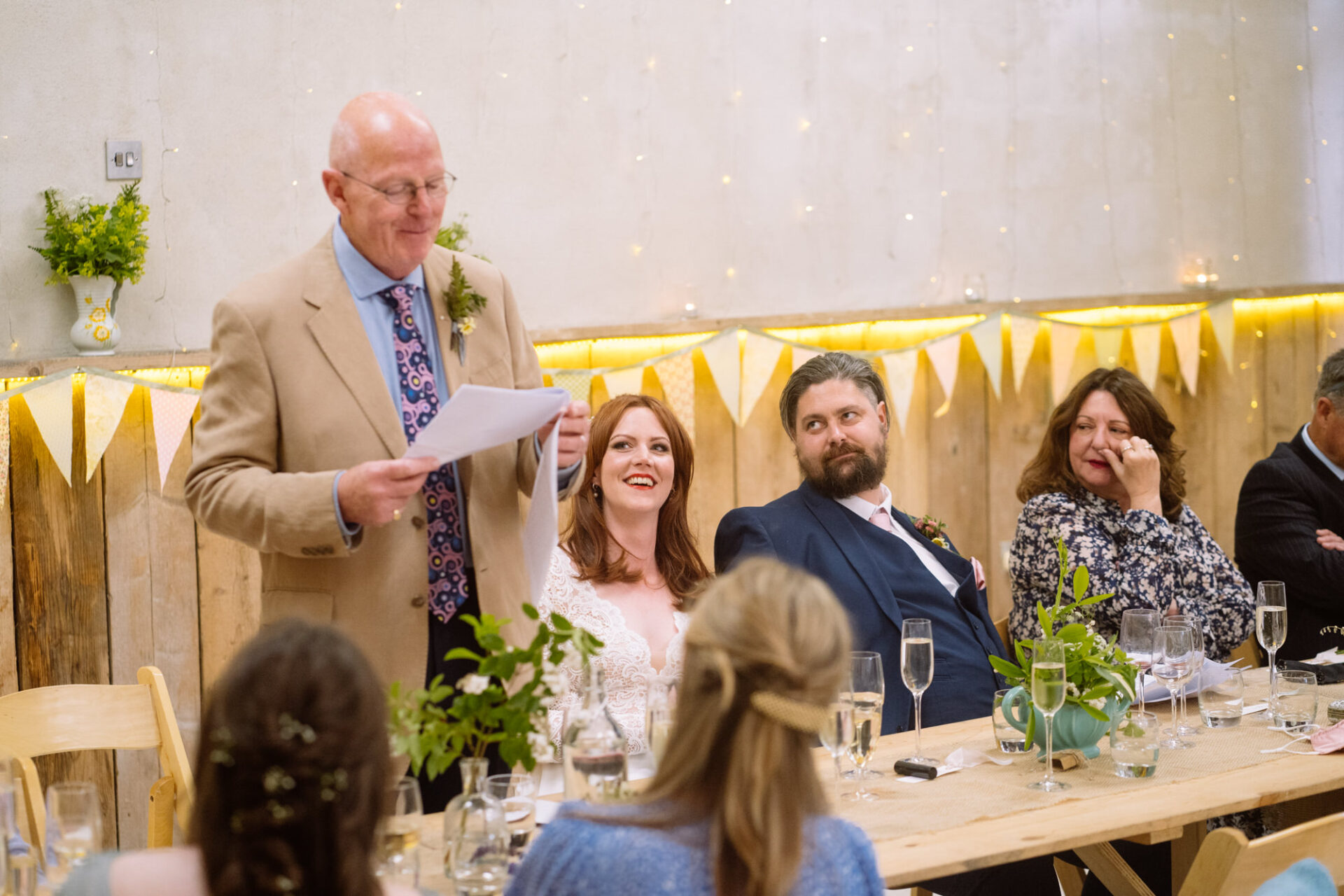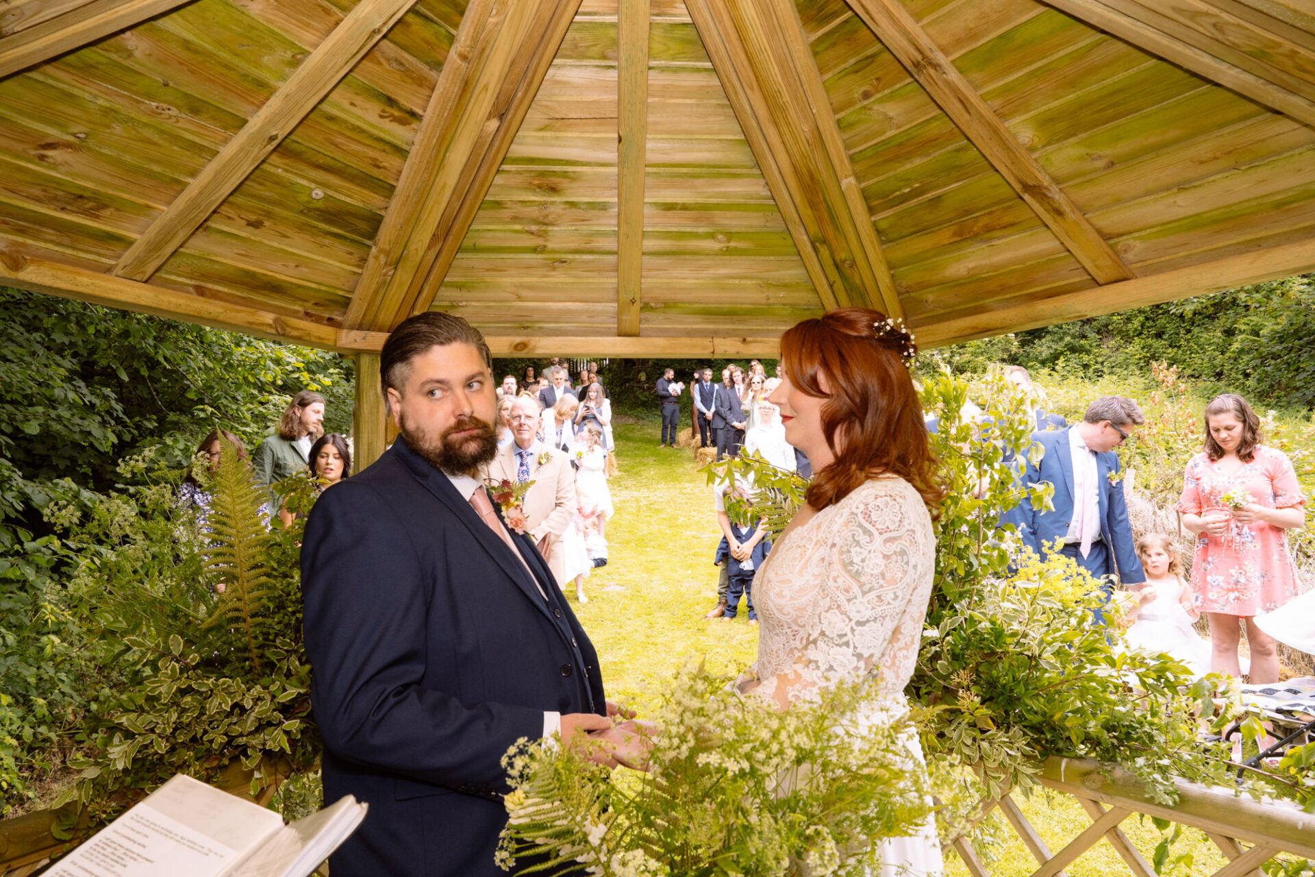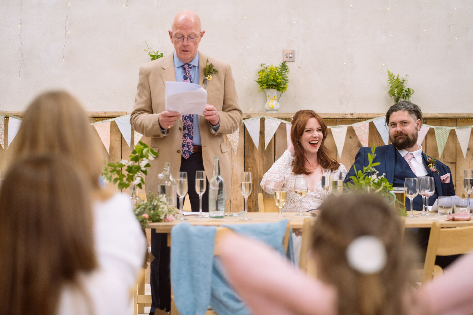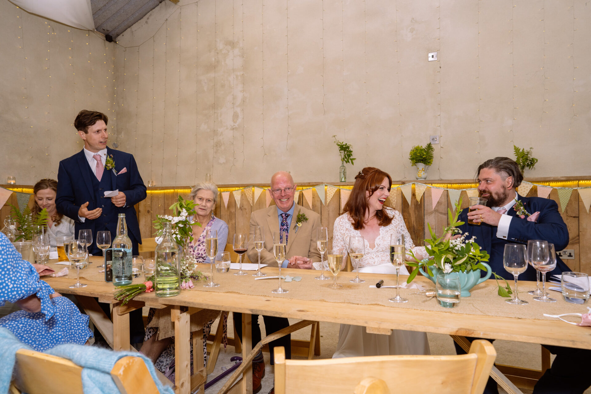 Flowers are always a big part of weddings. Indeed I have worked with many amazing florists. The flowers at this wedding were provided by one of Harriet and Mike’s good friends, Emma Vowles. I have to say that Emma’s designs were nothing short of stunning! The ceremony arbour at Barons Hill Farm was decorated in an incredible array of foliage that almost made it camoflage! Moreover, the barn and the entire rest of the venue was adorned with Emma’s creations that complimented the colour scheme and overall feel of the wedding.