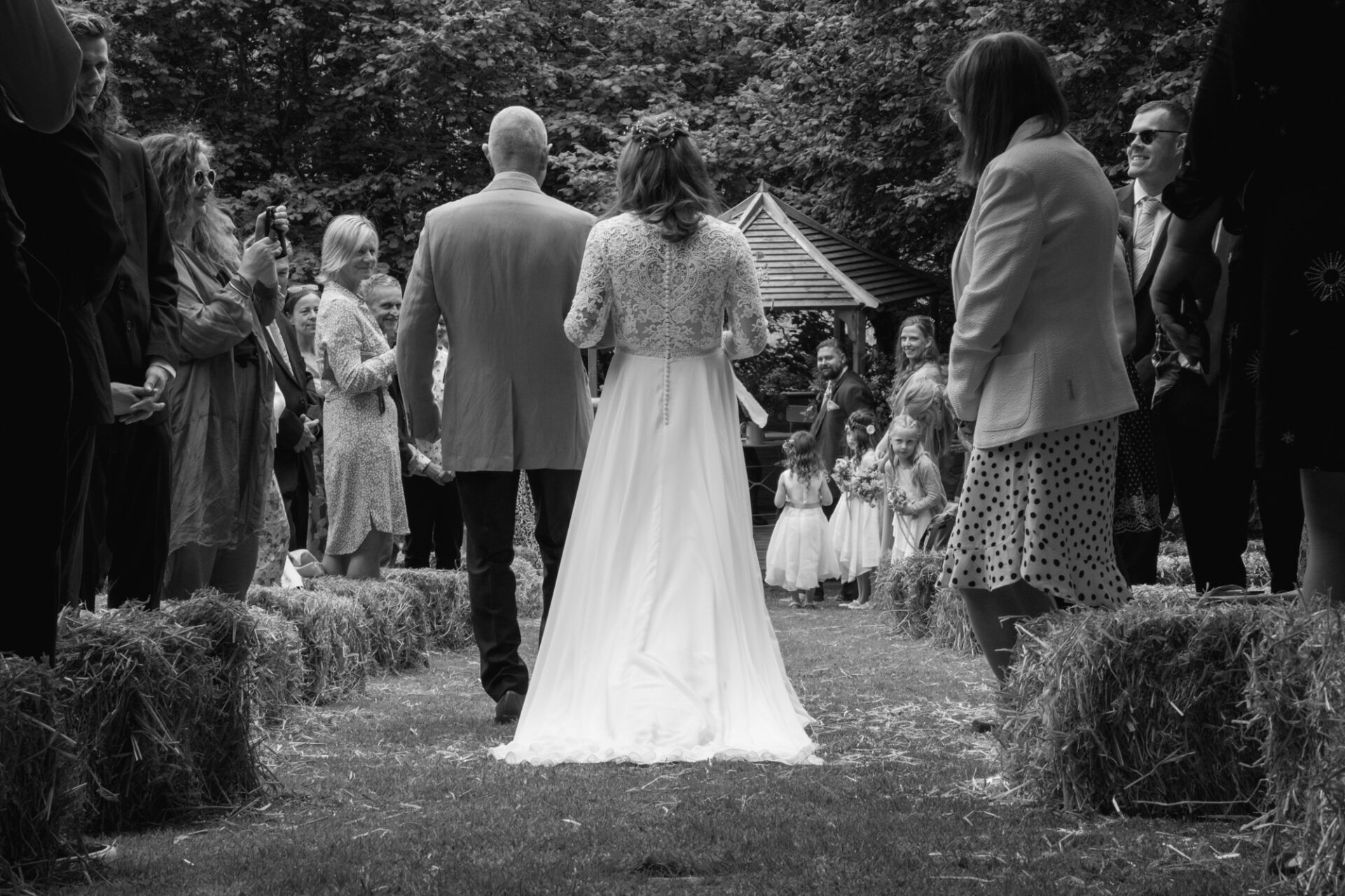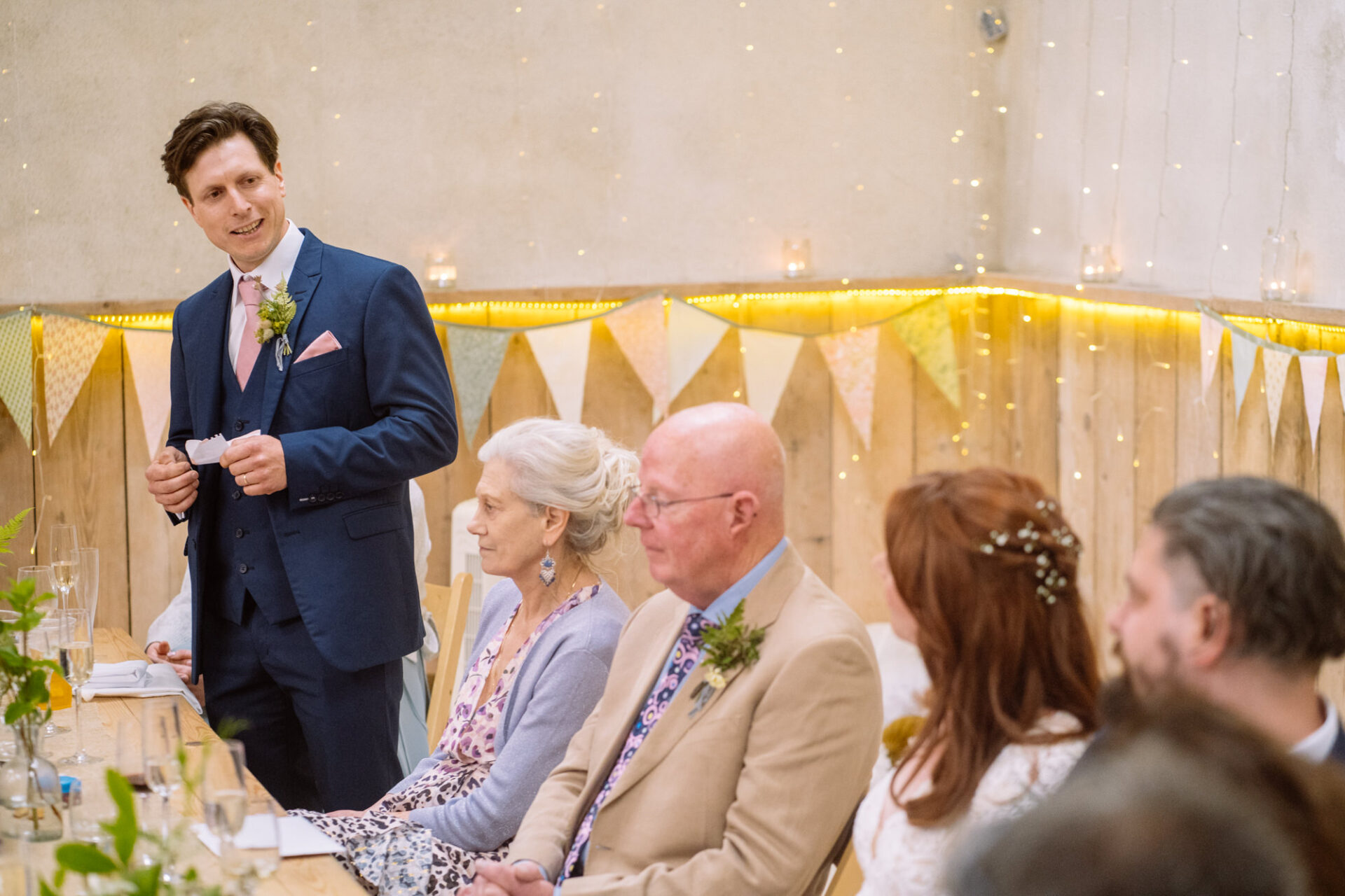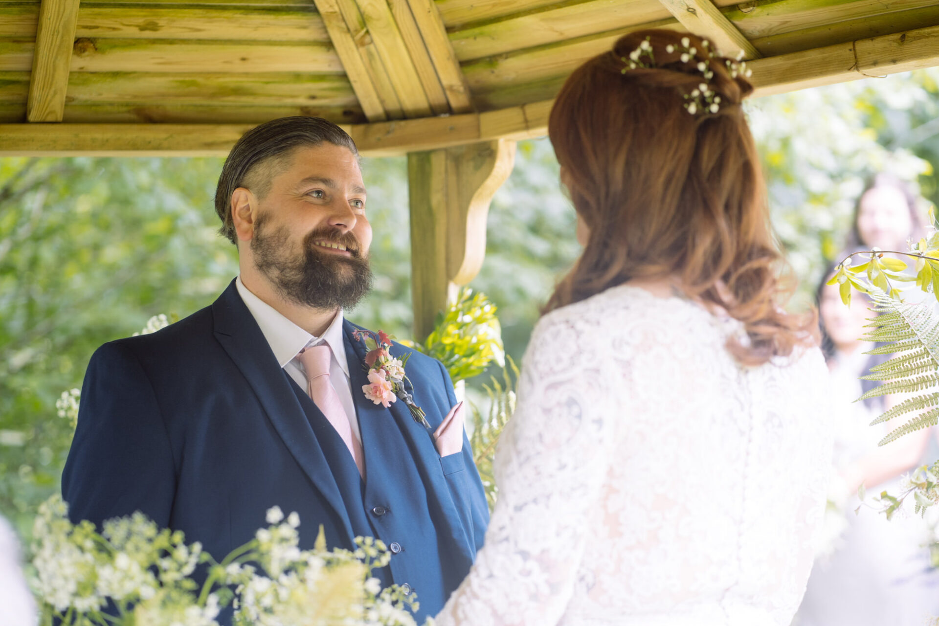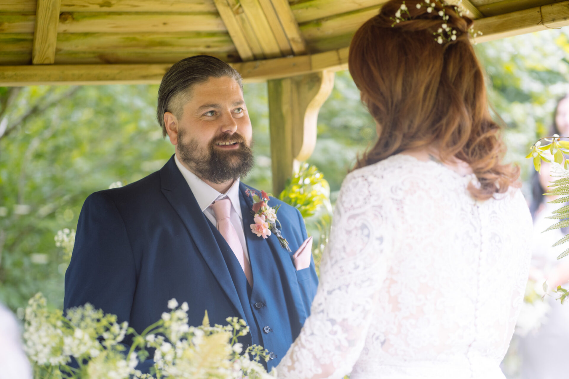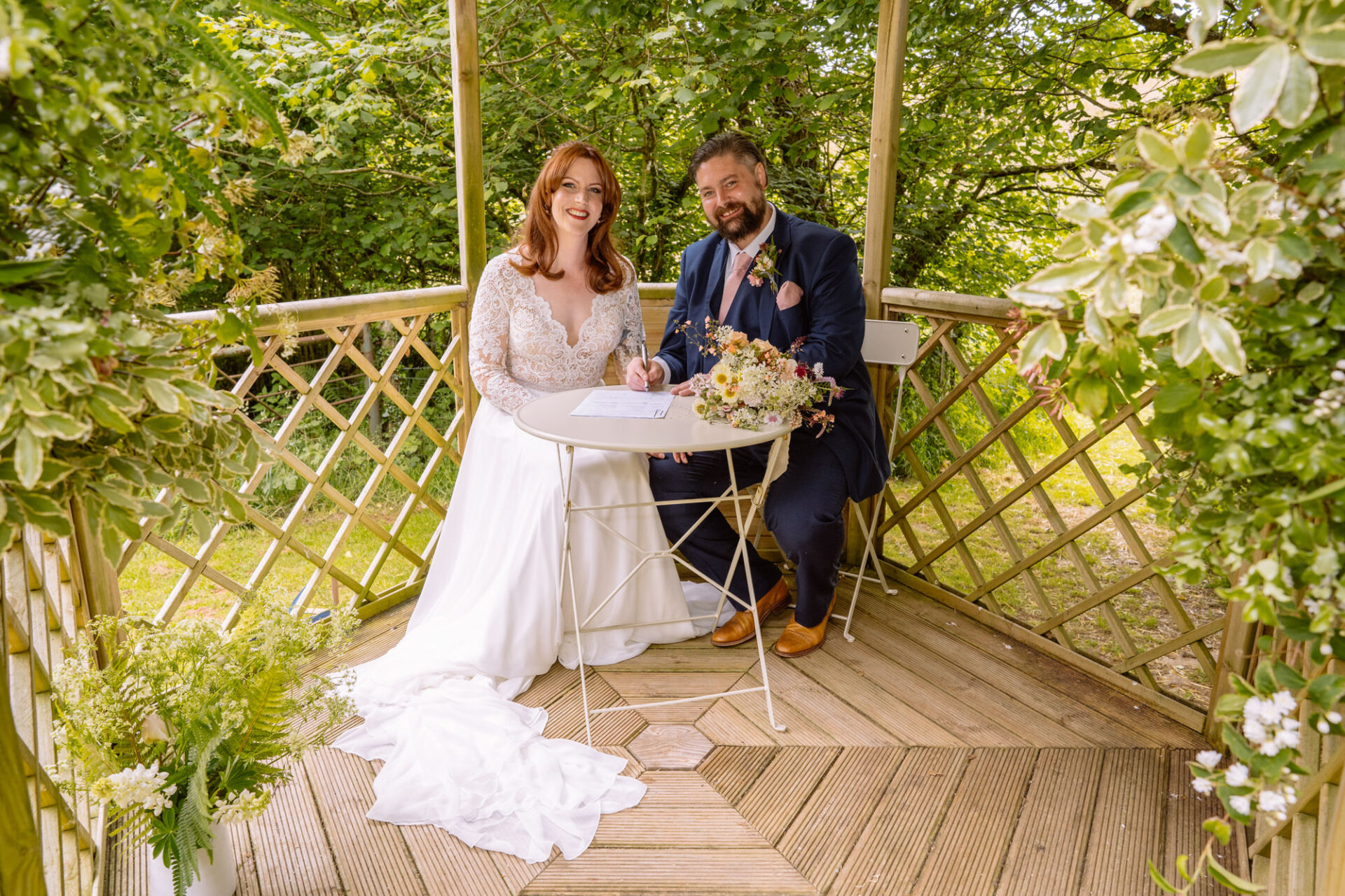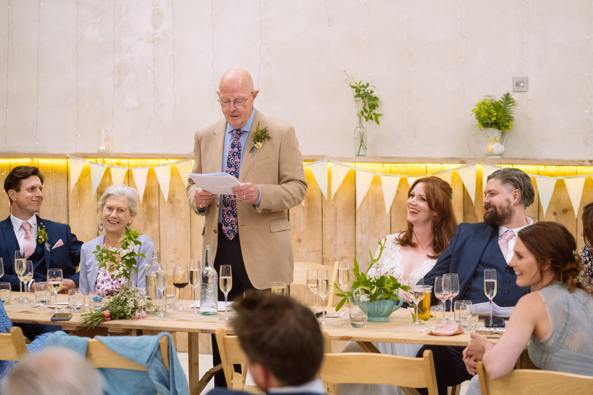 Flowers are always a big part of weddings. Indeed I have worked with many amazing florists. The flowers at this wedding were provided by one of Harriet and Mike’s good friends, Emma Vowles. I have to say that Emma’s designs were nothing short of stunning! The ceremony arbour at Barons Hill Farm was decorated in an incredible array of foliage that almost made it camoflage! Moreover, the barn and the entire rest of the venue was adorned with Emma’s creations that complimented the colour scheme and overall feel of the wedding.