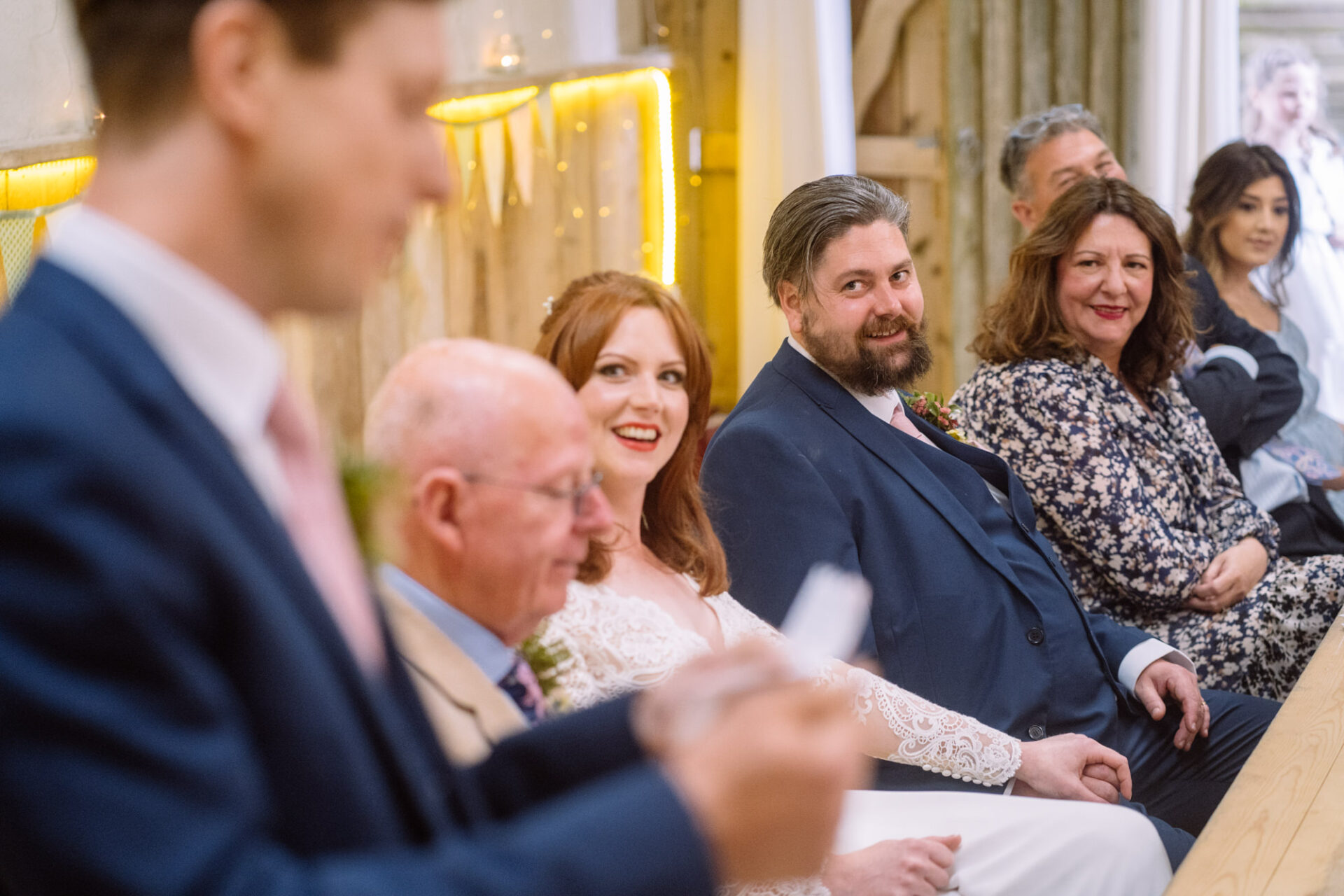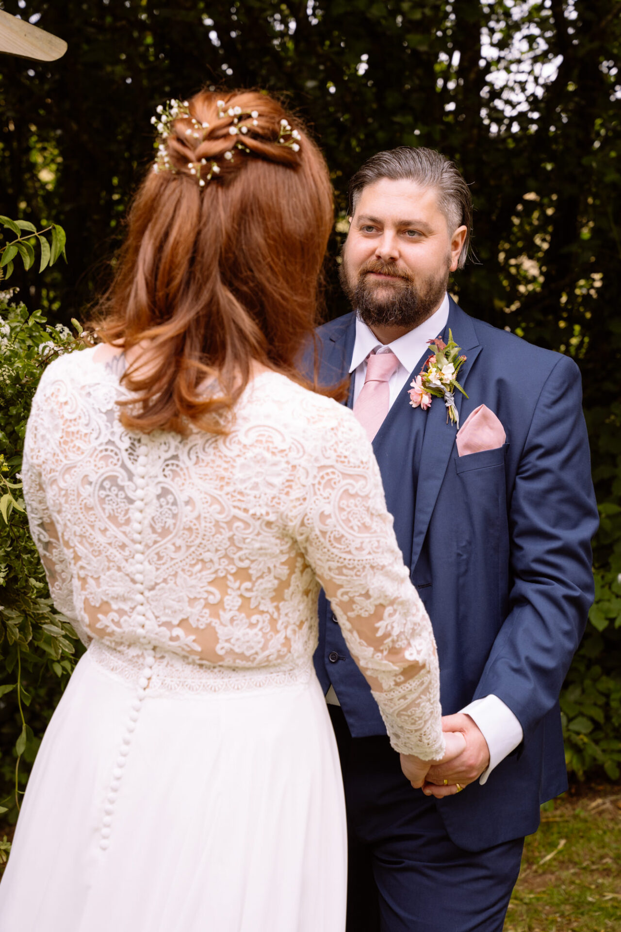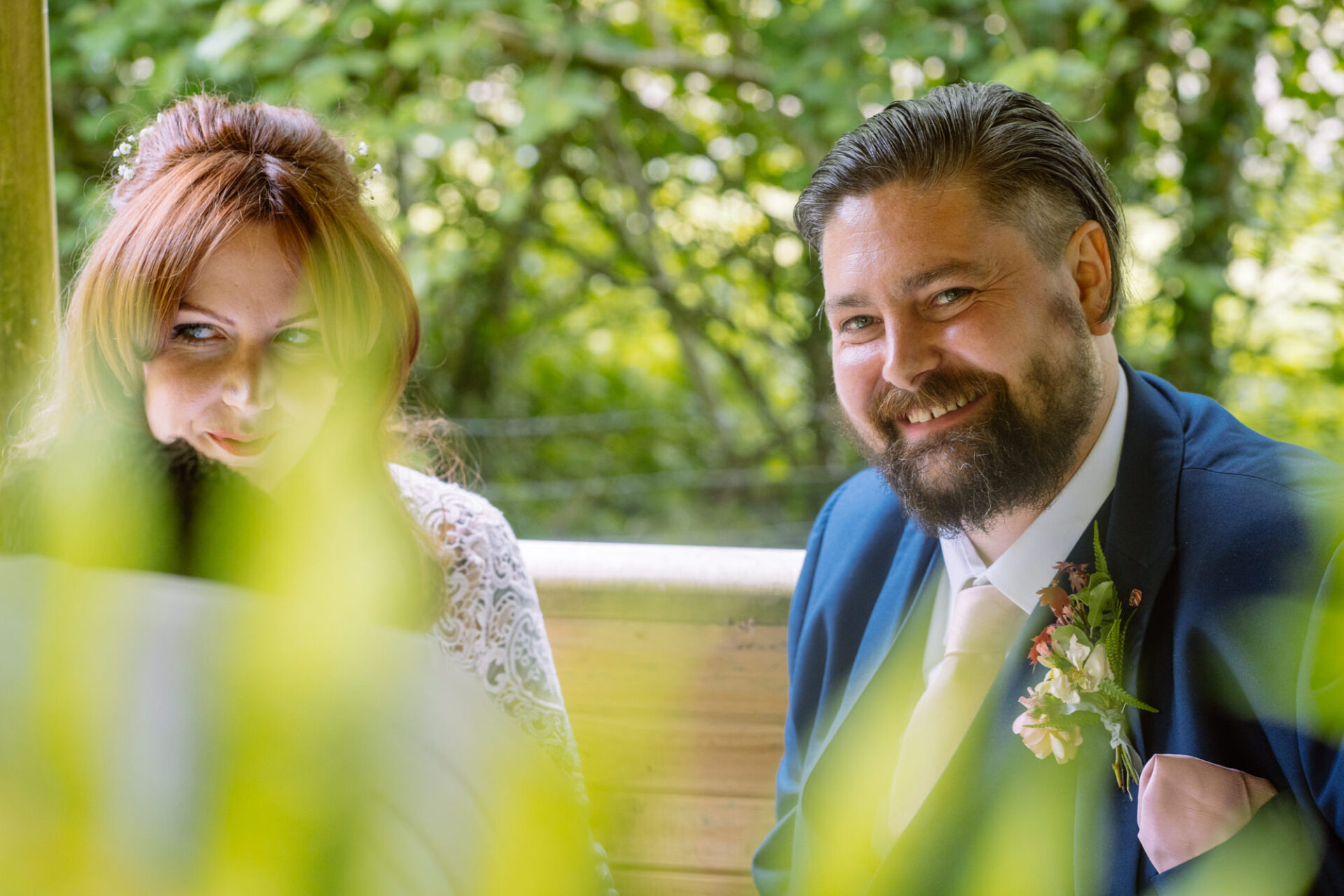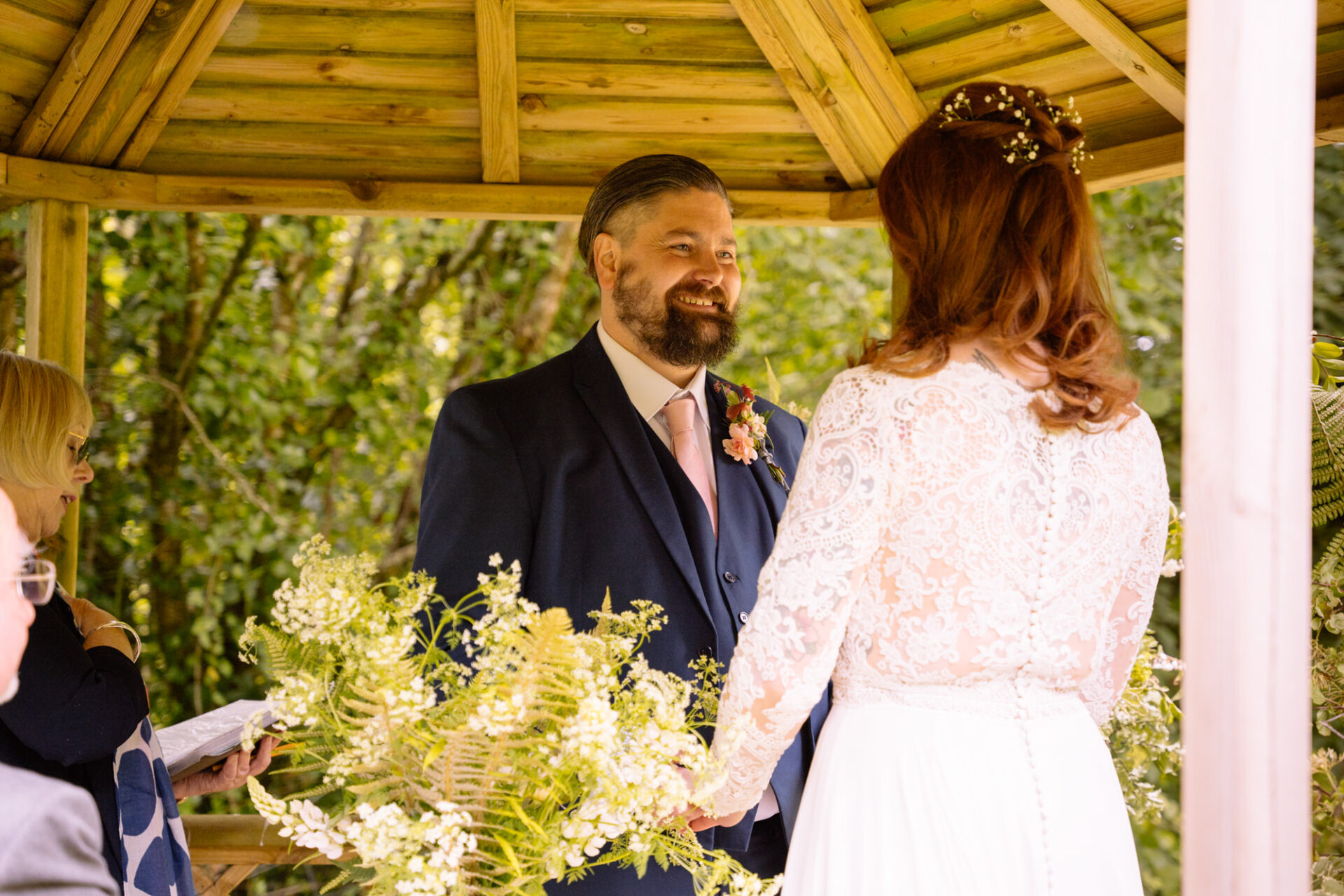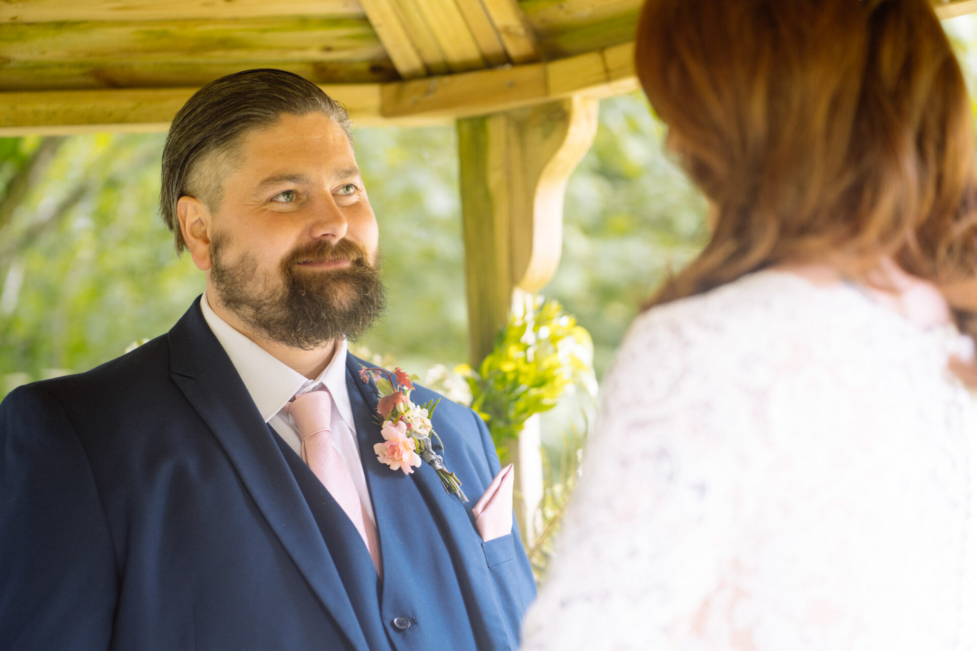 Flowers are always a big part of weddings. Indeed I have worked with many amazing florists. The flowers at this wedding were provided by one of Harriet and Mike’s good friends, Emma Vowles. I have to say that Emma’s designs were nothing short of stunning! The ceremony arbour at Barons Hill Farm was decorated in an incredible array of foliage that almost made it camoflage! Moreover, the barn and the entire rest of the venue was adorned with Emma’s creations that complimented the colour scheme and overall feel of the wedding.