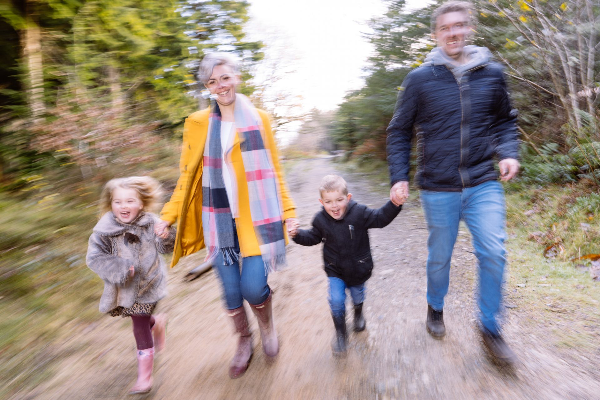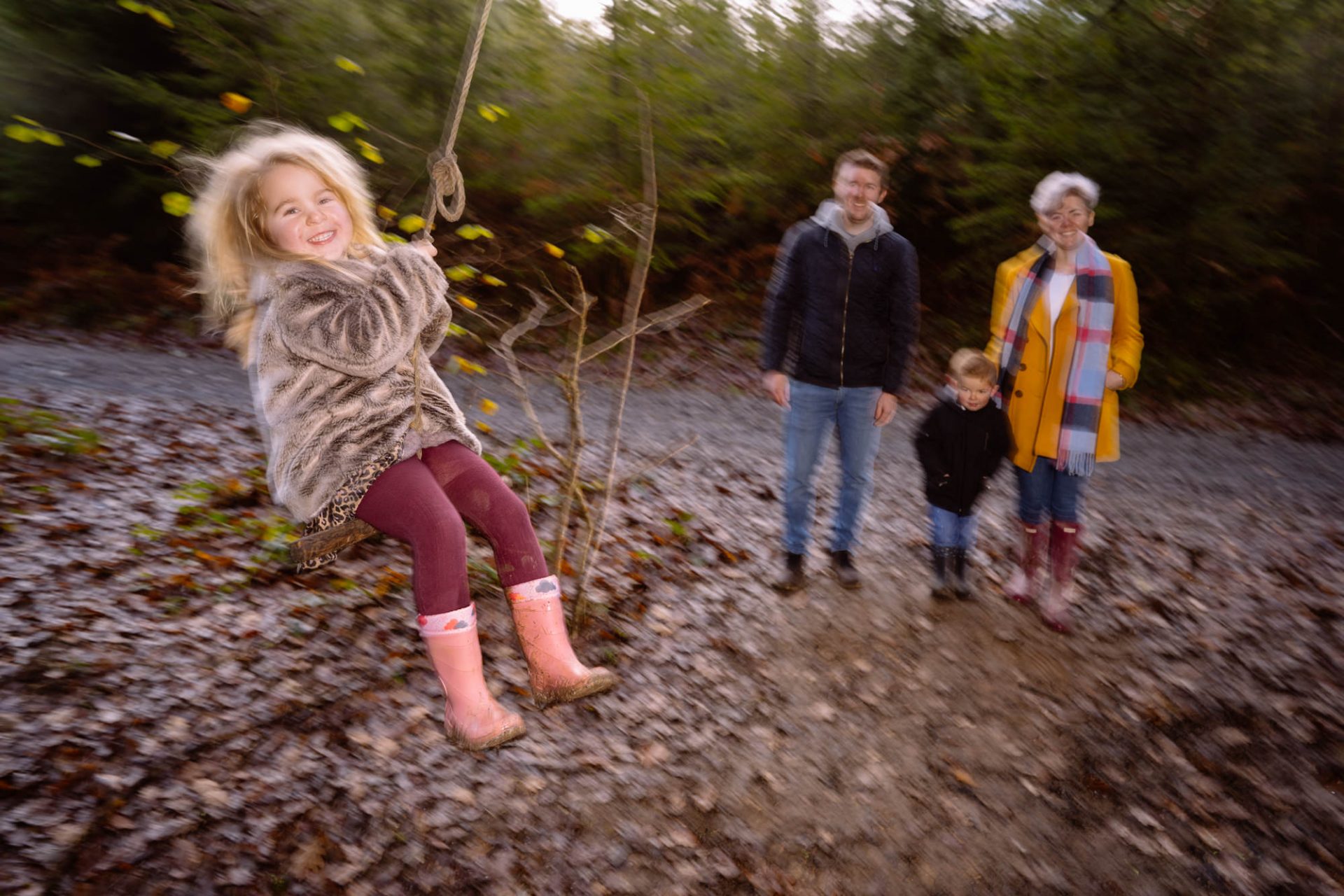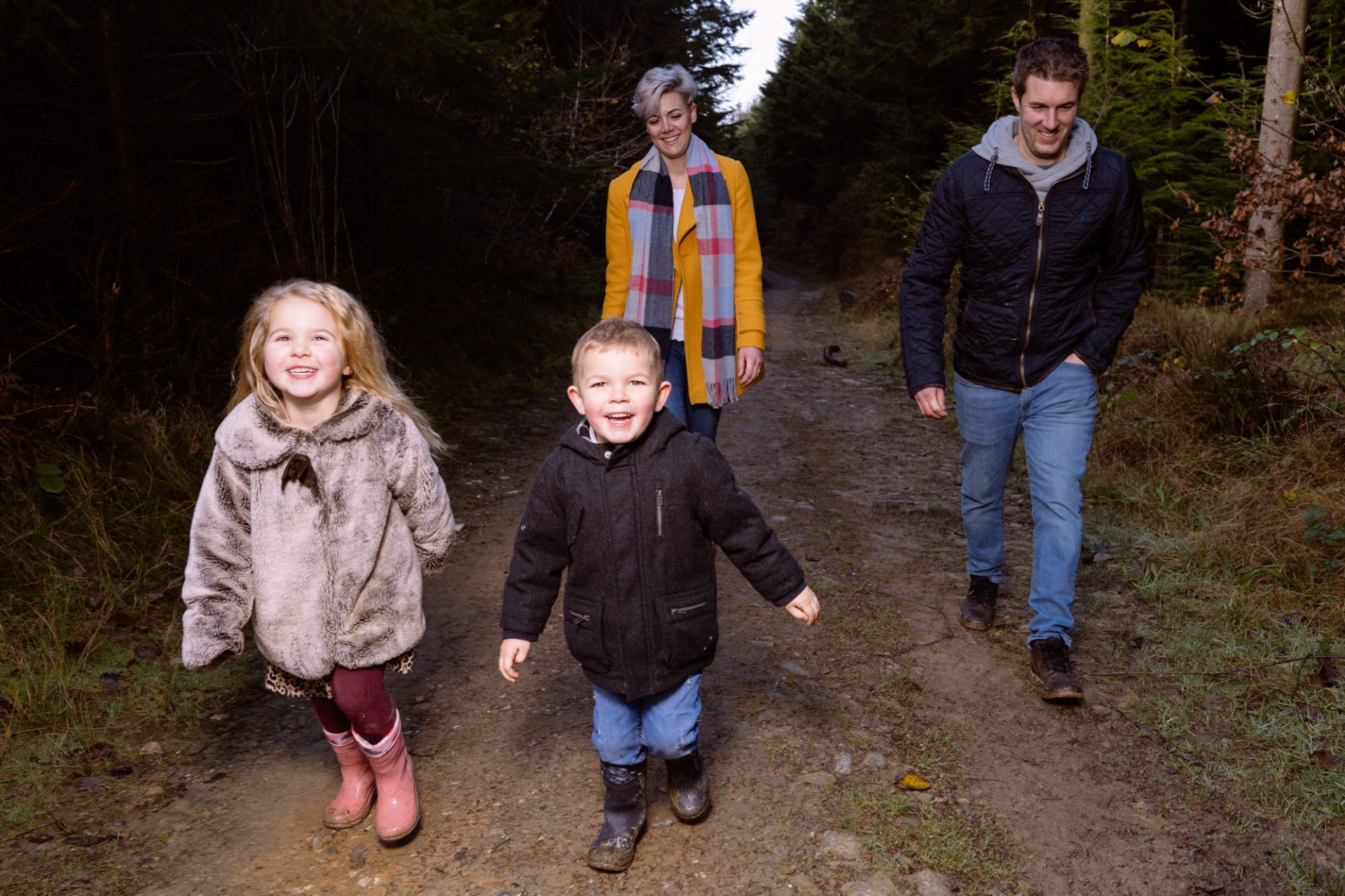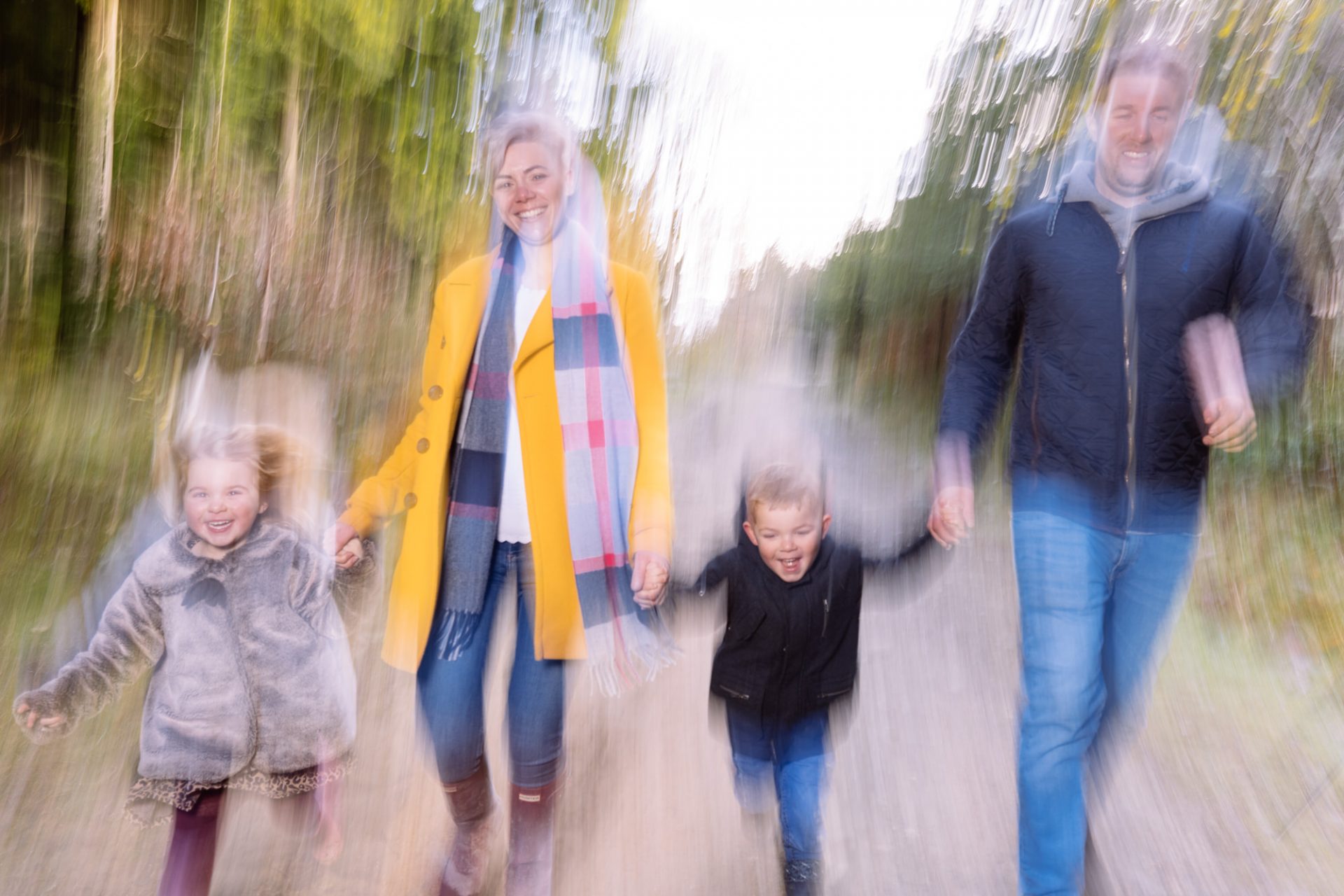 After these escapades, we continued onwards for some more sedate portraits amongst the backlit pine trees. Certainly, the autumnal sunshine flitered through the forest canopy wreathing our joyful protagnists in soft light. Now, it’s no secret that I like a bit of action and movement in my photos! This Ladock Woods family shoot was no different. For instance, Katie and Nathan and their clan enjoyed a little running around the woodland paths for the camera!
