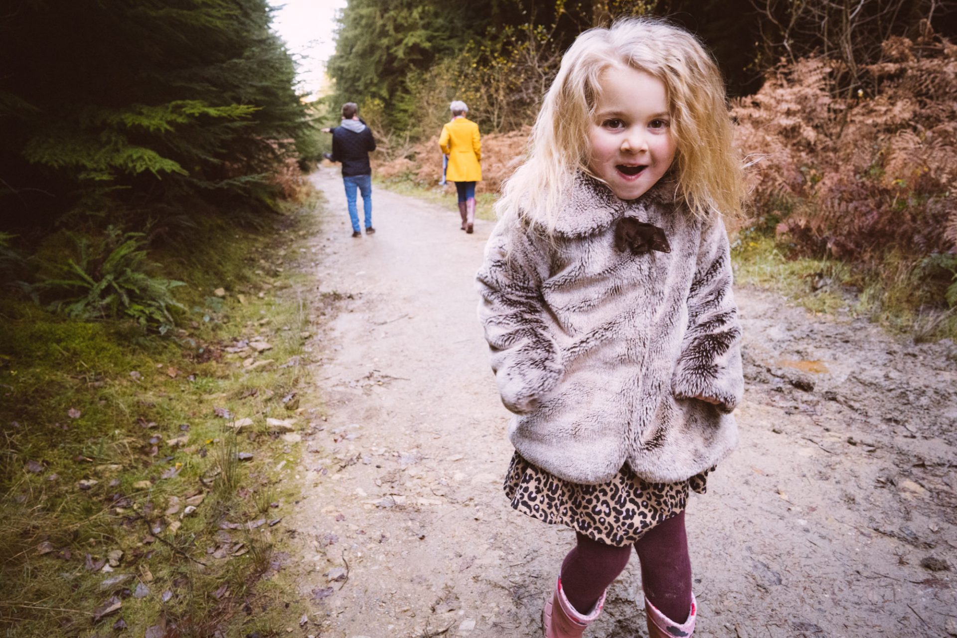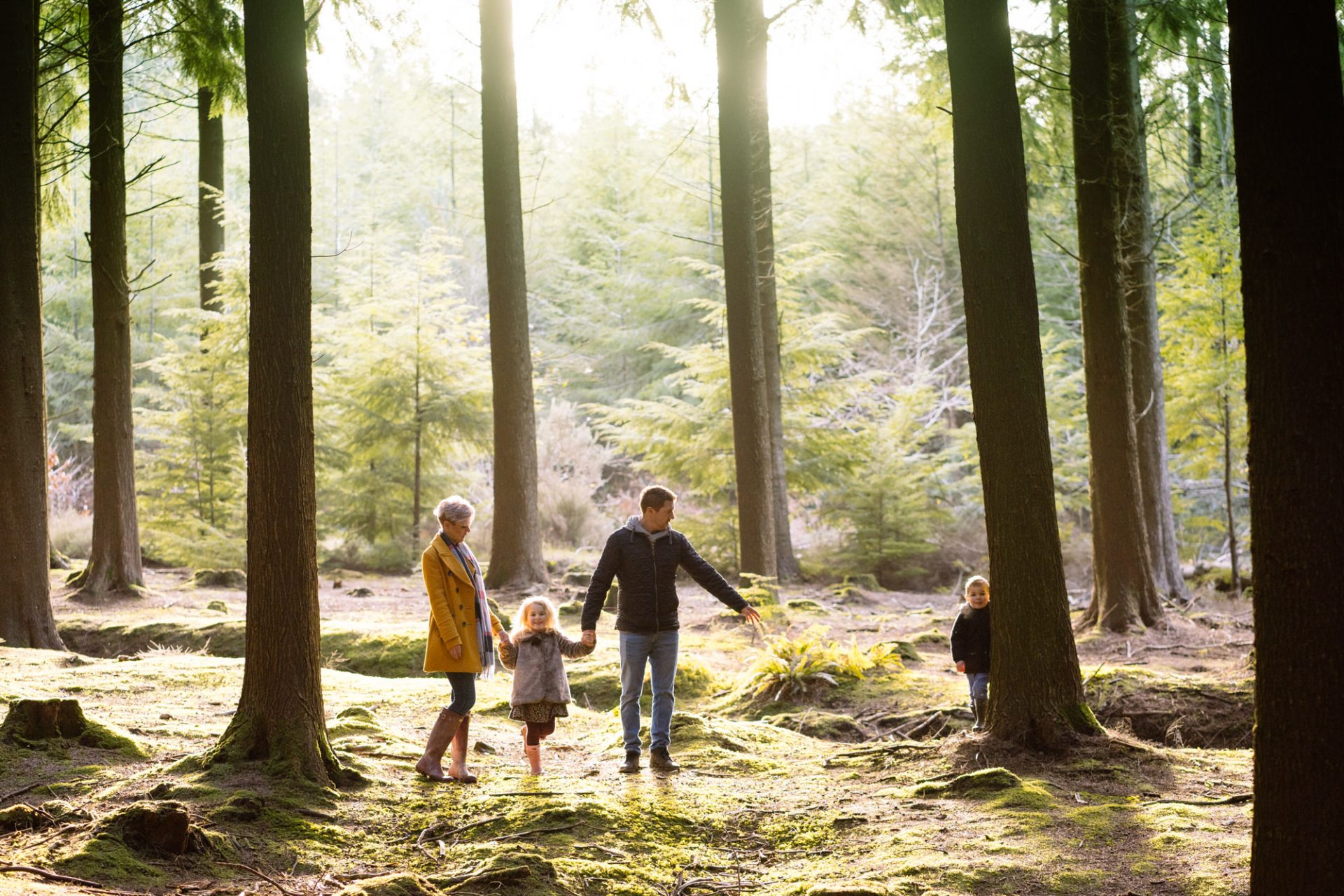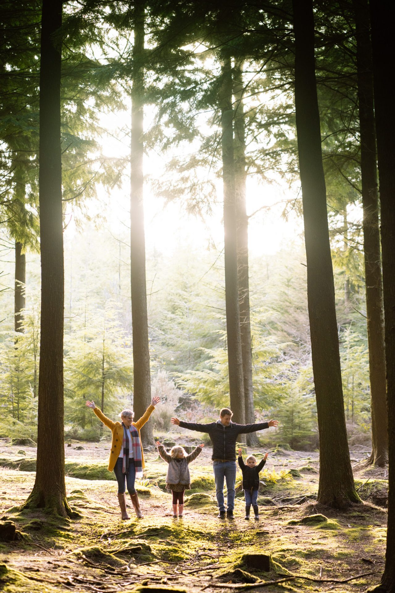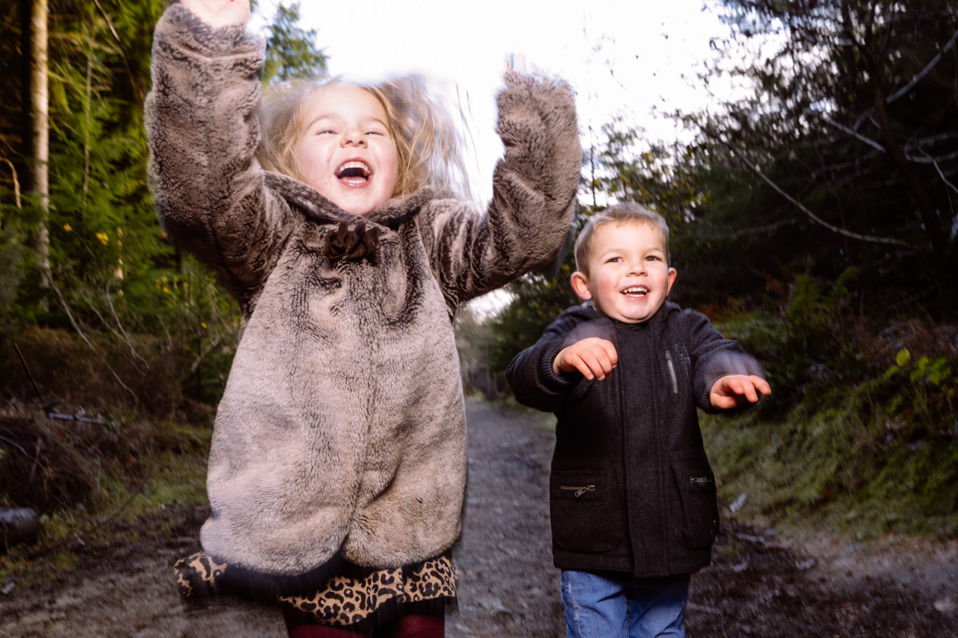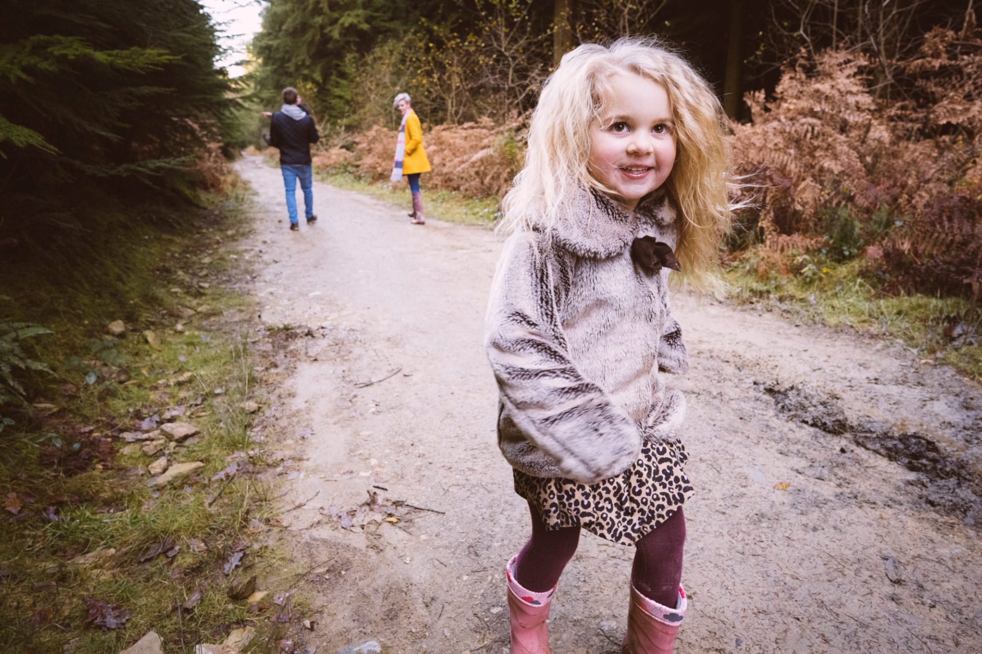 After these escapades, we continued onwards for some more sedate portraits amongst the backlit pine trees. Certainly, the autumnal sunshine flitered through the forest canopy wreathing our joyful protagnists in soft light. Now, it’s no secret that I like a bit of action and movement in my photos! This Ladock Woods family shoot was no different. For instance, Katie and Nathan and their clan enjoyed a little running around the woodland paths for the camera!