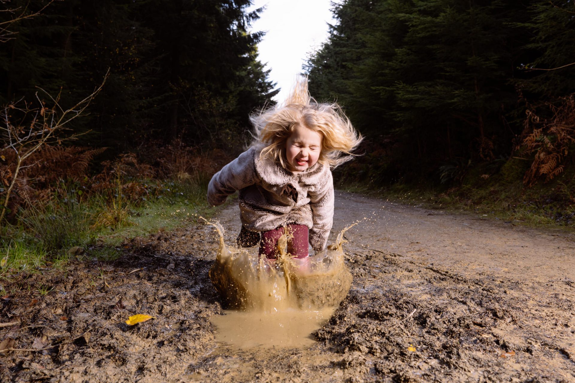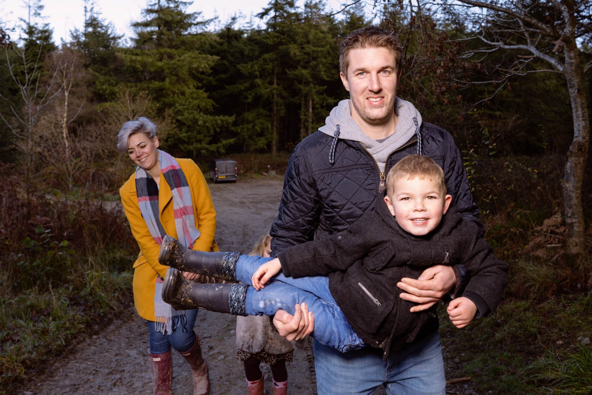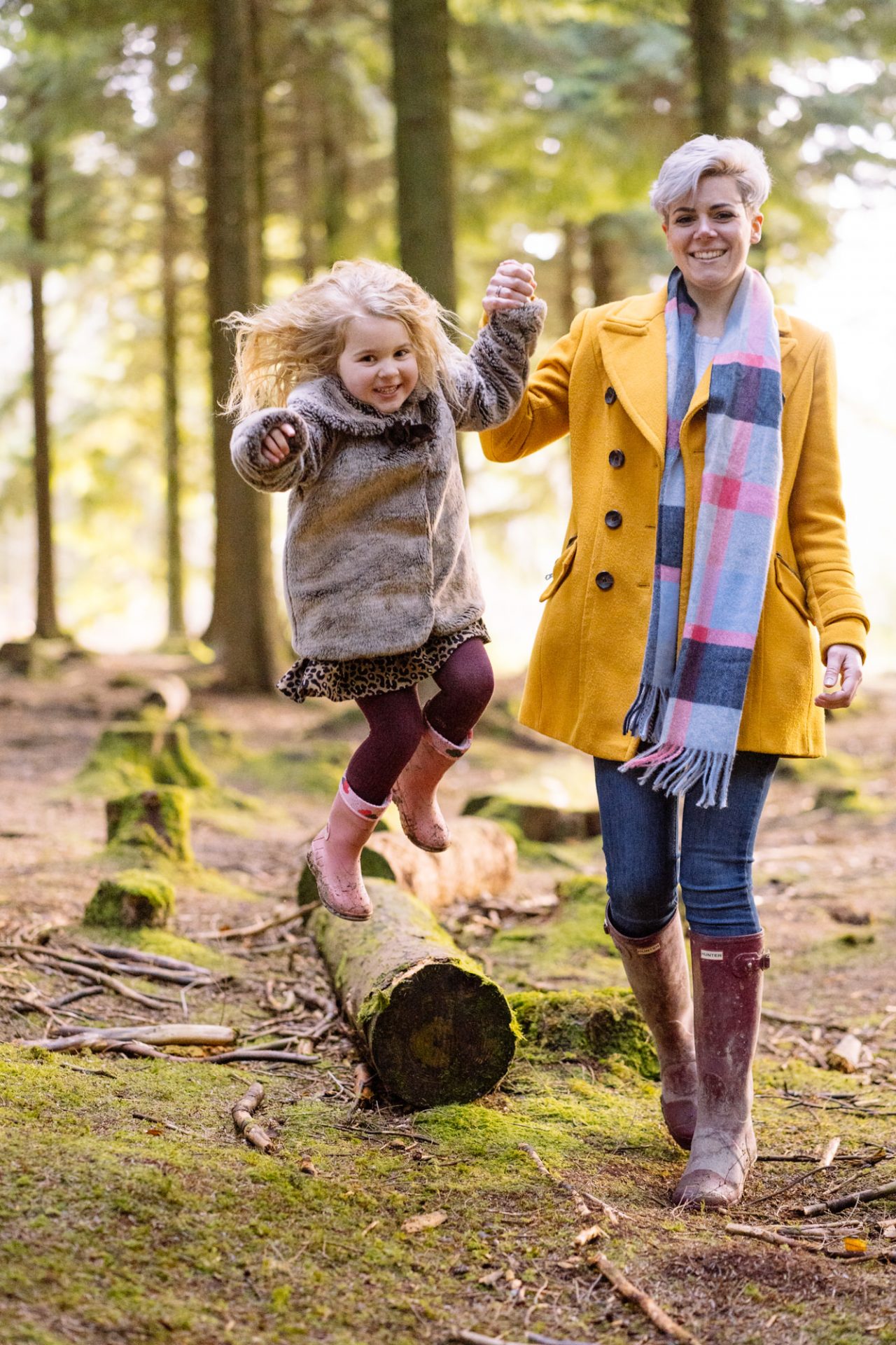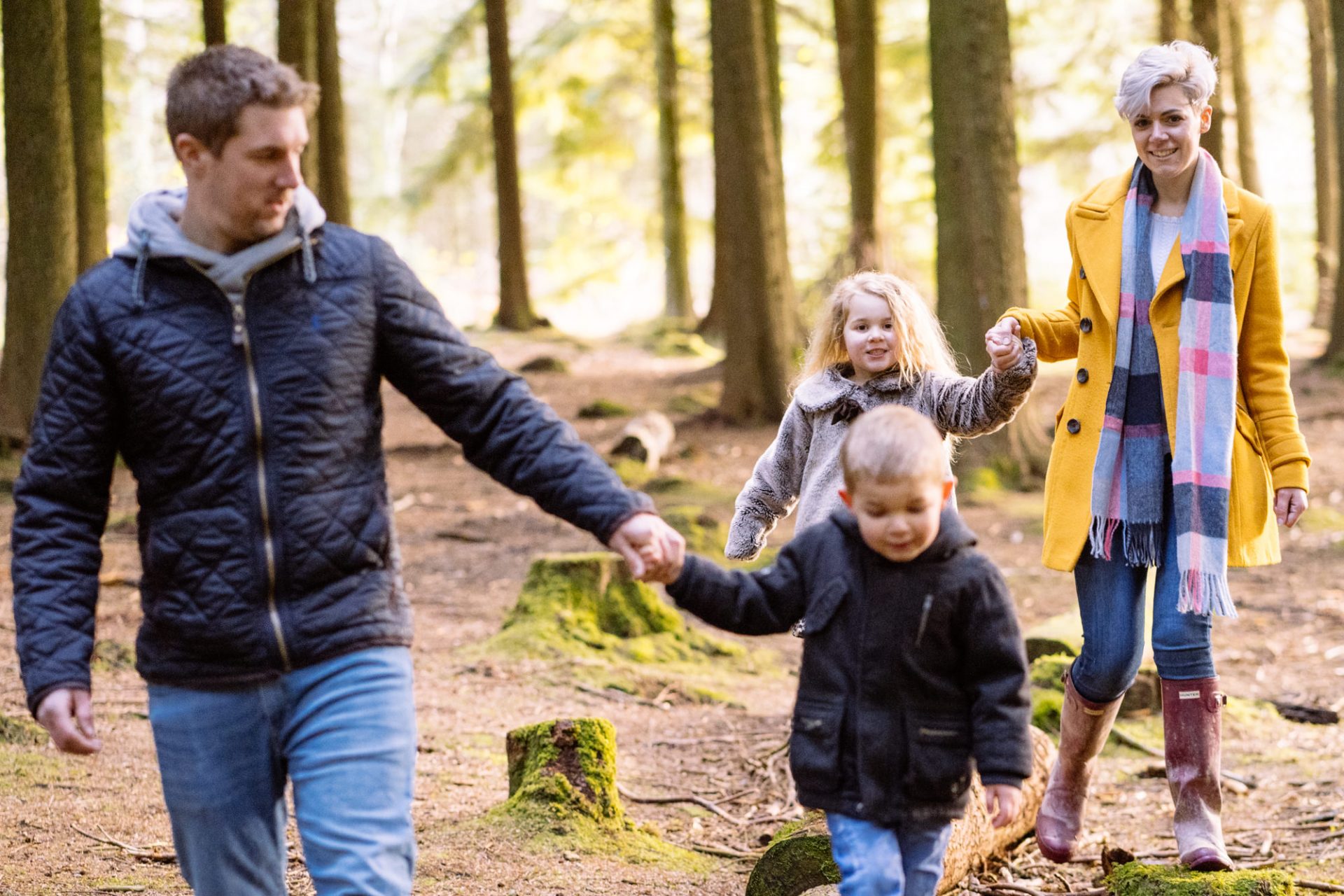 After these escapades, we continued onwards for some more sedate portraits amongst the backlit pine trees. Certainly, the autumnal sunshine flitered through the forest canopy wreathing our joyful protagnists in soft light. Now, it’s no secret that I like a bit of action and movement in my photos! This Ladock Woods family shoot was no different. For instance, Katie and Nathan and their clan enjoyed a little running around the woodland paths for the camera!