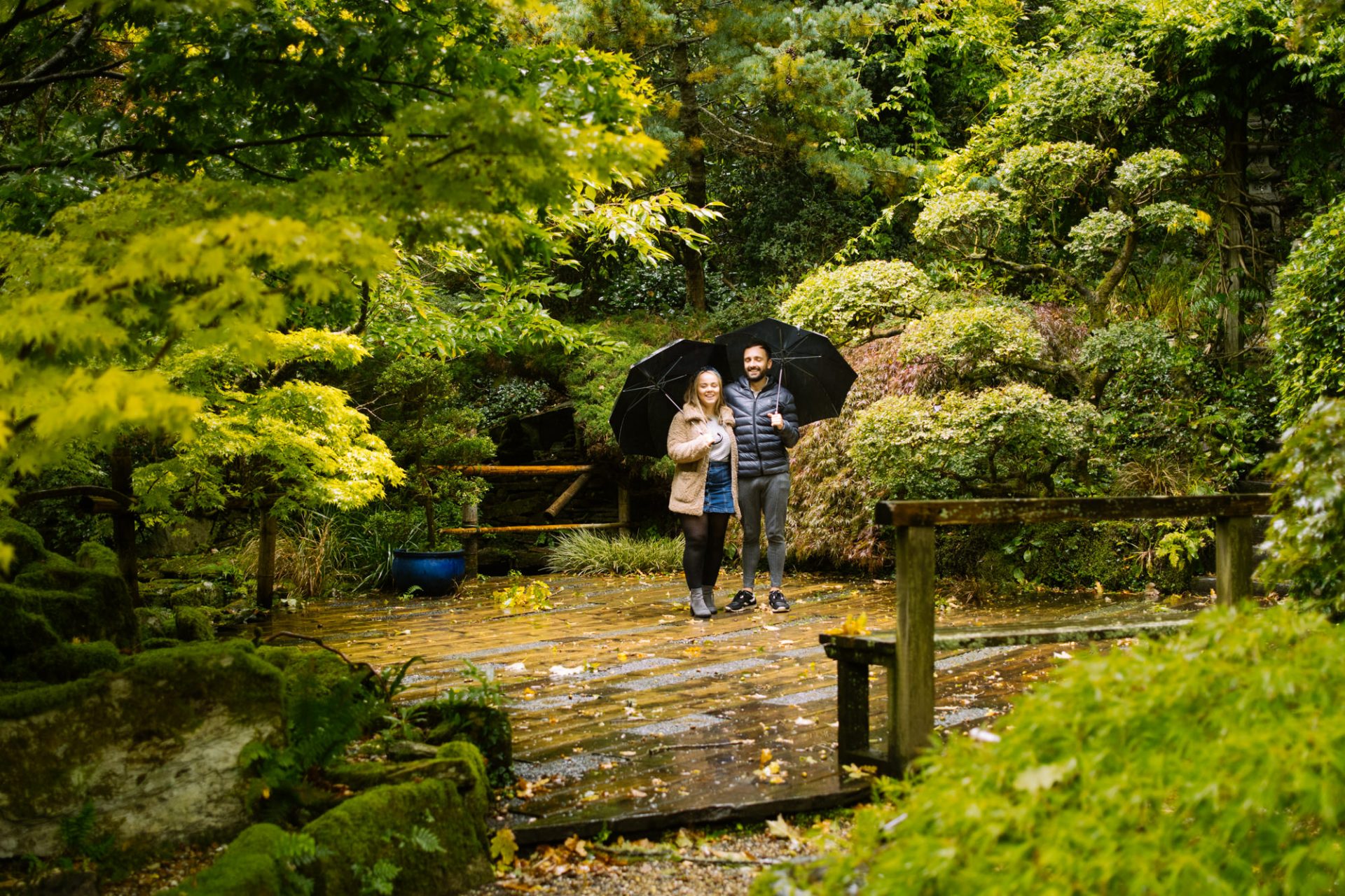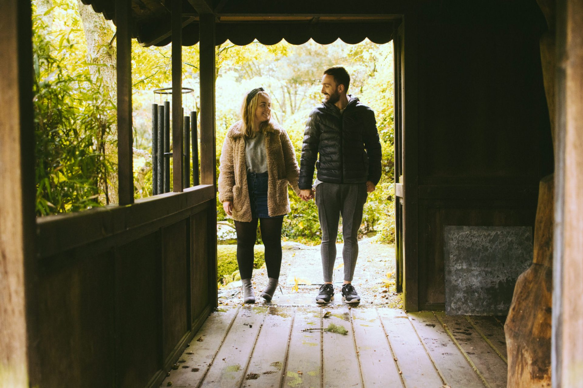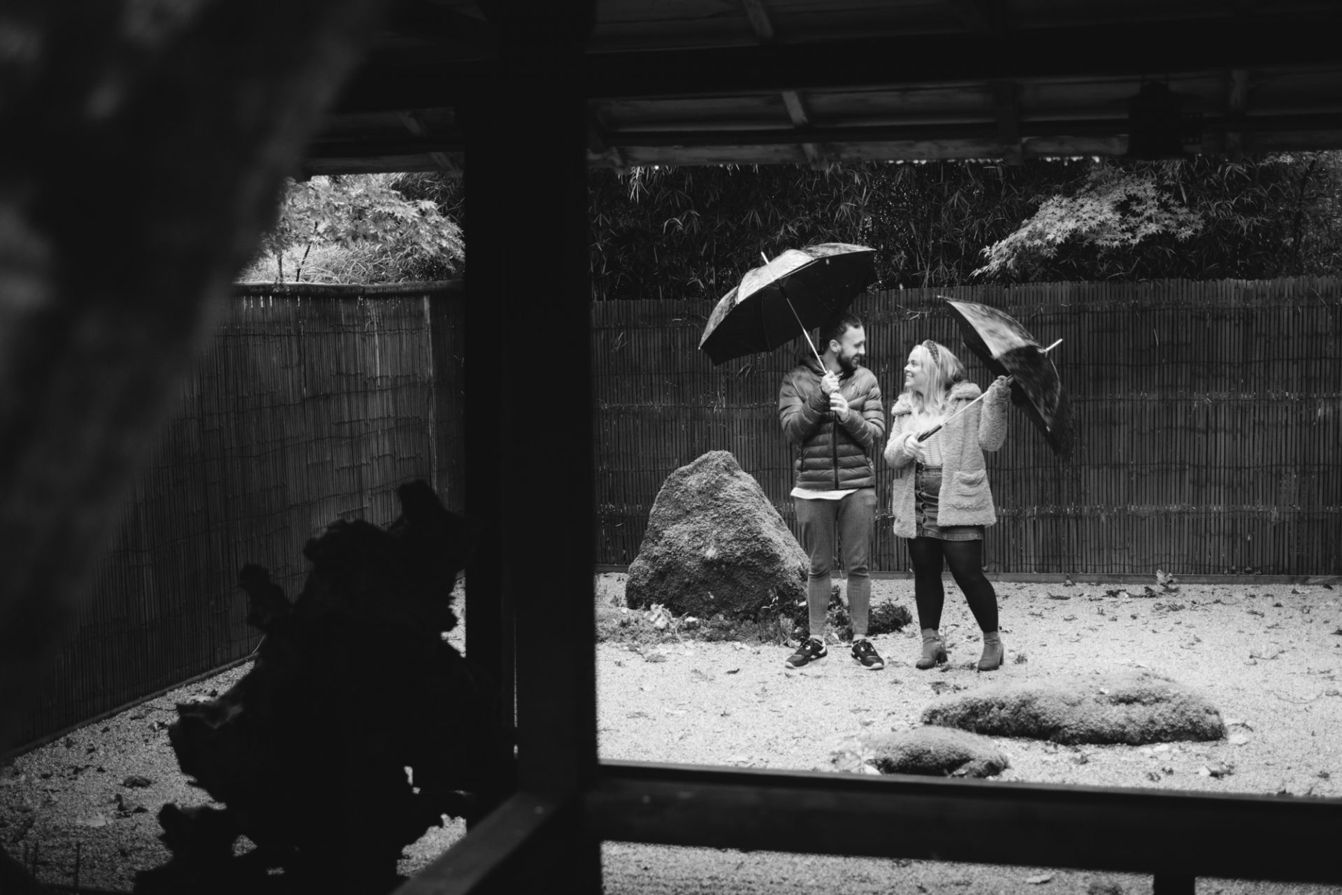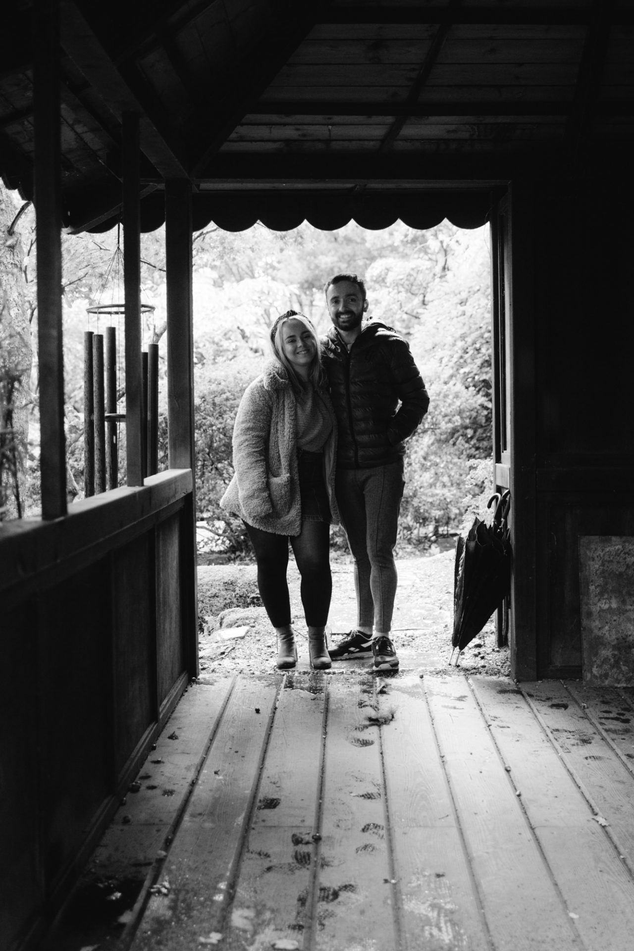 Lauren and Josh opted for a Japanese Garden shoot for their pre-wedding pictures. On a stormy Cornish Sunday, I met these lovely humans in the carpark at Watergate bay for their pre-wedding shoot. As it turned out, conditions were somewhat inclement! Indeed, the wind was gusting to 40 mph plus and the rain lashing so hard that it was impossible to shoot on the beach as planned. Luckily I remembered that the Japanese Garden in the nearby village of St Mawgan was open. The Japanese Garden nestles in a sheltered valley a stones throw from Newquay airport. Most importantly, it is protected from the wind! As the website says, it is: Built as a meditative garden. Therefore, it is the perfect space where one can calm the mind and let go of unwanted stress through contemplation and reflection.