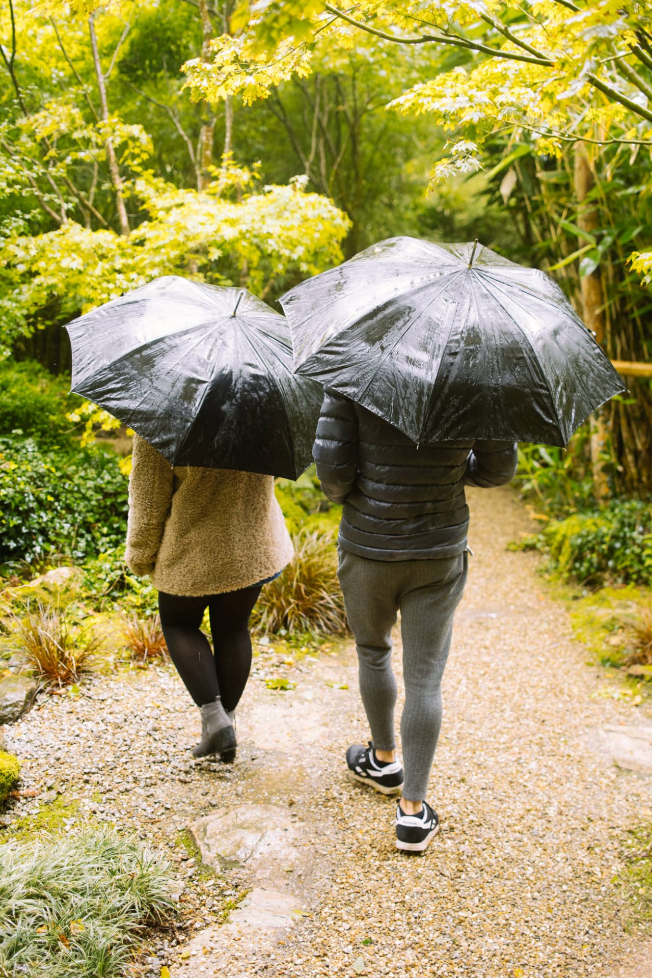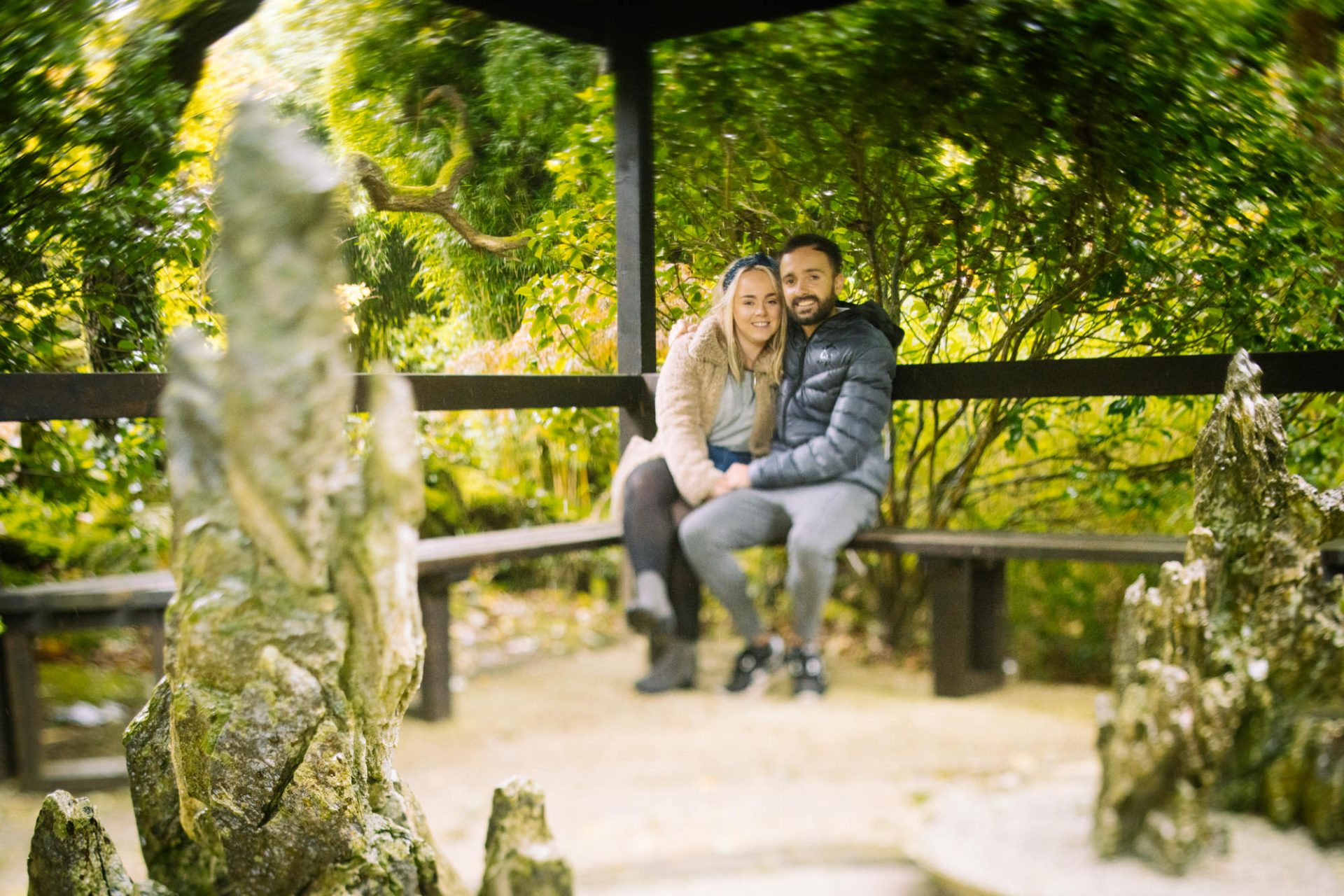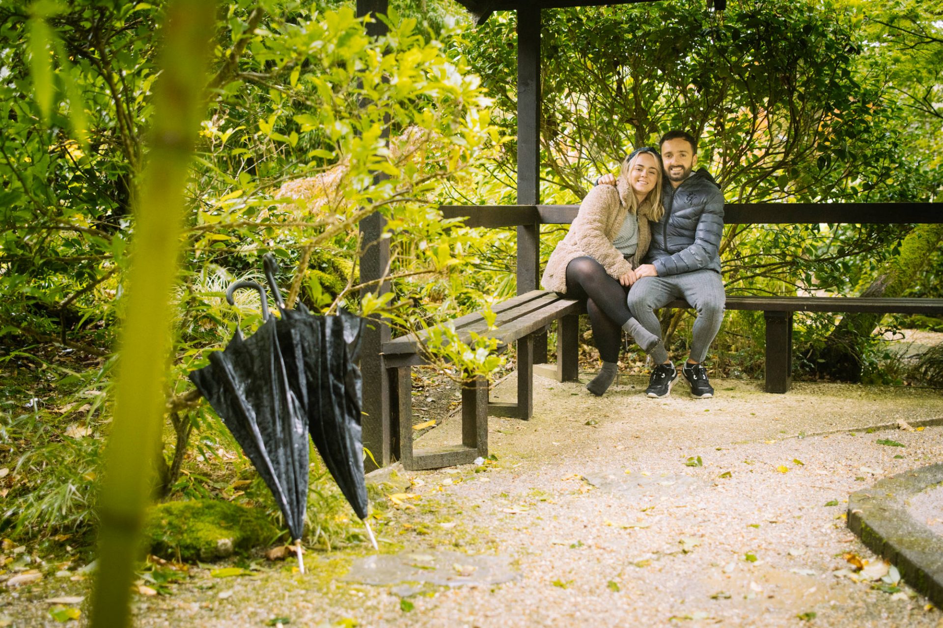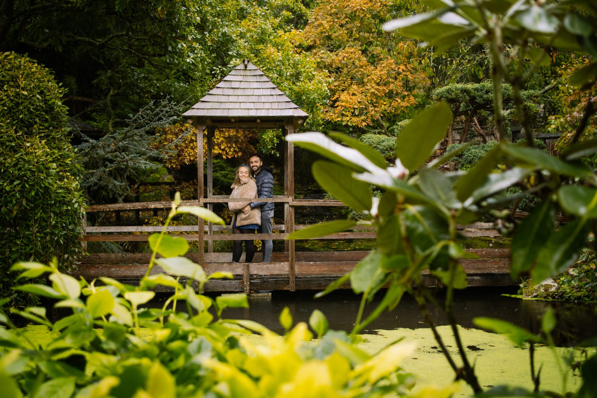 Lauren and Josh opted for a Japanese Garden shoot for their pre-wedding pictures. On a stormy Cornish Sunday, I met these lovely humans in the carpark at Watergate bay for their pre-wedding shoot. As it turned out, conditions were somewhat inclement! Indeed, the wind was gusting to 40 mph plus and the rain lashing so hard that it was impossible to shoot on the beach as planned. Luckily I remembered that the Japanese Garden in the nearby village of St Mawgan was open. The Japanese Garden nestles in a sheltered valley a stones throw from Newquay airport. Most importantly, it is protected from the wind! As the website says, it is: Built as a meditative garden. Therefore, it is the perfect space where one can calm the mind and let go of unwanted stress through contemplation and reflection.
