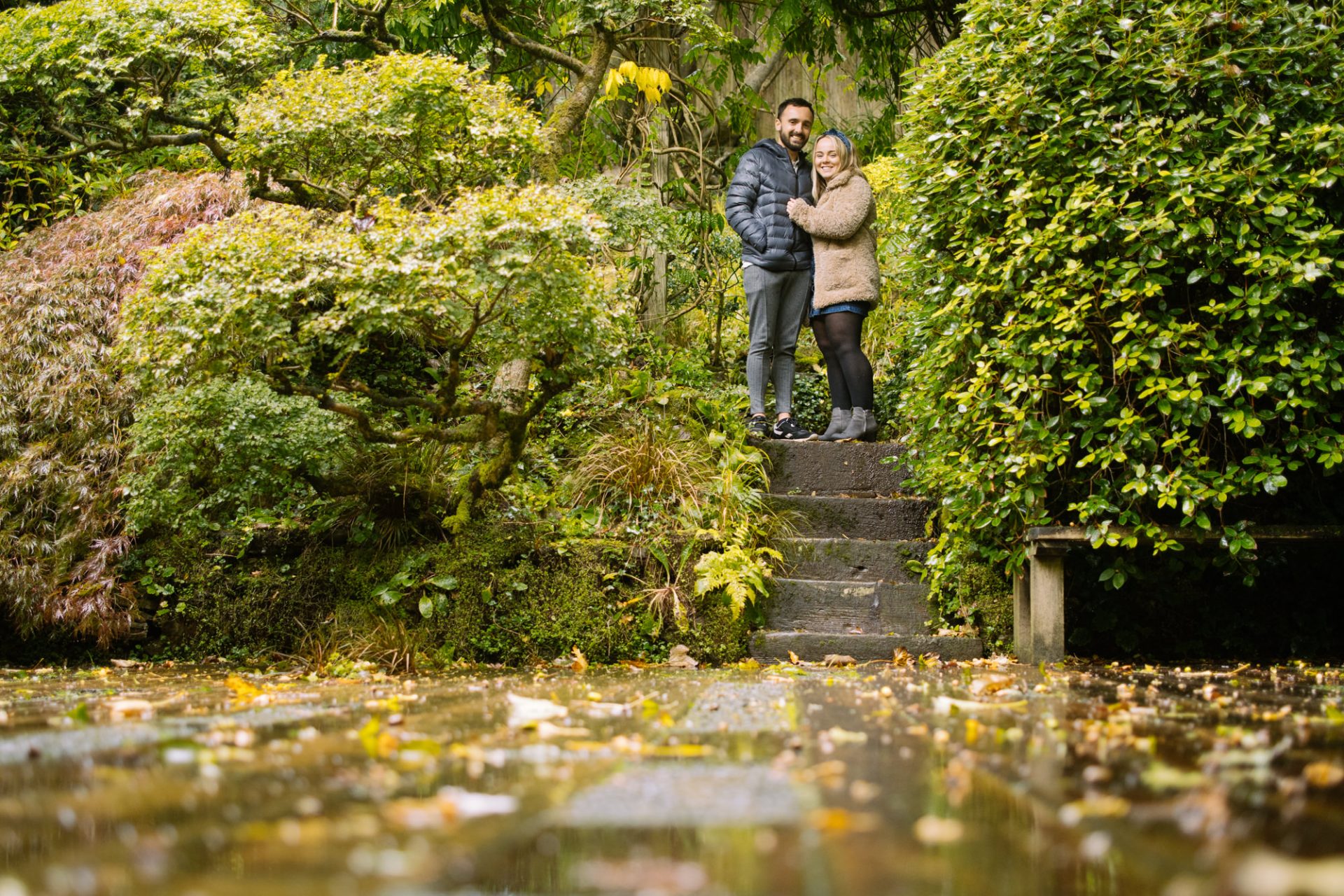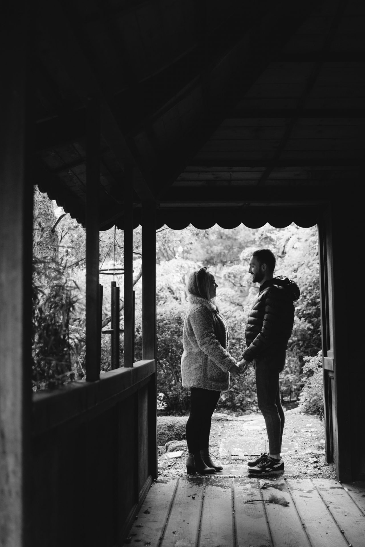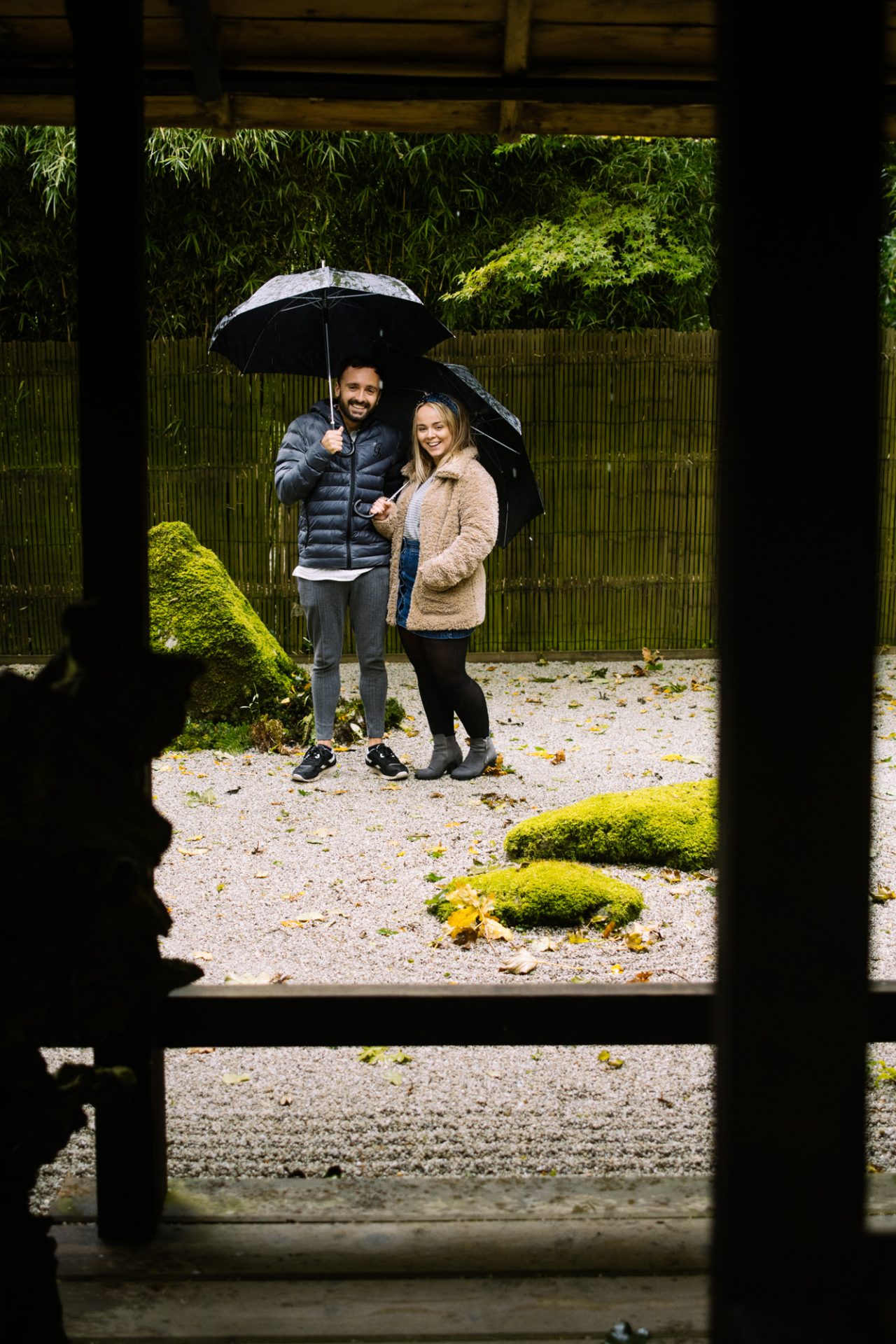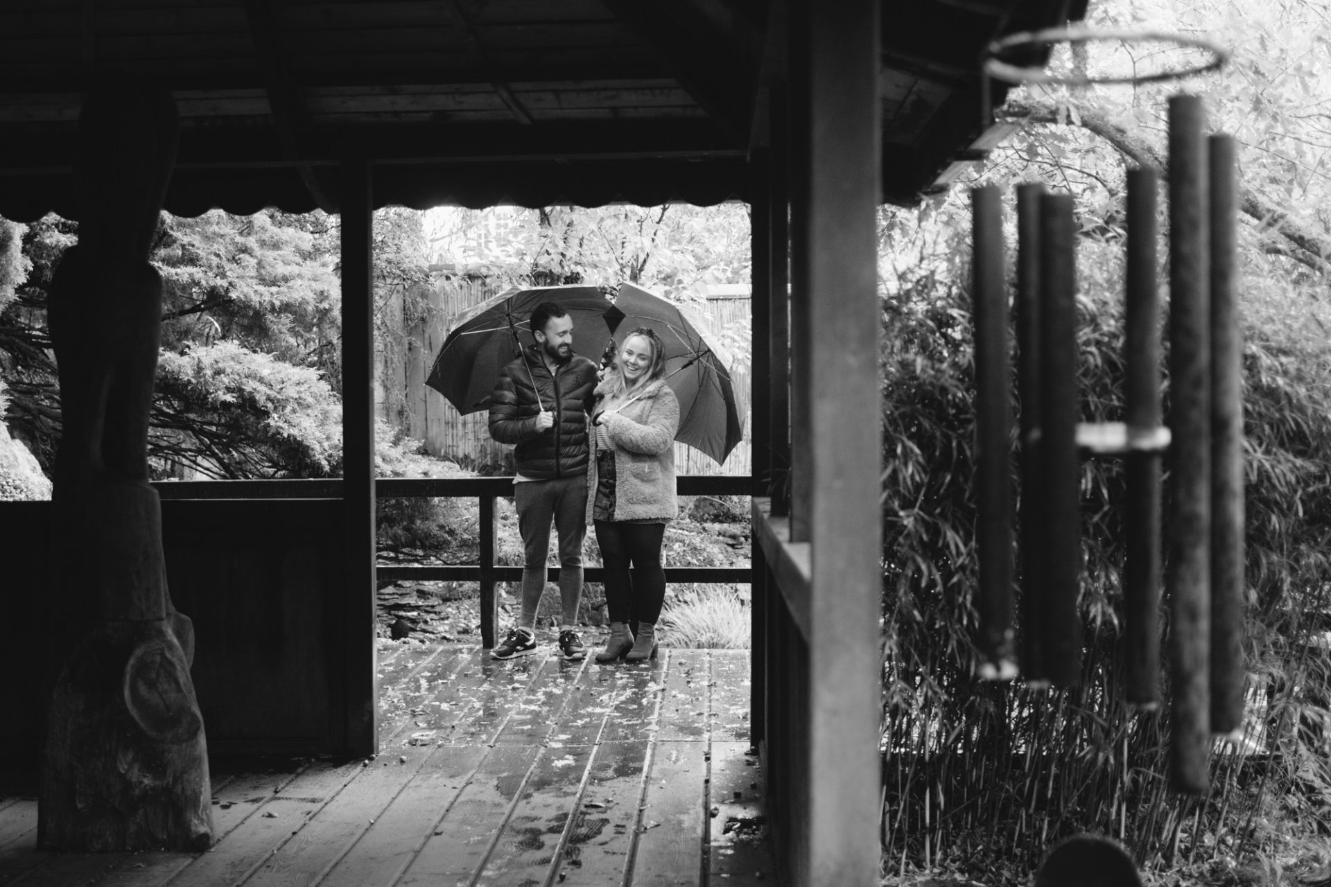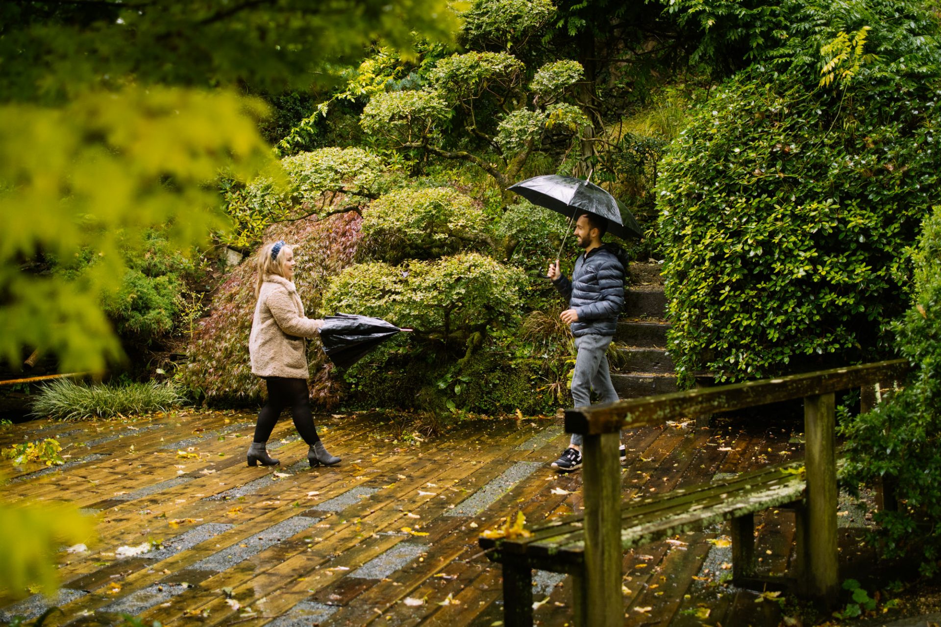 Lauren and Josh opted for a Japanese Garden shoot for their pre-wedding pictures. On a stormy Cornish Sunday, I met these lovely humans in the carpark at Watergate bay for their pre-wedding shoot. As it turned out, conditions were somewhat inclement! Indeed, the wind was gusting to 40 mph plus and the rain lashing so hard that it was impossible to shoot on the beach as planned. Luckily I remembered that the Japanese Garden in the nearby village of St Mawgan was open. The Japanese Garden nestles in a sheltered valley a stones throw from Newquay airport. Most importantly, it is protected from the wind! As the website says, it is: Built as a meditative garden. Therefore, it is the perfect space where one can calm the mind and let go of unwanted stress through contemplation and reflection.