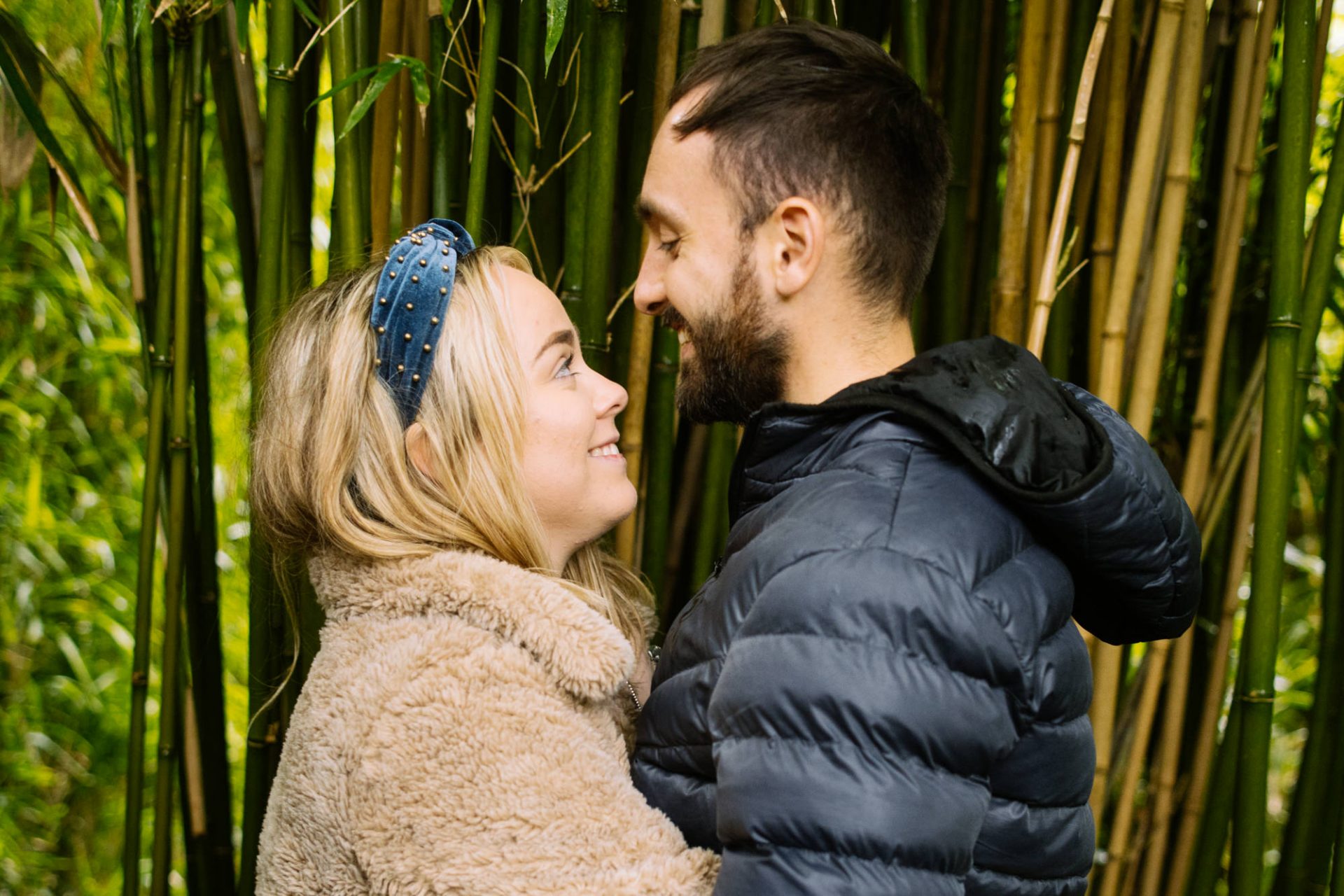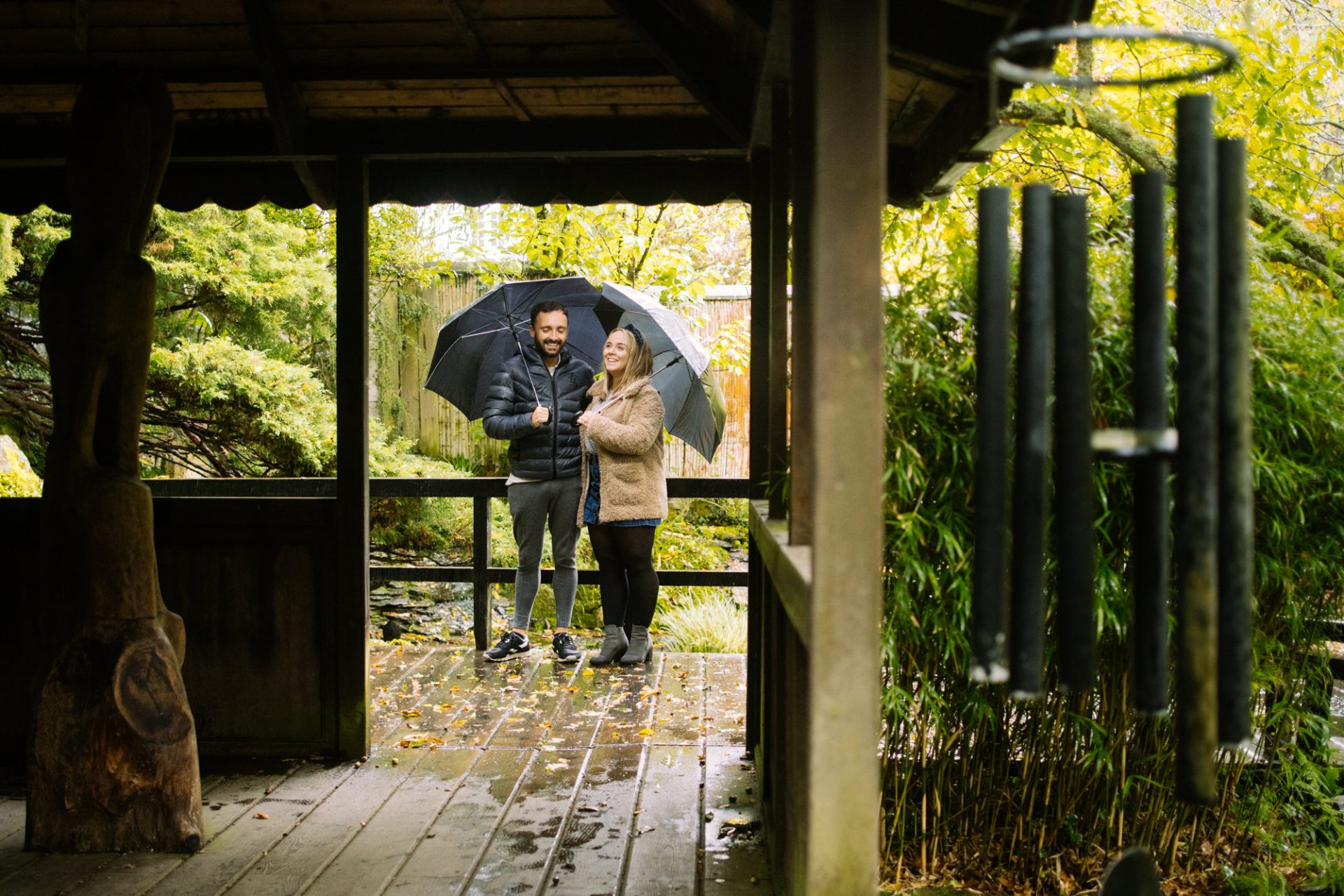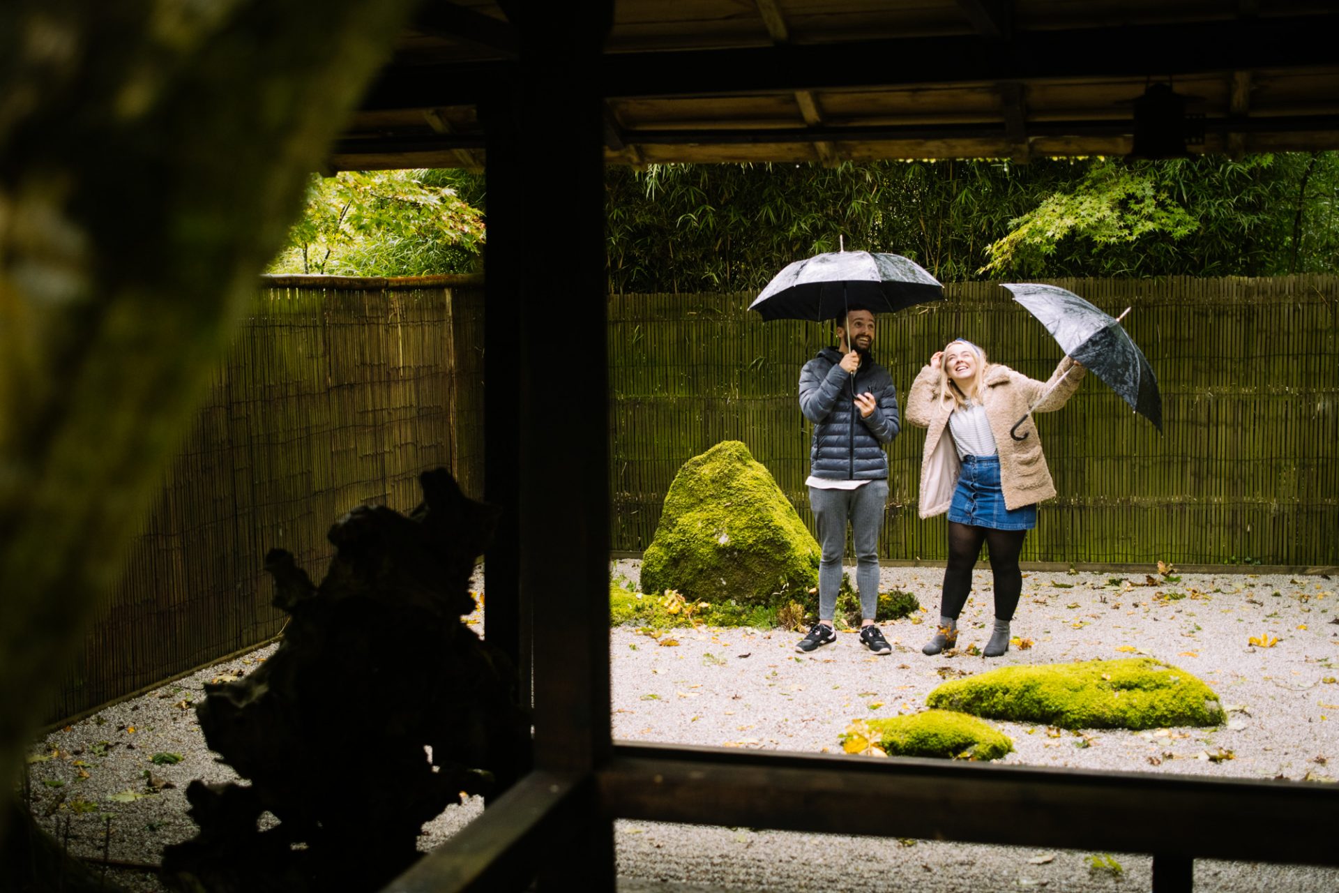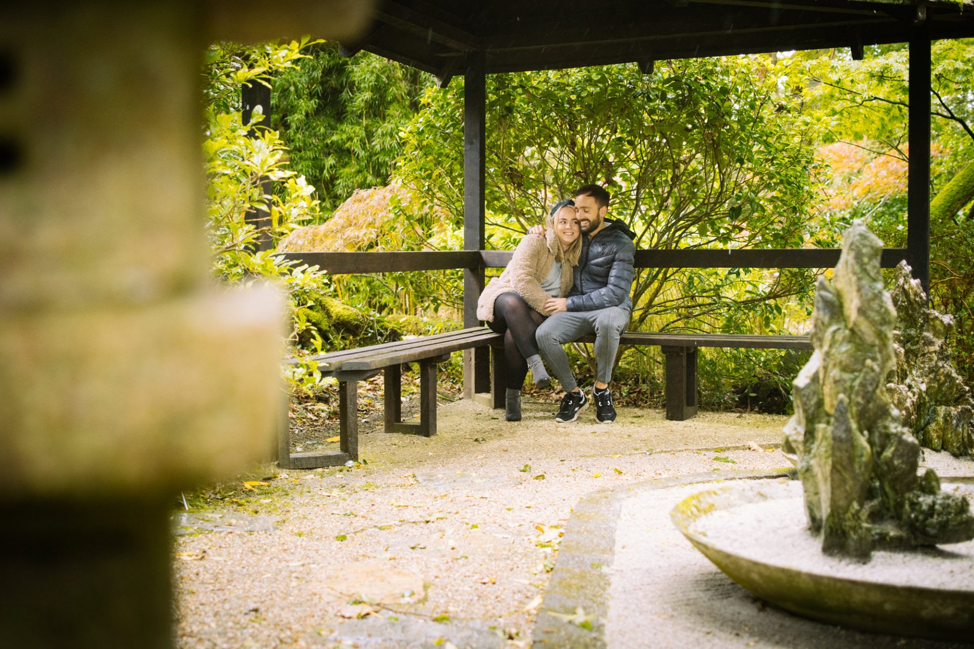 Lauren and Josh opted for a Japanese Garden shoot for their pre-wedding pictures. On a stormy Cornish Sunday, I met these lovely humans in the carpark at Watergate bay for their pre-wedding shoot. As it turned out, conditions were somewhat inclement! Indeed, the wind was gusting to 40 mph plus and the rain lashing so hard that it was impossible to shoot on the beach as planned. Luckily I remembered that the Japanese Garden in the nearby village of St Mawgan was open. The Japanese Garden nestles in a sheltered valley a stones throw from Newquay airport. Most importantly, it is protected from the wind! As the website says, it is: Built as a meditative garden. Therefore, it is the perfect space where one can calm the mind and let go of unwanted stress through contemplation and reflection.