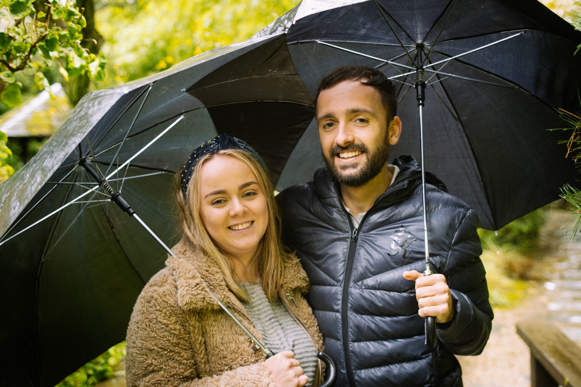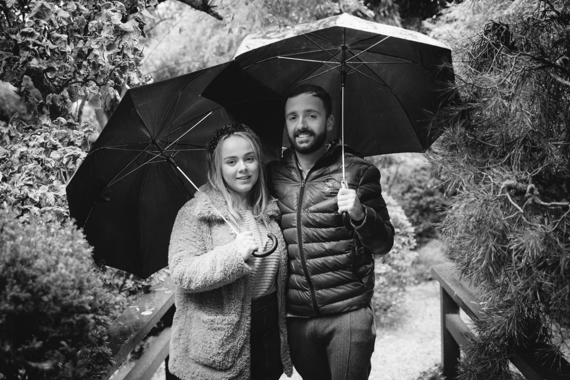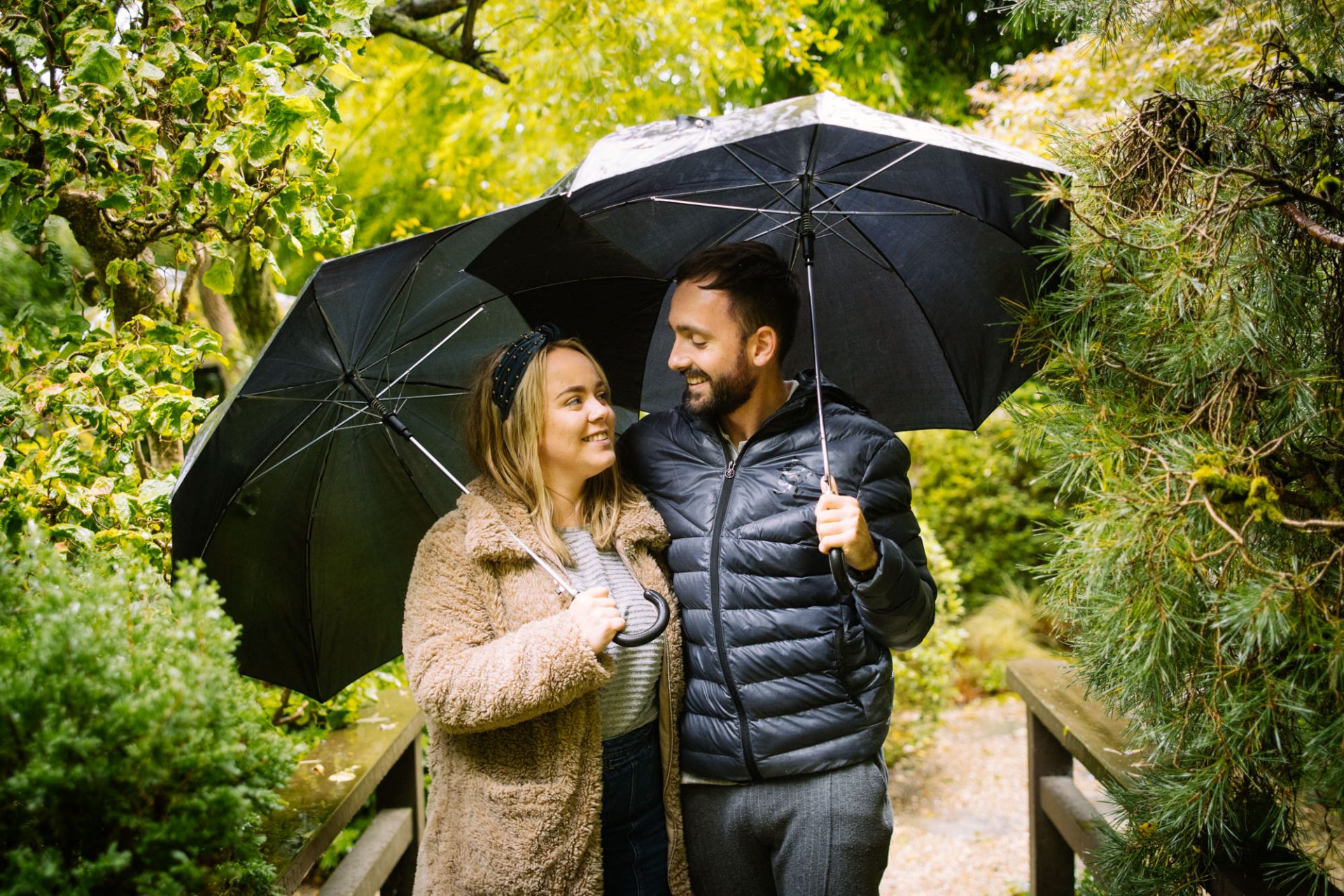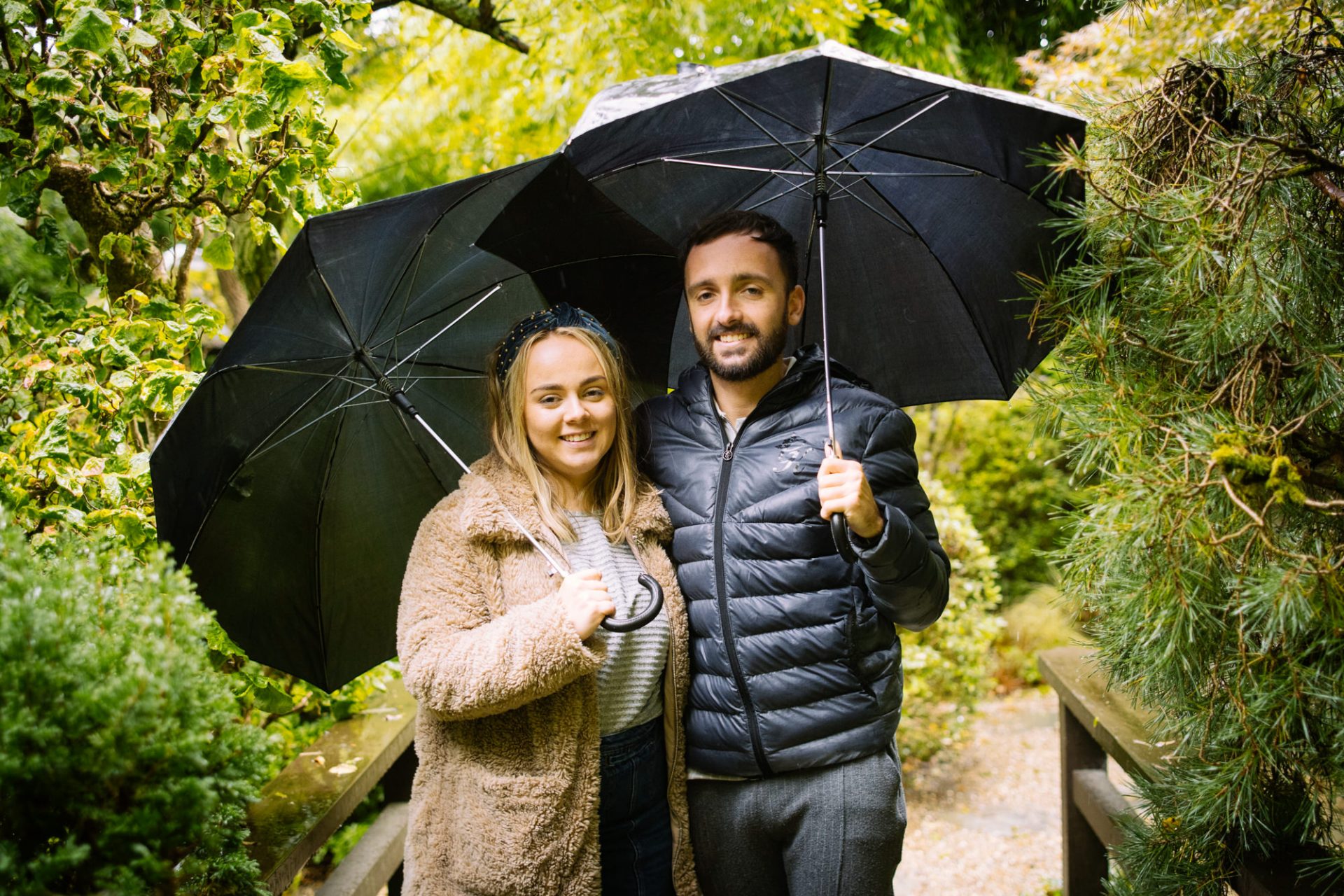 Now, Lauren and Josh are due to get married next year at The Green near Liskeard. Like many other couples they have had to postpone their wedding from 2020. However, this fact was not going to stop us having some fun during their pre-wedding shoot. The Japanese garden kindly leant us some umbrellas to keep the rain from spoiling our happy couple’s contemplation and meditation! Consequently, Lauren and Josh were able to appreciate the early autumnal hues of the garden on the cusp of seasonal change. At times, the storm seemed a million miles away. We left feeling energised and hopeful for the future thanks to this calm oasis of zen.
