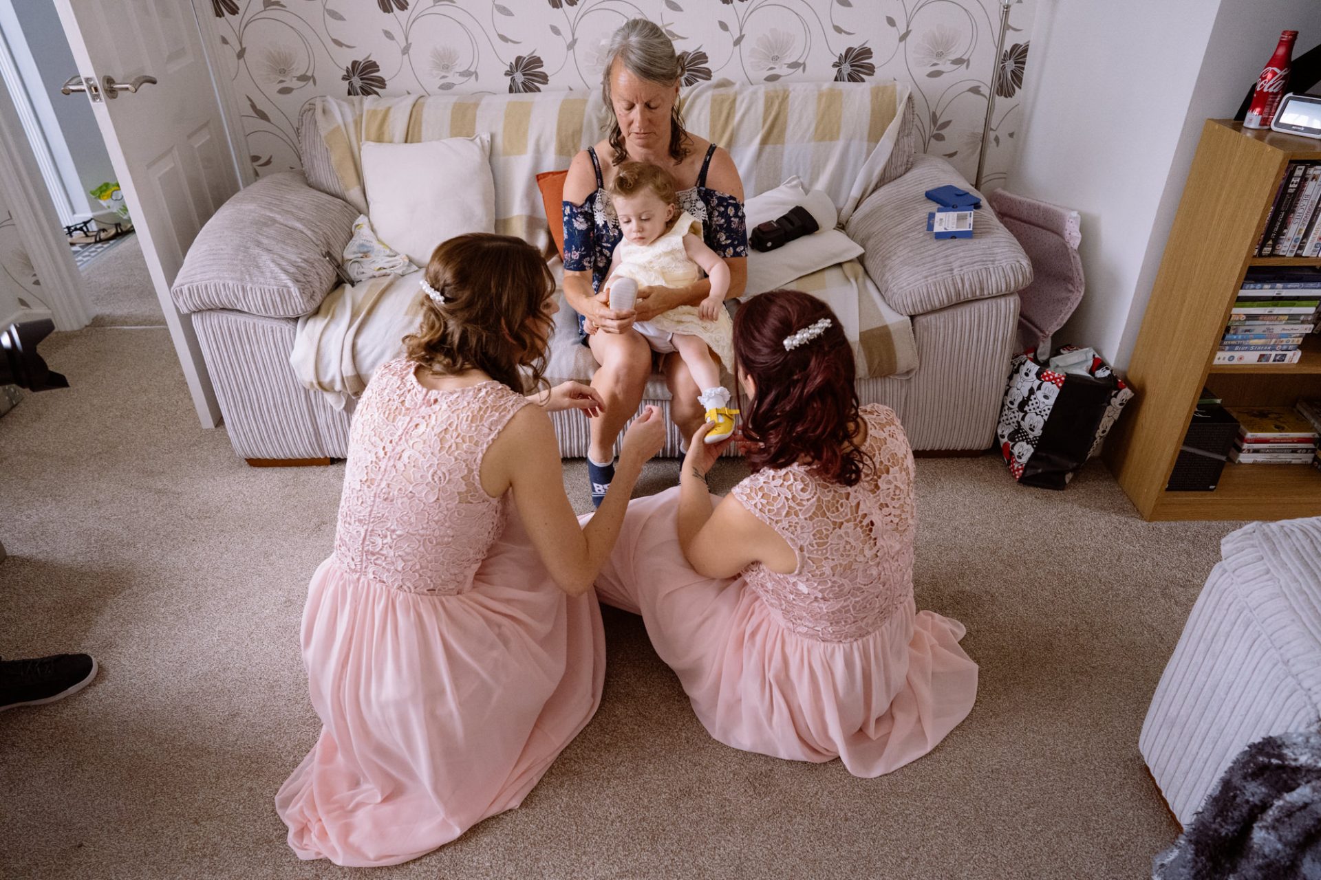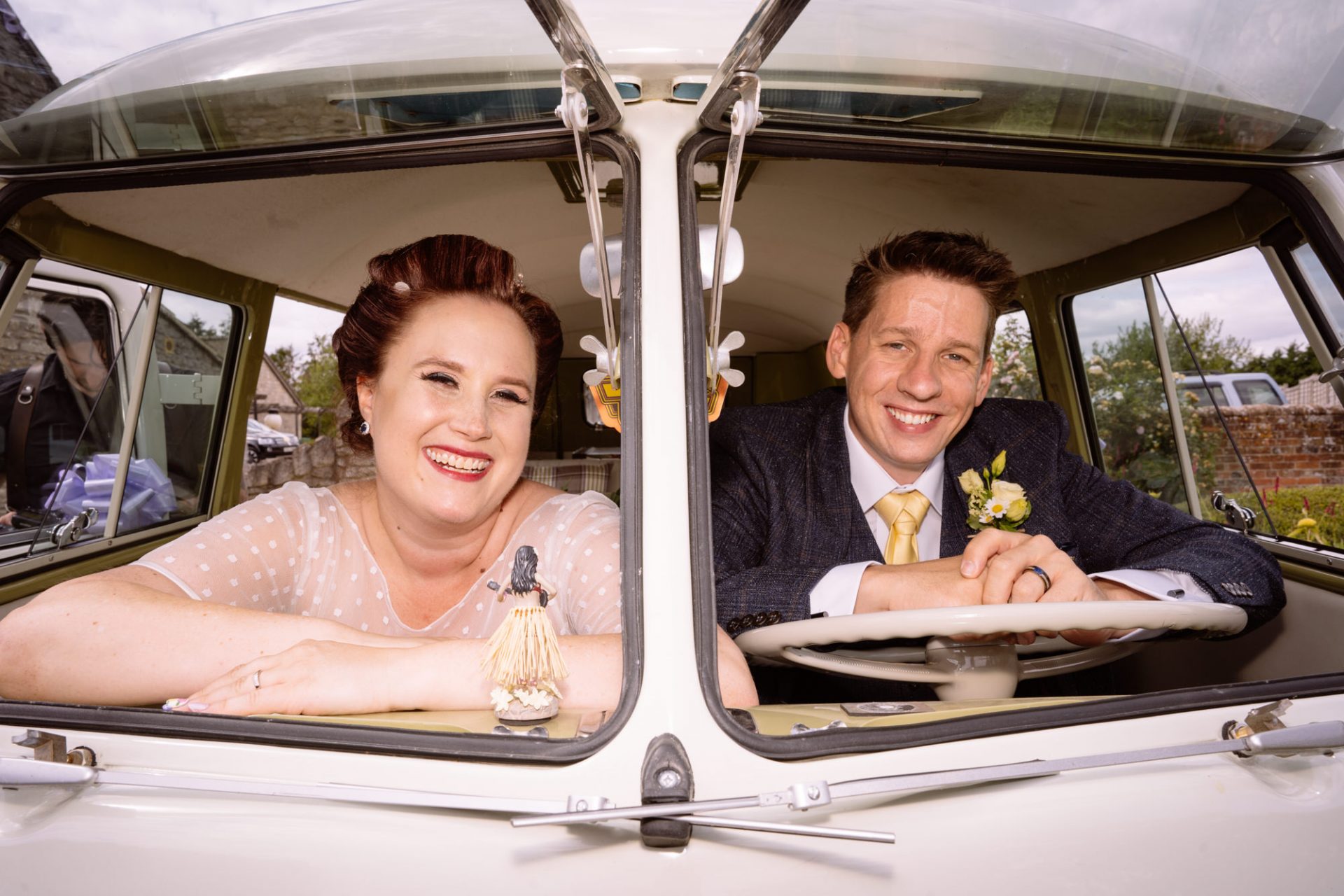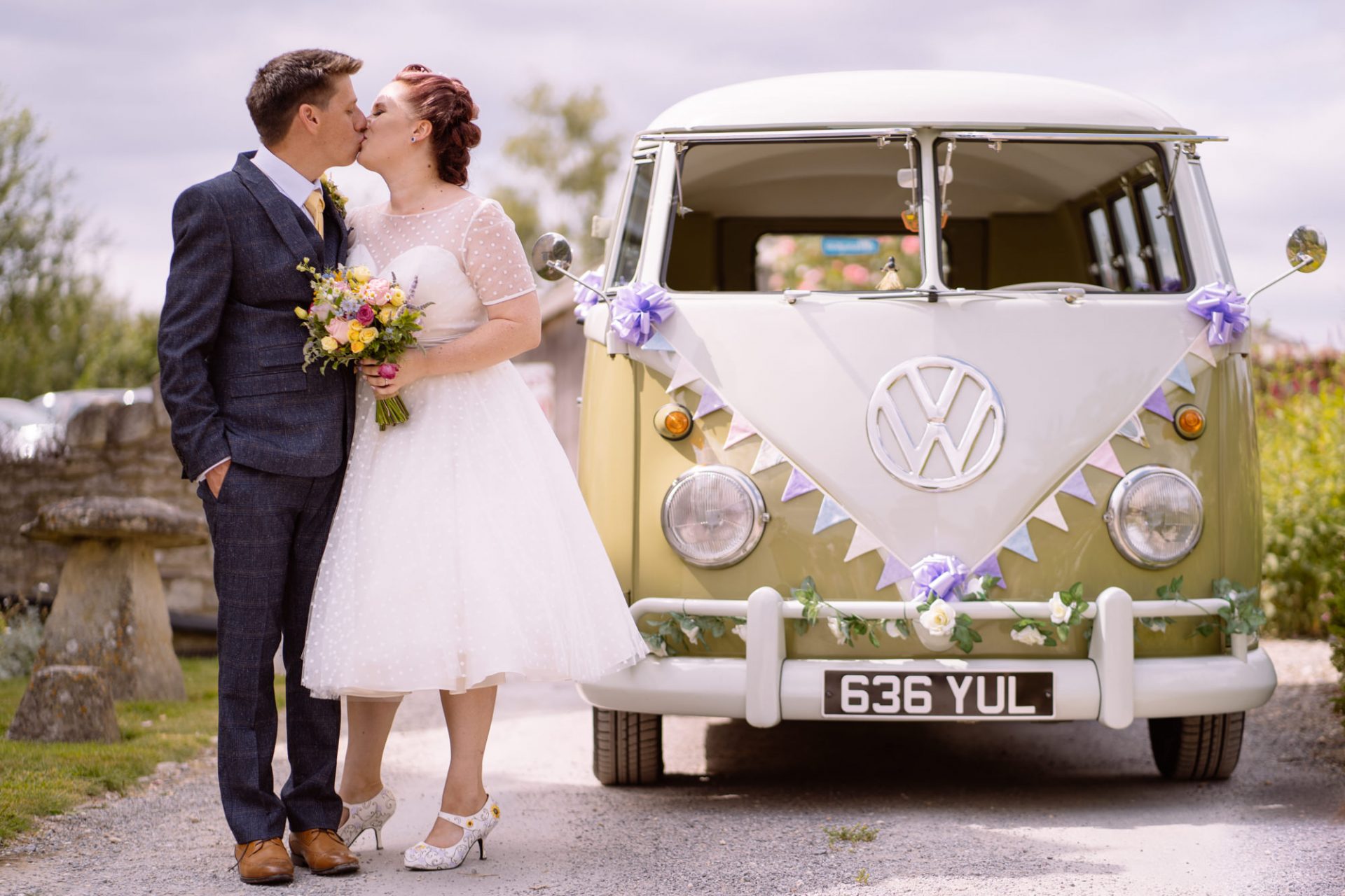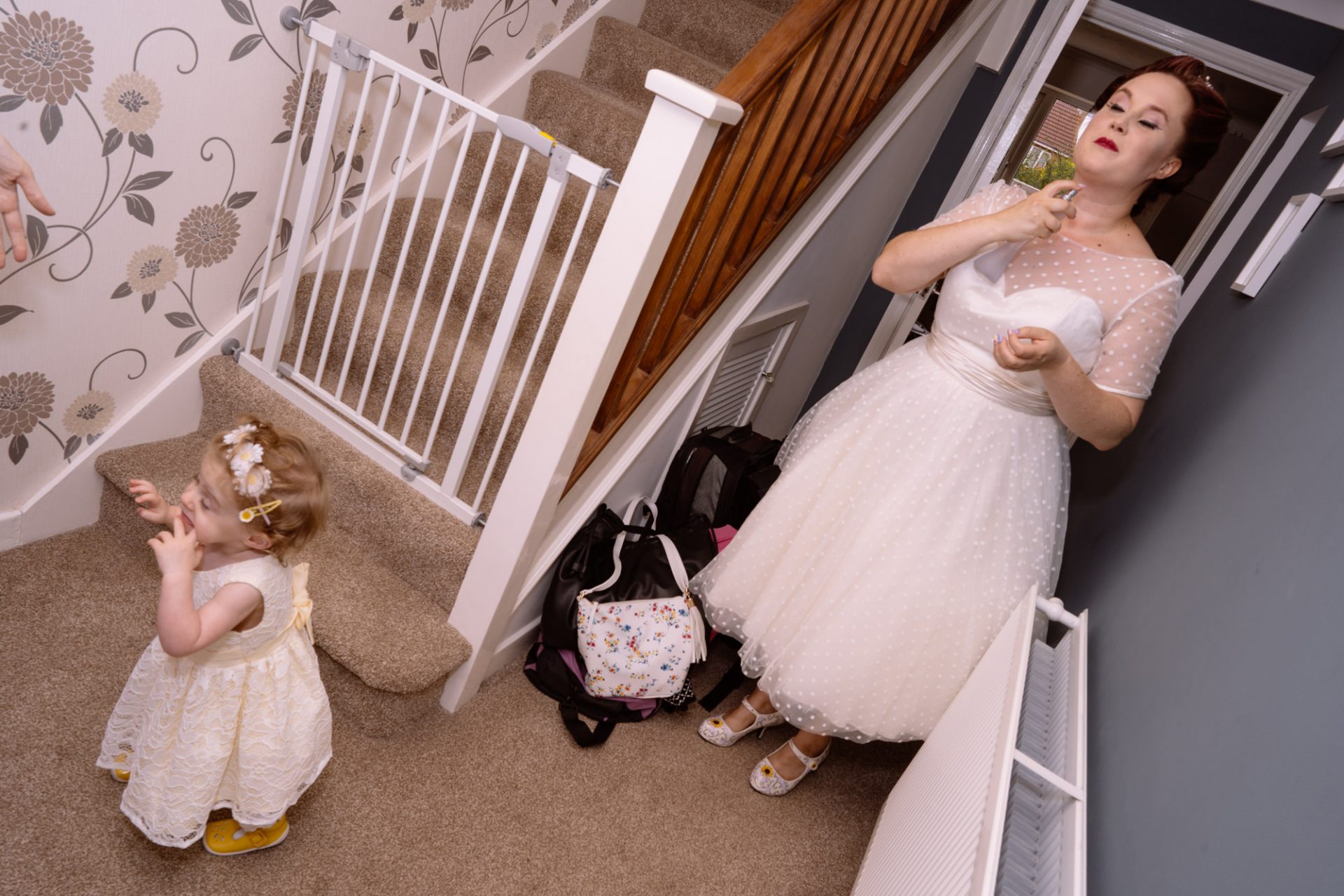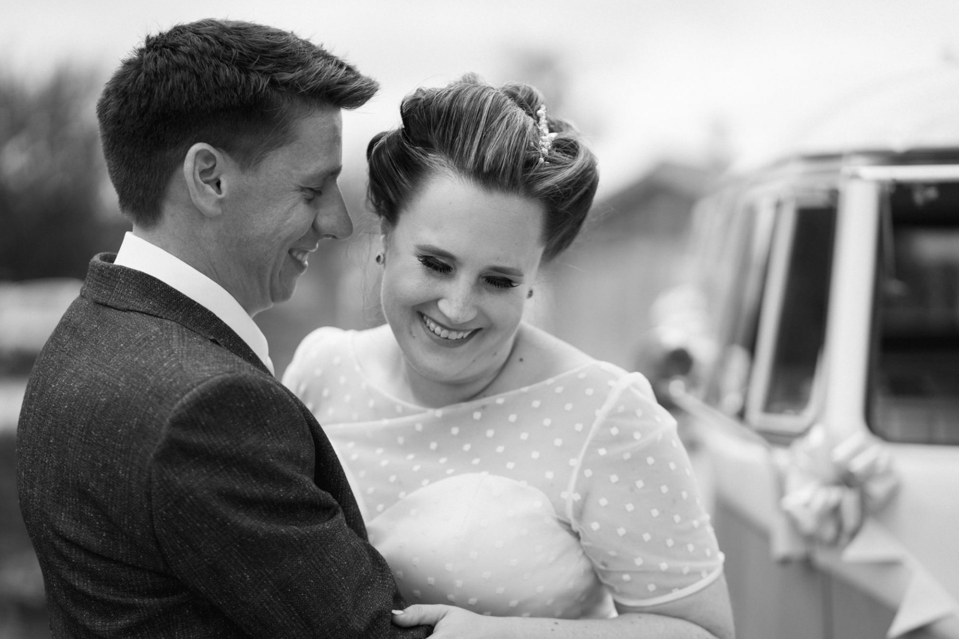 Whilst Tracey (I mean Lisa) was getting ready, the people on her street were congregating outside. Once Lisa came out of the house to wait for her bespoke VW campervan transport, they crowded round. There were some tears and plenty of neighbourly advice to be had. I love photographing the contrast between the normality of a street scene versus the pomp and circumstance of a family wedding. Lisa, her bridesmaids and the shiny campervan looked as though they’d been beamed straight from another part of history.