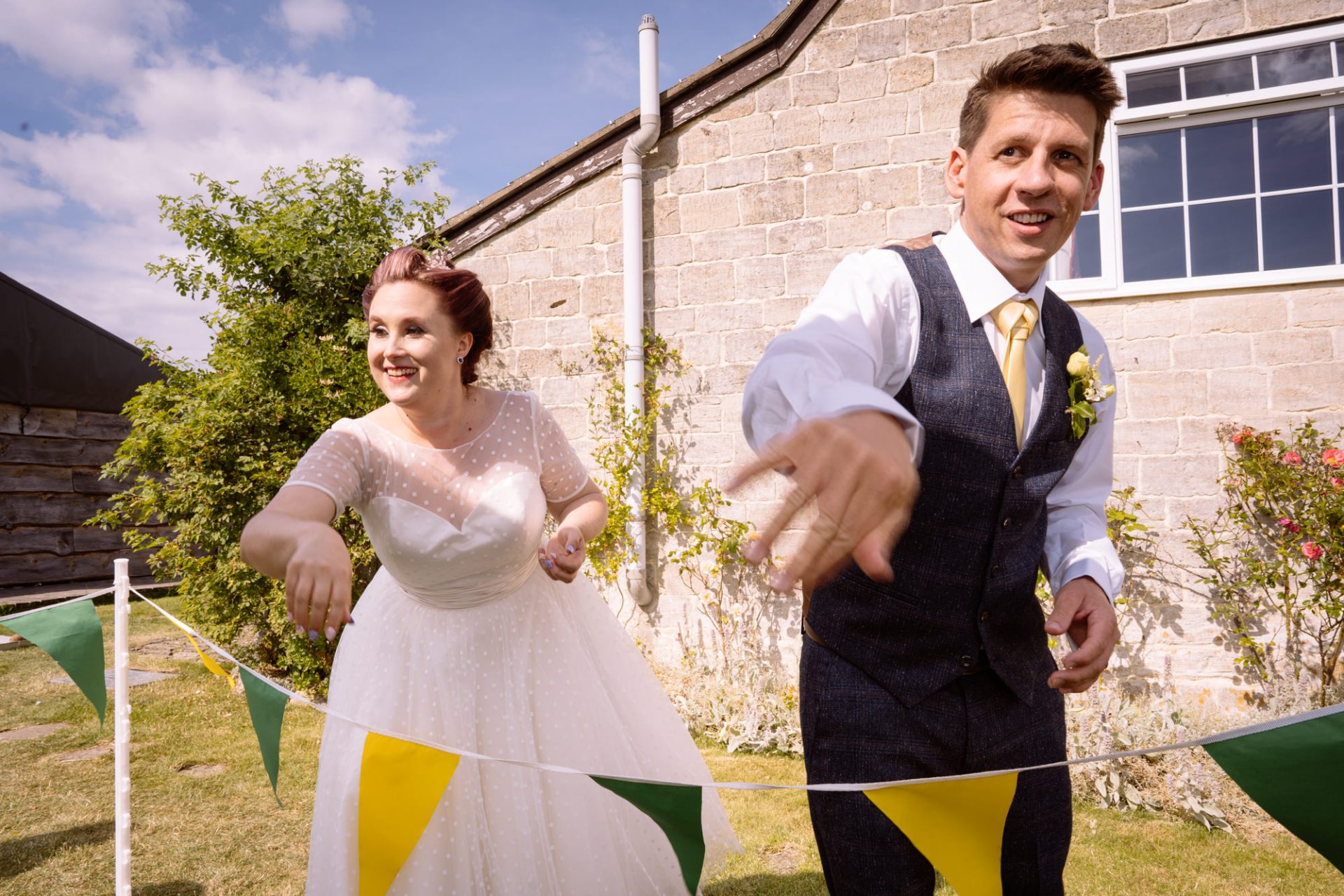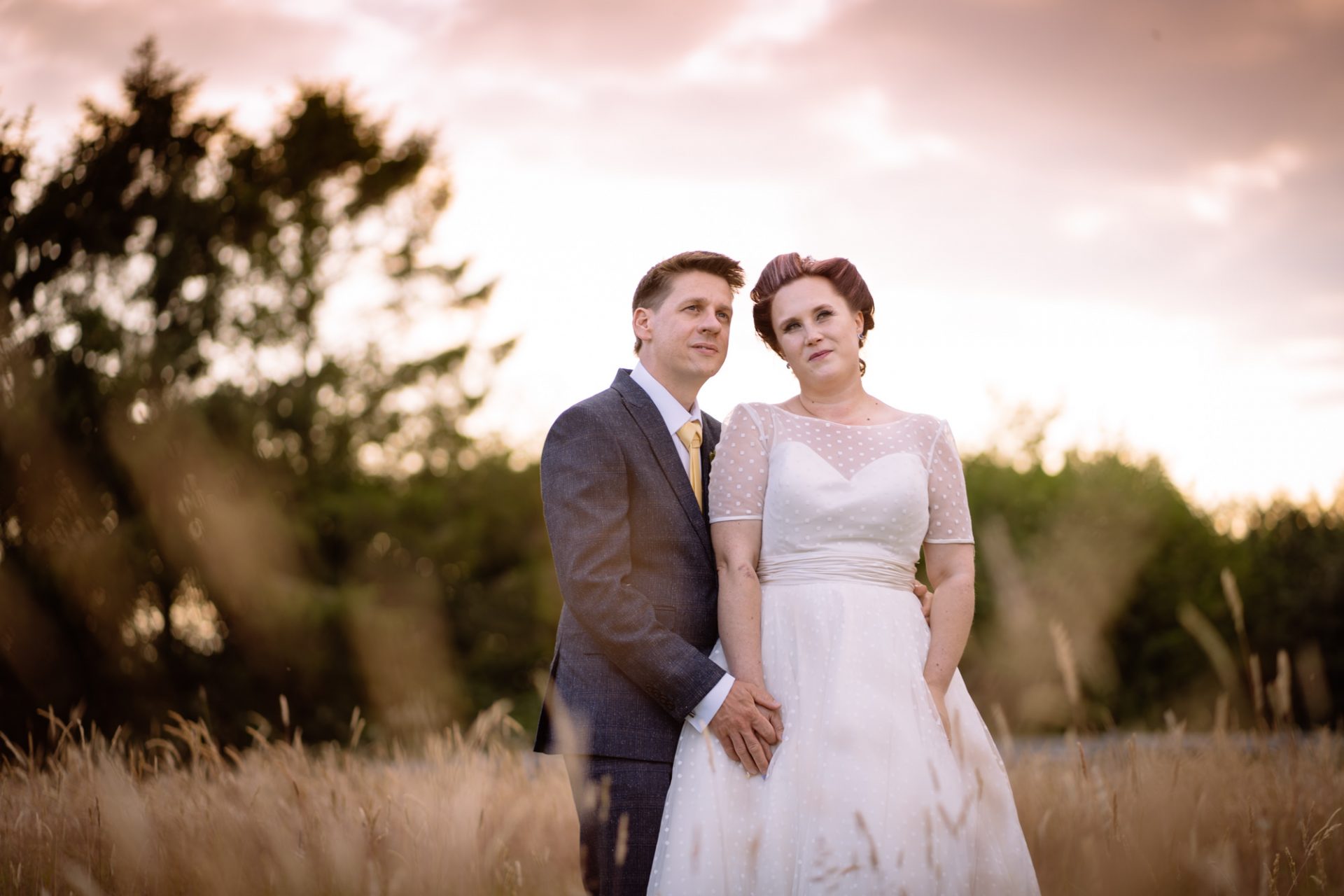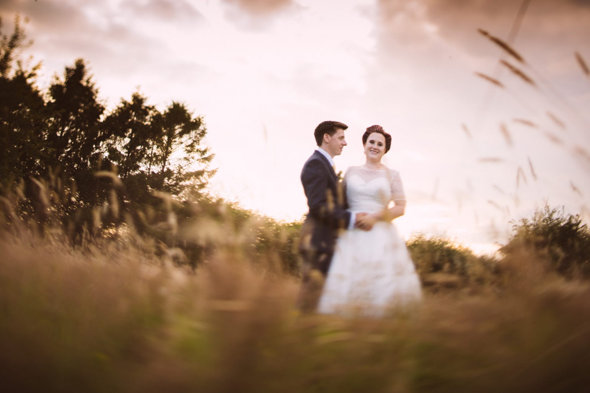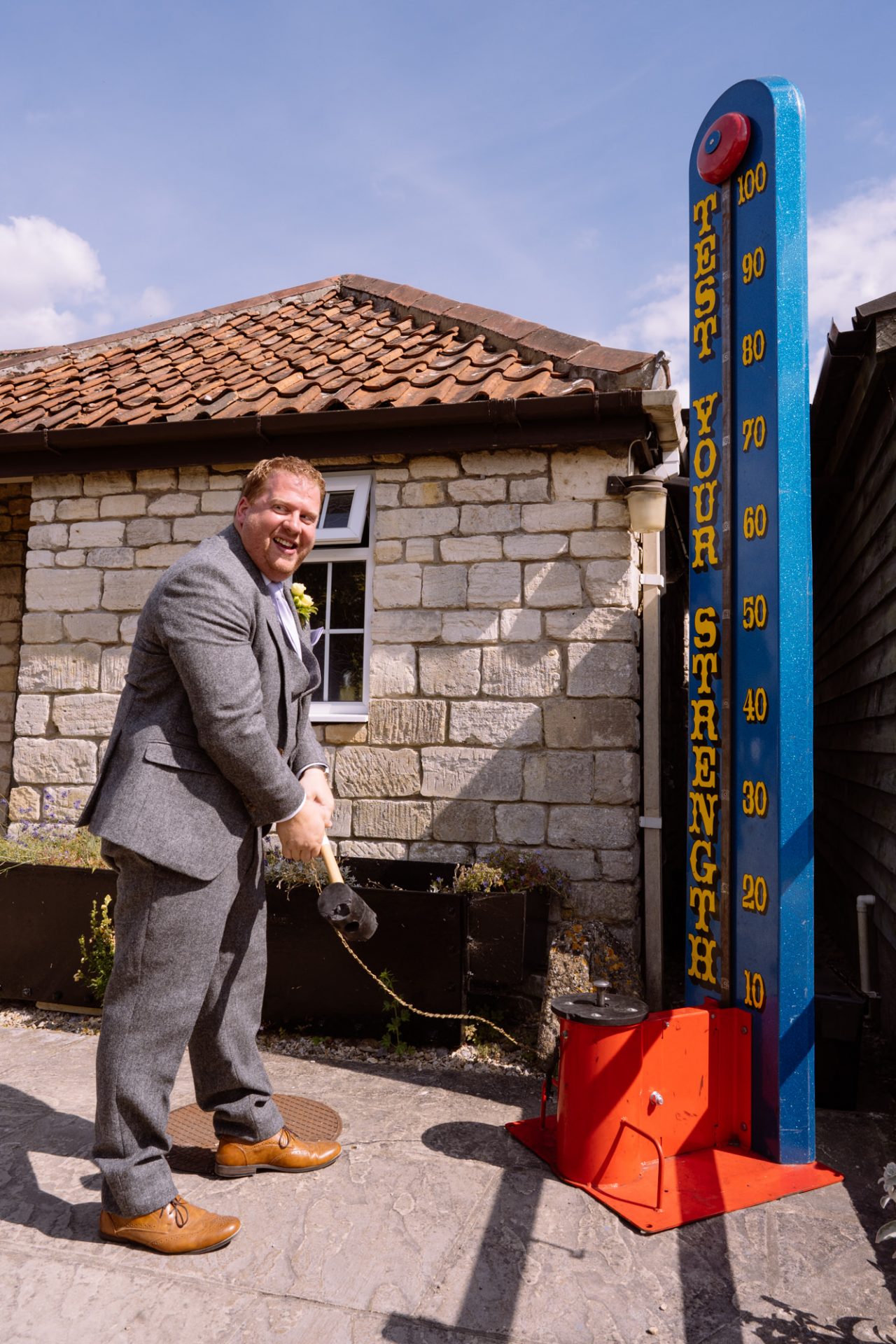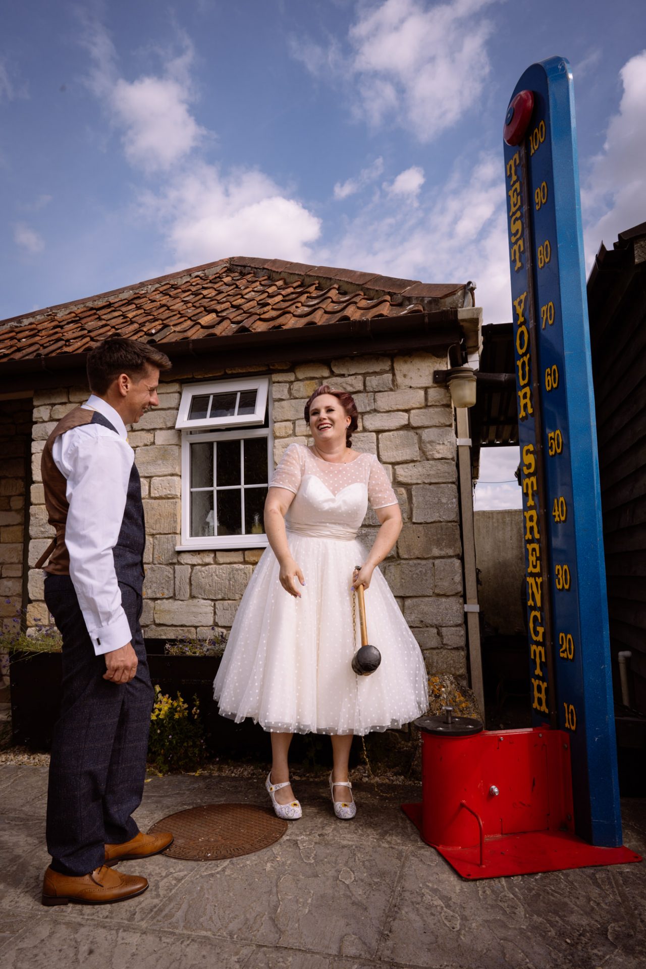 Tra.. Lisa and Chris had put on some fairground games for their guests to enjoy. I enjoyed photographing many attempts at the coconut shy, tincan alley and traditional skittles. In addition, the ‘Test Your Strength’ machine is always fun once a few Gin and Tonics have been consumed! The happy couple both managed to ring the bell before it was time to eat. Post meal, as the shadows lengthened, I whispered in Lisa’s (and possibly Tracey’s) ear that it might be an idea to head to The Moonraker hotel’s meadow. Once omongst the tall grass we were blessed with a soft evening light that caressed our couple’s rosy features. After taking portraits outside we retired to the cosy orange glow of the hotel interior. It turned out that Lisa’s dress fitted perfectly into the bay window seats. I think she’s still there now!