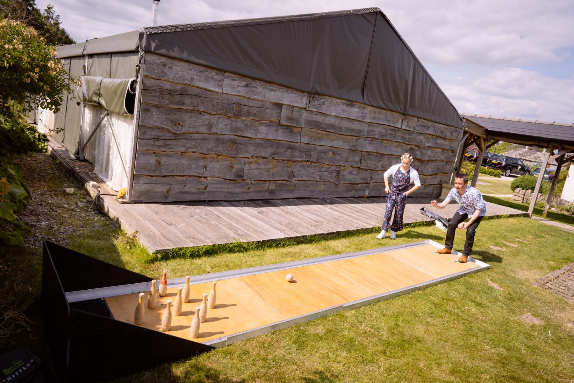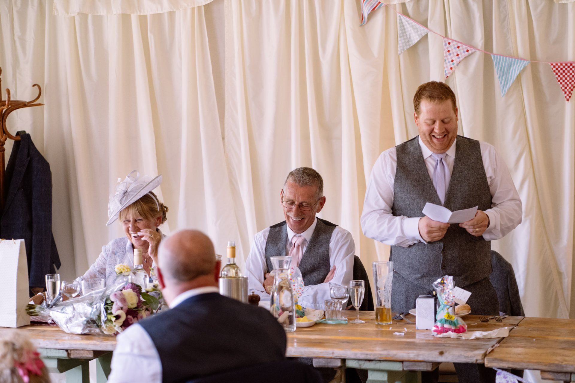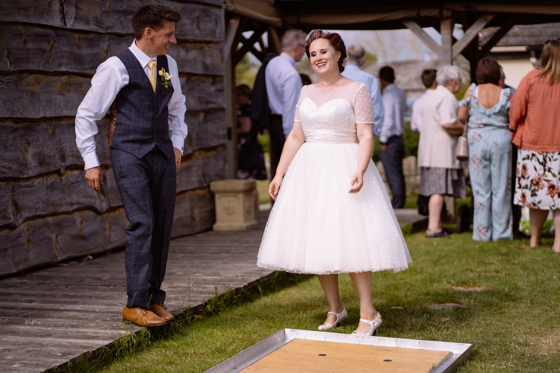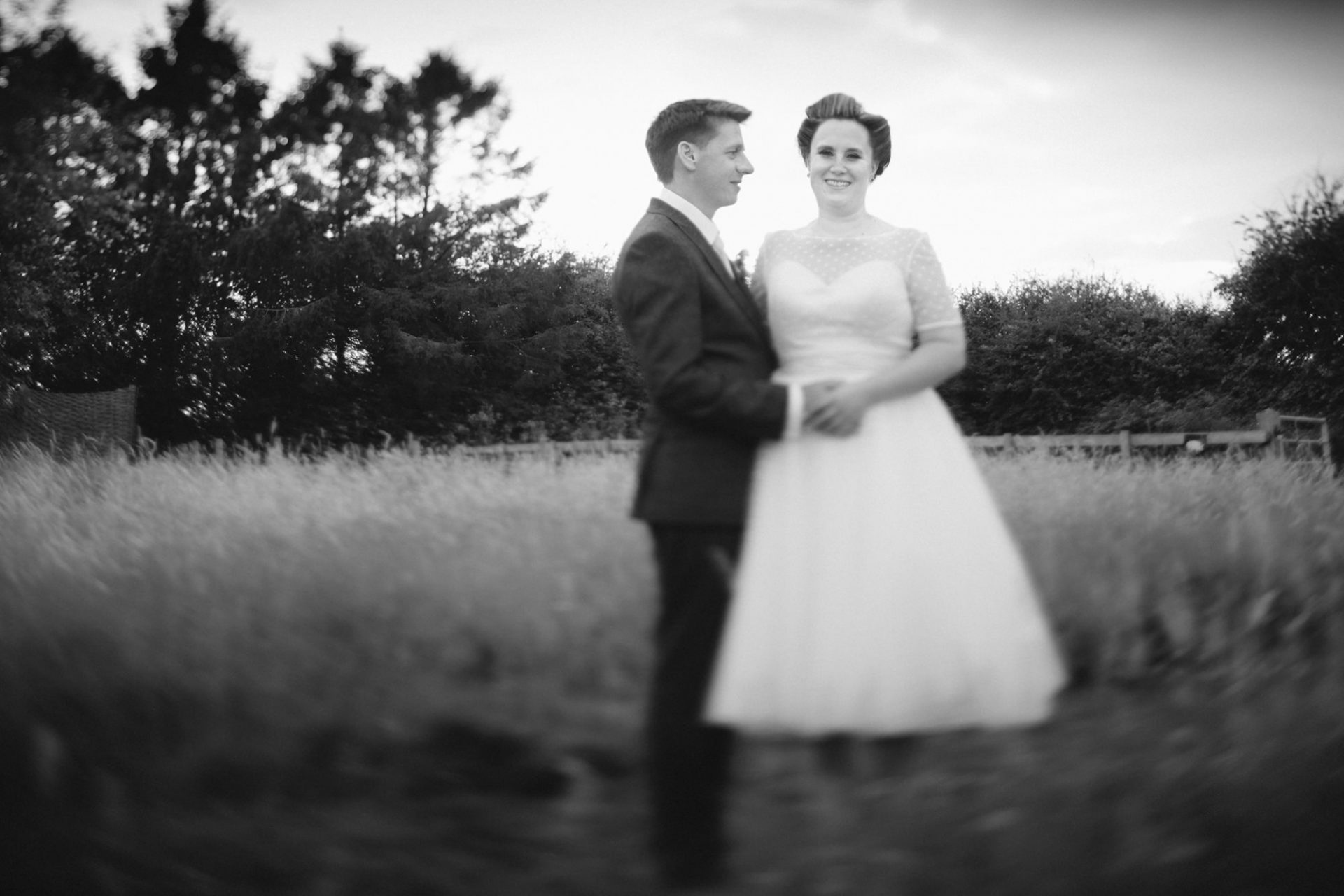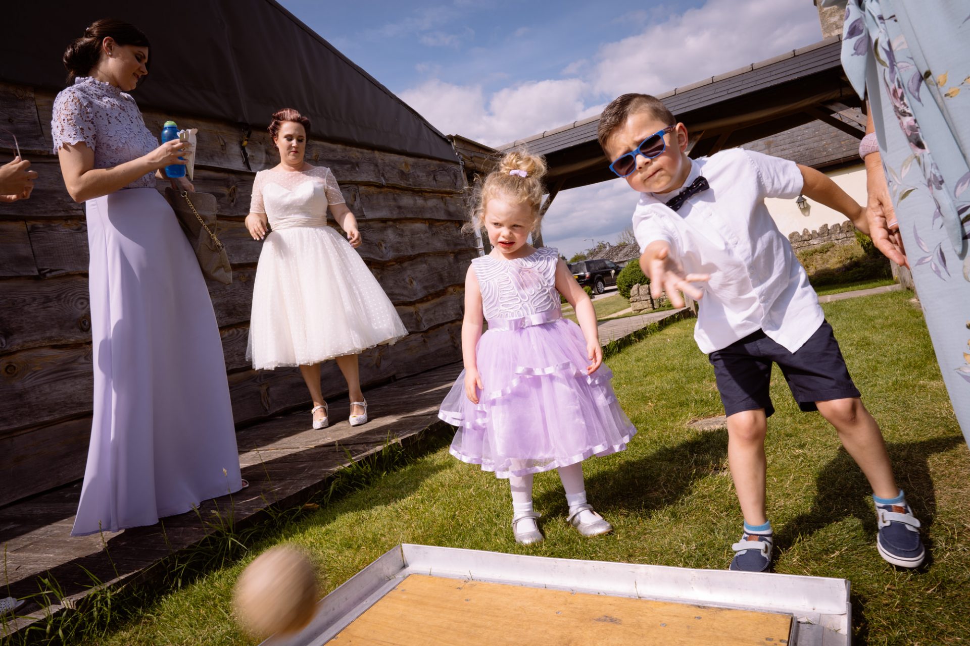 Tra.. Lisa and Chris had put on some fairground games for their guests to enjoy. I enjoyed photographing many attempts at the coconut shy, tincan alley and traditional skittles. In addition, the ‘Test Your Strength’ machine is always fun once a few Gin and Tonics have been consumed! The happy couple both managed to ring the bell before it was time to eat. Post meal, as the shadows lengthened, I whispered in Lisa’s (and possibly Tracey’s) ear that it might be an idea to head to The Moonraker hotel’s meadow. Once omongst the tall grass we were blessed with a soft evening light that caressed our couple’s rosy features. After taking portraits outside we retired to the cosy orange glow of the hotel interior. It turned out that Lisa’s dress fitted perfectly into the bay window seats. I think she’s still there now!