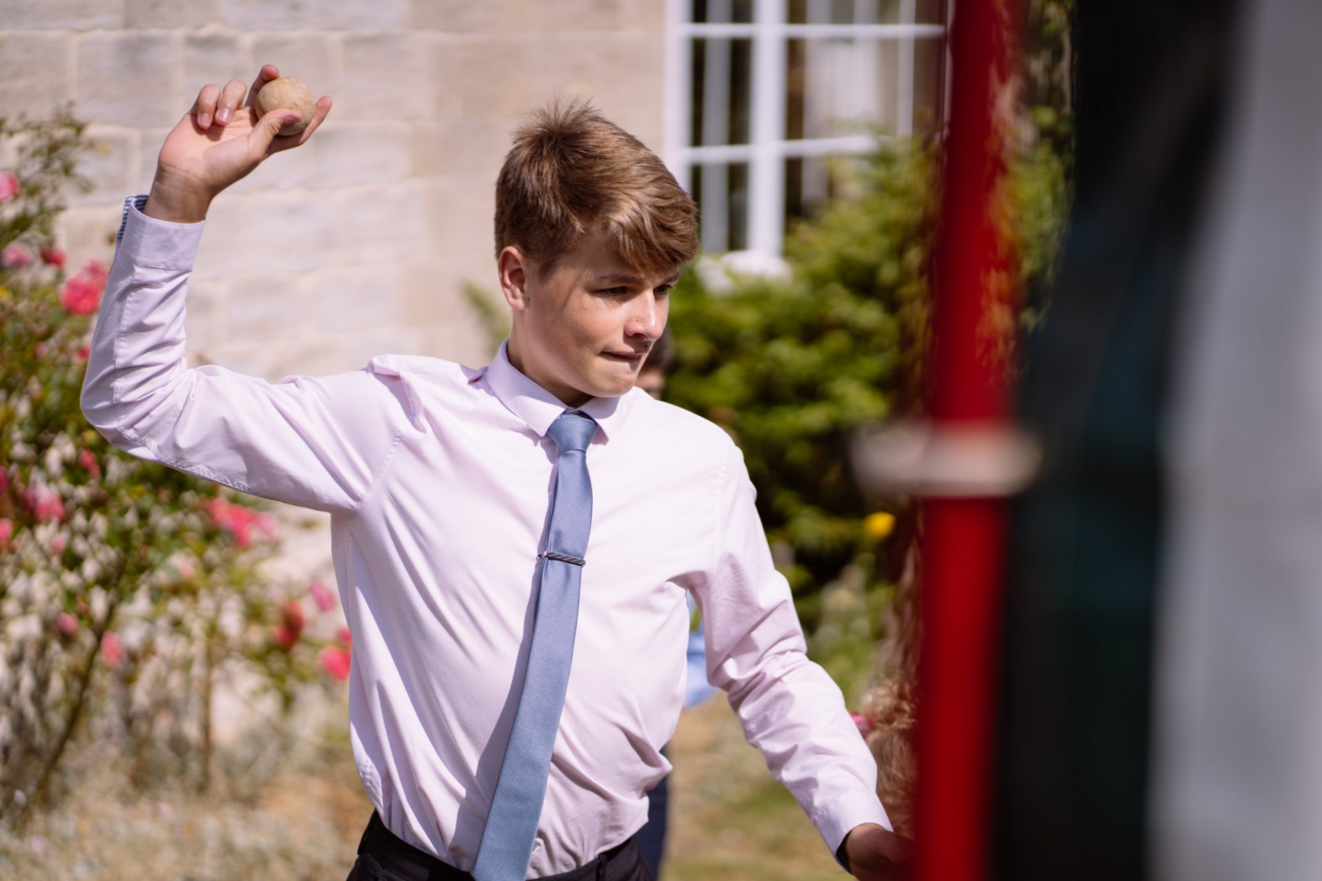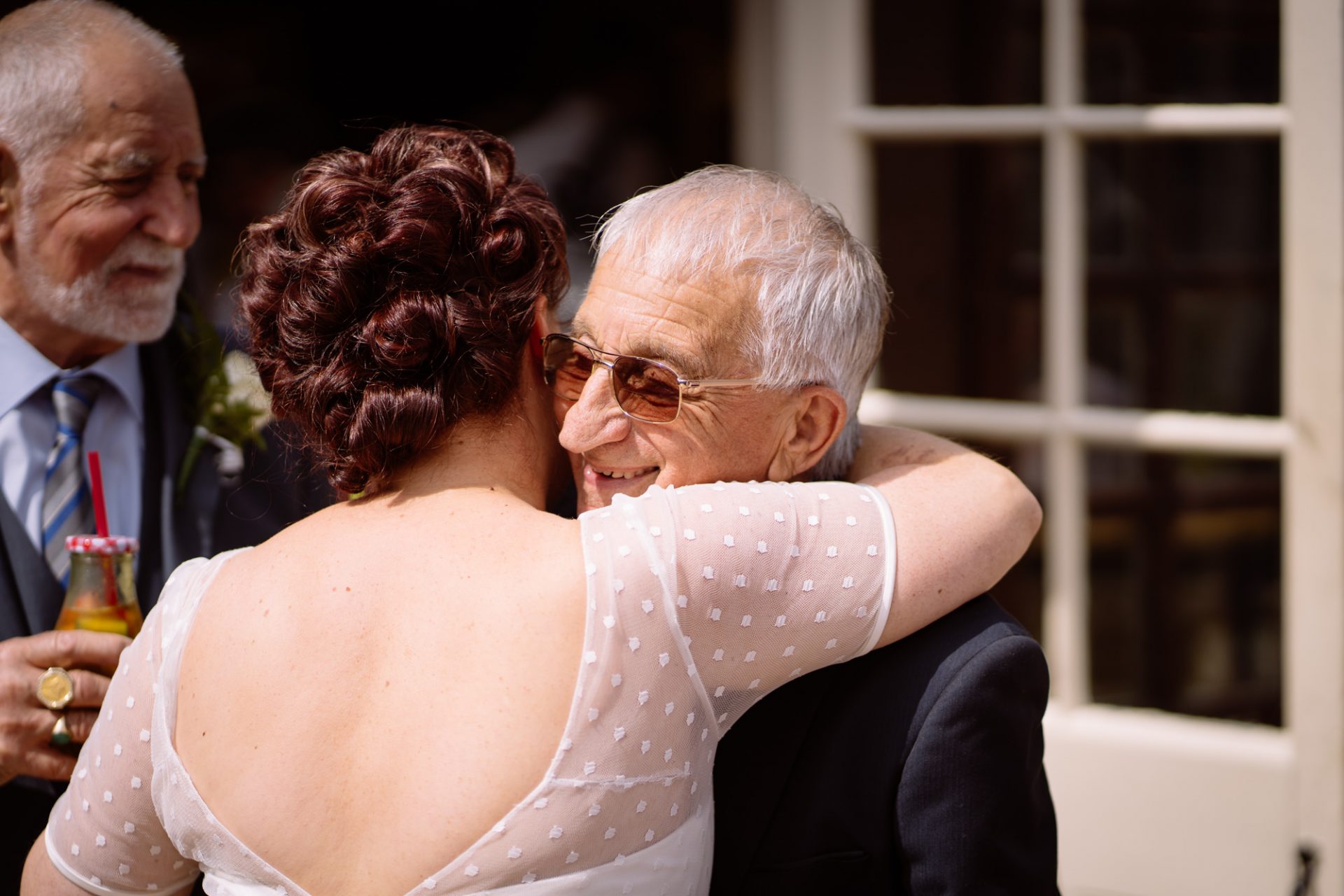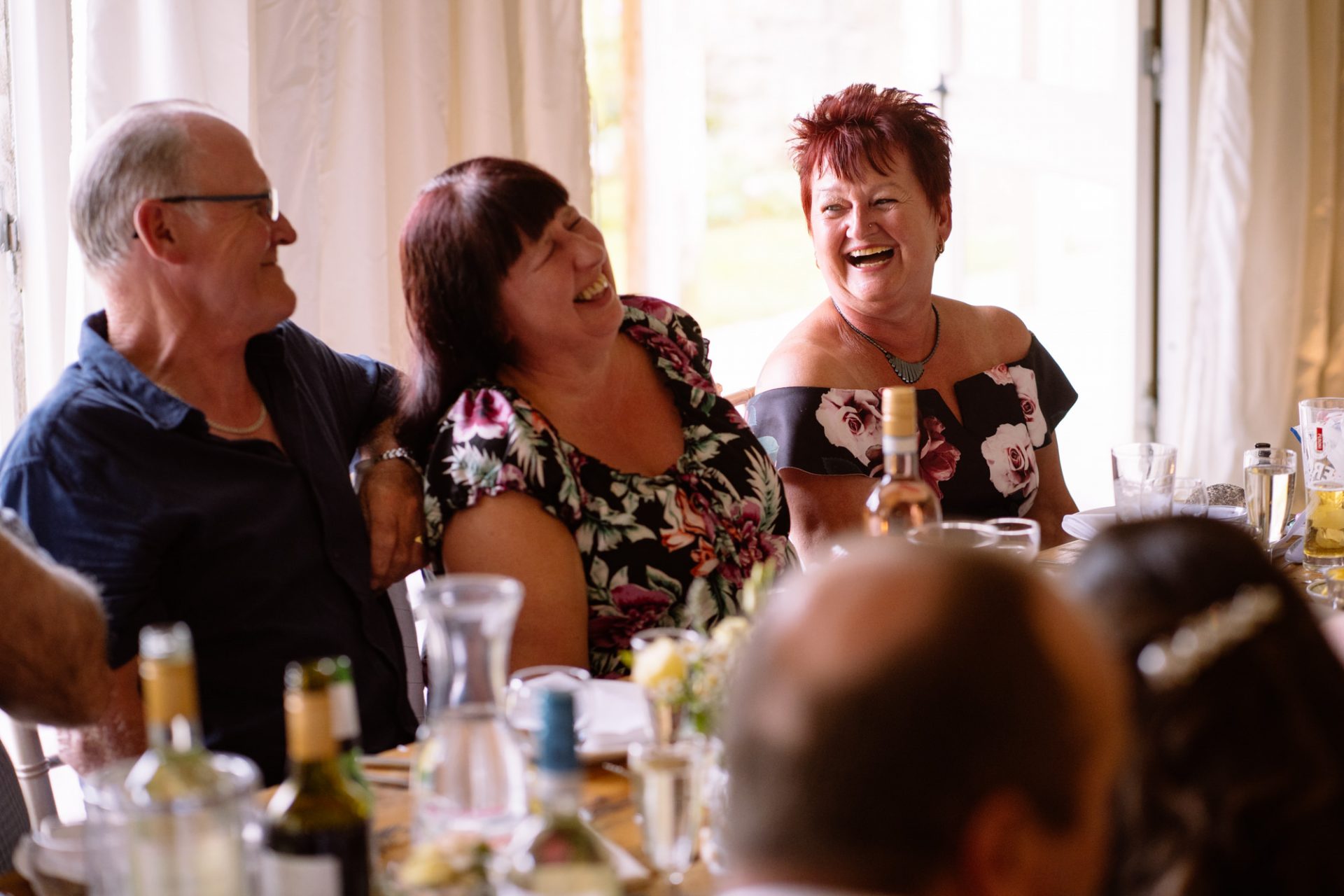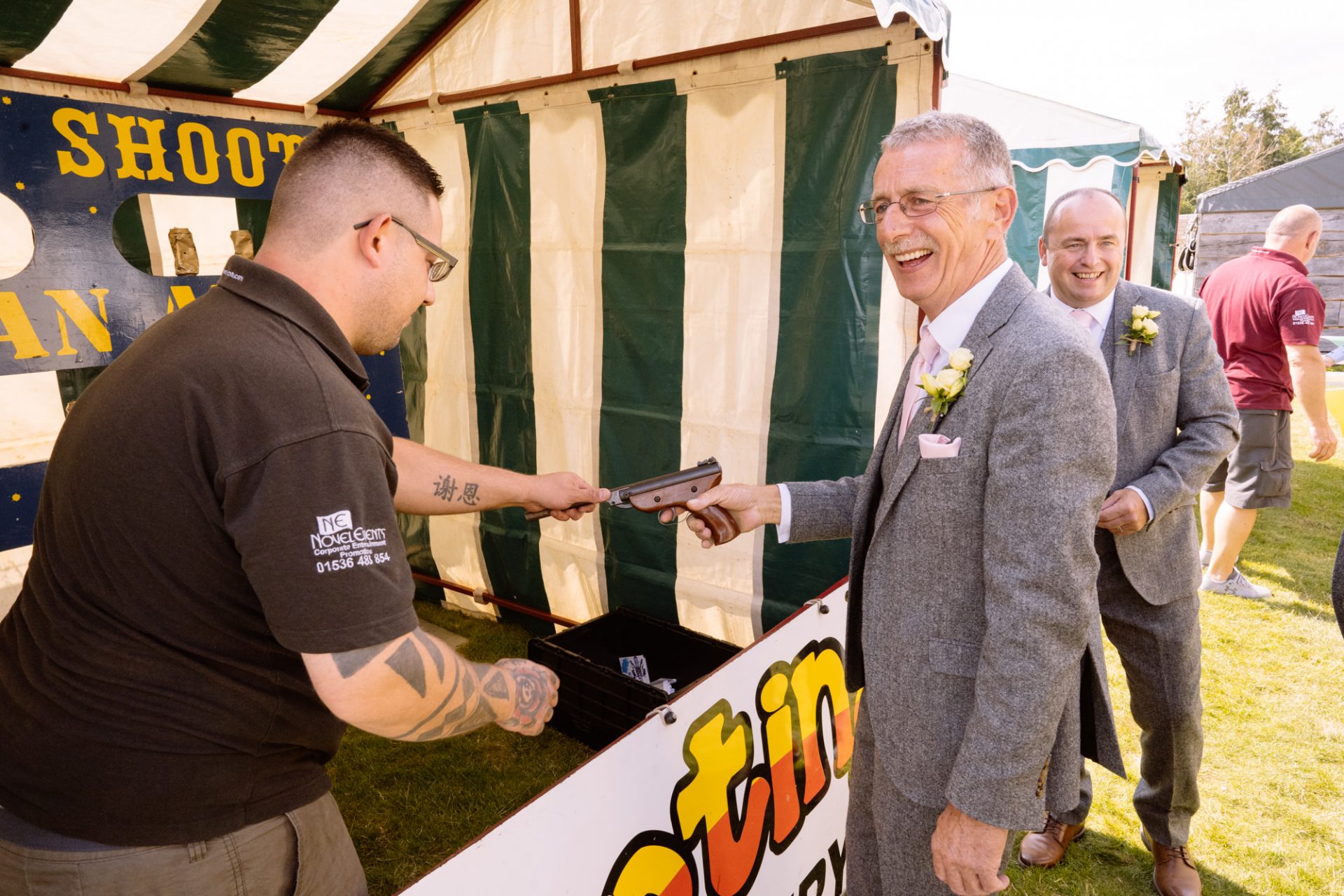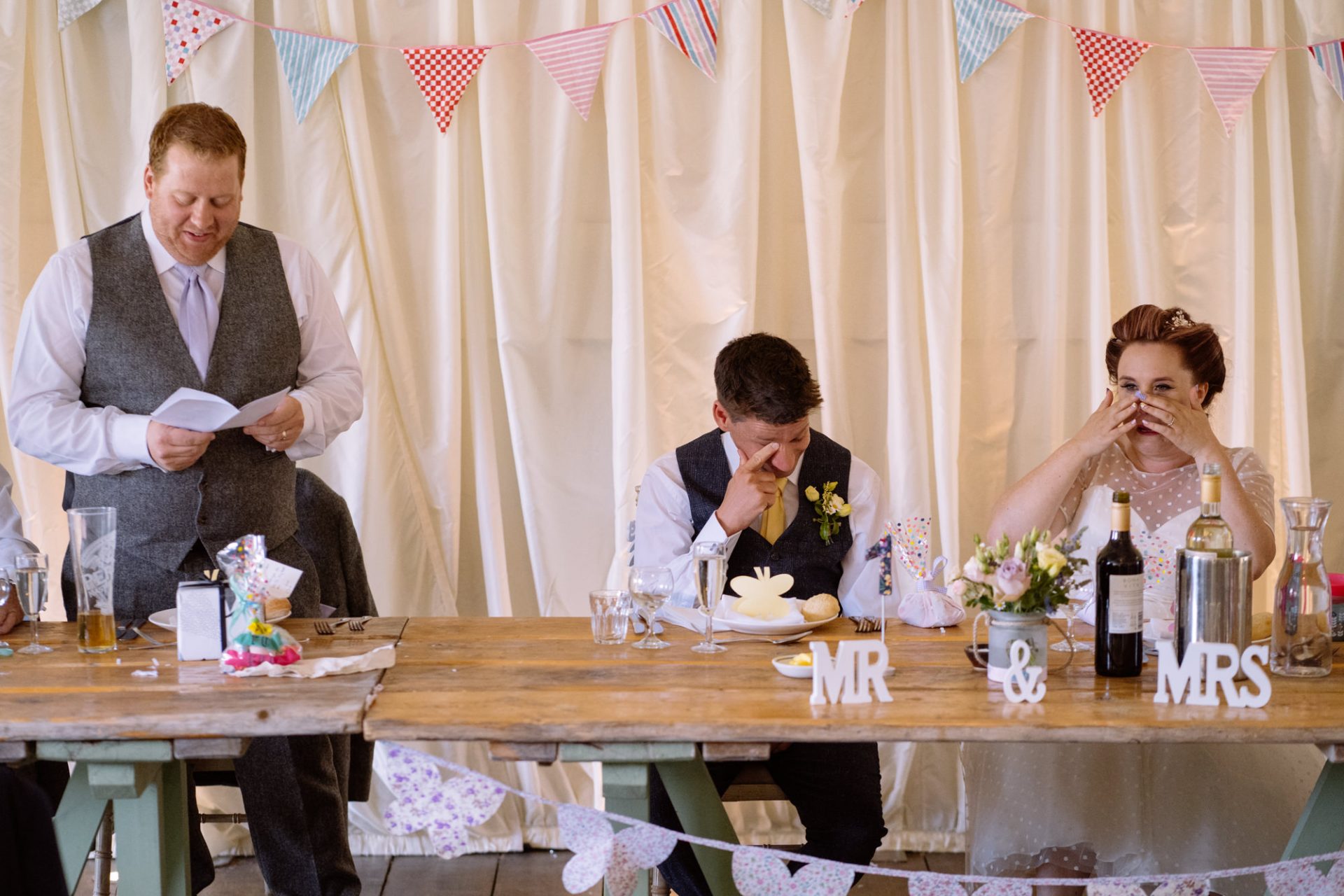 Tra.. Lisa and Chris had put on some fairground games for their guests to enjoy. I enjoyed photographing many attempts at the coconut shy, tincan alley and traditional skittles. In addition, the ‘Test Your Strength’ machine is always fun once a few Gin and Tonics have been consumed! The happy couple both managed to ring the bell before it was time to eat. Post meal, as the shadows lengthened, I whispered in Lisa’s (and possibly Tracey’s) ear that it might be an idea to head to The Moonraker hotel’s meadow. Once omongst the tall grass we were blessed with a soft evening light that caressed our couple’s rosy features. After taking portraits outside we retired to the cosy orange glow of the hotel interior. It turned out that Lisa’s dress fitted perfectly into the bay window seats. I think she’s still there now!