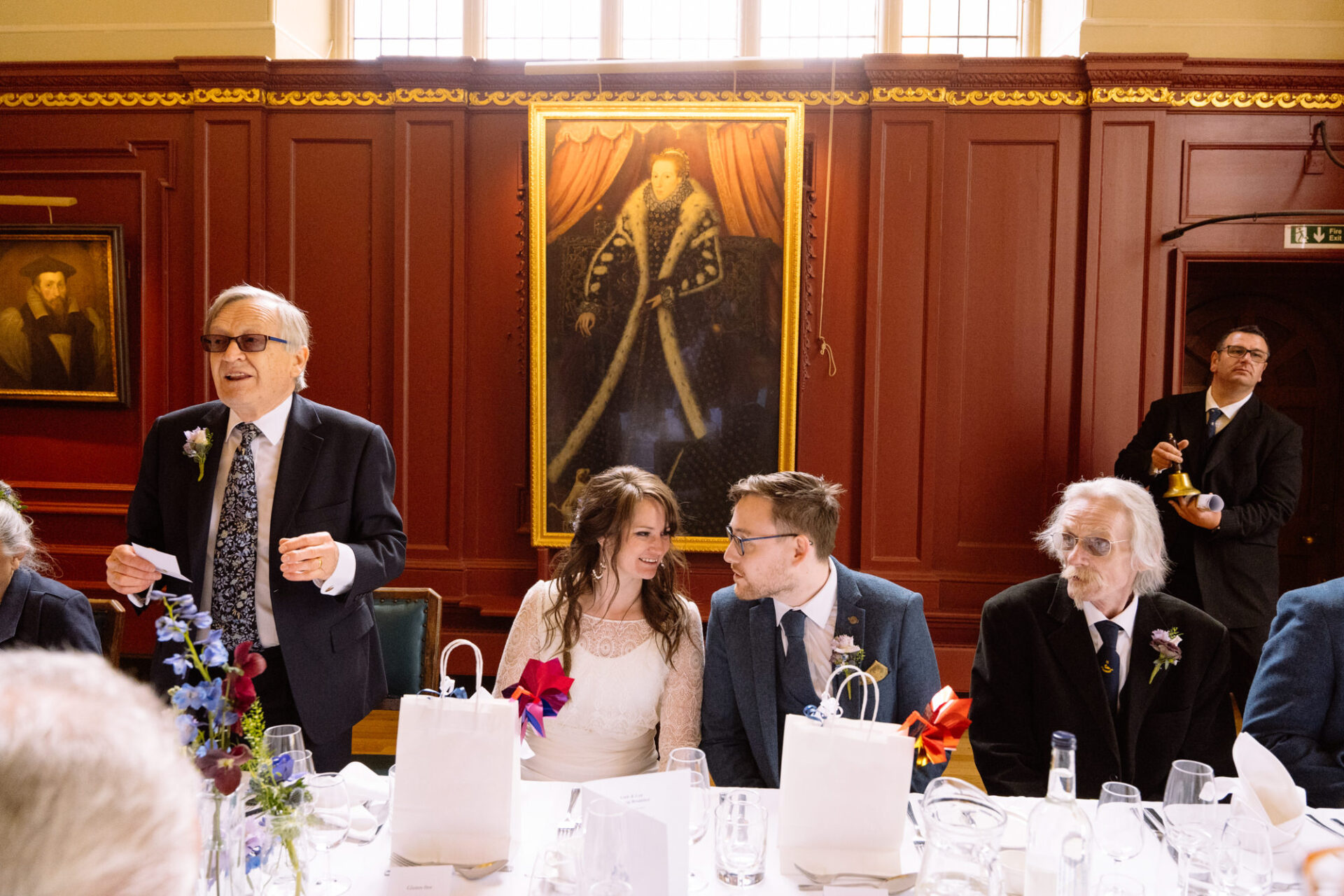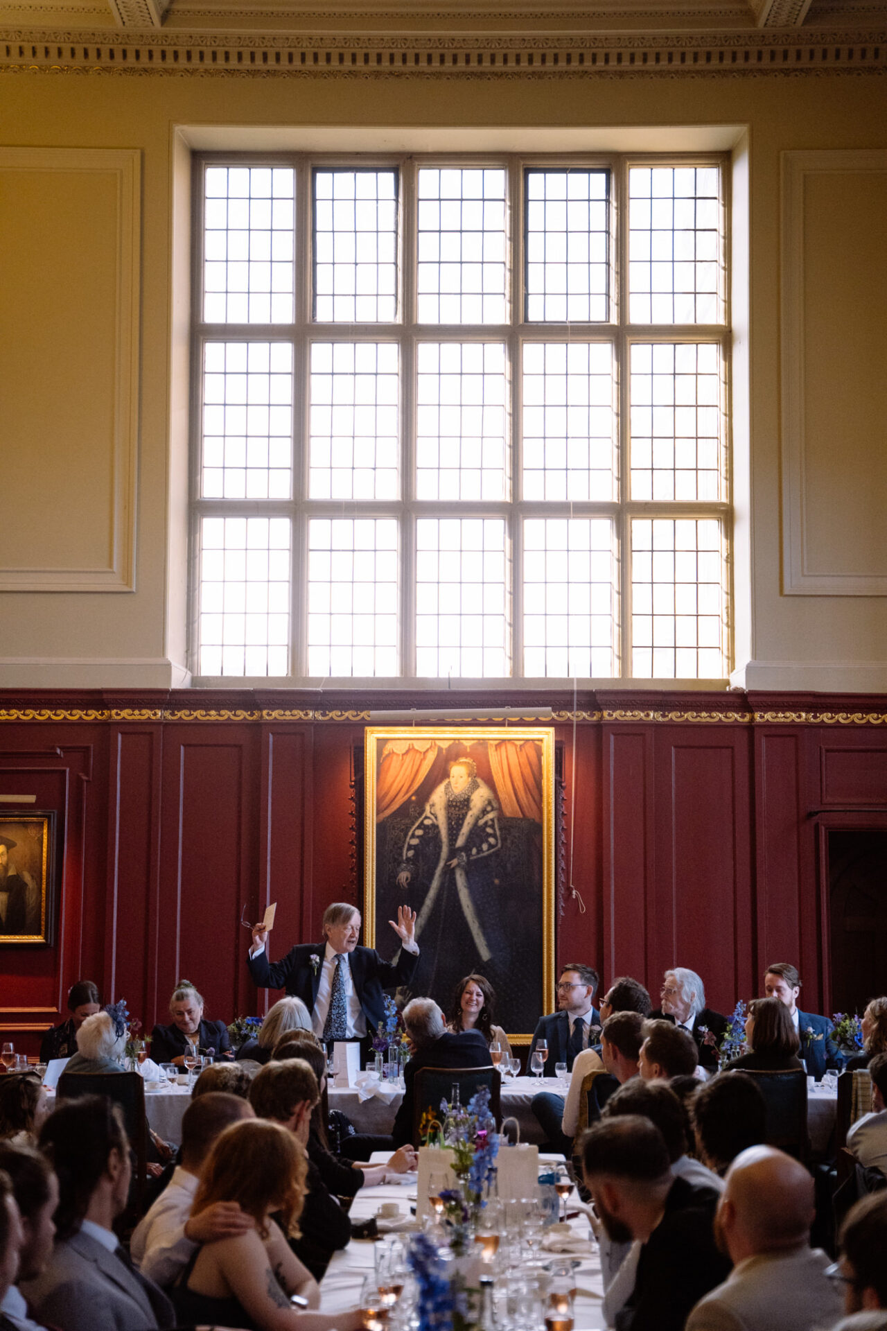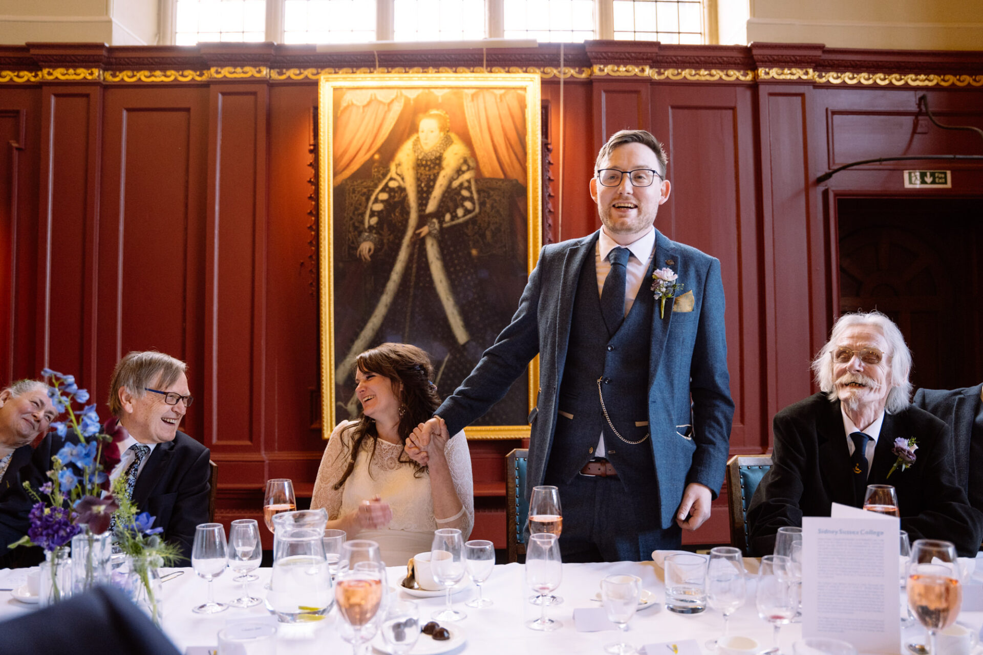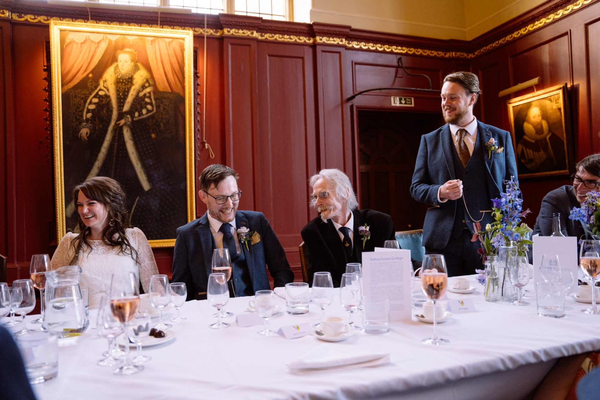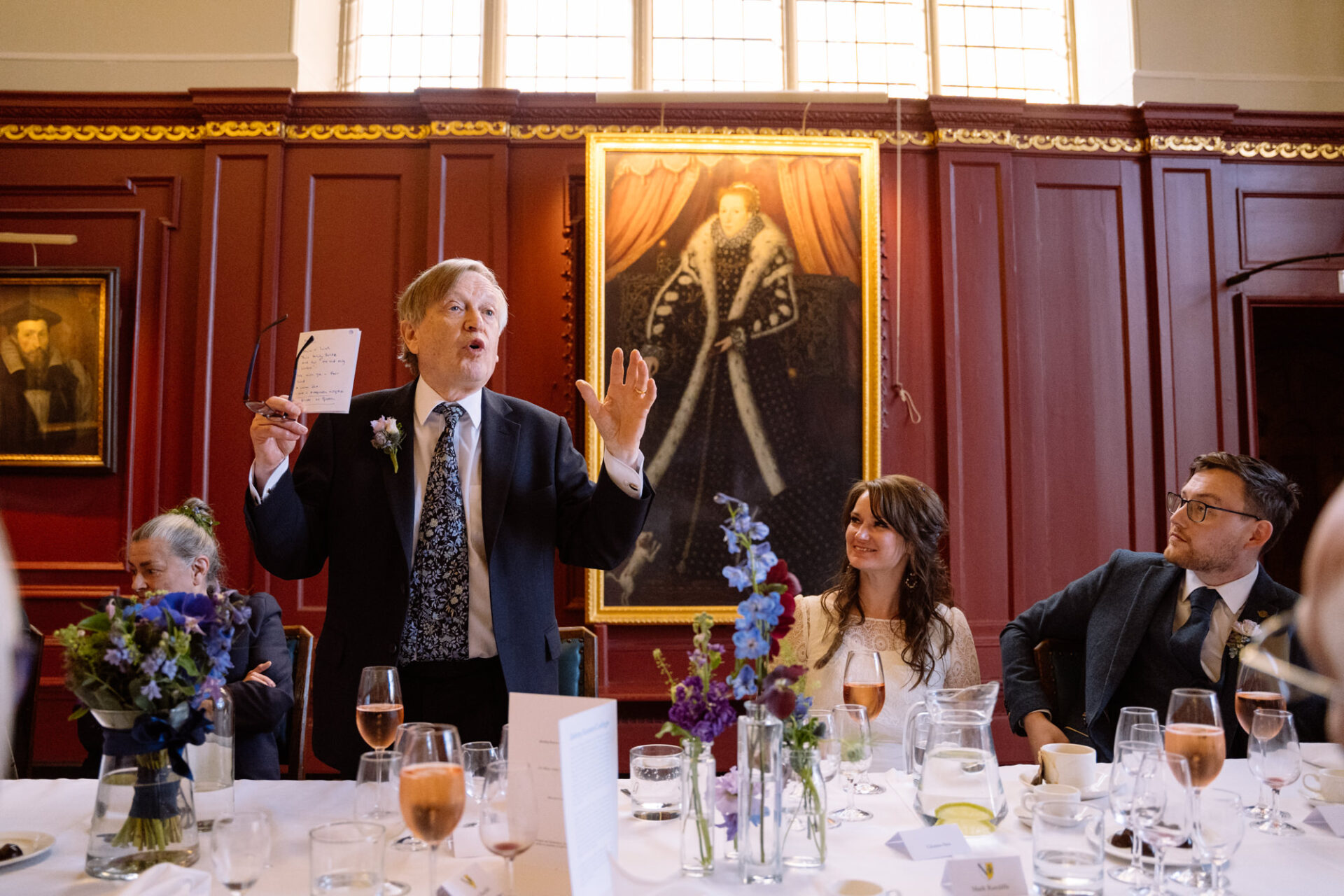 I enjoy photographing the room set-up for the wedding breakfast at every wedding. There are almost always interesting and beautiful decorations provided by specialist suppliers and the families and friends of the couple. The Great Hall at Sidney Sussex College added another level to this. The sheer size of room with it’s ornate high ceiling, huge windows and mezzanine balcony is only matched by the series or portraits adorning it’s walls. I was impressed by Lou’s Dad doing his Father of the Bride speech. You could tell he was used to public speaking, as his confidence, knowledge and turn of phrase had everyone entralled.