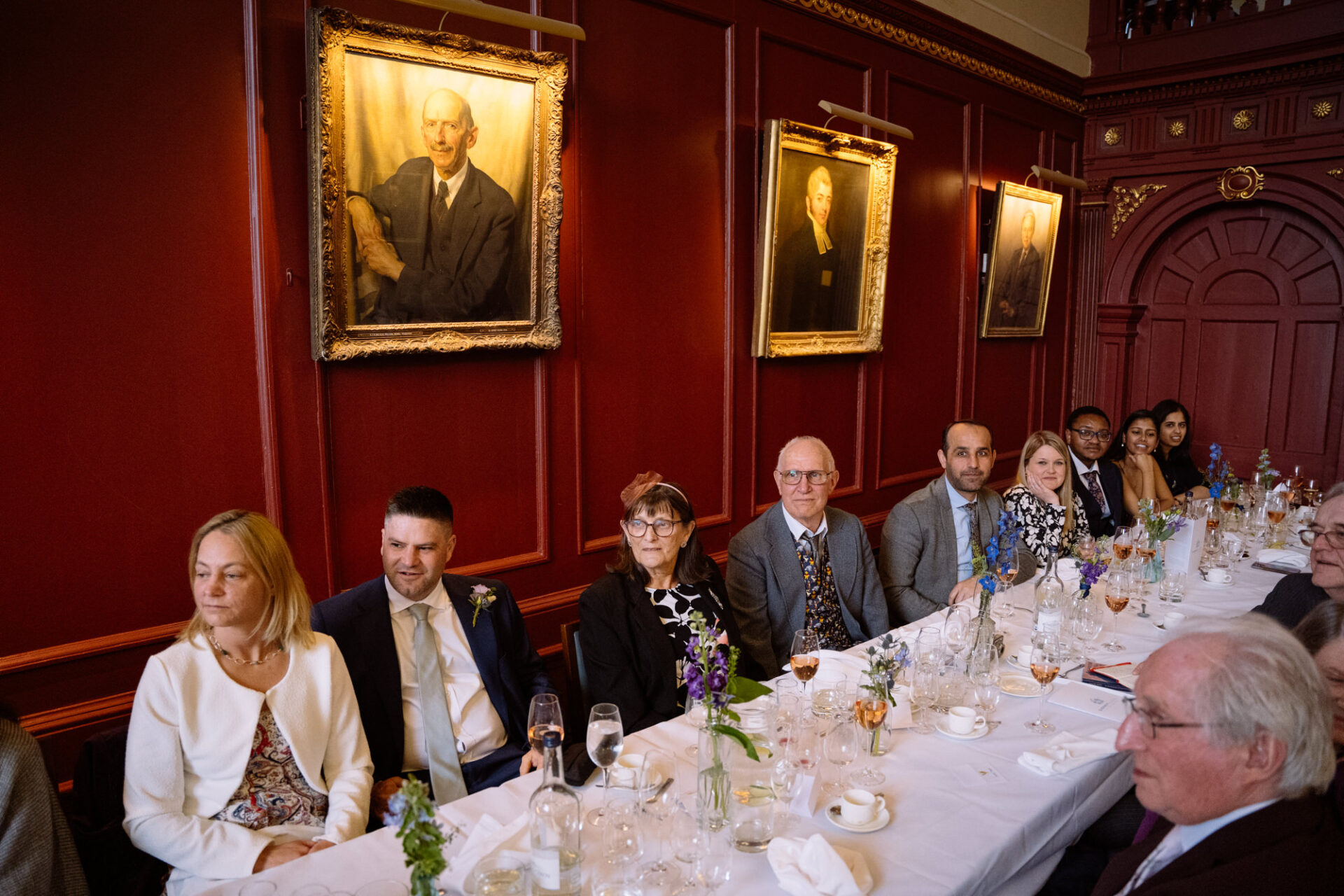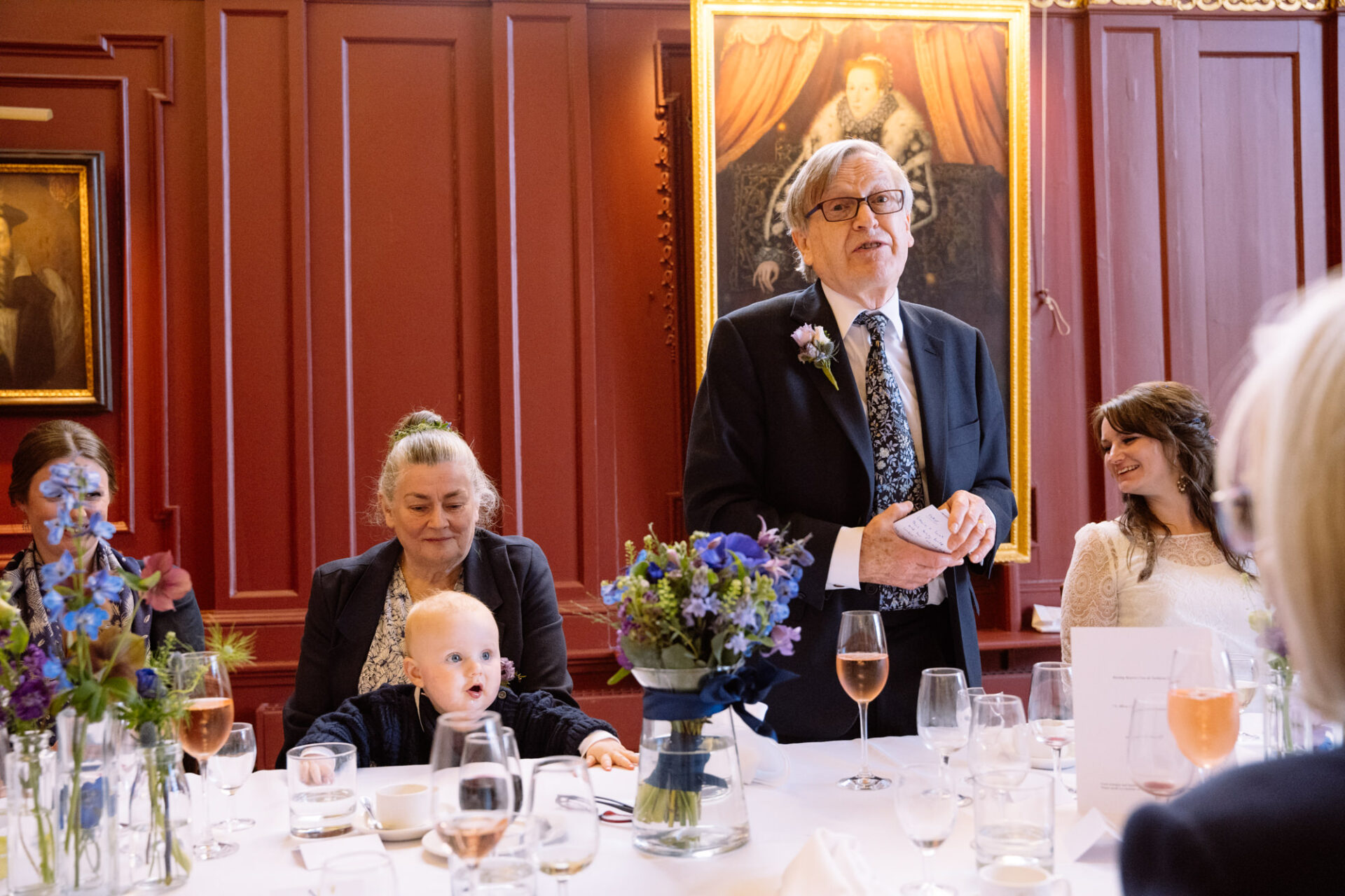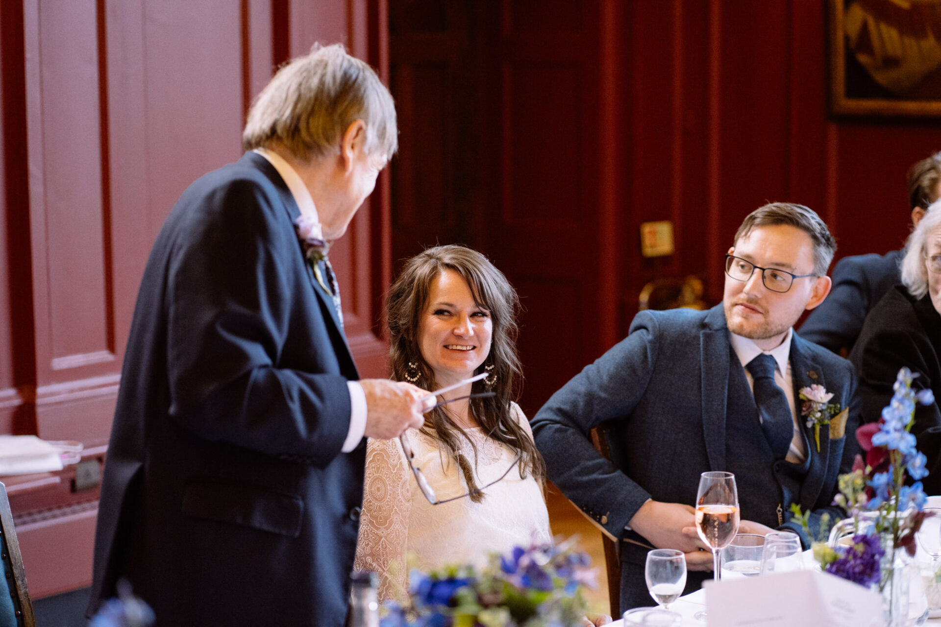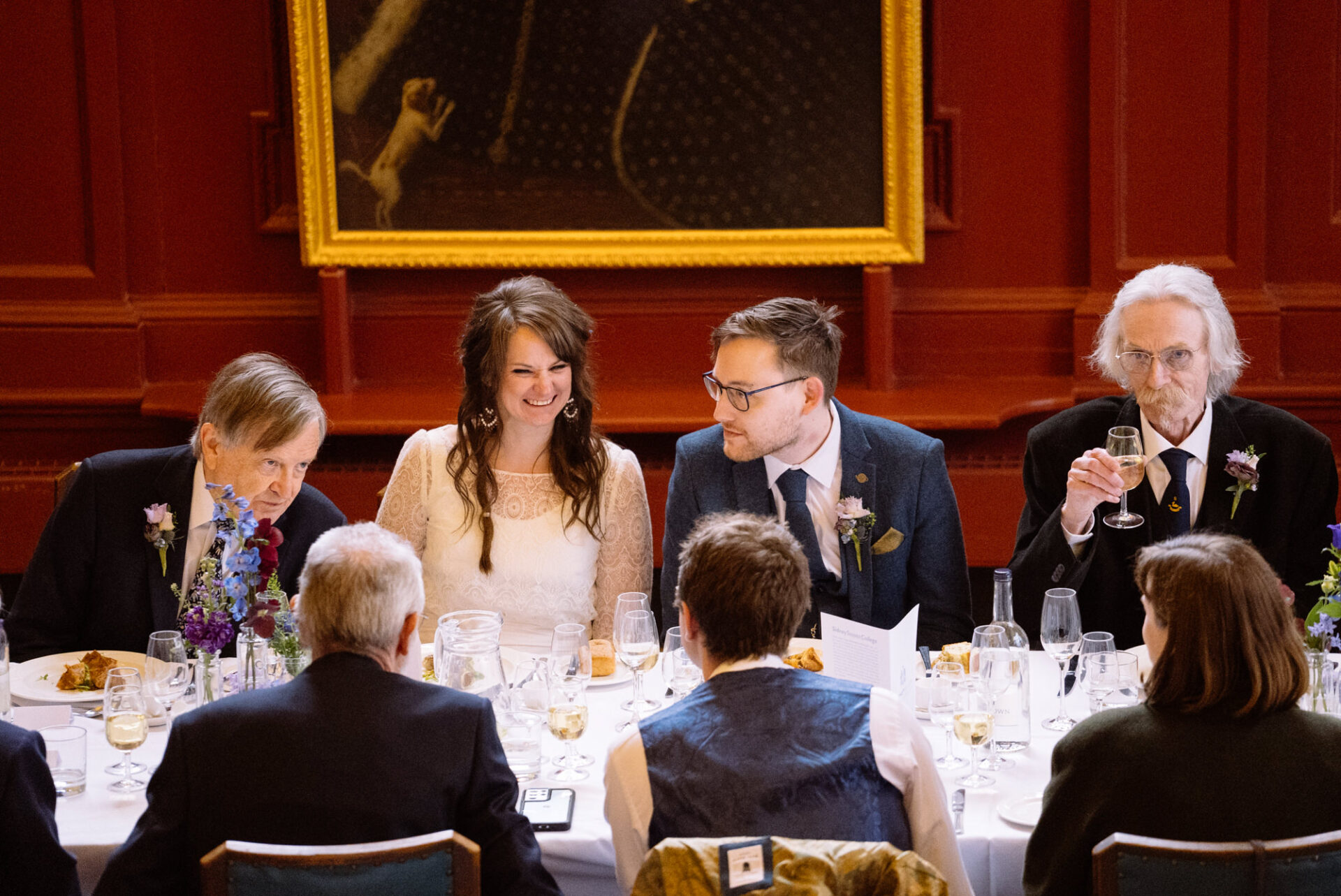 I enjoy photographing the room set-up for the wedding breakfast at every wedding. There are almost always interesting and beautiful decorations provided by specialist suppliers and the families and friends of the couple. The Great Hall at Sidney Sussex College added another level to this. The sheer size of room with it’s ornate high ceiling, huge windows and mezzanine balcony is only matched by the series or portraits adorning it’s walls. I was impressed by Lou’s Dad doing his Father of the Bride speech. You could tell he was used to public speaking, as his confidence, knowledge and turn of phrase had everyone entralled.