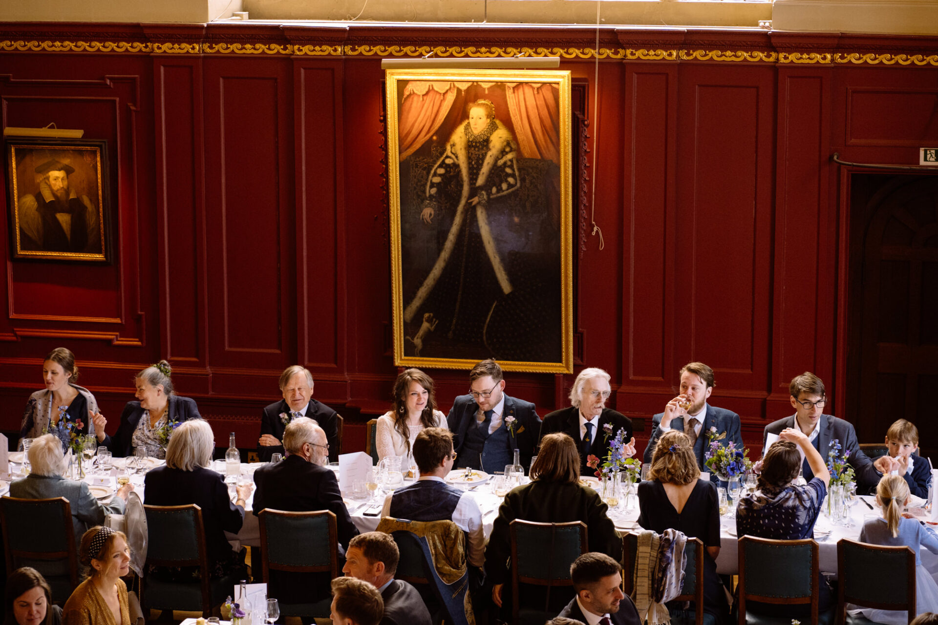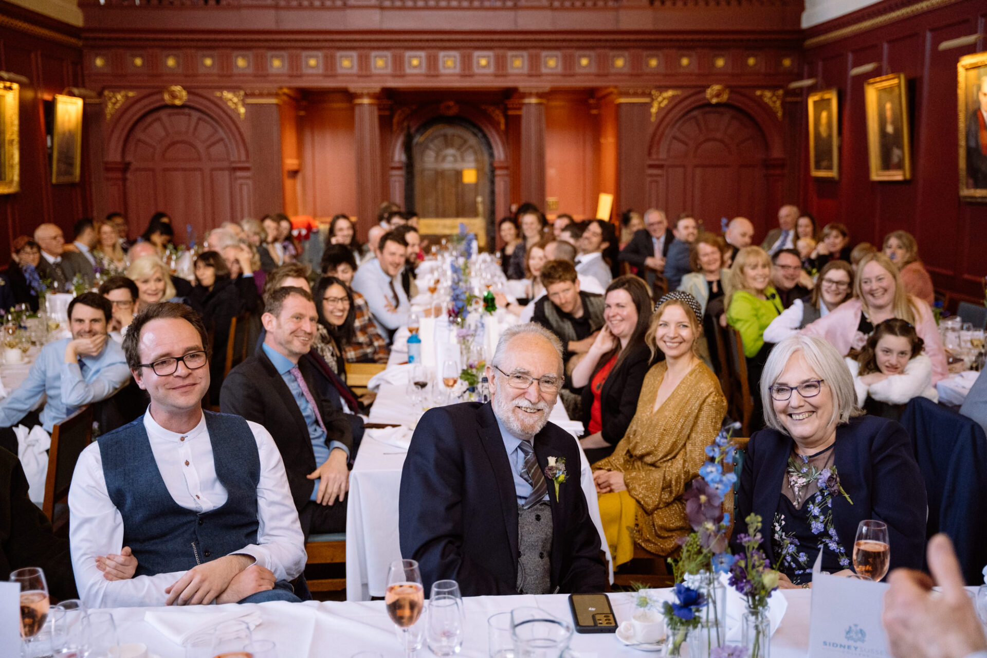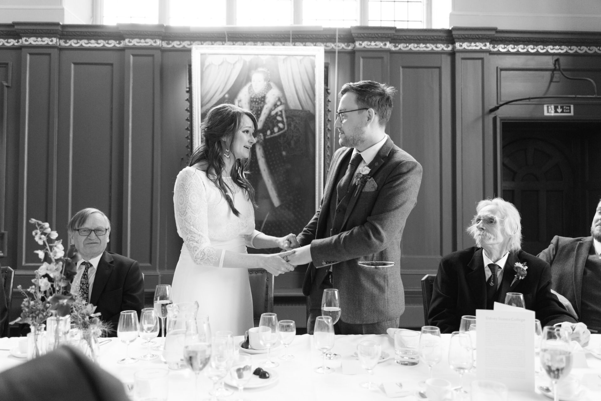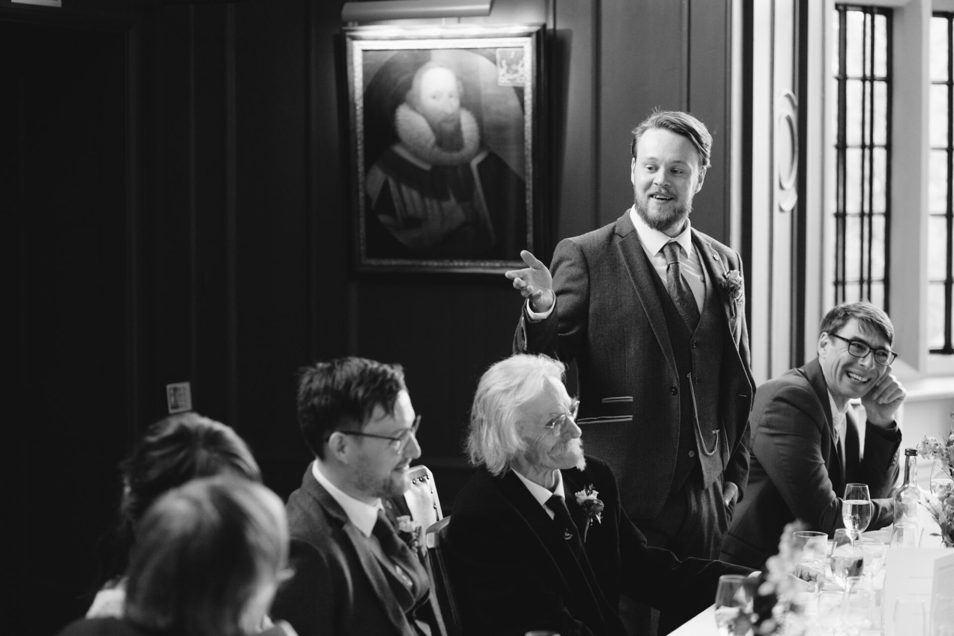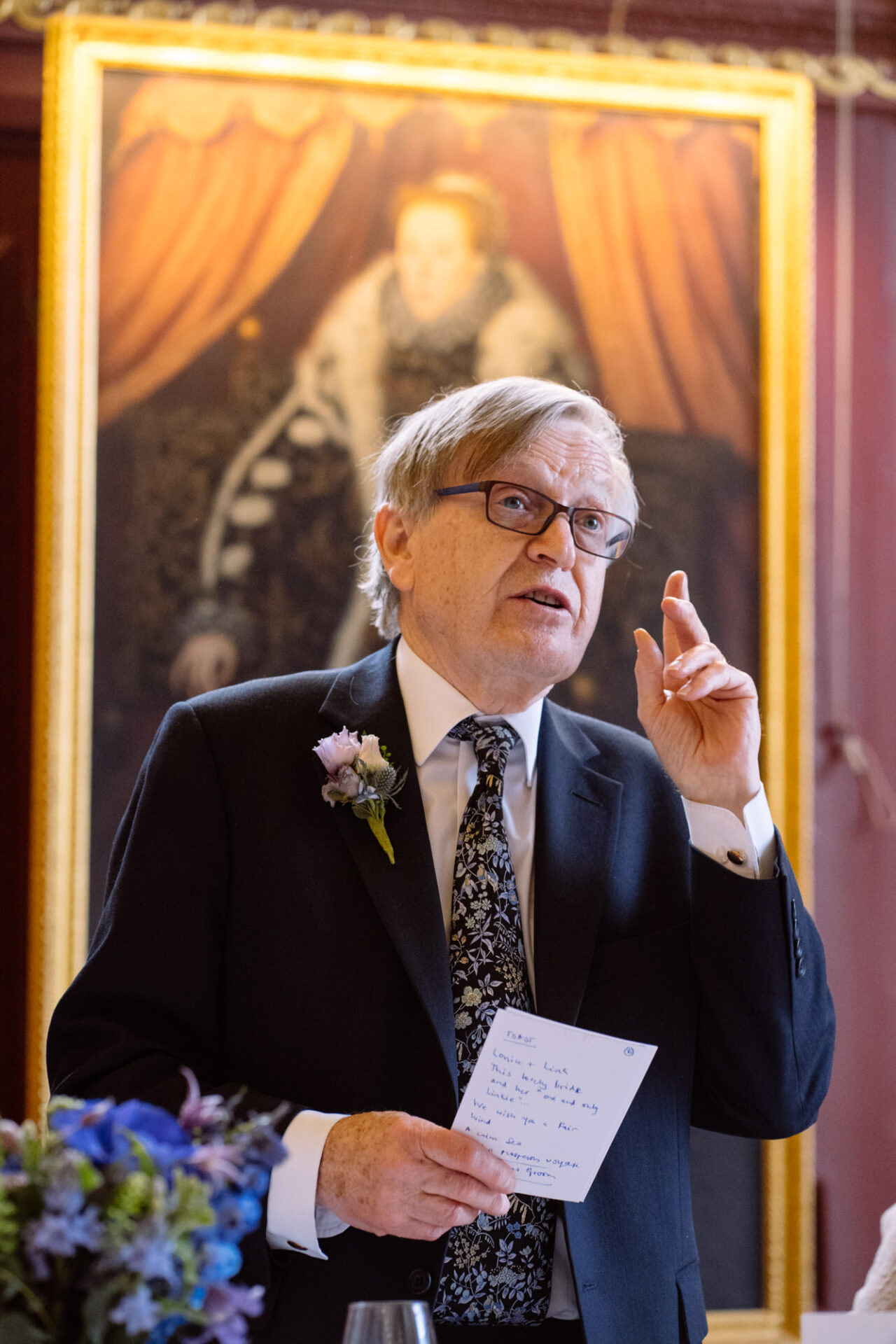 I enjoy photographing the room set-up for the wedding breakfast at every wedding. There are almost always interesting and beautiful decorations provided by specialist suppliers and the families and friends of the couple. The Great Hall at Sidney Sussex College added another level to this. The sheer size of room with it’s ornate high ceiling, huge windows and mezzanine balcony is only matched by the series or portraits adorning it’s walls. I was impressed by Lou’s Dad doing his Father of the Bride speech. You could tell he was used to public speaking, as his confidence, knowledge and turn of phrase had everyone entralled.