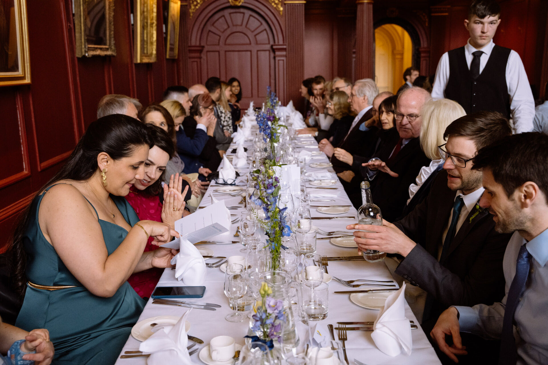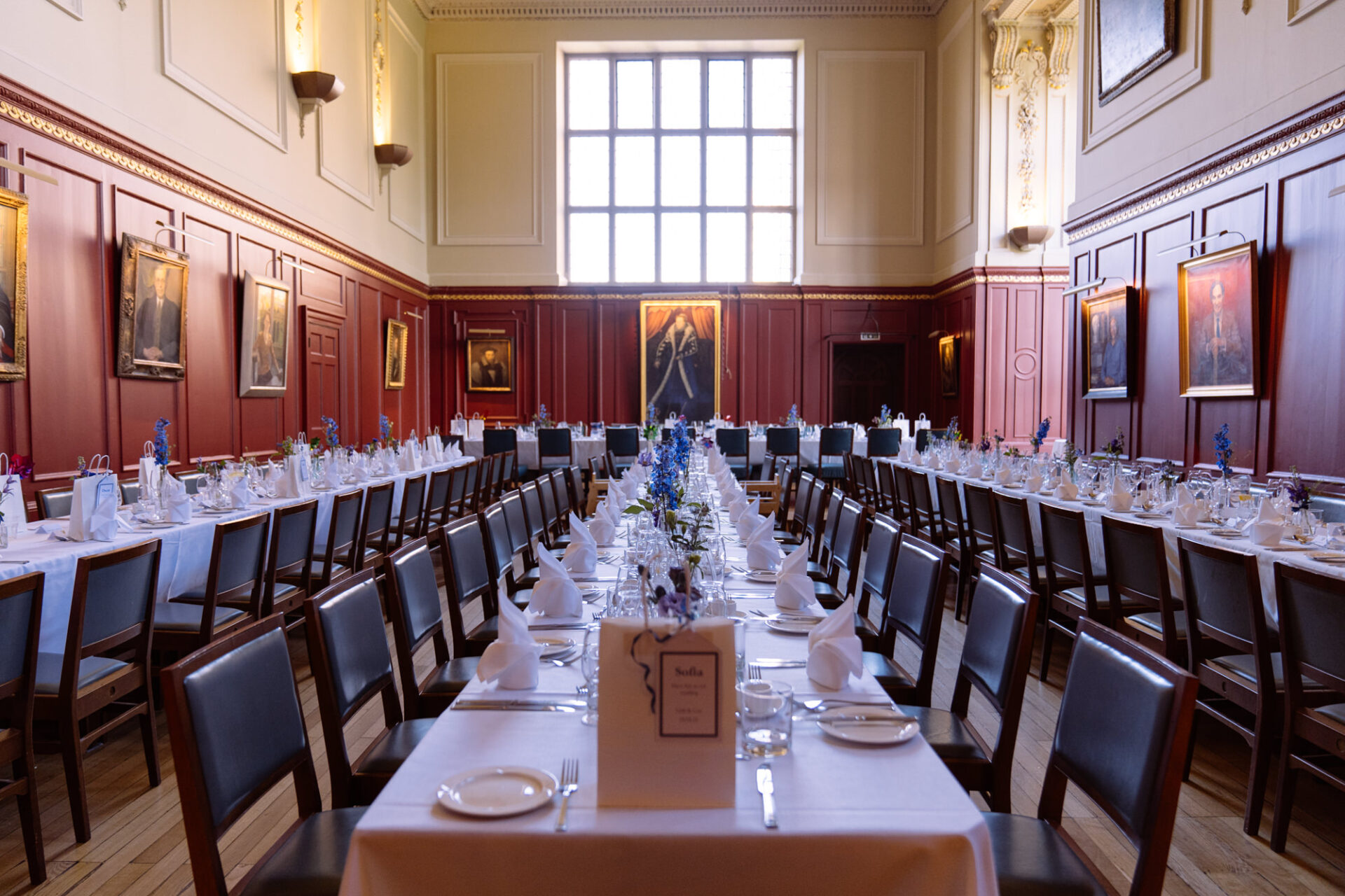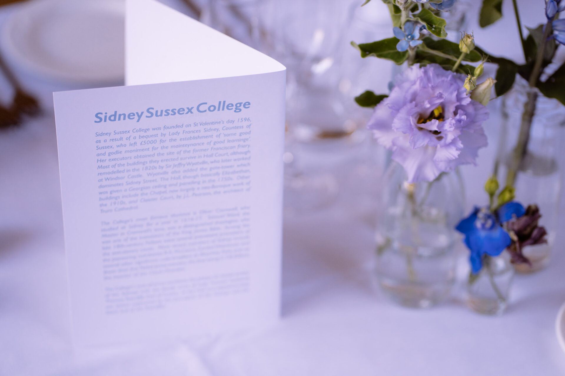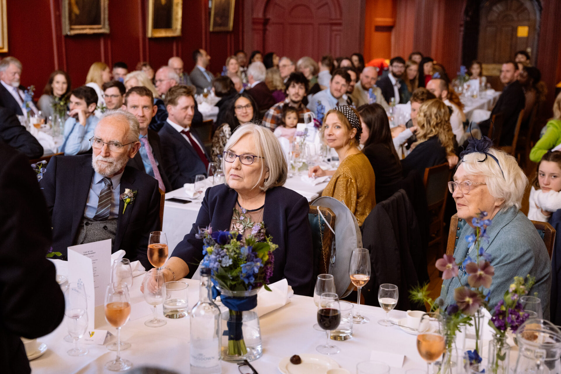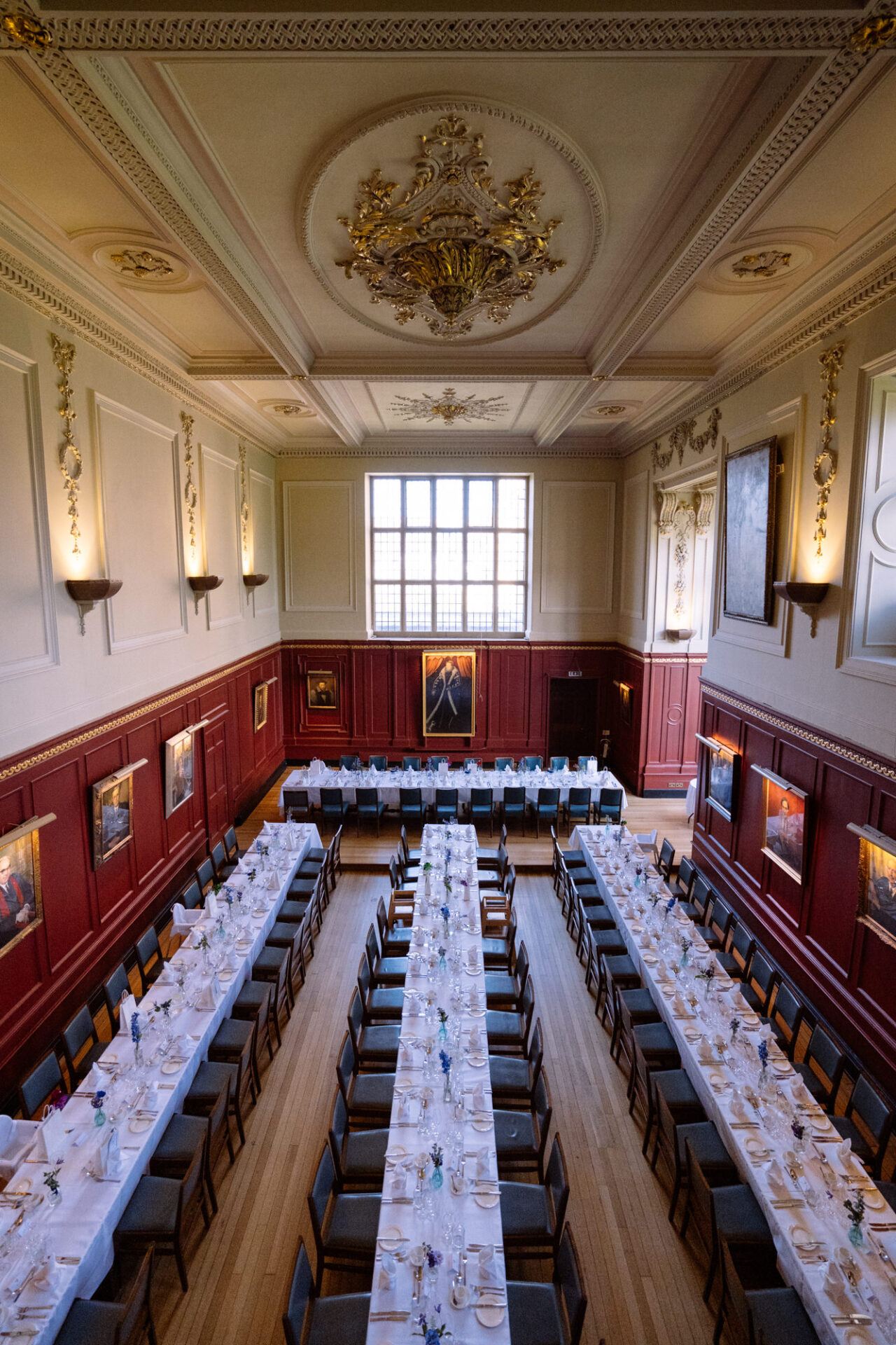 I enjoy photographing the room set-up for the wedding breakfast at every wedding. There are almost always interesting and beautiful decorations provided by specialist suppliers and the families and friends of the couple. The Great Hall at Sidney Sussex College added another level to this. The sheer size of room with it’s ornate high ceiling, huge windows and mezzanine balcony is only matched by the series or portraits adorning it’s walls. I was impressed by Lou’s Dad doing his Father of the Bride speech. You could tell he was used to public speaking, as his confidence, knowledge and turn of phrase had everyone entralled.