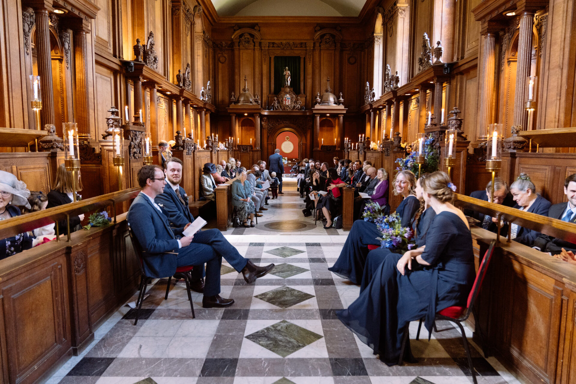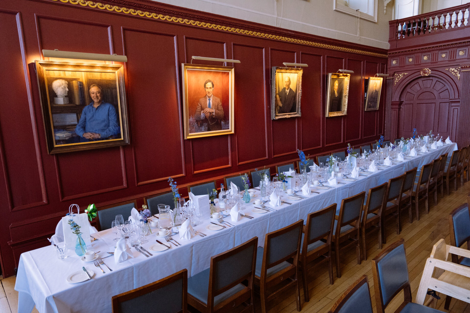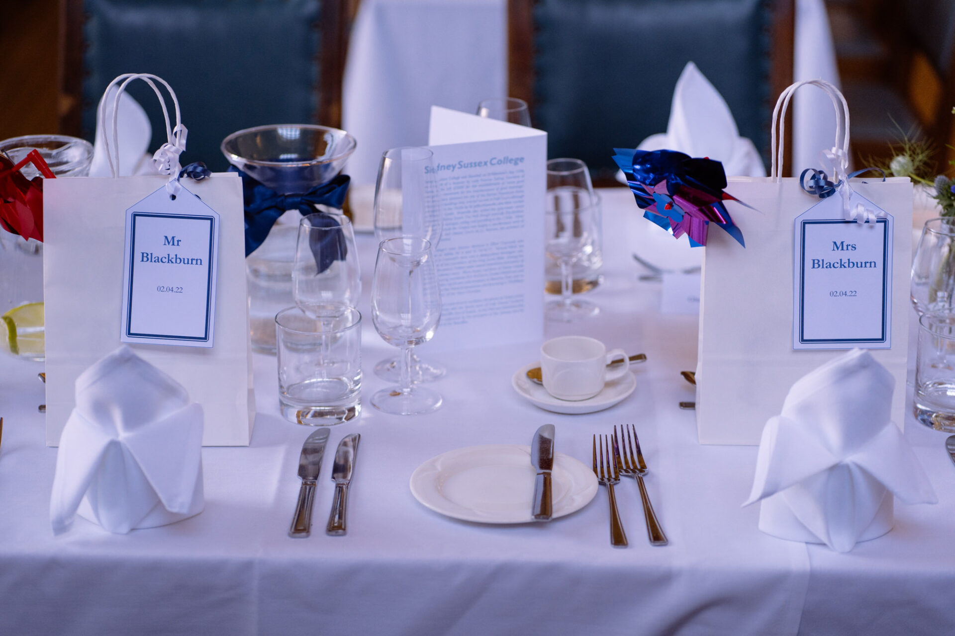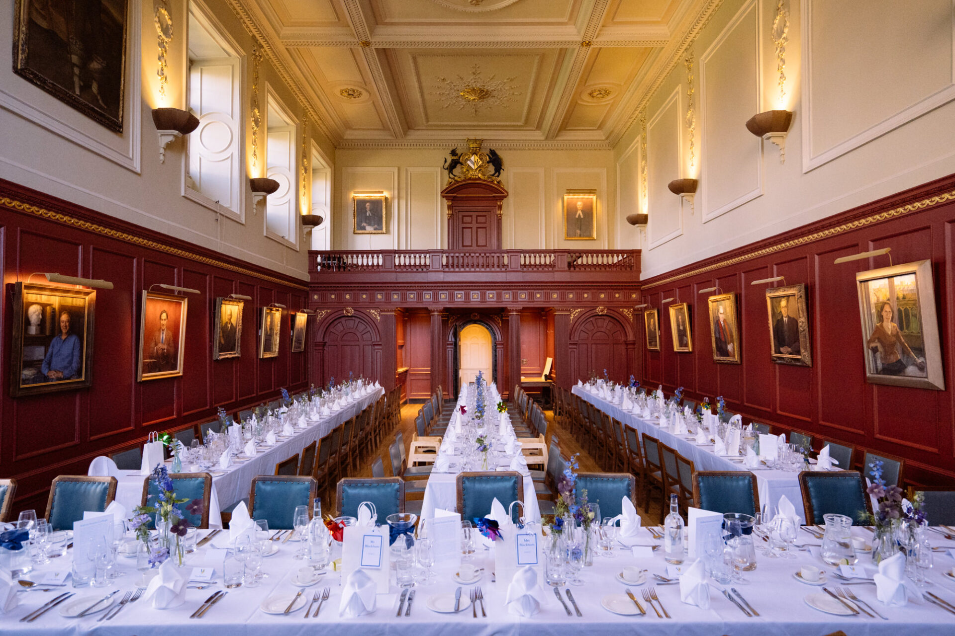 I enjoy photographing the room set-up for the wedding breakfast at every wedding. There are almost always interesting and beautiful decorations provided by specialist suppliers and the families and friends of the couple. The Great Hall at Sidney Sussex College added another level to this. The sheer size of room with it’s ornate high ceiling, huge windows and mezzanine balcony is only matched by the series or portraits adorning it’s walls. I was impressed by Lou’s Dad doing his Father of the Bride speech. You could tell he was used to public speaking, as his confidence, knowledge and turn of phrase had everyone entralled.