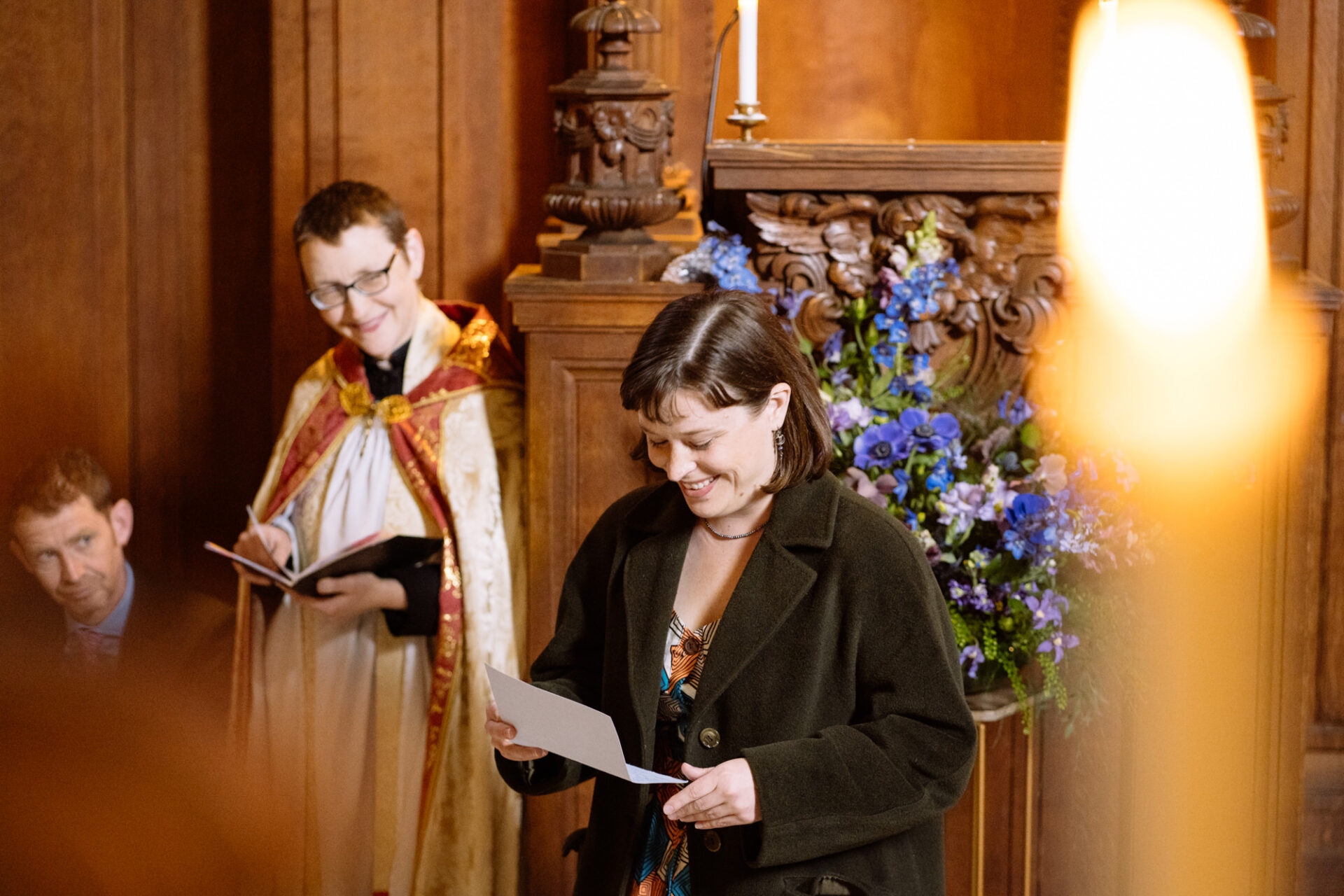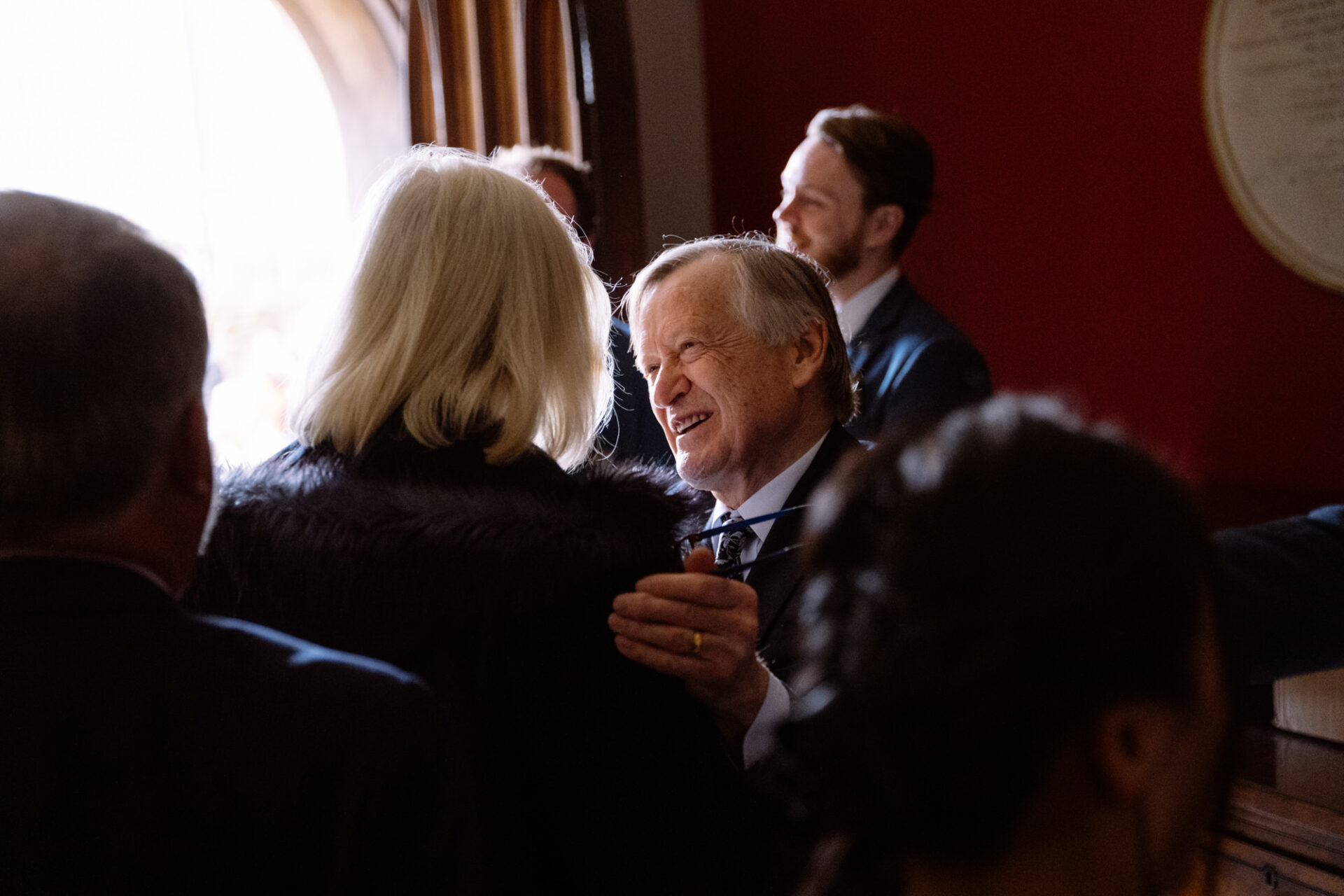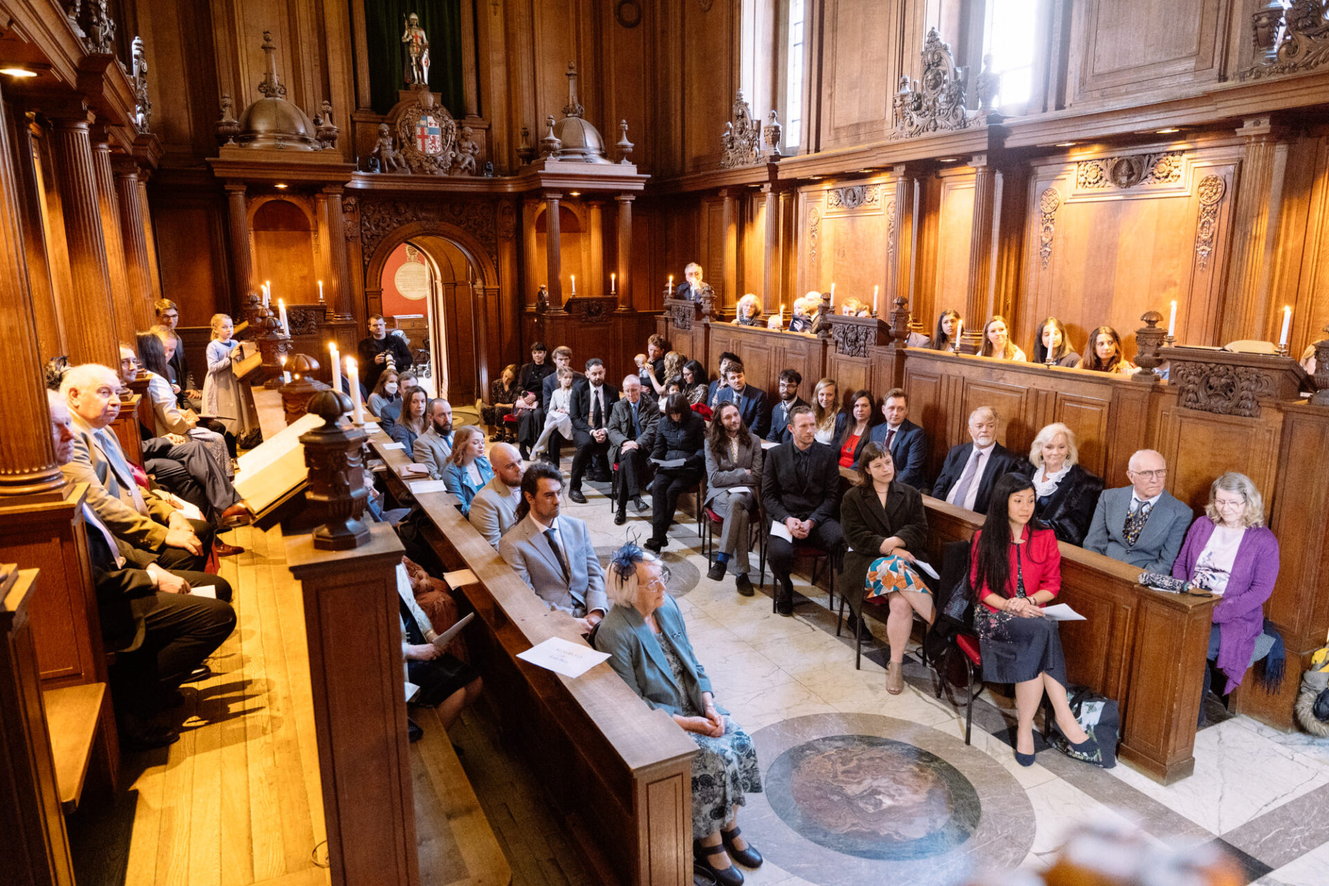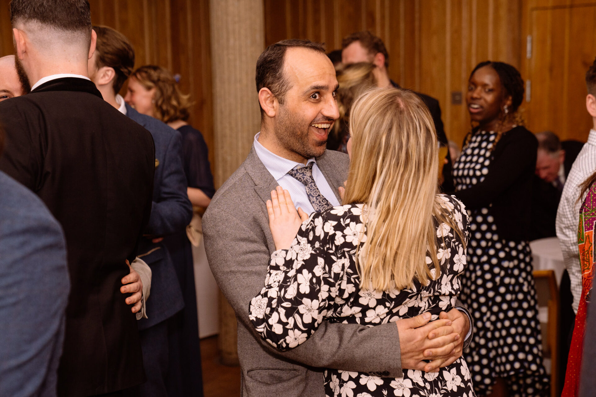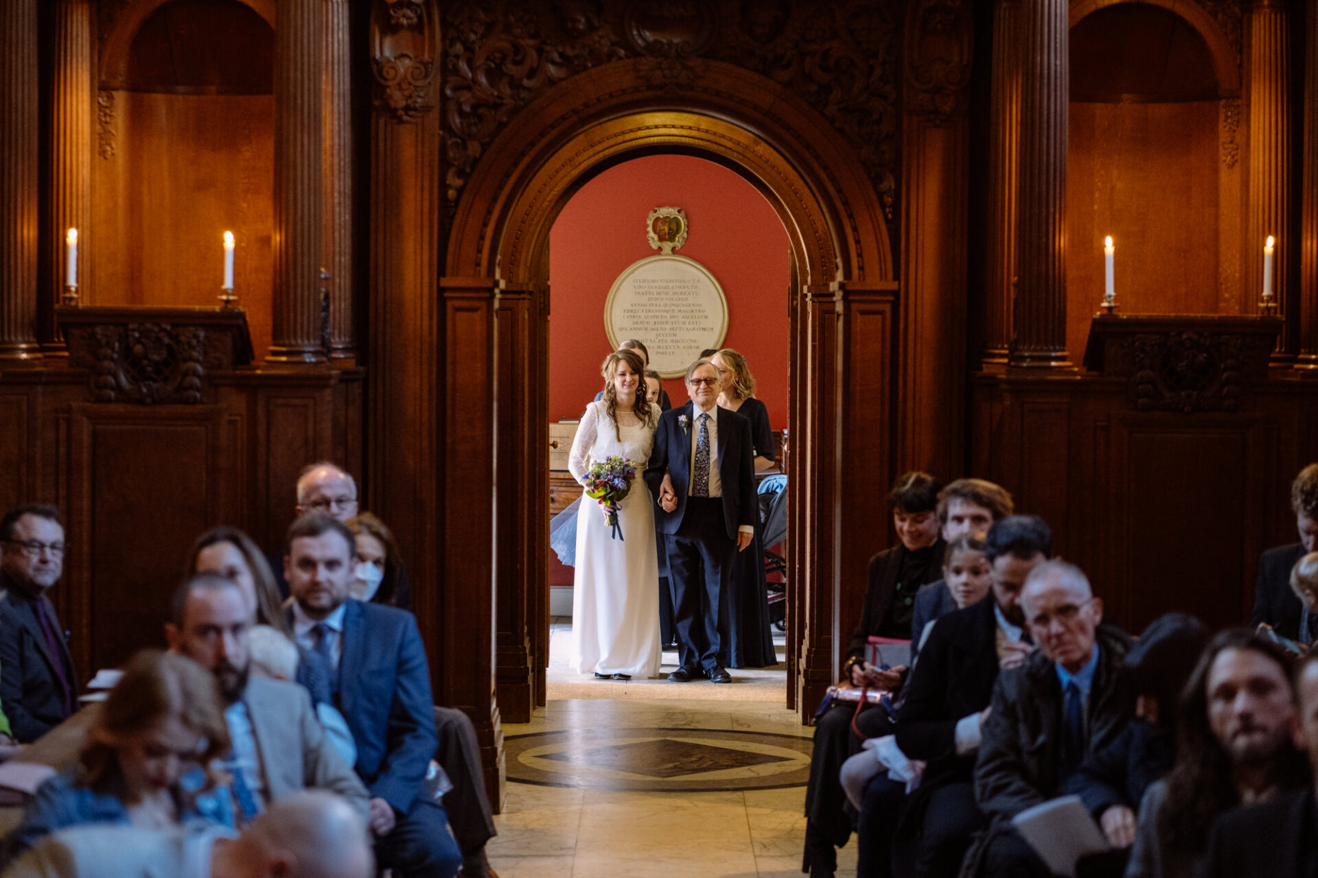 I enjoy photographing the room set-up for the wedding breakfast at every wedding. There are almost always interesting and beautiful decorations provided by specialist suppliers and the families and friends of the couple. The Great Hall at Sidney Sussex College added another level to this. The sheer size of room with it’s ornate high ceiling, huge windows and mezzanine balcony is only matched by the series or portraits adorning it’s walls. I was impressed by Lou’s Dad doing his Father of the Bride speech. You could tell he was used to public speaking, as his confidence, knowledge and turn of phrase had everyone entralled.