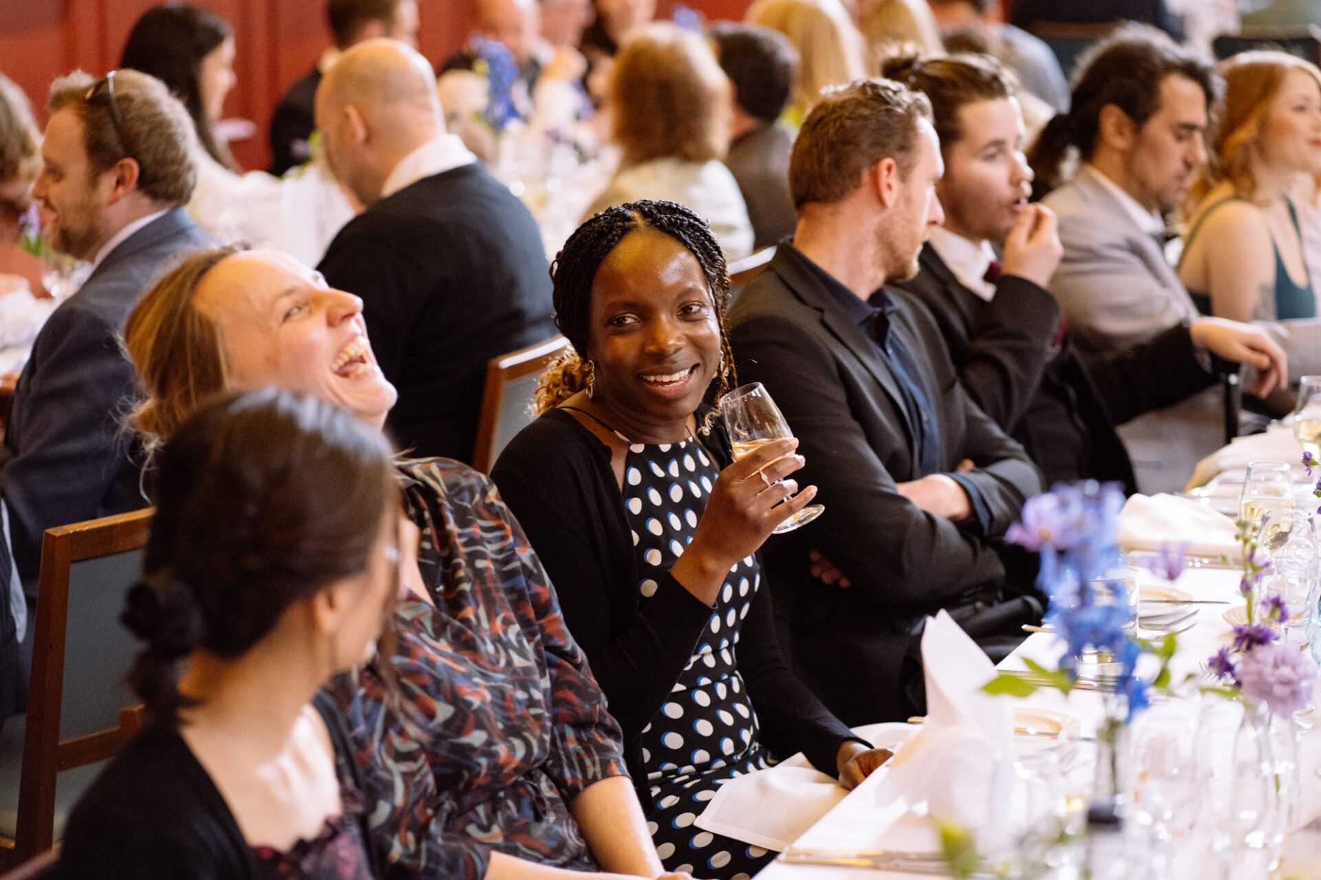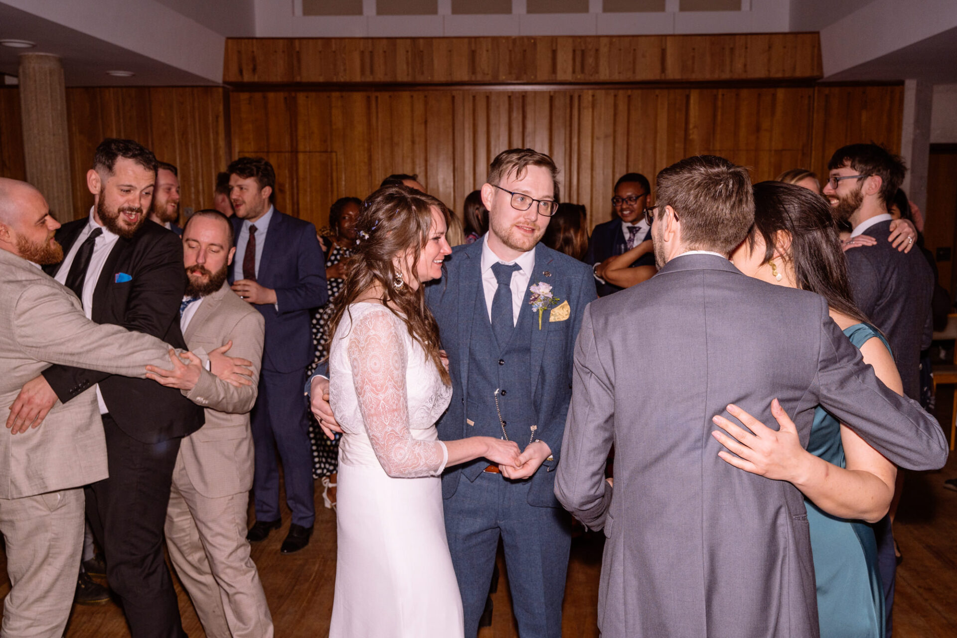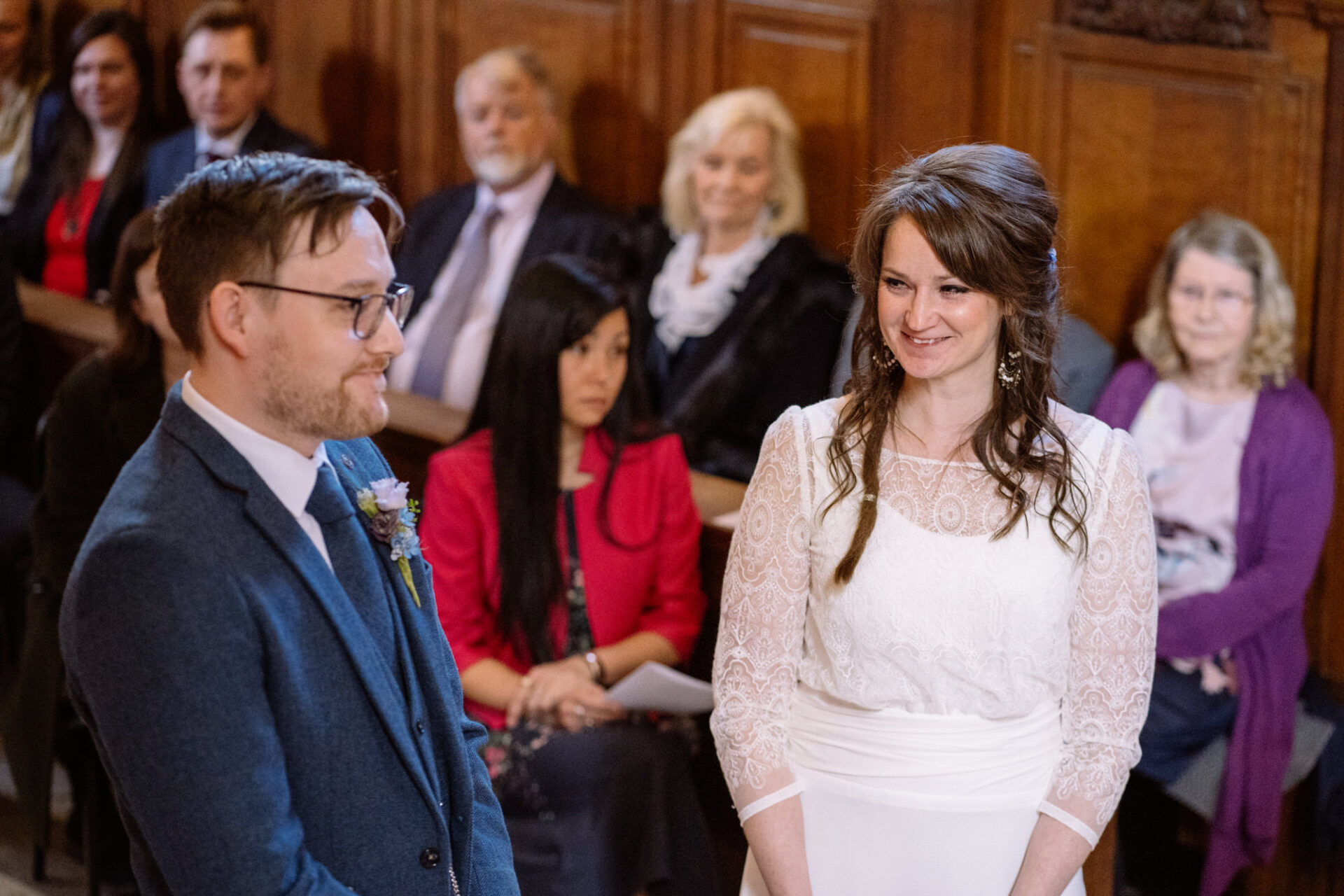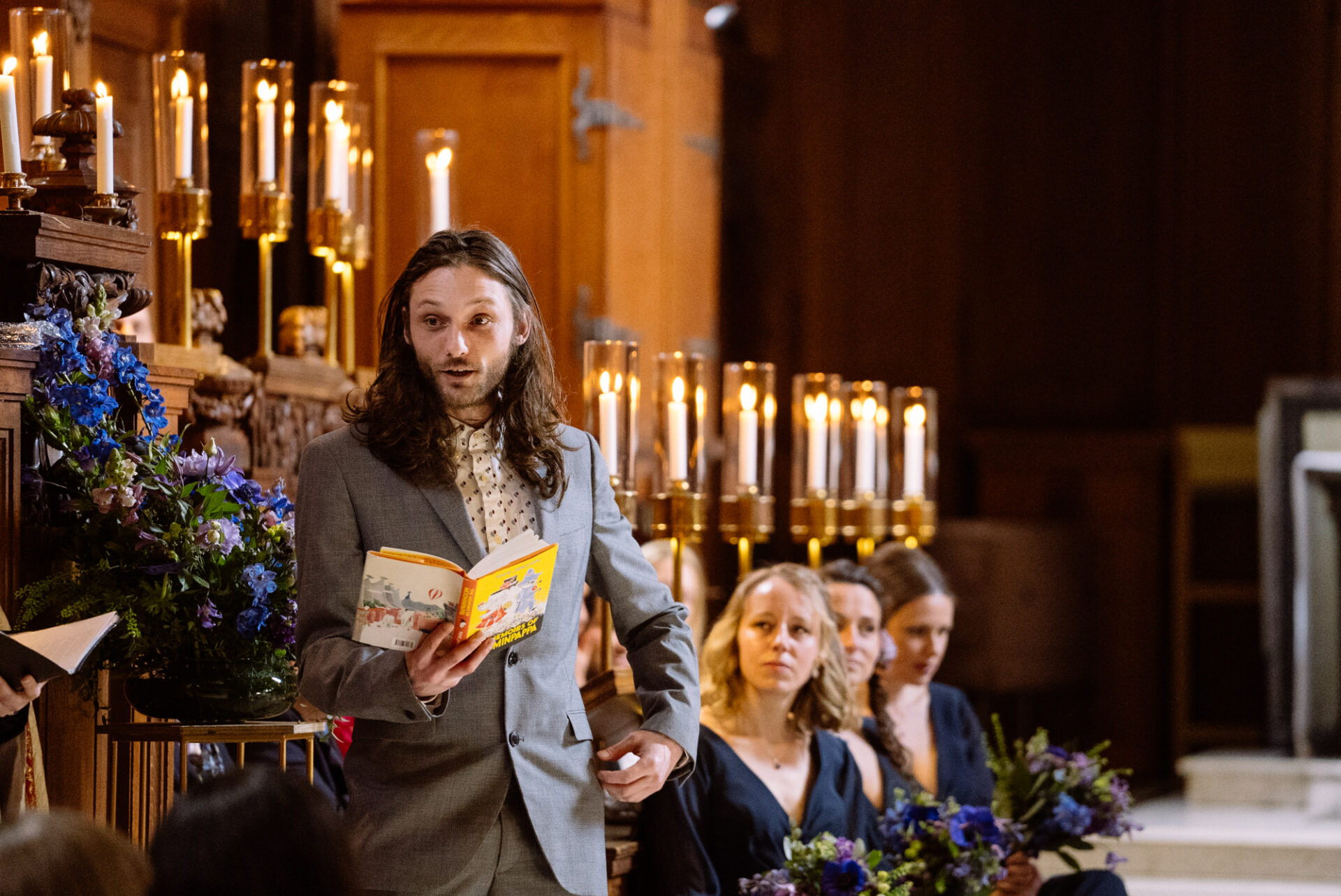 I enjoy photographing the room set-up for the wedding breakfast at every wedding. There are almost always interesting and beautiful decorations provided by specialist suppliers and the families and friends of the couple. The Great Hall at Sidney Sussex College added another level to this. The sheer size of room with it’s ornate high ceiling, huge windows and mezzanine balcony is only matched by the series or portraits adorning it’s walls. I was impressed by Lou’s Dad doing his Father of the Bride speech. You could tell he was used to public speaking, as his confidence, knowledge and turn of phrase had everyone entralled.