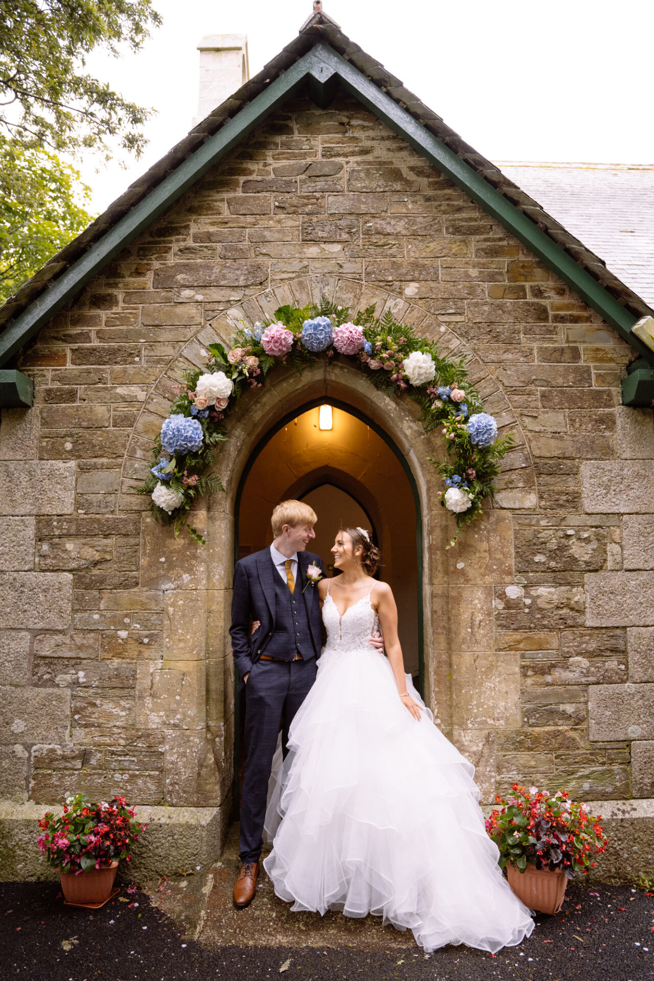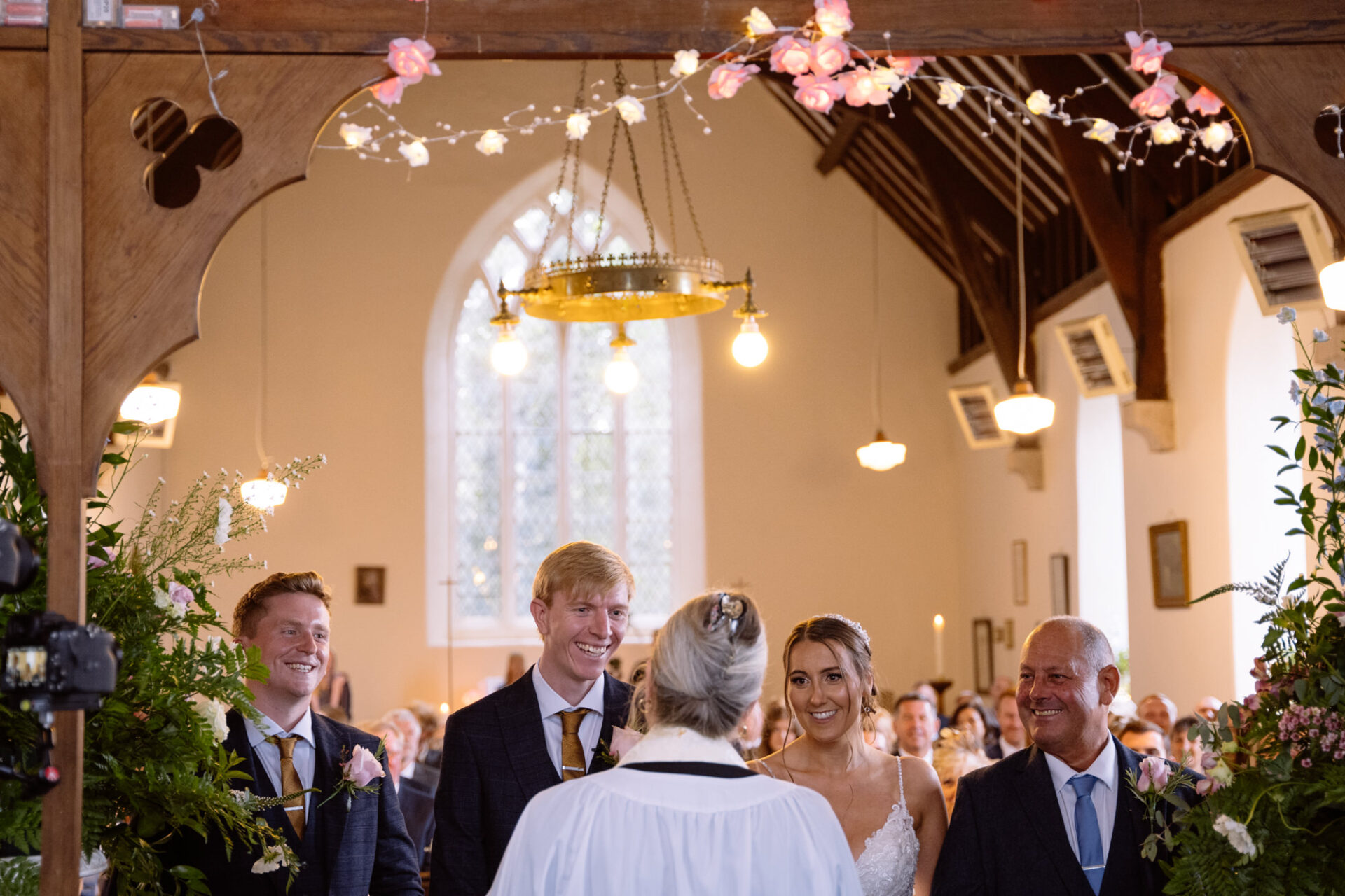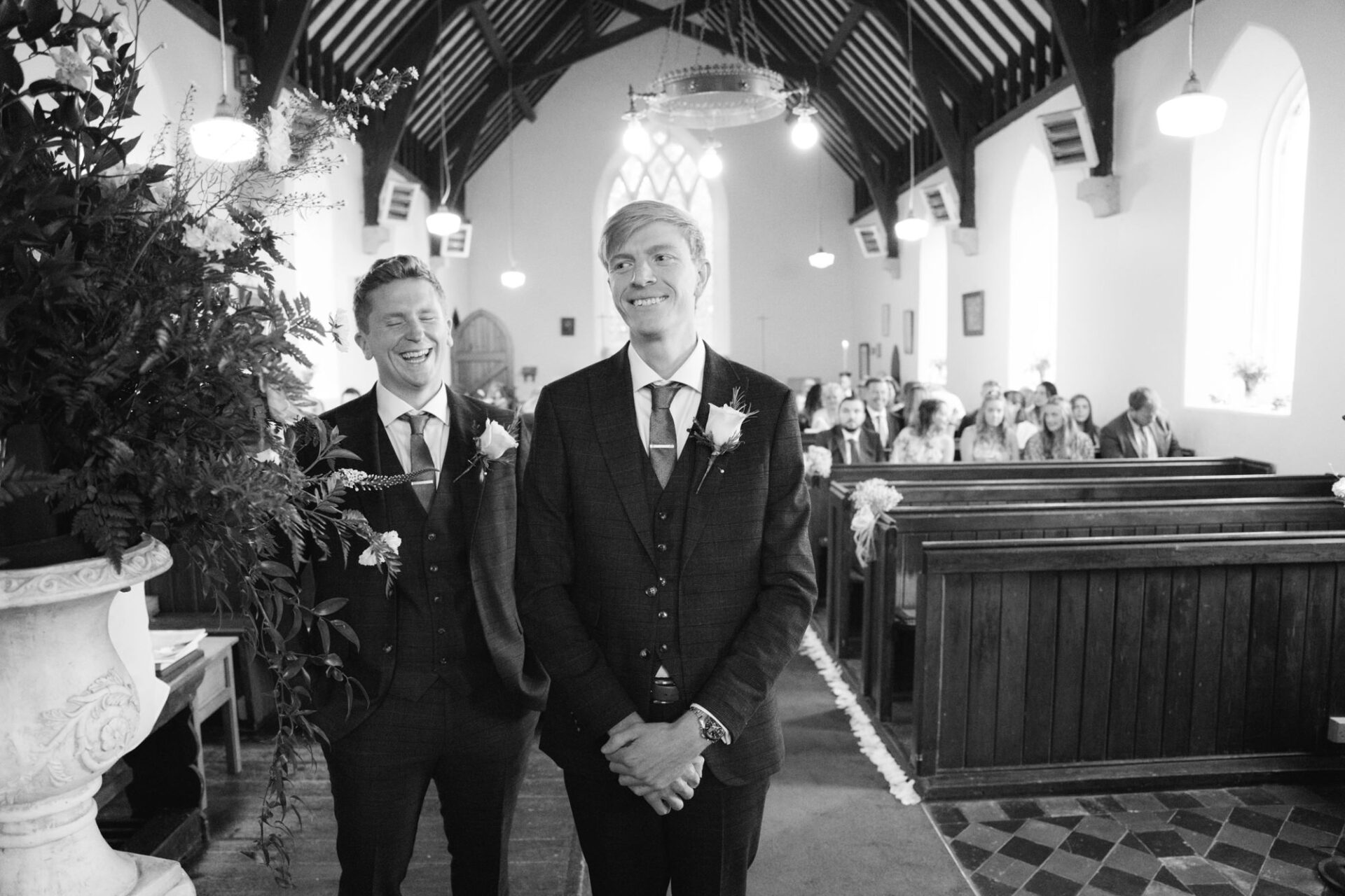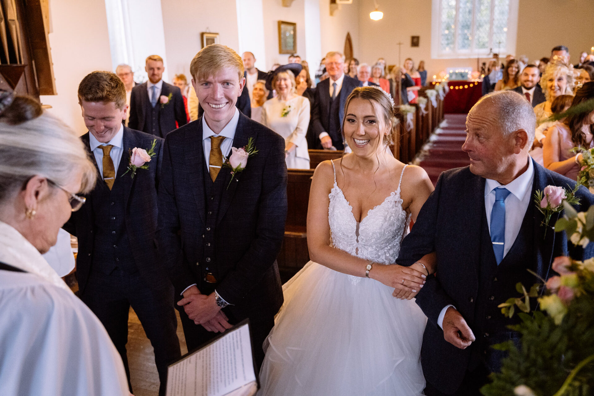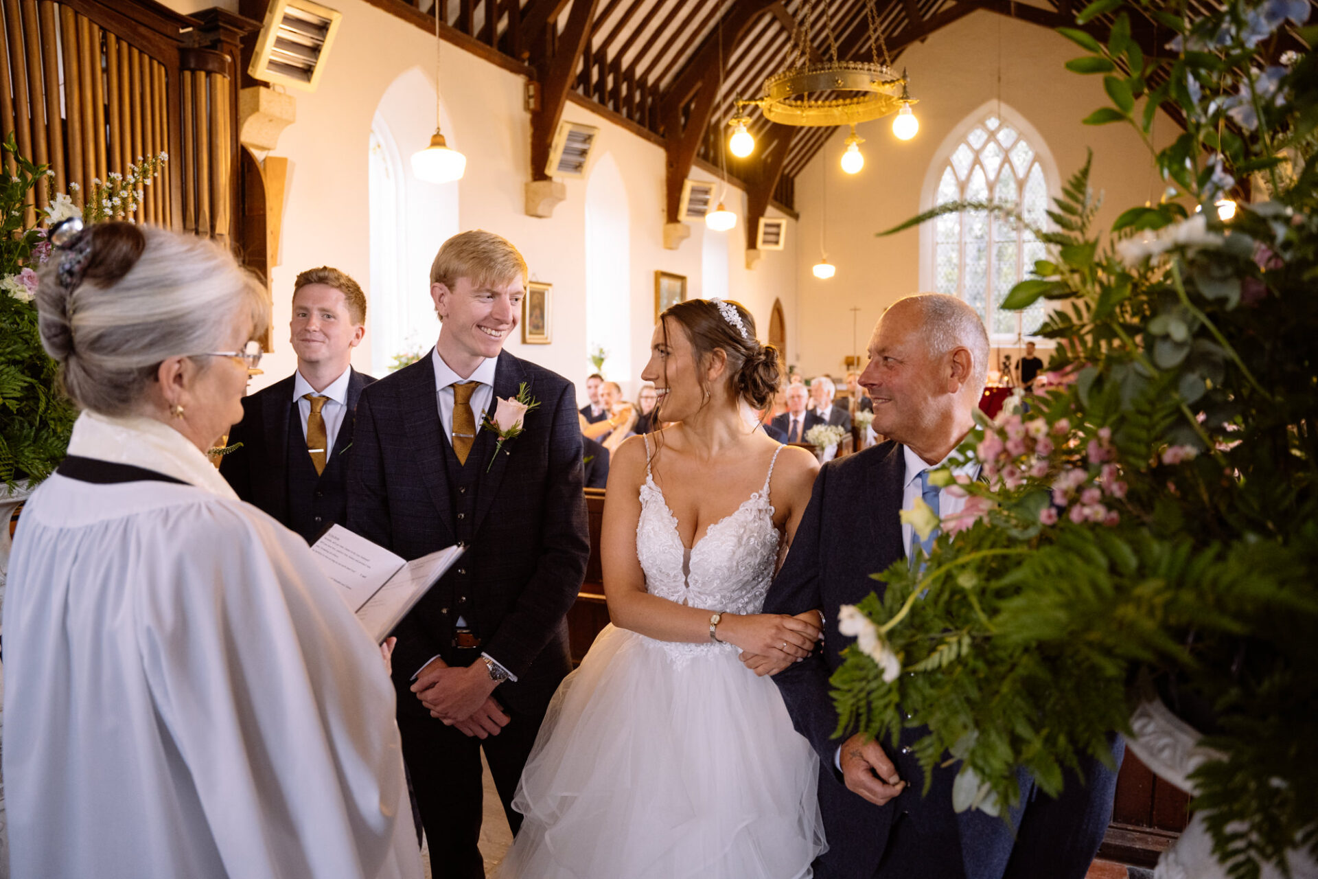 Natasha and James’ wedding service took place at Mount Hawke Church close to Cornwall’s North Coast. The church and it’s vicar are highly agreeable to wedding photographers. The bright, well lit church has big windows allowing lots of natural light. In addition, there are also the house lights giving extra illumination. Then there’s the Vicar herself*, who I found to be a lovely human! Whilst waiting for Natasha to arrive, we shared and few jokes and helped put James at his ease. All in all, I hope to return to photograph many a wedding here!