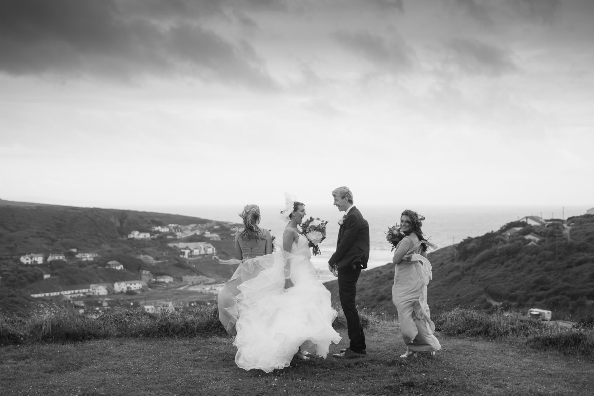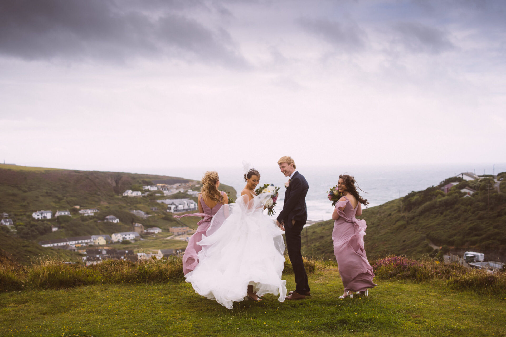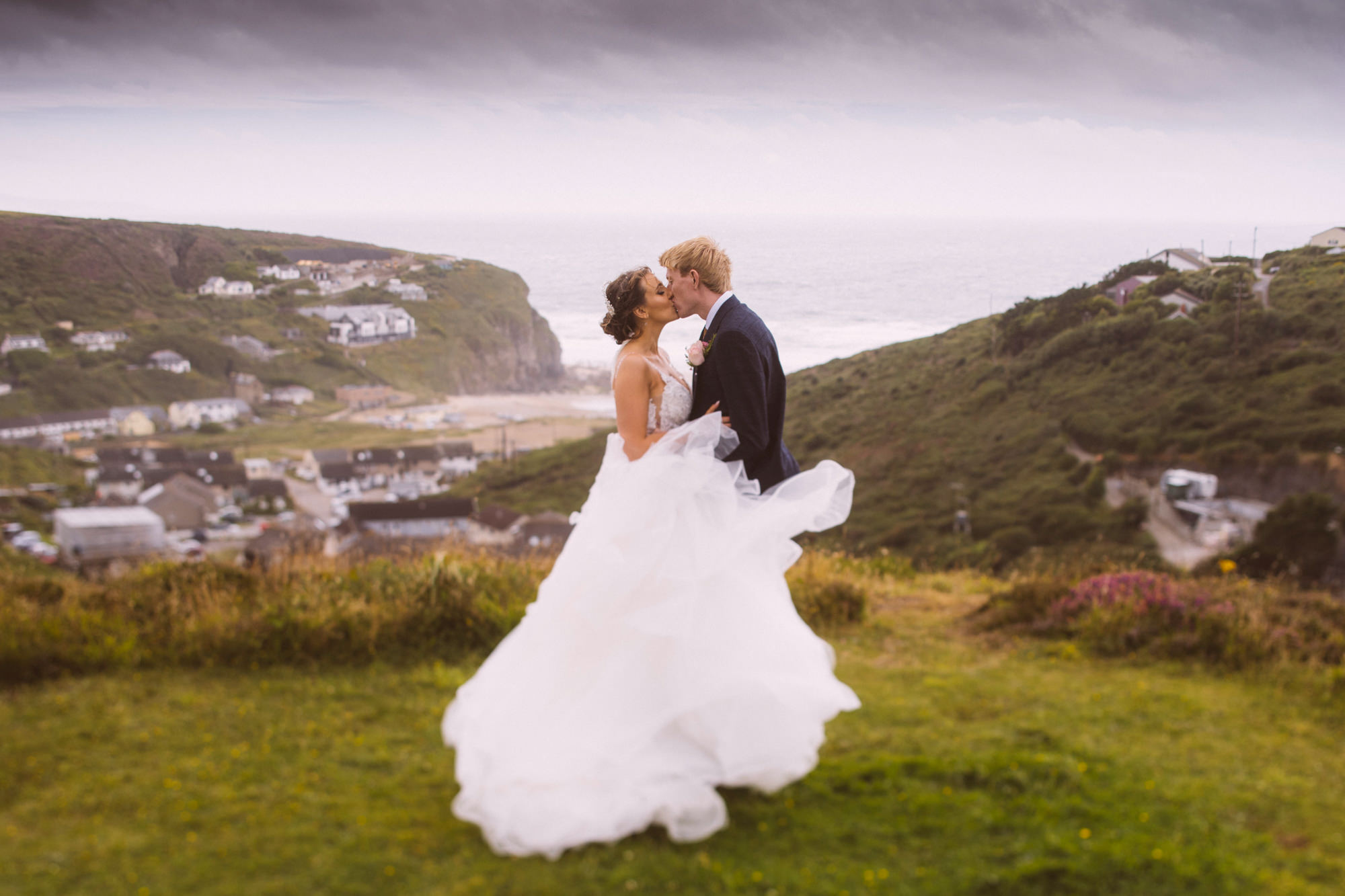 Finally, once the service and confetti throwing was over, the happy couple were whisked off to Porthtowan cliffs! The wind in Cornwall can be factor at some weddings, especially on the North Coast. Natasha and James’ wedding just happened to take place on fairly stormy day. The wind swirled around and played havoc with Natasha’s dress. Consequently, the ensuing photo session was spent feverishly shooting portraits before the impending rain!