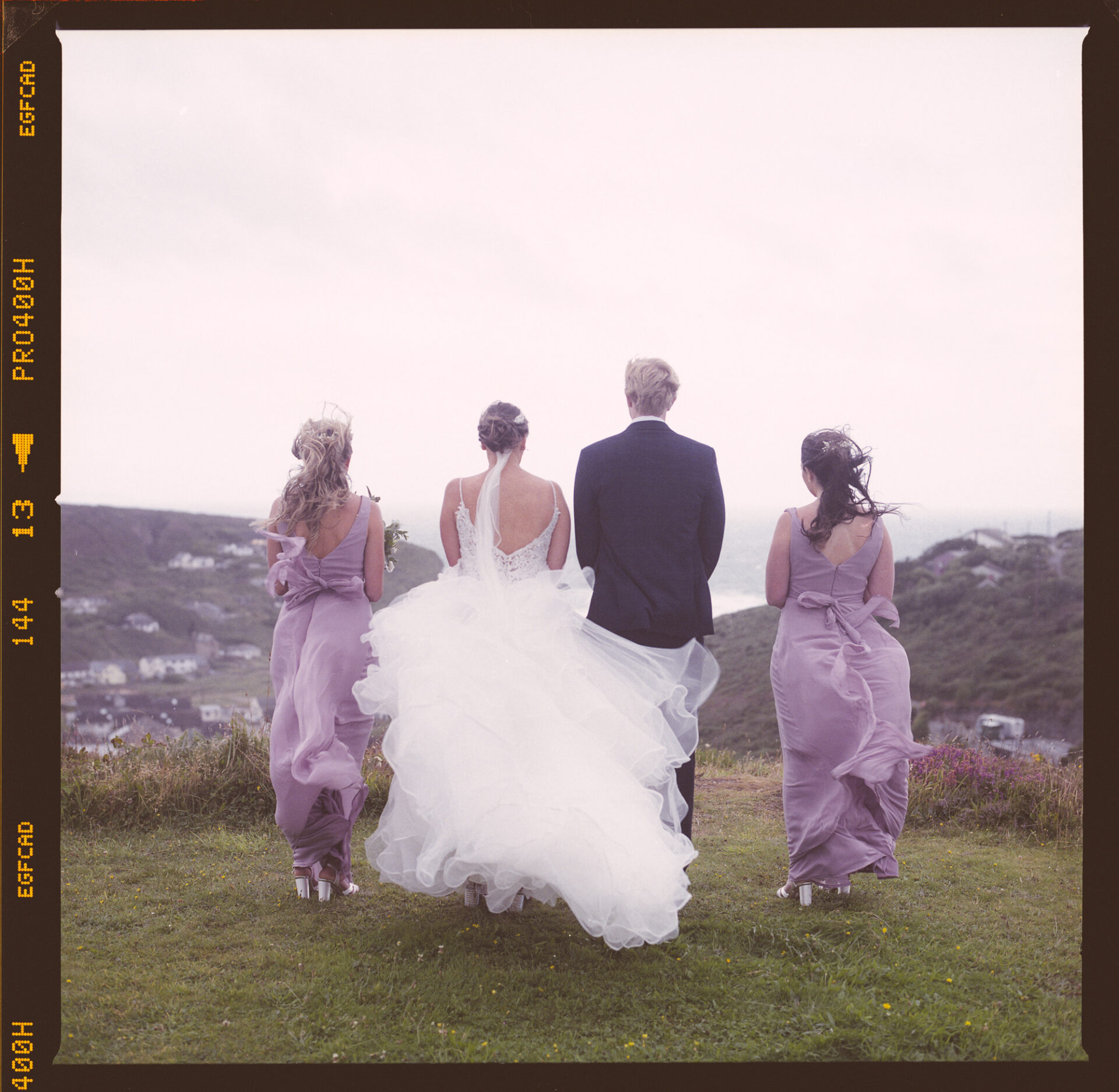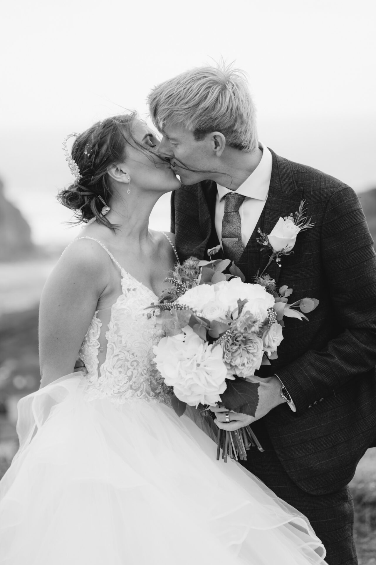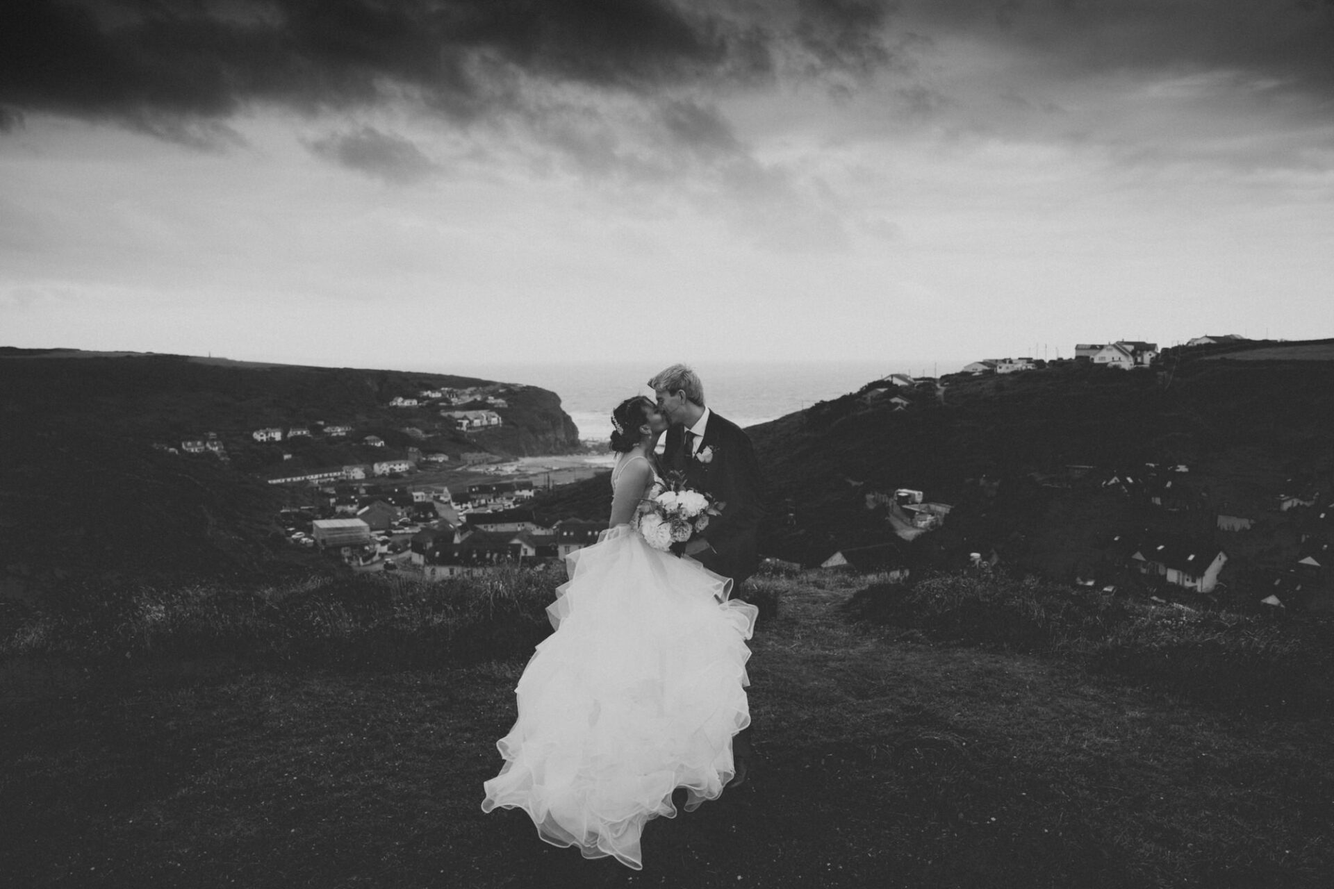 Finally, once the service and confetti throwing was over, the happy couple were whisked off to Porthtowan cliffs! The wind in Cornwall can be factor at some weddings, especially on the North Coast. Natasha and James’ wedding just happened to take place on fairly stormy day. The wind swirled around and played havoc with Natasha’s dress. Consequently, the ensuing photo session was spent feverishly shooting portraits before the impending rain!
