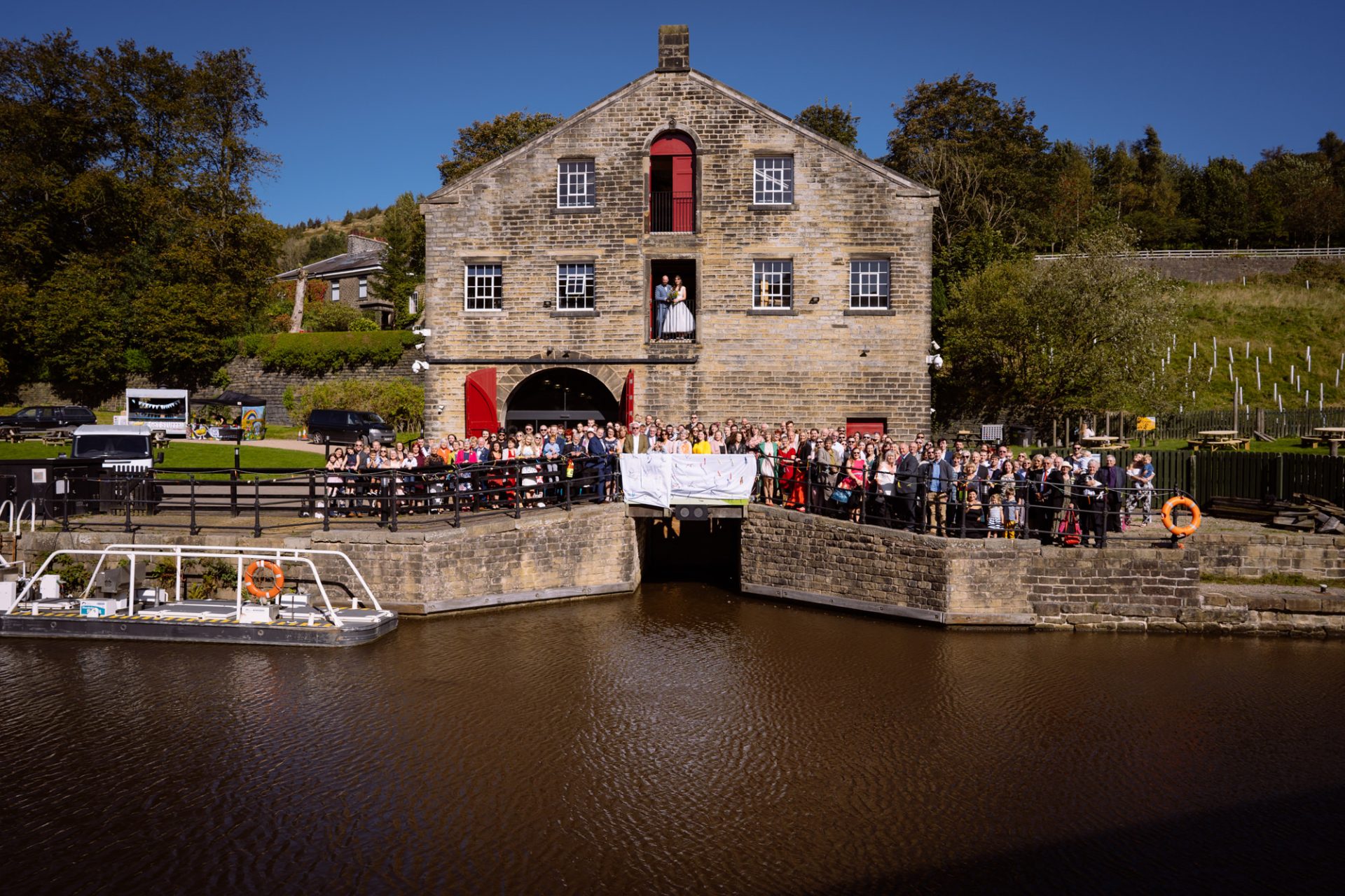 One of Rosie’s stipulations for photography at her Standedge Tunnel Wedding was a group shot of the entire congregation. I positioned myself on the other side of the canal from the visitor centre building whilst Kirsty arranged everyone. Rosie and Ben stood in the second floor window with the crowds massing below. The resulting shot is included in this here gallery (n.b. please note, whilst preparing the venue Rosie had thought of everything. Right down to a covering for the advertising hoarding!)