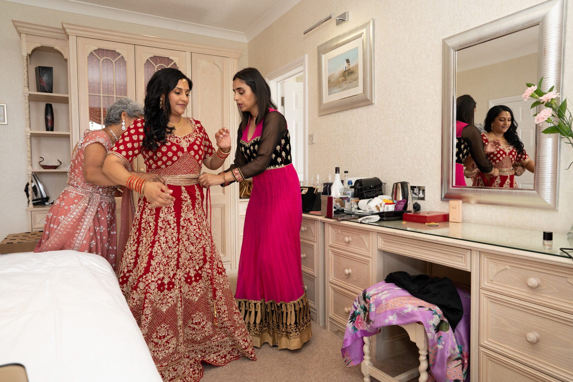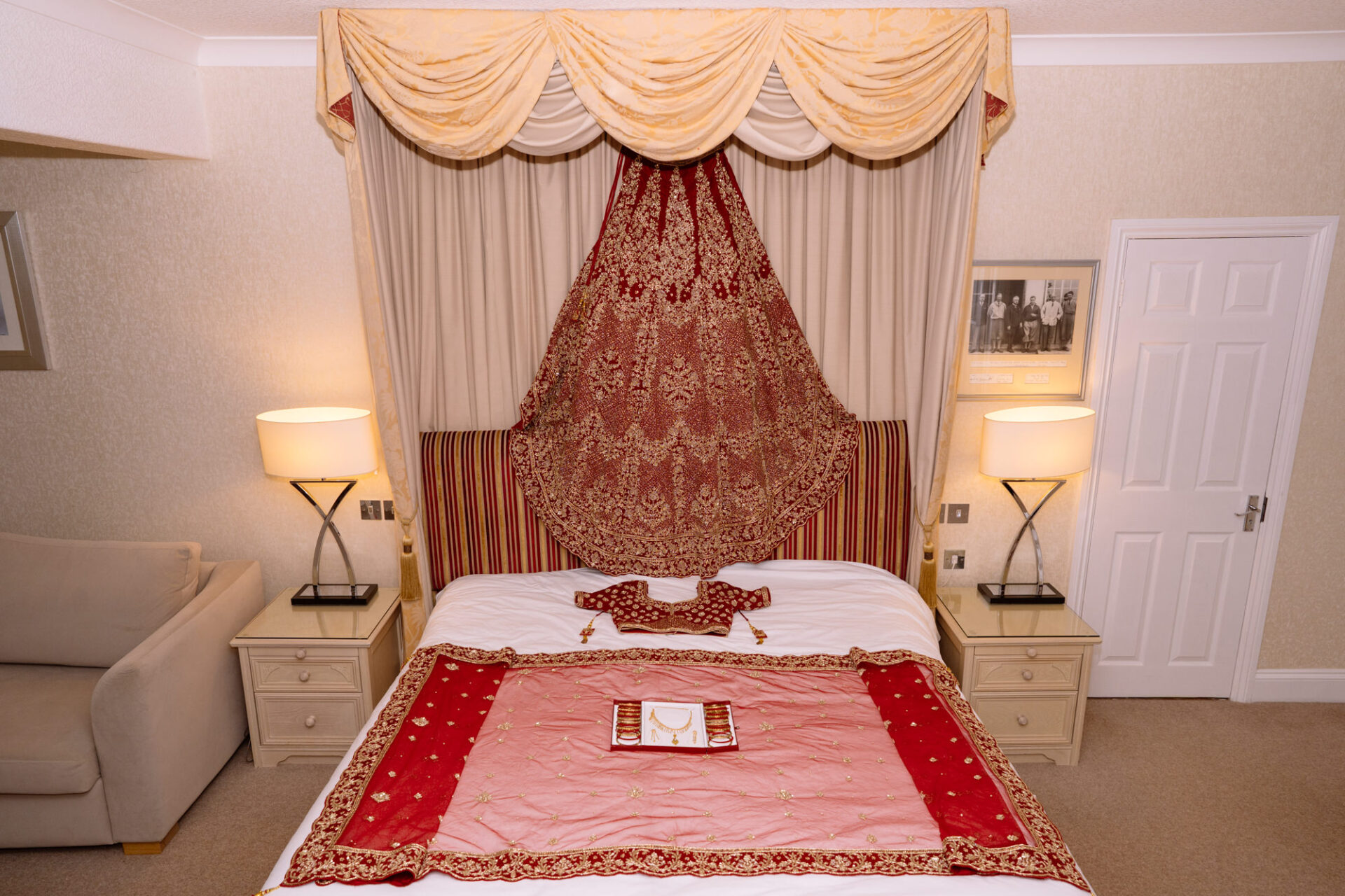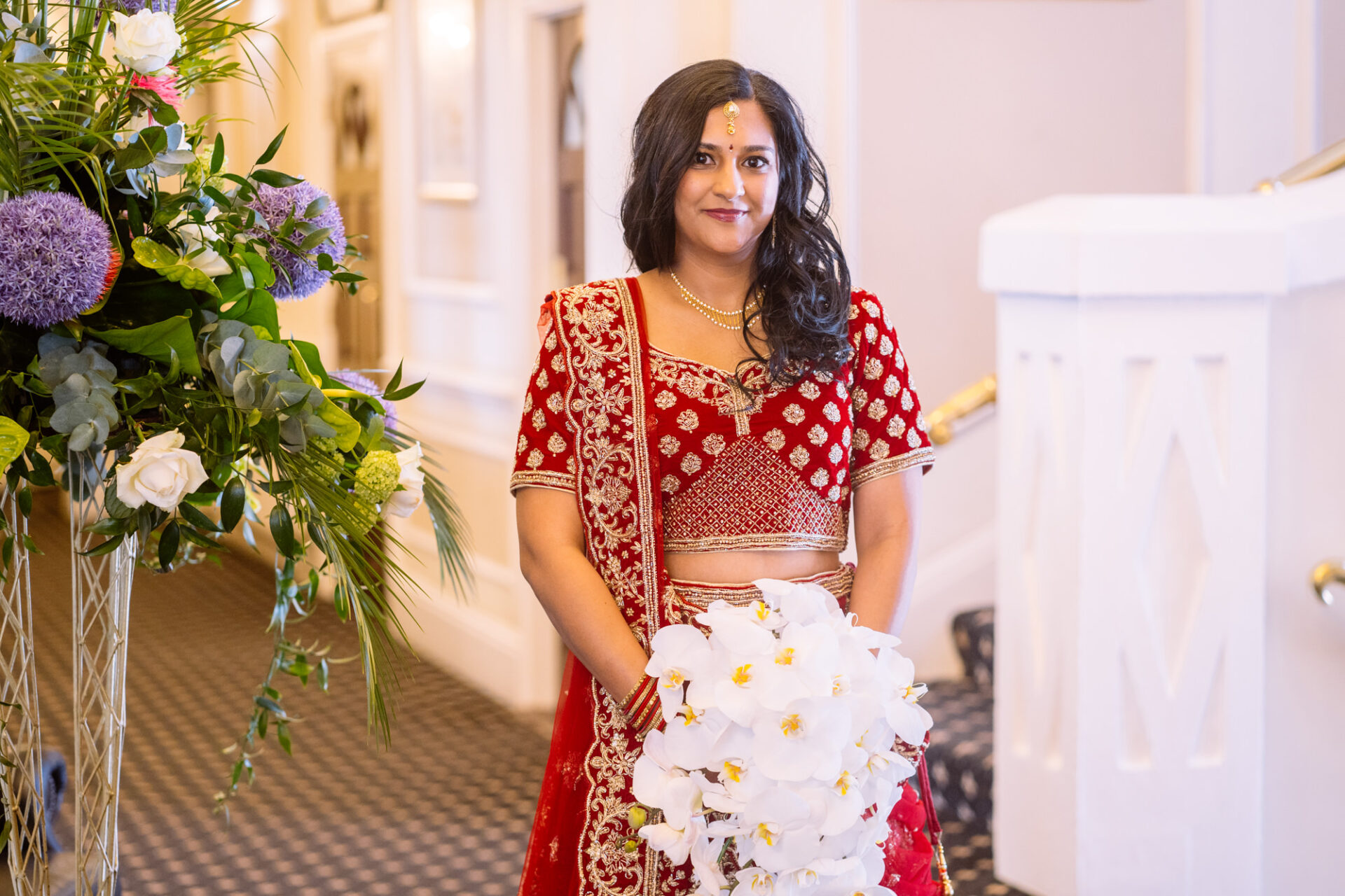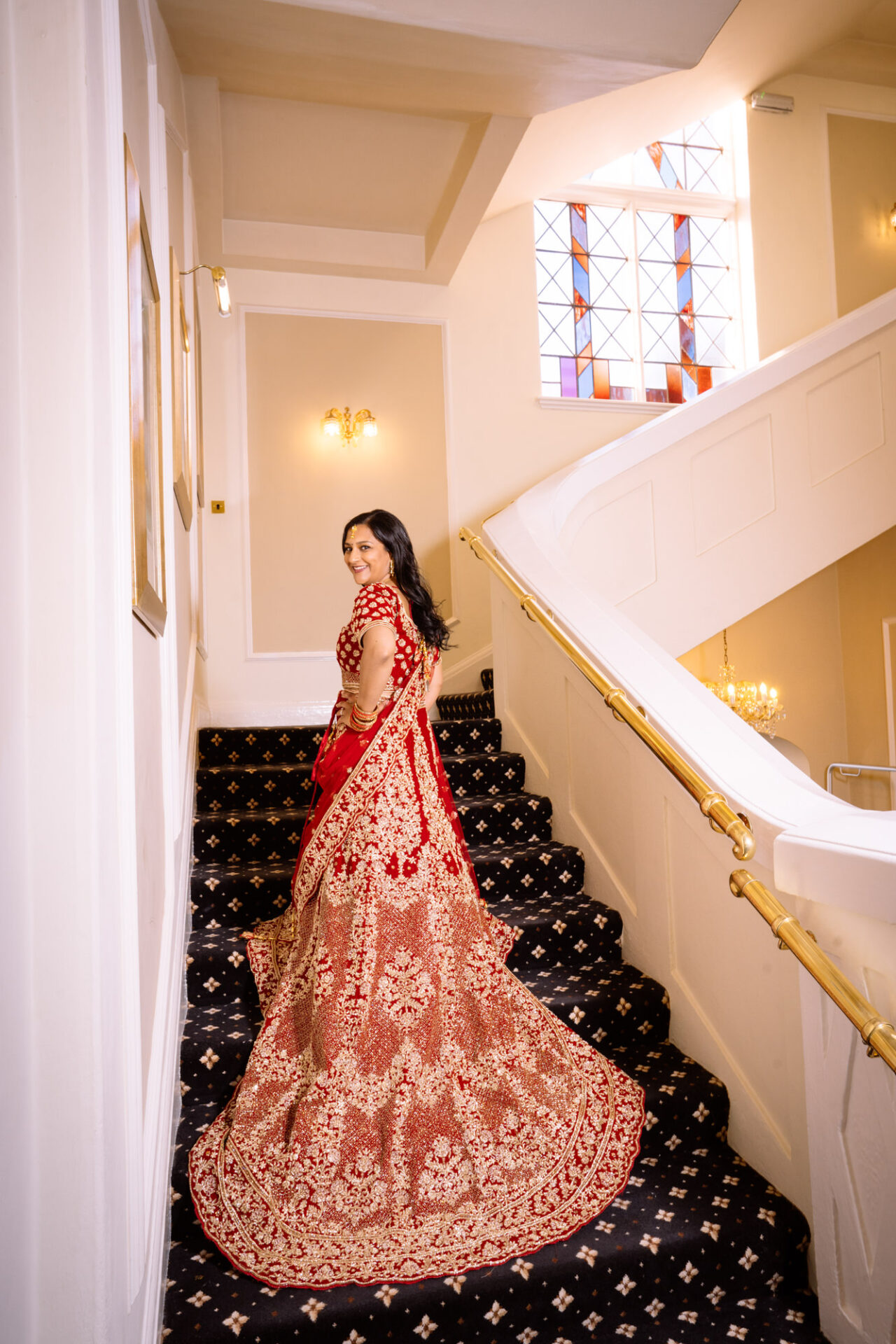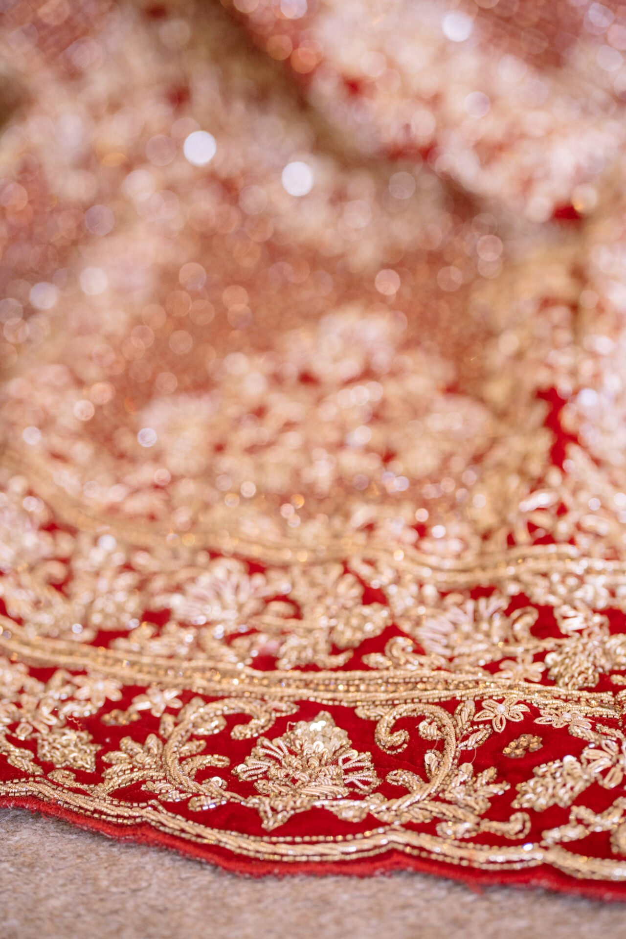Ruby and David’s wedding happened during the Covid rule of 30 people. Despite this, the Indian Sikh wedding was still a blaze of colour! Sikh brides tend to wear an ornate, decorative and exquisitely embroidered set of Salwar Kameez. Ruby’s Lehenga Choli wedding dress was an incredible deep red in colour inkeeping with tradition. This dress has 3 parts, and is incredibly detailed and embellished. It is also very heavy! I asked Ruby to hold the dress up for a few photos knowing she couldn’t manage it for long!