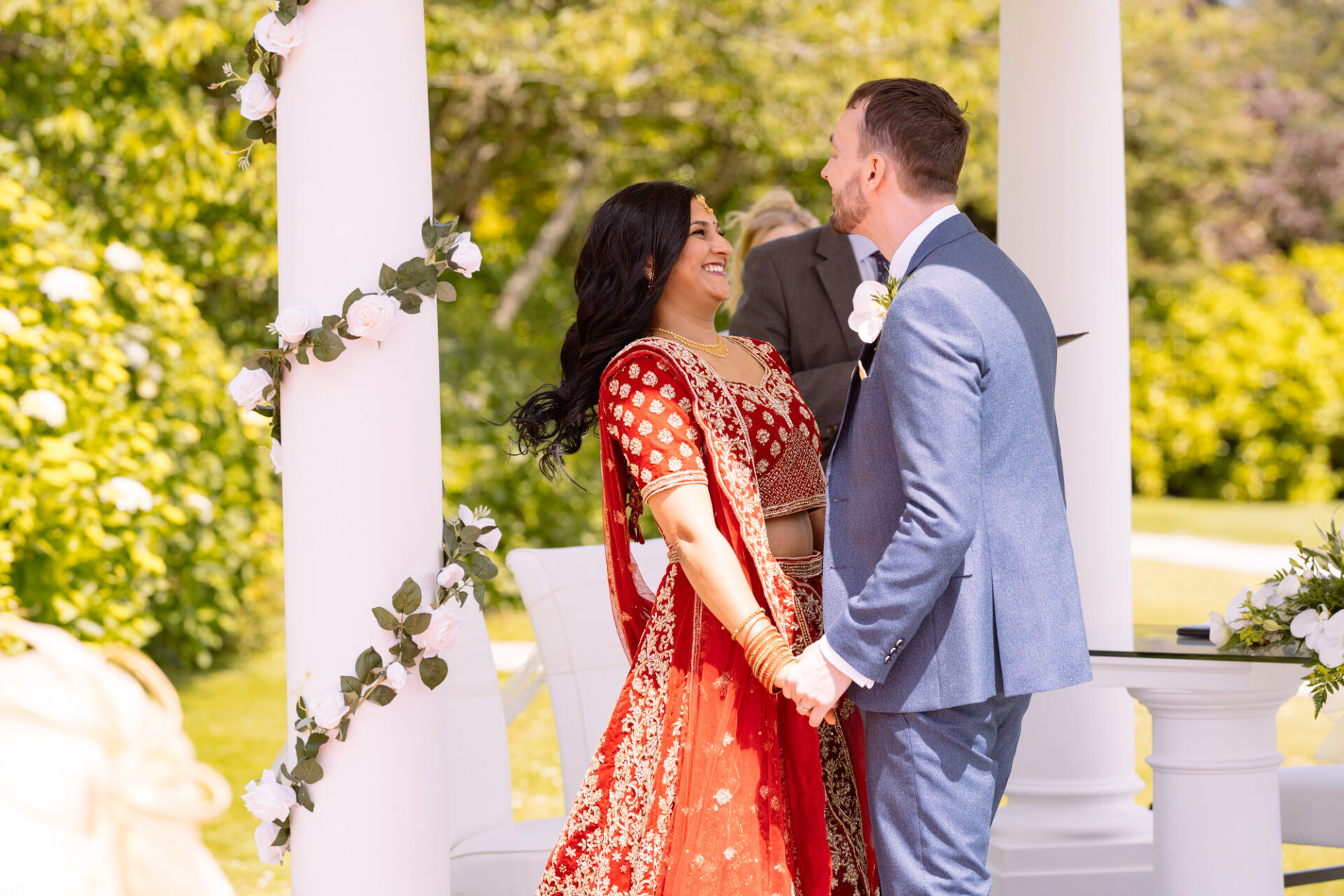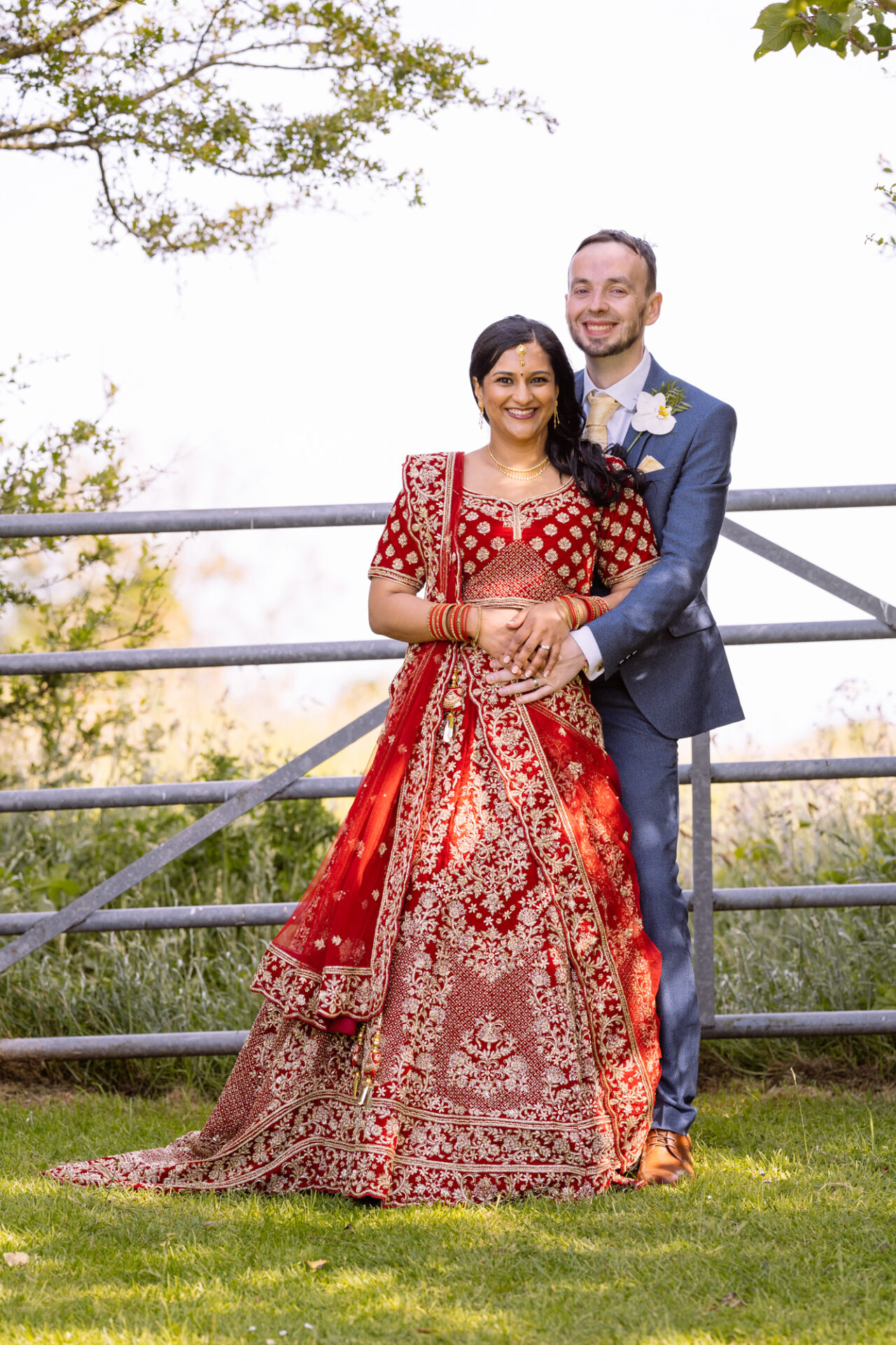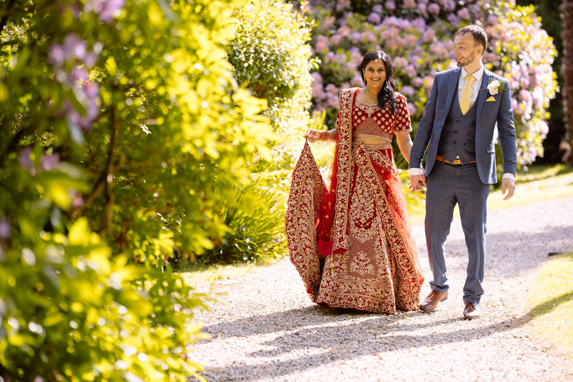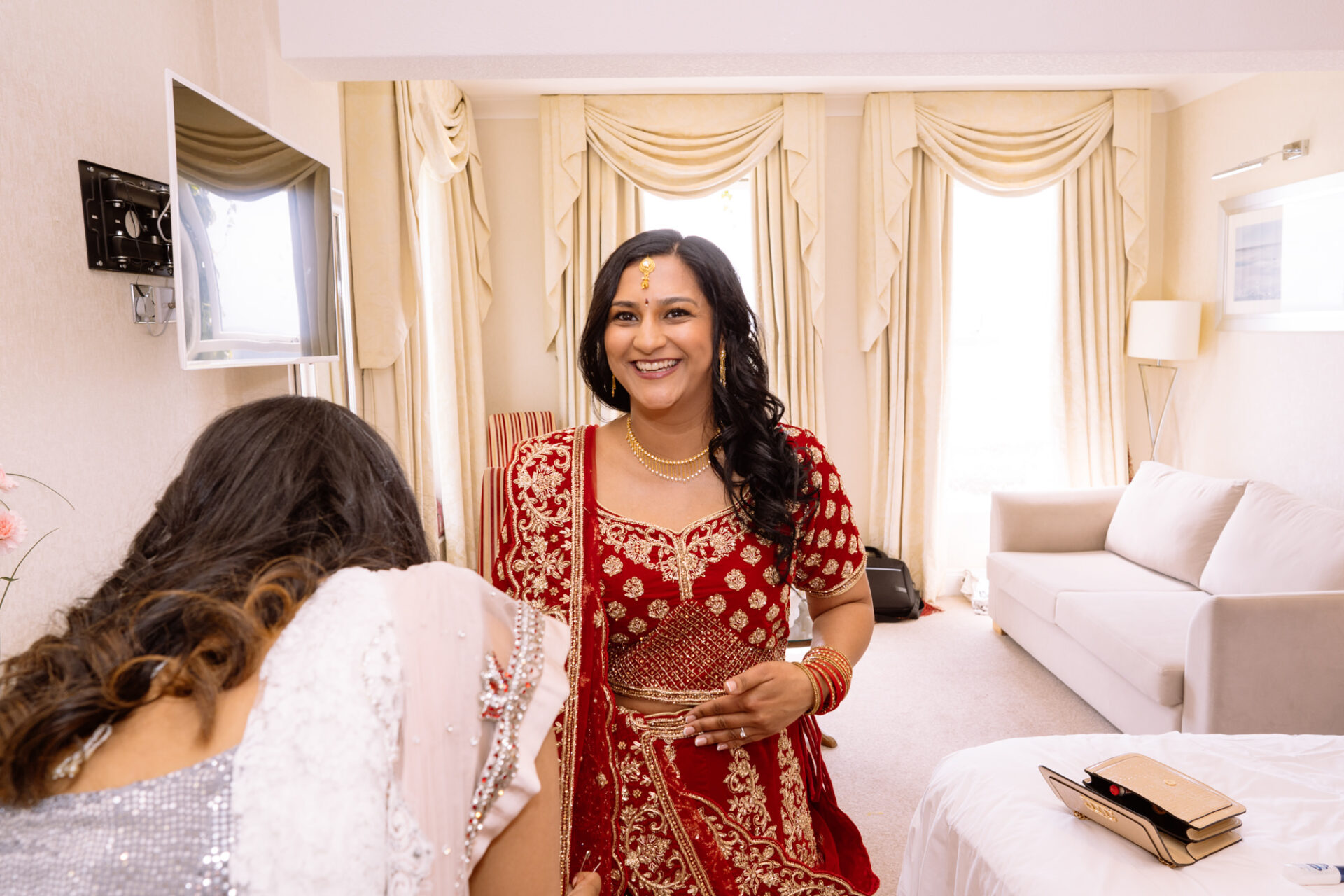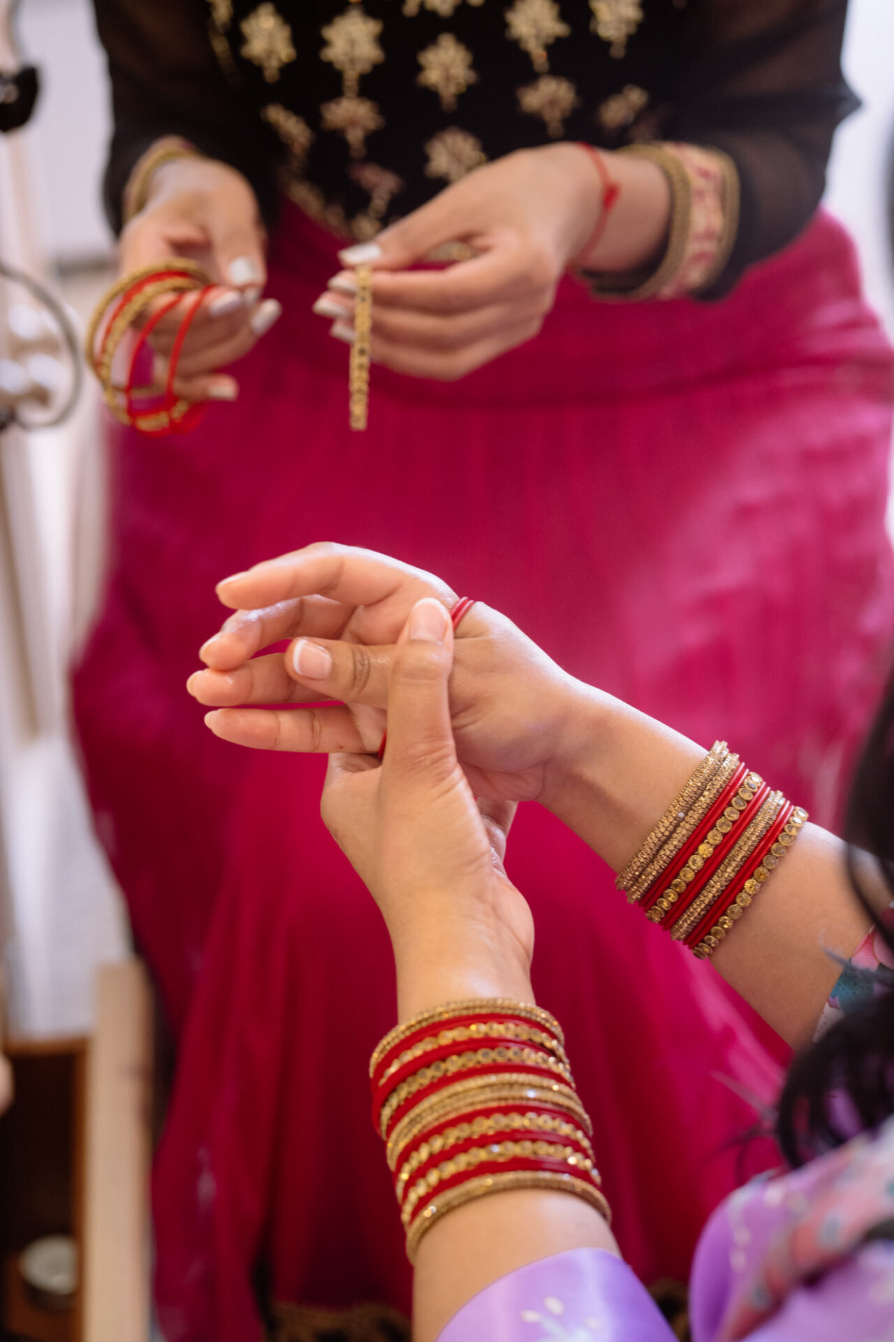 Ruby and David’s wedding happened during the Covid rule of 30 people. Despite this, the Indian Sikh wedding was still a blaze of colour! Sikh brides tend to wear an ornate, decorative and exquisitely embroidered set of Salwar Kameez. Ruby’s Lehenga Choli wedding dress was an incredible deep red in colour inkeeping with tradition. This dress has 3 parts, and is incredibly detailed and embellished. It is also very heavy! I asked Ruby to hold the dress up for a few photos knowing she couldn’t manage it for long!
