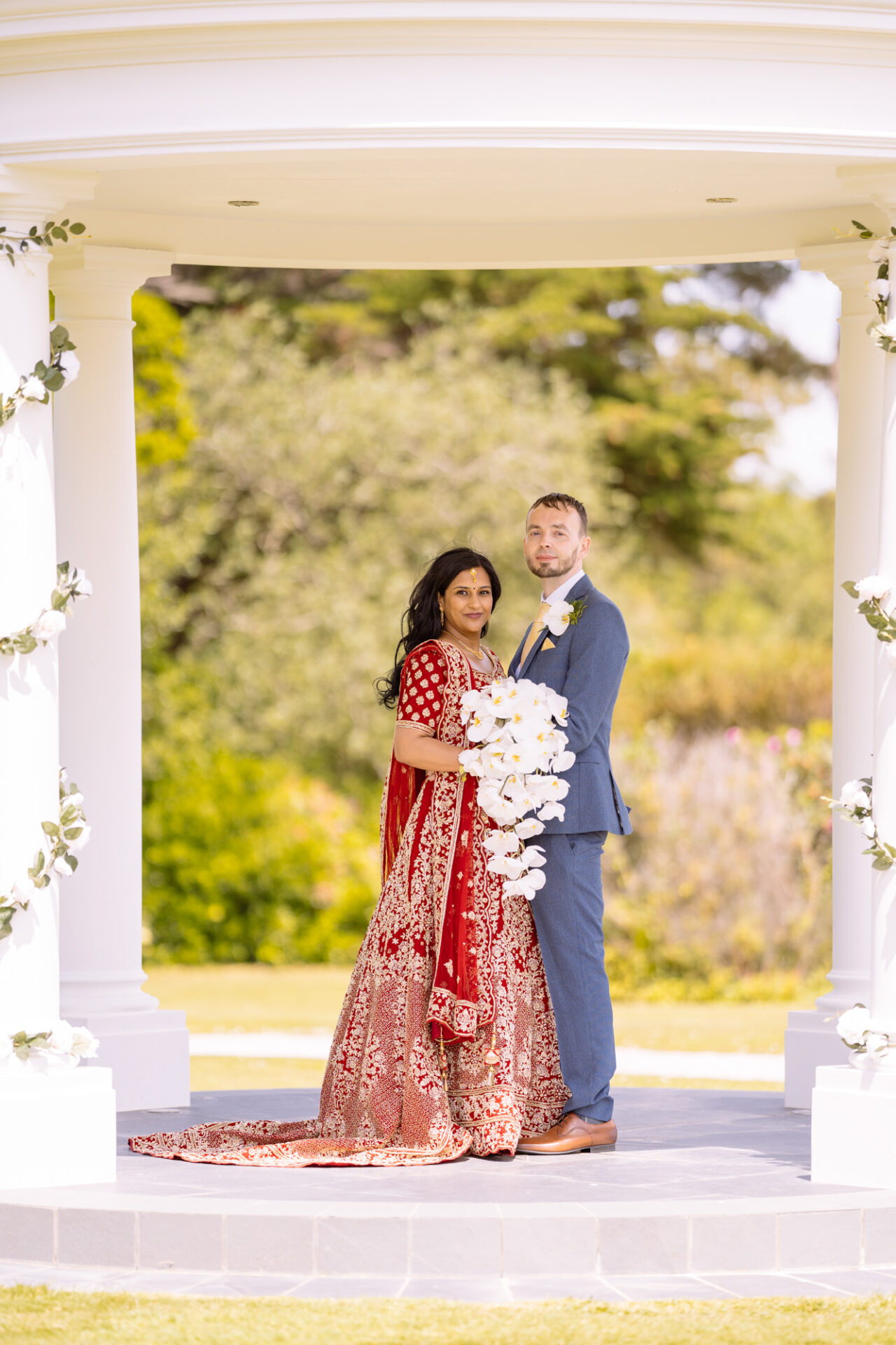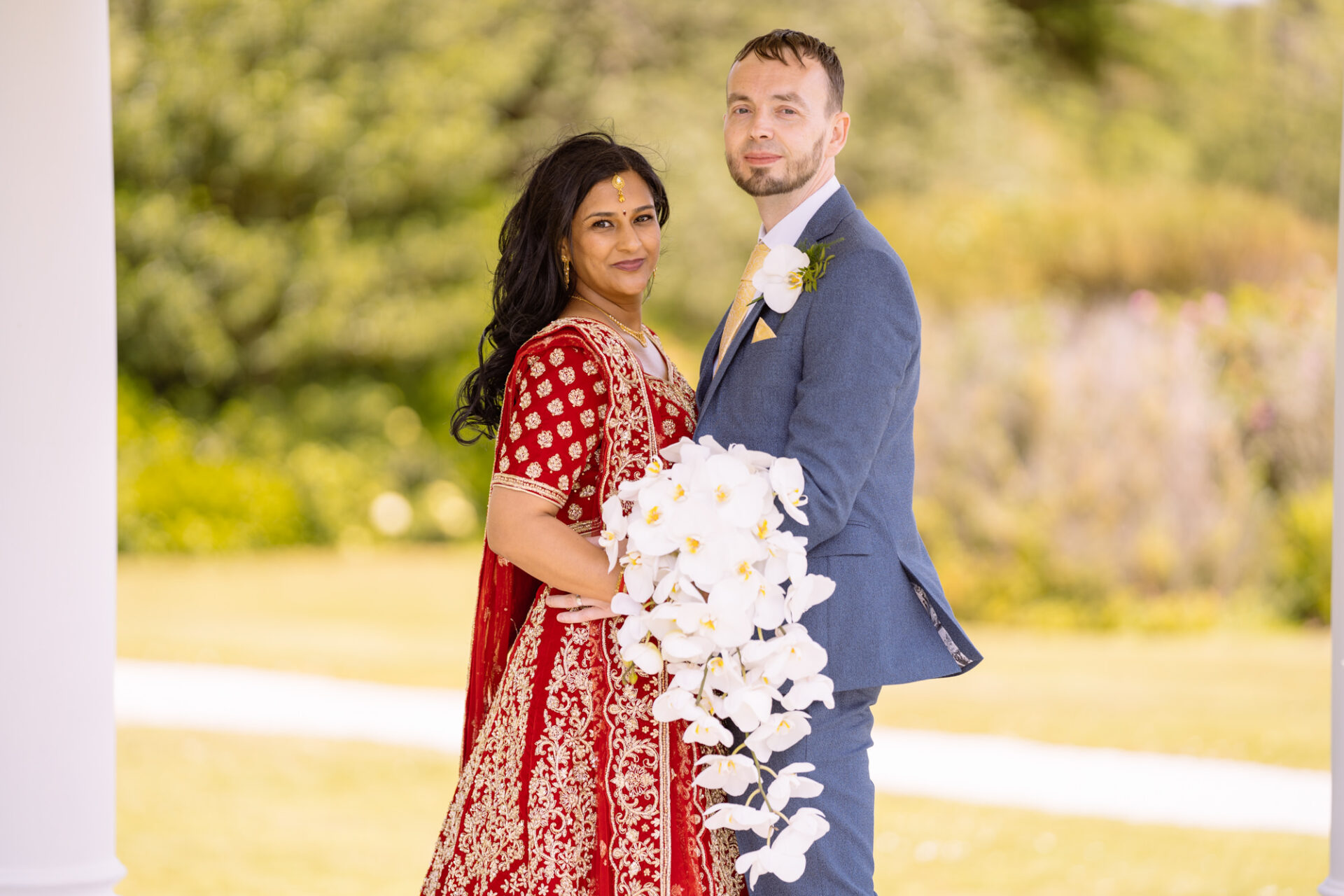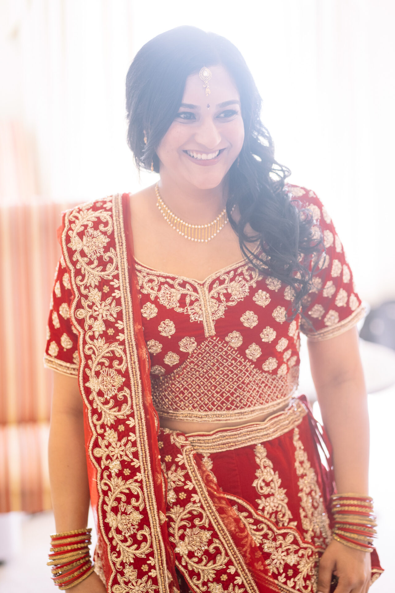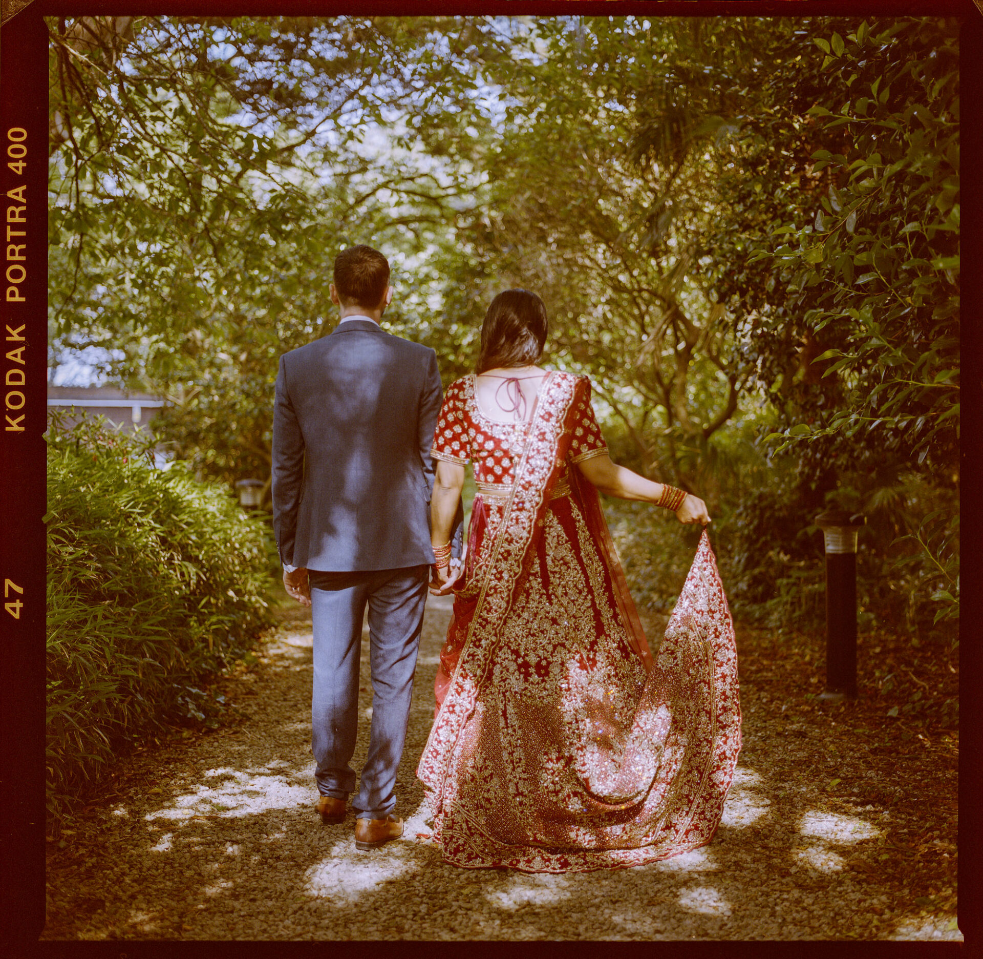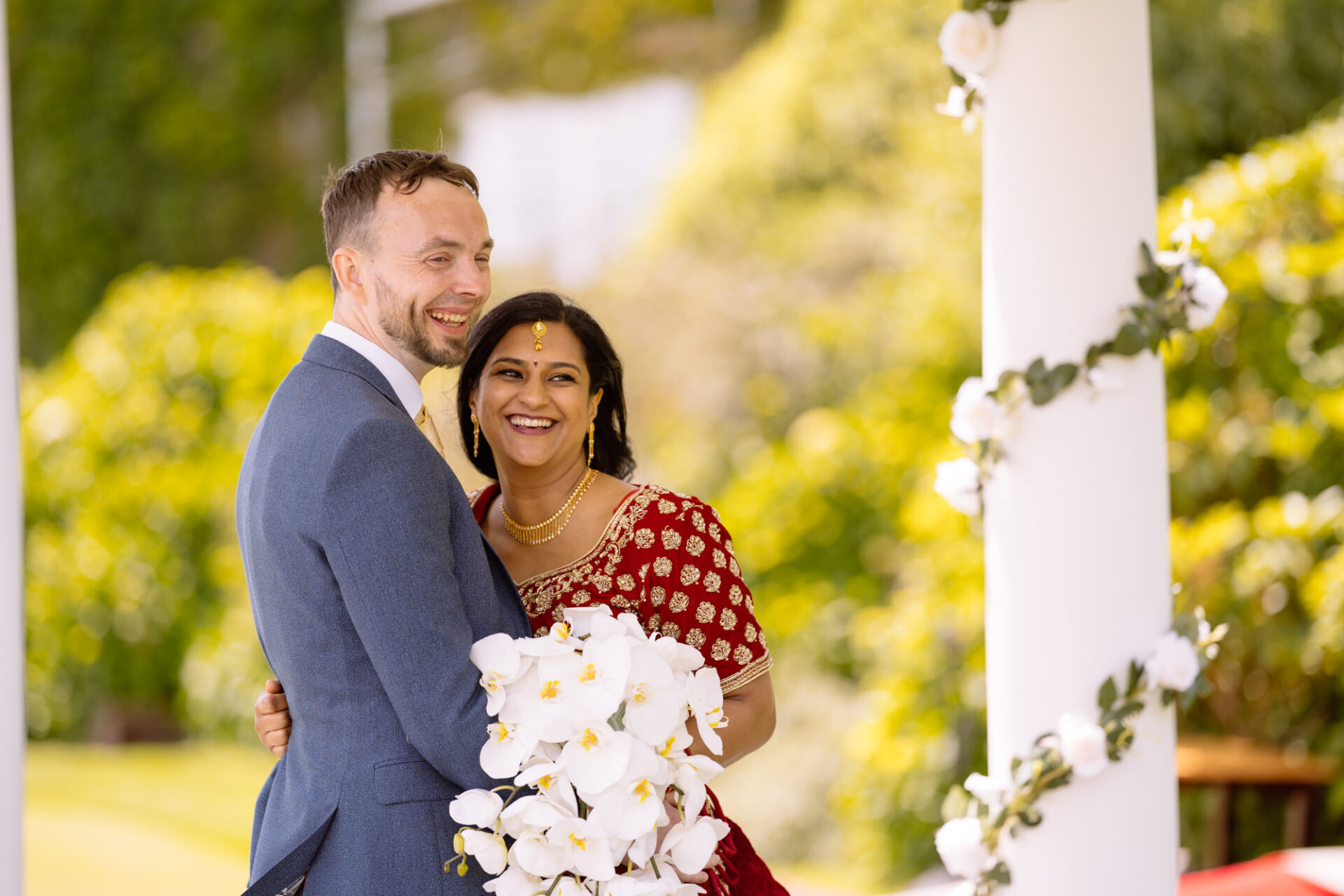 Ruby and David’s wedding happened during the Covid rule of 30 people. Despite this, the Indian Sikh wedding was still a blaze of colour! Sikh brides tend to wear an ornate, decorative and exquisitely embroidered set of Salwar Kameez. Ruby’s Lehenga Choli wedding dress was an incredible deep red in colour inkeeping with tradition. This dress has 3 parts, and is incredibly detailed and embellished. It is also very heavy! I asked Ruby to hold the dress up for a few photos knowing she couldn’t manage it for long!