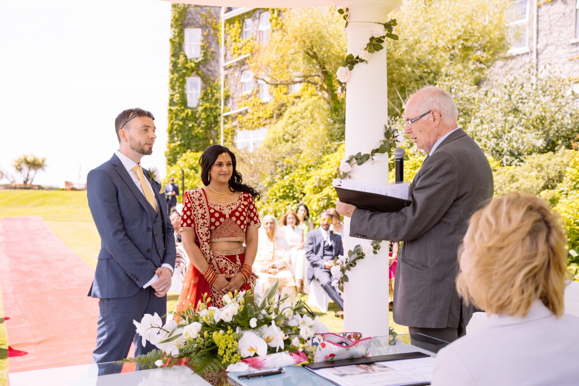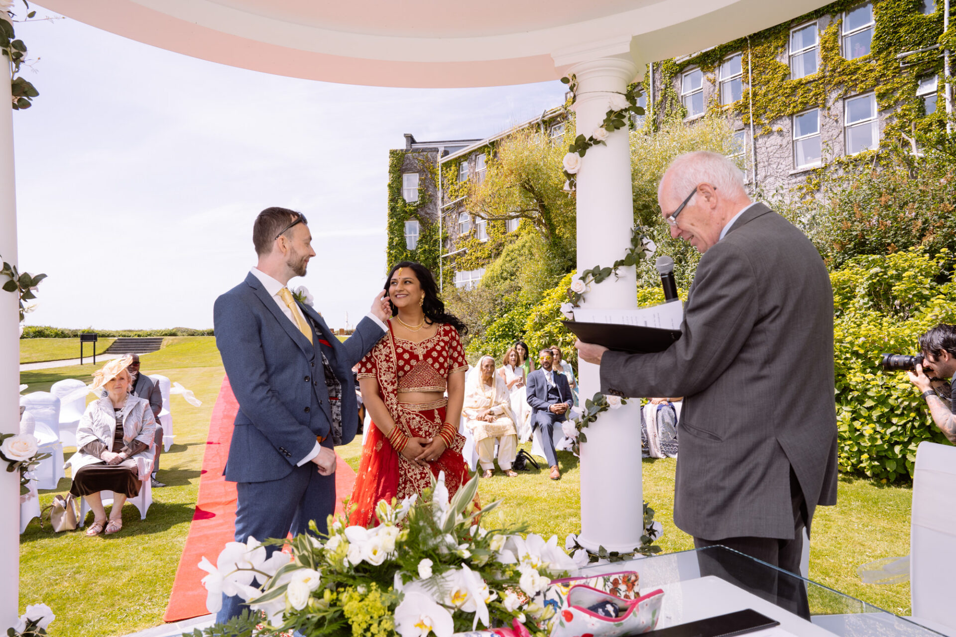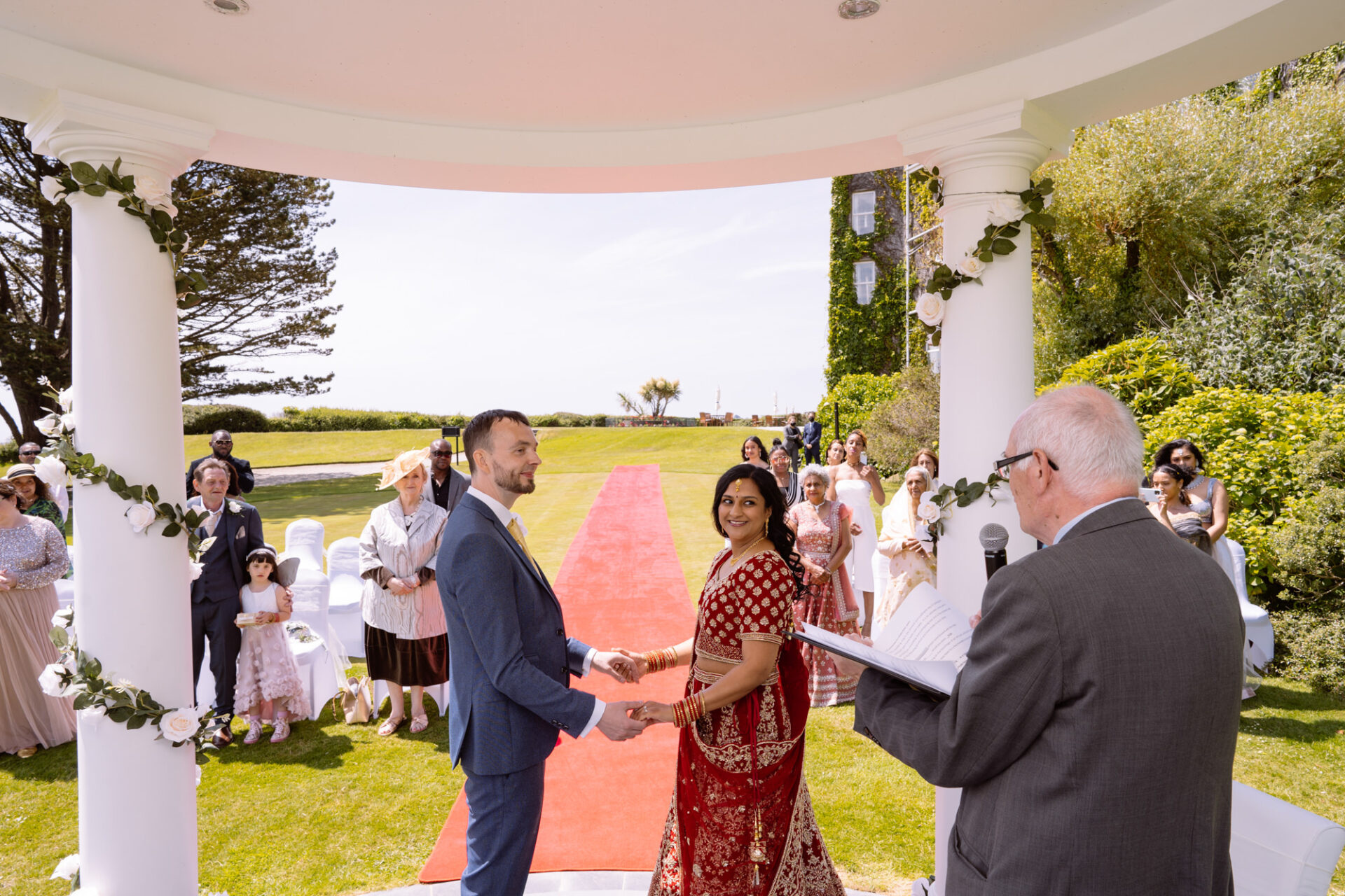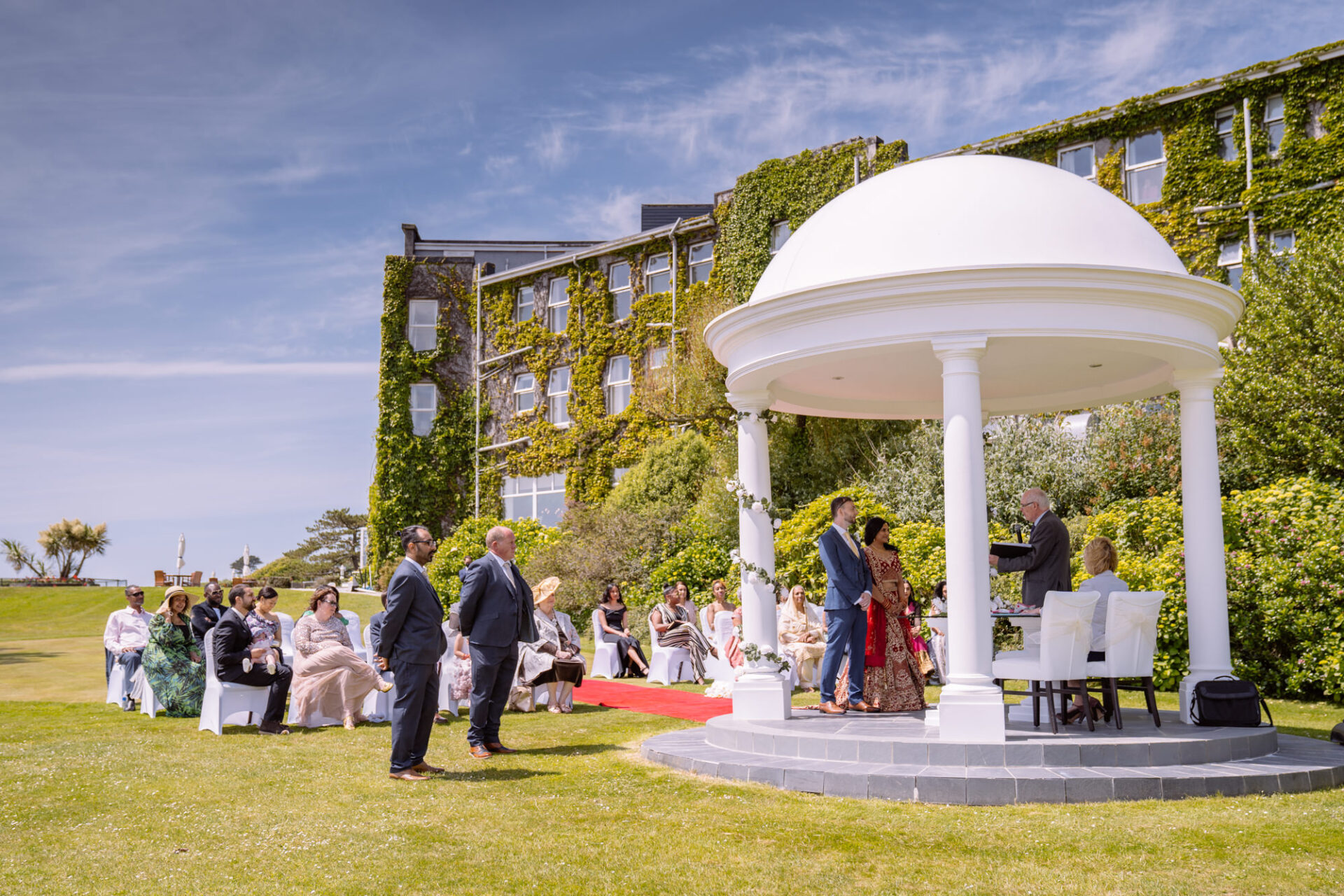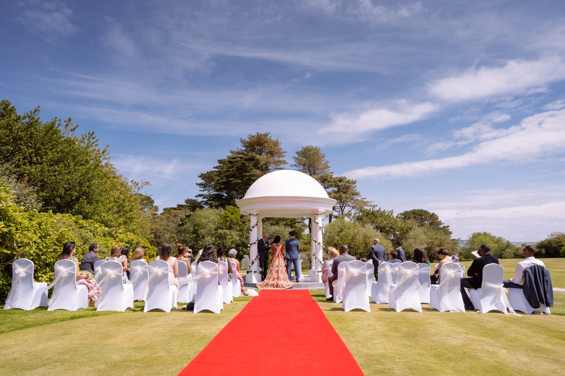 The Carlyon Bay Hotel has quite simply the most stunning gardens. Words like, lush, green, idyllic don’t really do them justice. Therefore, maybe you shold just picture a National Trust sub-tropical type scenario. Now add in a white stone pillared dome under which wedding ceremonies take place. Put all this into a scene with an ivy covered hotel as the backdrop. Next, add in a red carpet acting as an aisle. There you have the arena that met Ruby’s eyes as she exited the Hotel with her mother and bridesmaids. Almost all was perfect. I say almost as although we had wall-to-wall sunshine, there was a gusty wind blowing in from the sea. At certain points during the ceremony, hotel staff had to wrestle the red carpet as if it was an angry snake!