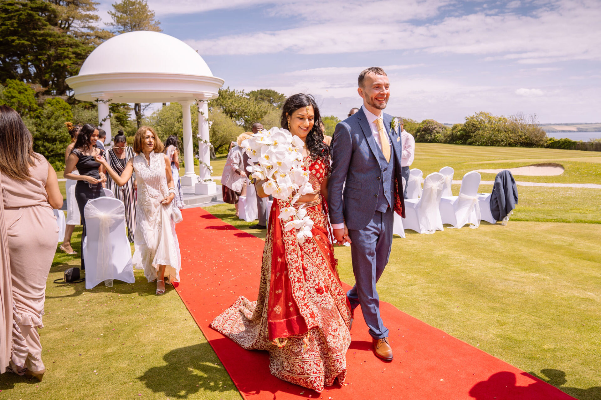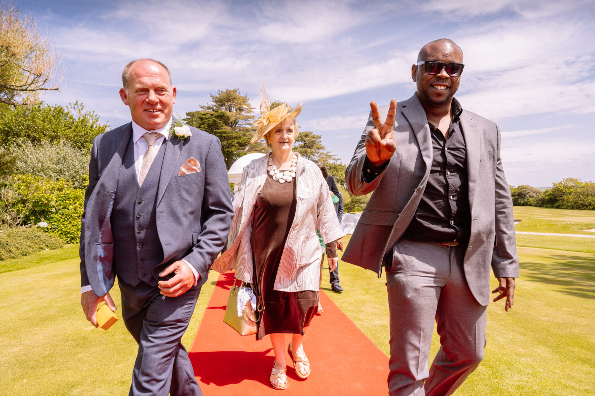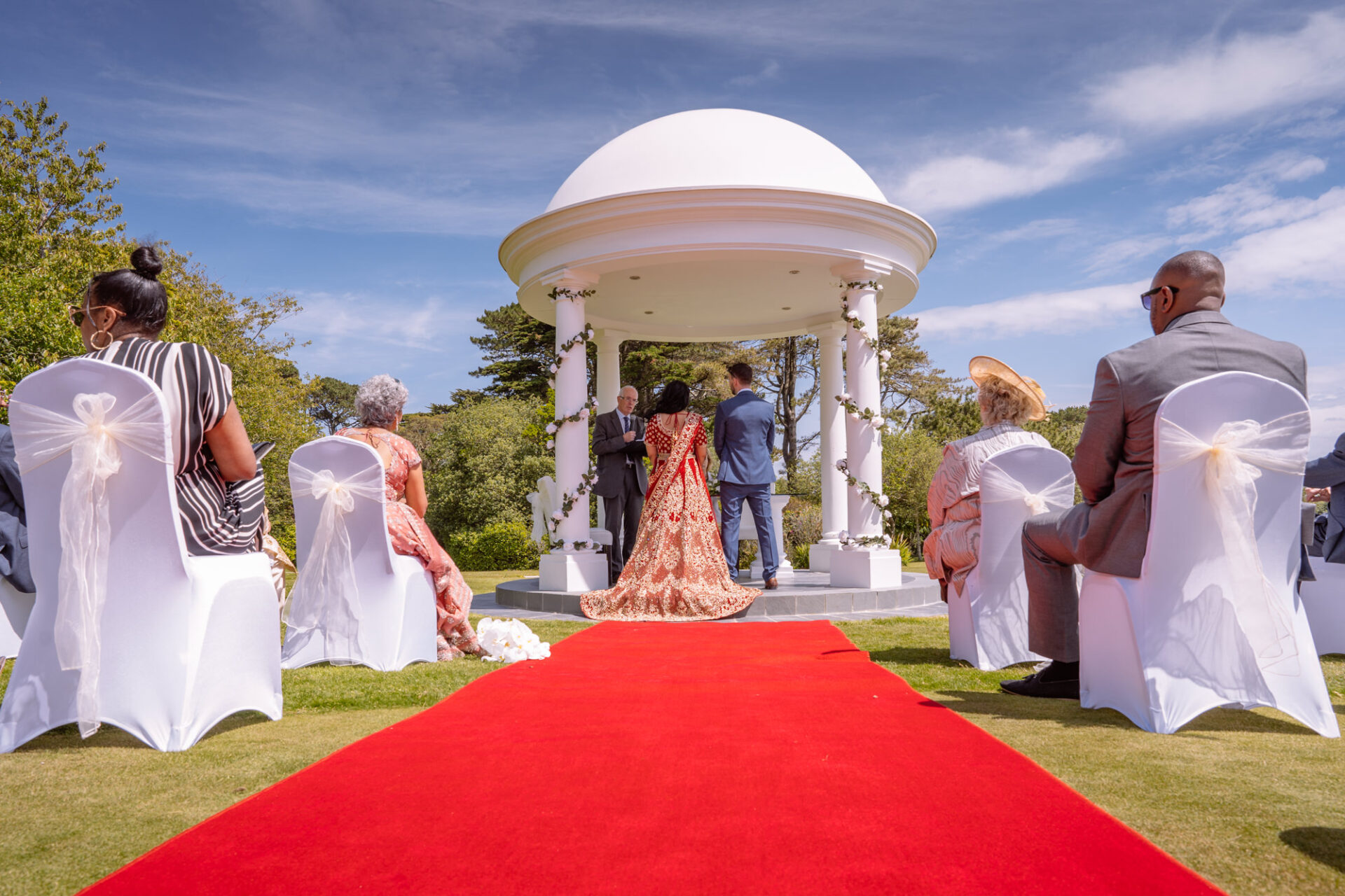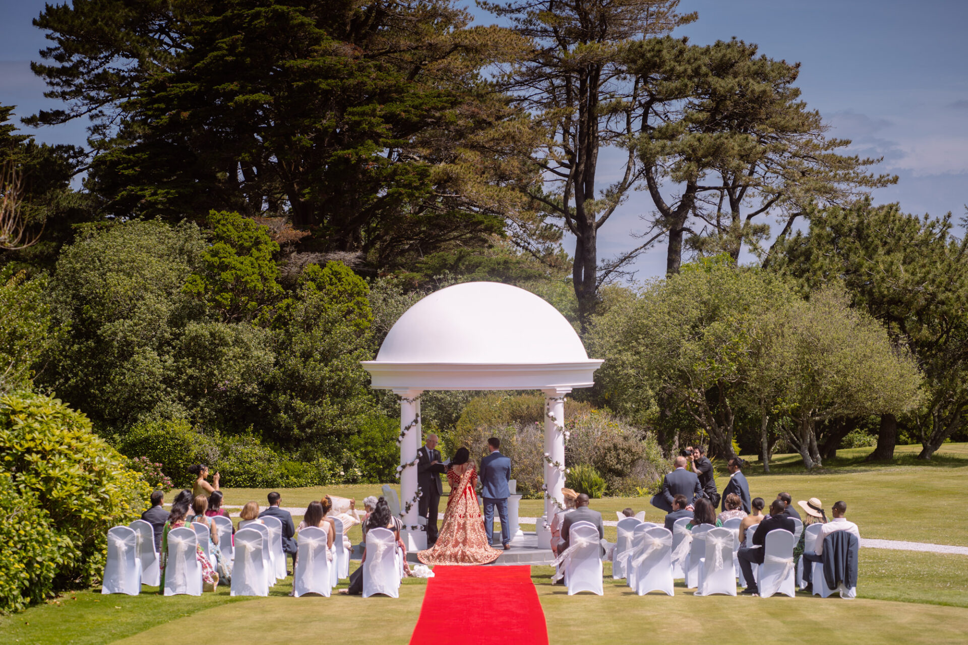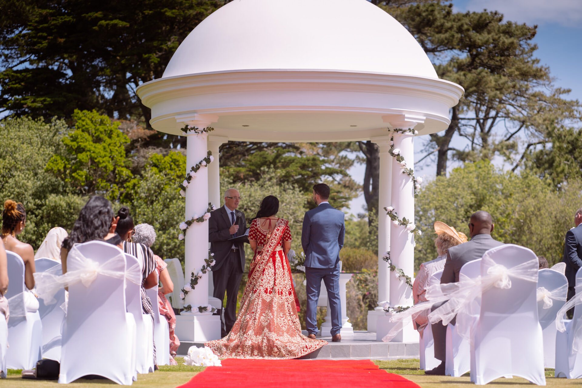 The Carlyon Bay Hotel has quite simply the most stunning gardens. Words like, lush, green, idyllic don’t really do them justice. Therefore, maybe you shold just picture a National Trust sub-tropical type scenario. Now add in a white stone pillared dome under which wedding ceremonies take place. Put all this into a scene with an ivy covered hotel as the backdrop. Next, add in a red carpet acting as an aisle. There you have the arena that met Ruby’s eyes as she exited the Hotel with her mother and bridesmaids. Almost all was perfect. I say almost as although we had wall-to-wall sunshine, there was a gusty wind blowing in from the sea. At certain points during the ceremony, hotel staff had to wrestle the red carpet as if it was an angry snake!
