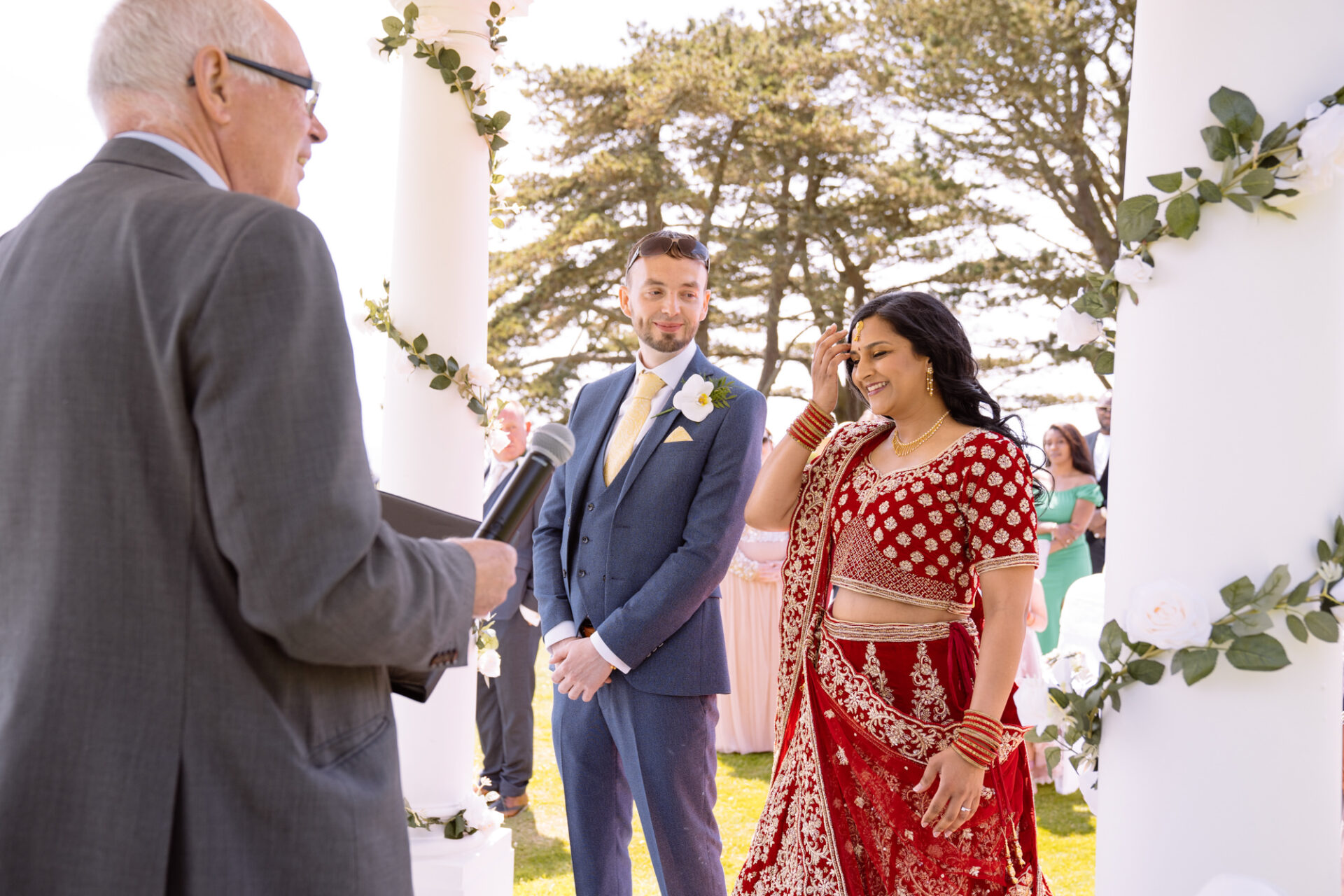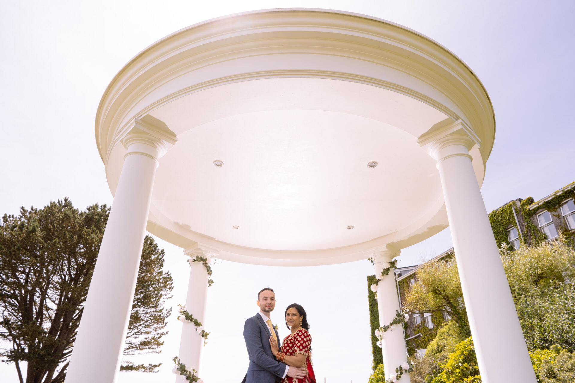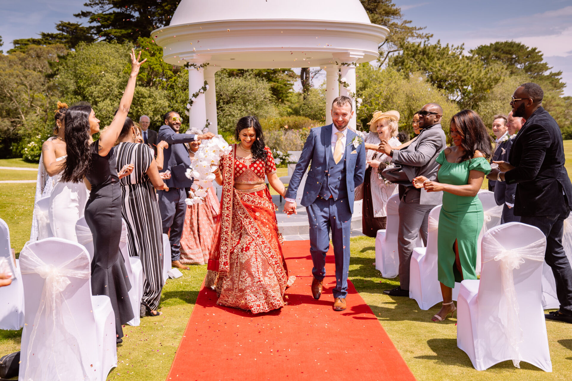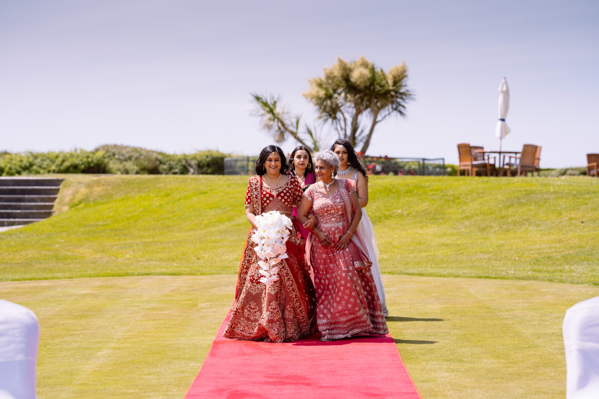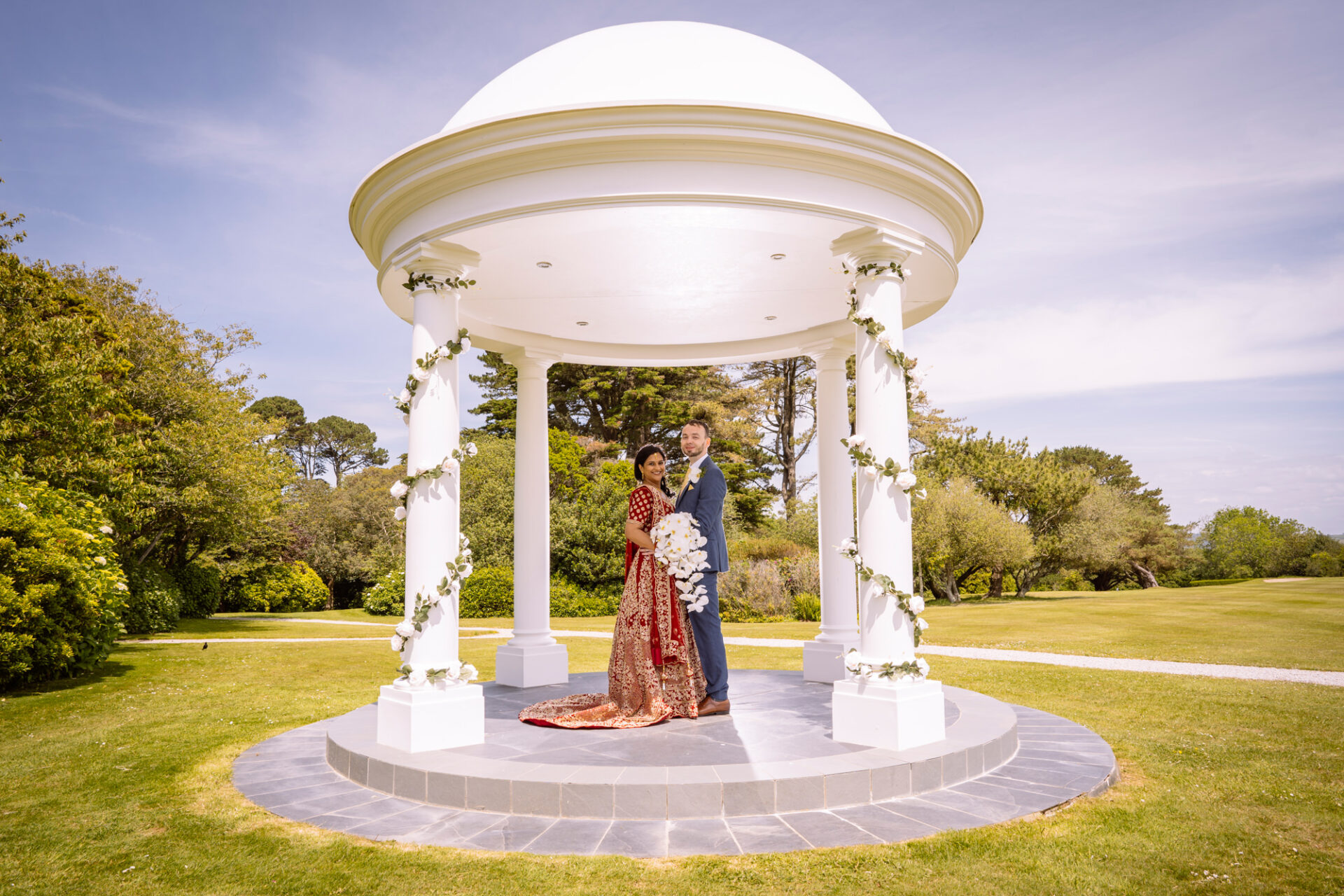 The Carlyon Bay Hotel has quite simply the most stunning gardens. Words like, lush, green, idyllic don’t really do them justice. Therefore, maybe you shold just picture a National Trust sub-tropical type scenario. Now add in a white stone pillared dome under which wedding ceremonies take place. Put all this into a scene with an ivy covered hotel as the backdrop. Next, add in a red carpet acting as an aisle. There you have the arena that met Ruby’s eyes as she exited the Hotel with her mother and bridesmaids. Almost all was perfect. I say almost as although we had wall-to-wall sunshine, there was a gusty wind blowing in from the sea. At certain points during the ceremony, hotel staff had to wrestle the red carpet as if it was an angry snake!