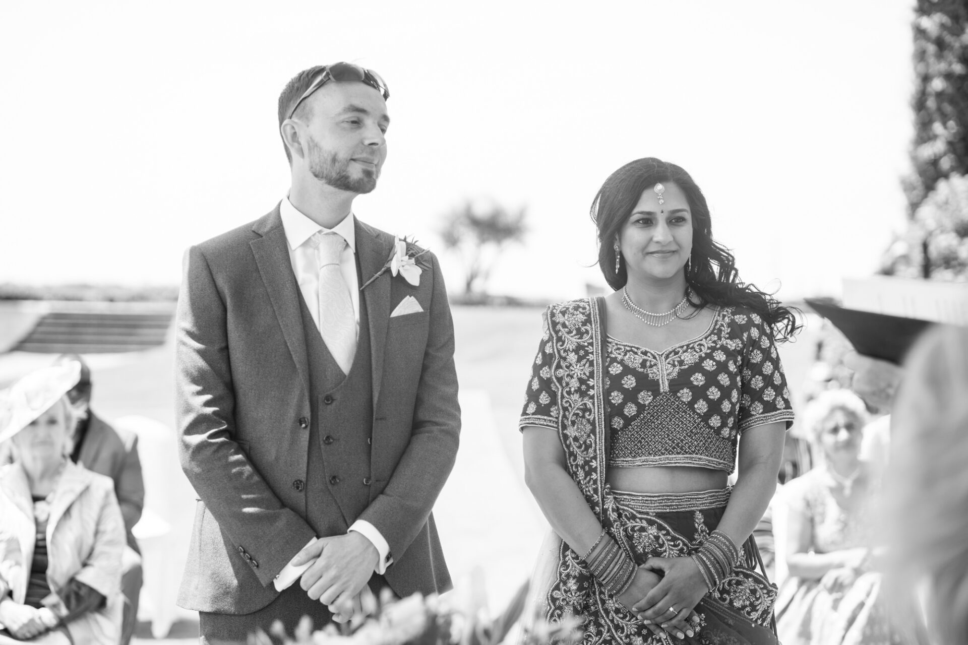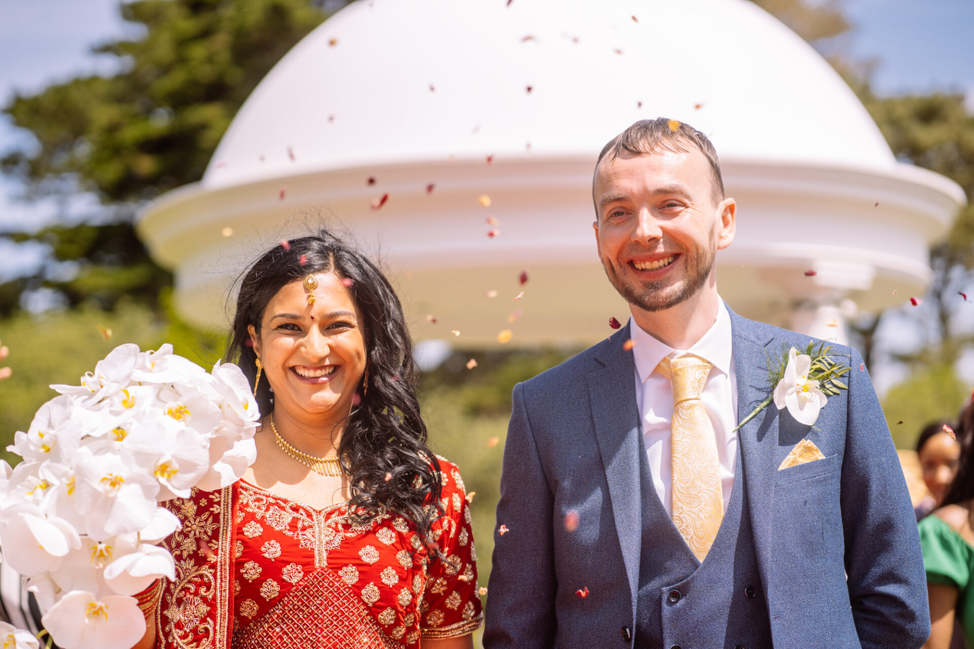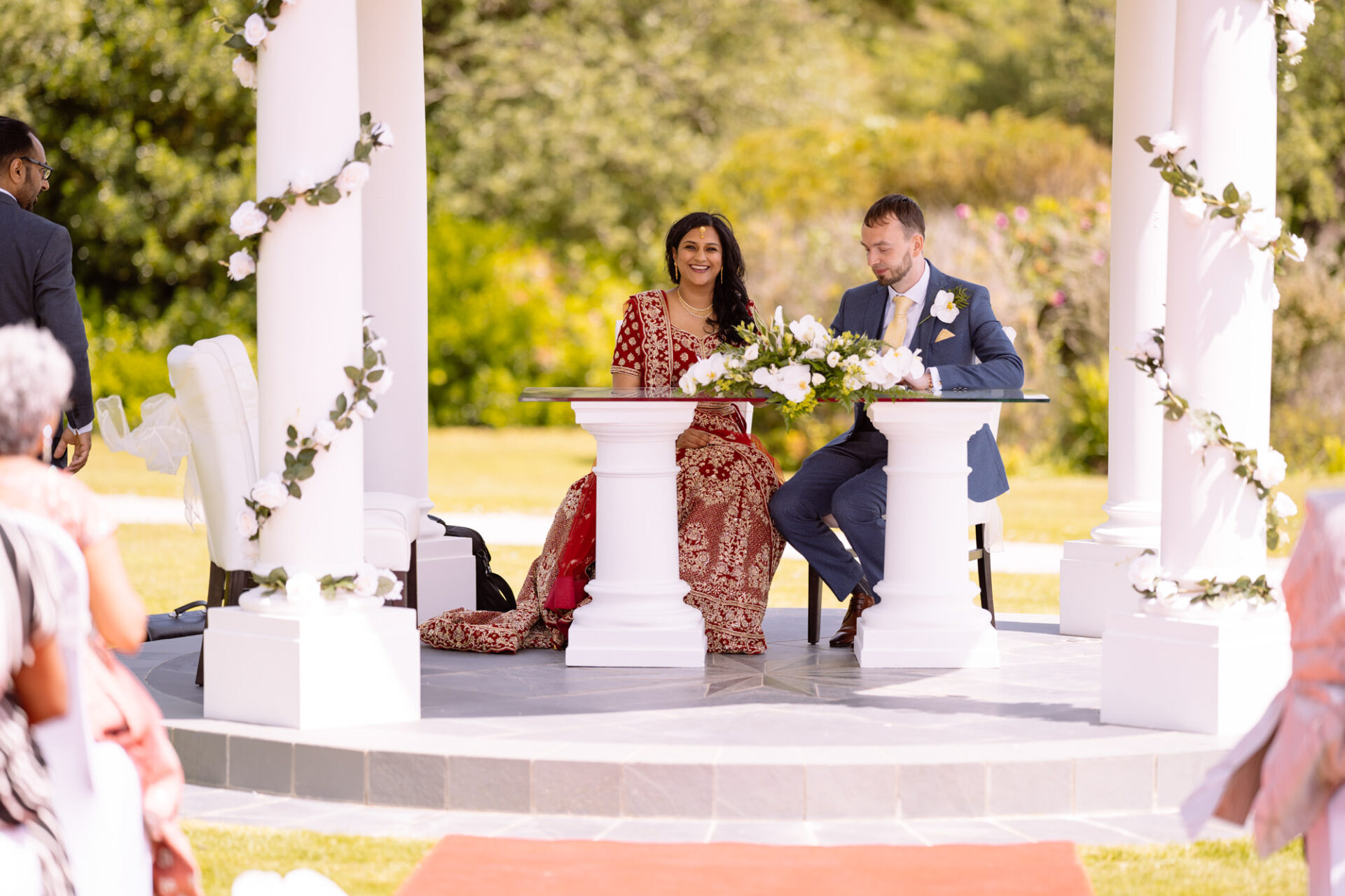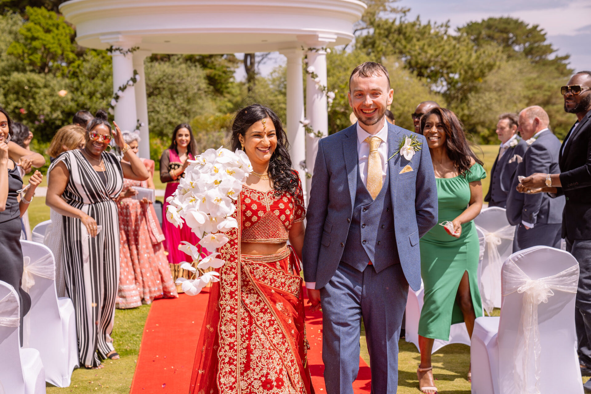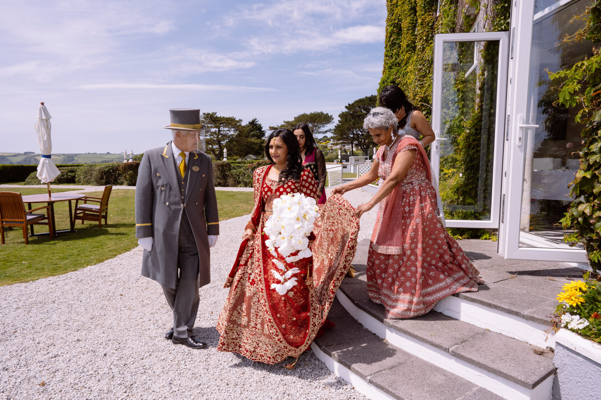 The Carlyon Bay Hotel has quite simply the most stunning gardens. Words like, lush, green, idyllic don’t really do them justice. Therefore, maybe you shold just picture a National Trust sub-tropical type scenario. Now add in a white stone pillared dome under which wedding ceremonies take place. Put all this into a scene with an ivy covered hotel as the backdrop. Next, add in a red carpet acting as an aisle. There you have the arena that met Ruby’s eyes as she exited the Hotel with her mother and bridesmaids. Almost all was perfect. I say almost as although we had wall-to-wall sunshine, there was a gusty wind blowing in from the sea. At certain points during the ceremony, hotel staff had to wrestle the red carpet as if it was an angry snake!