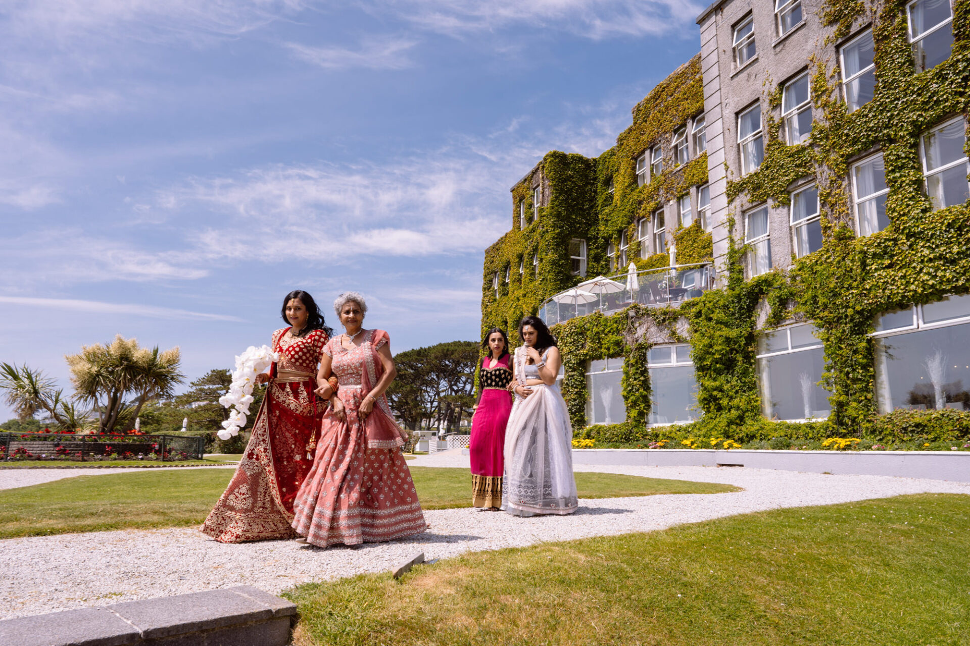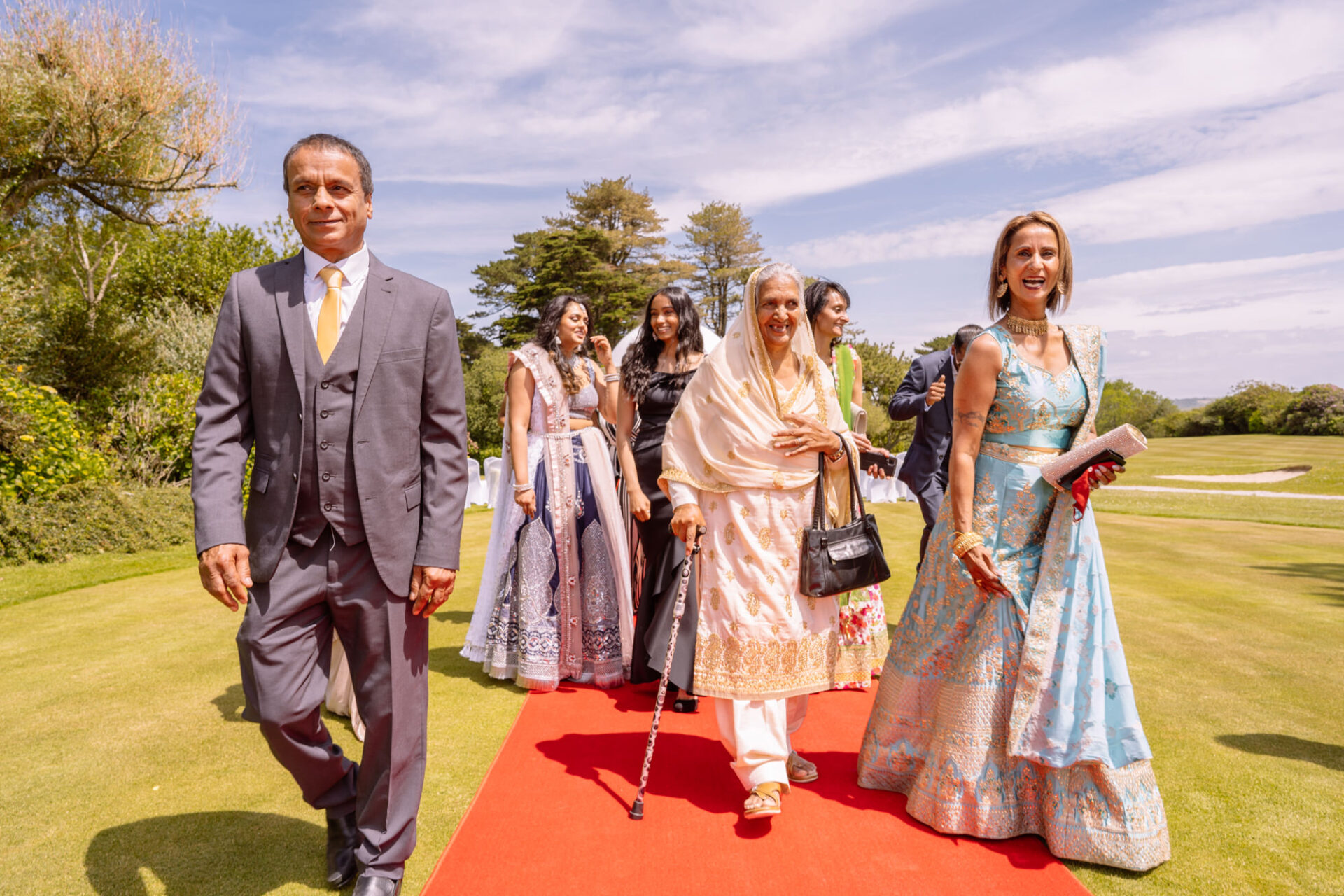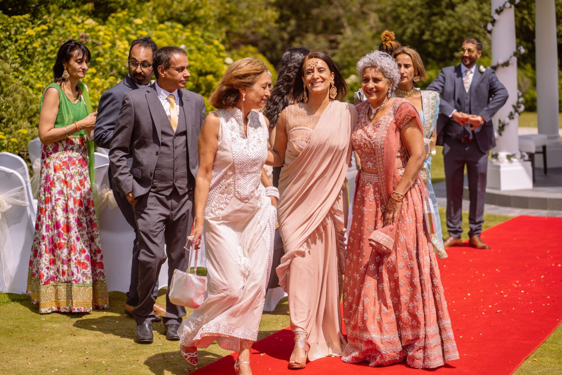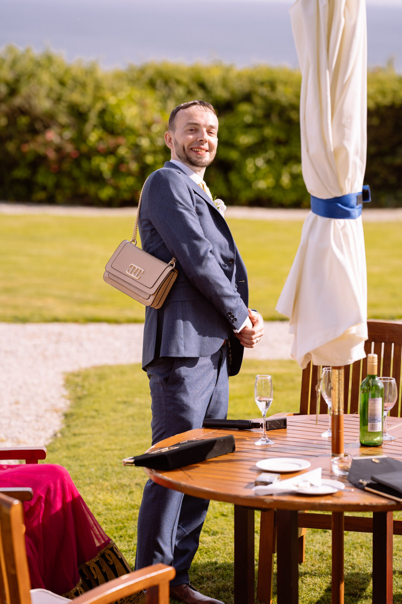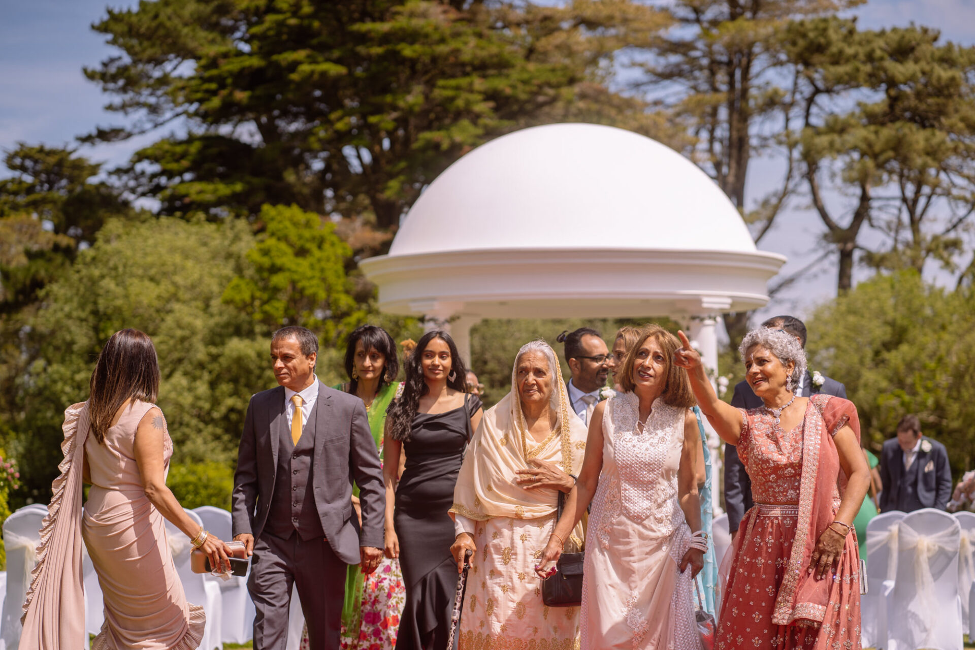 The Carlyon Bay Hotel has quite simply the most stunning gardens. Words like, lush, green, idyllic don’t really do them justice. Therefore, maybe you shold just picture a National Trust sub-tropical type scenario. Now add in a white stone pillared dome under which wedding ceremonies take place. Put all this into a scene with an ivy covered hotel as the backdrop. Next, add in a red carpet acting as an aisle. There you have the arena that met Ruby’s eyes as she exited the Hotel with her mother and bridesmaids. Almost all was perfect. I say almost as although we had wall-to-wall sunshine, there was a gusty wind blowing in from the sea. At certain points during the ceremony, hotel staff had to wrestle the red carpet as if it was an angry snake!