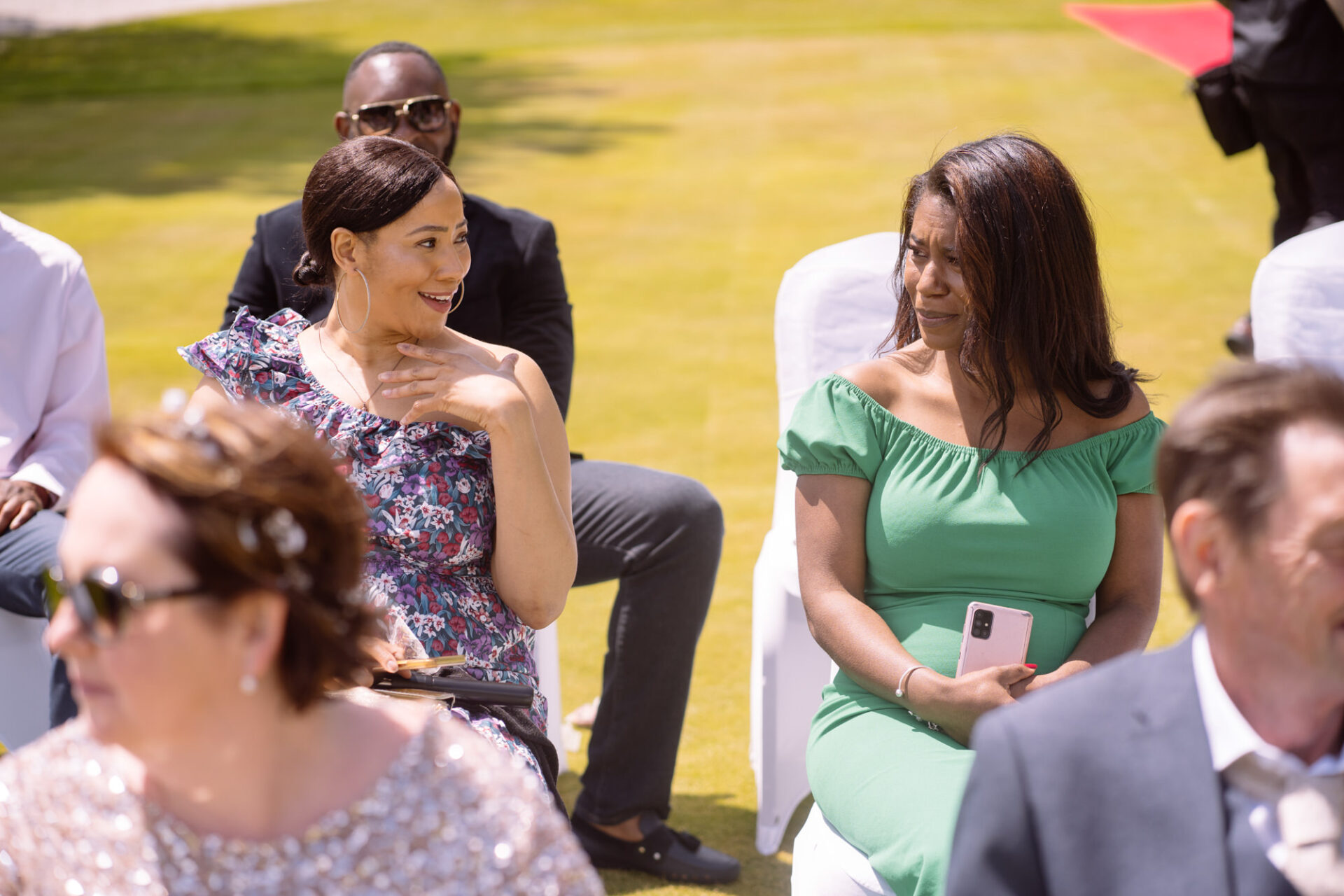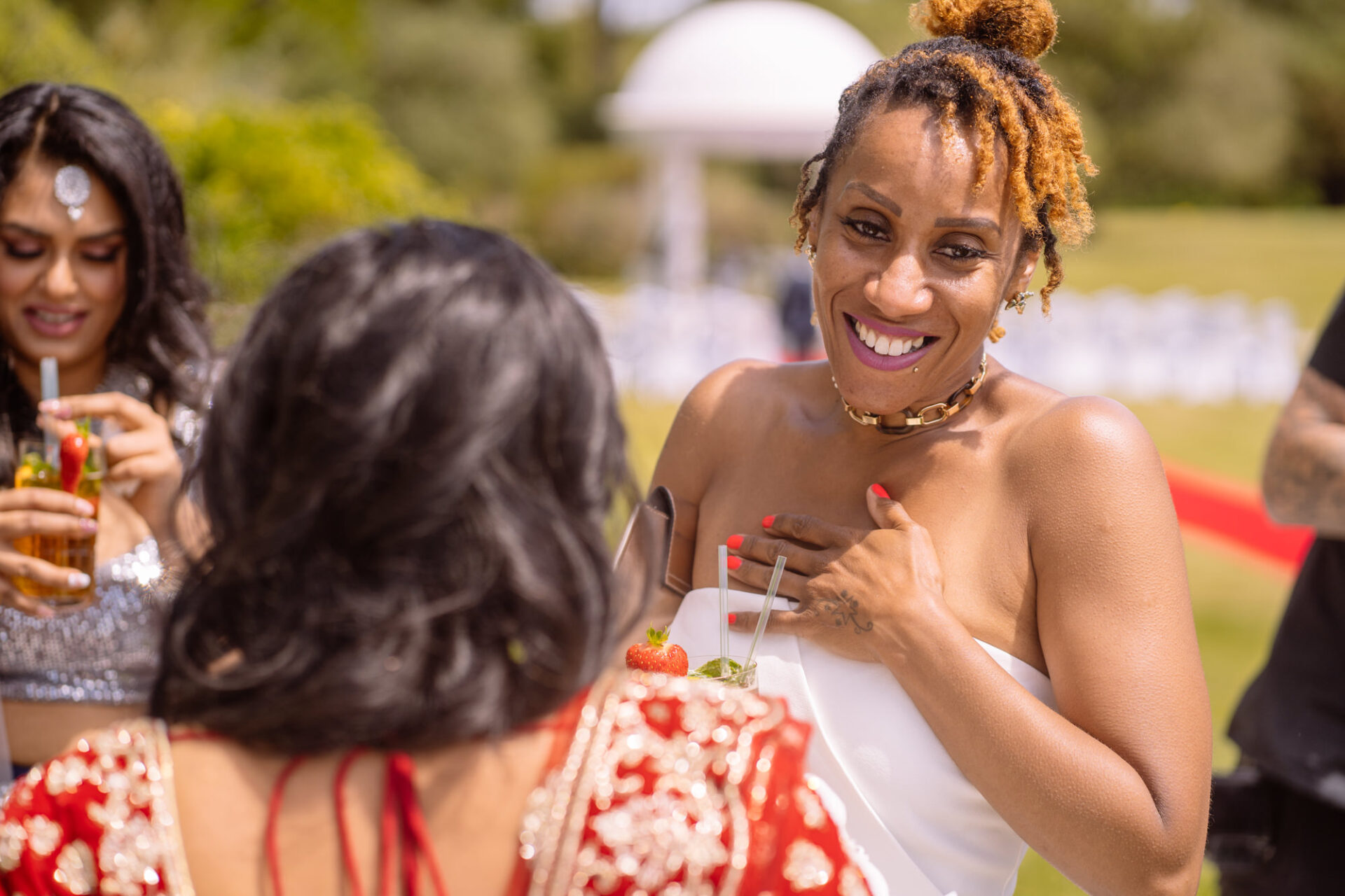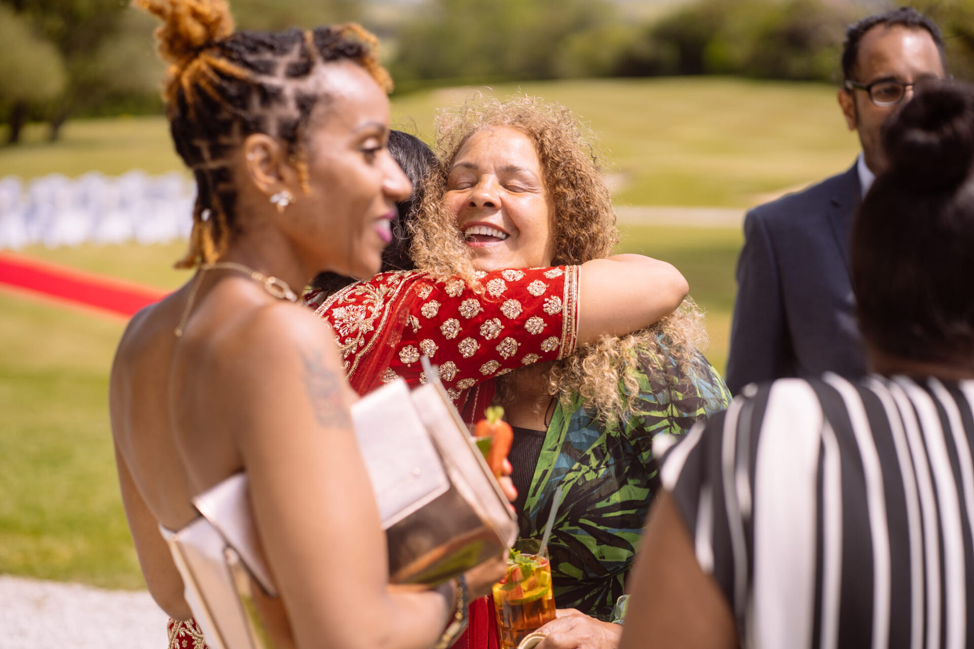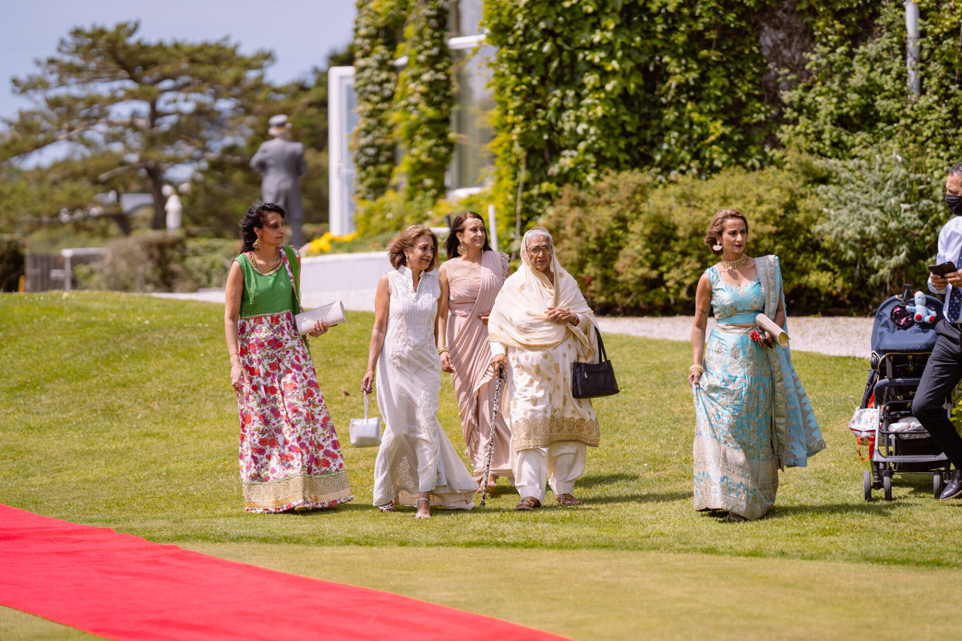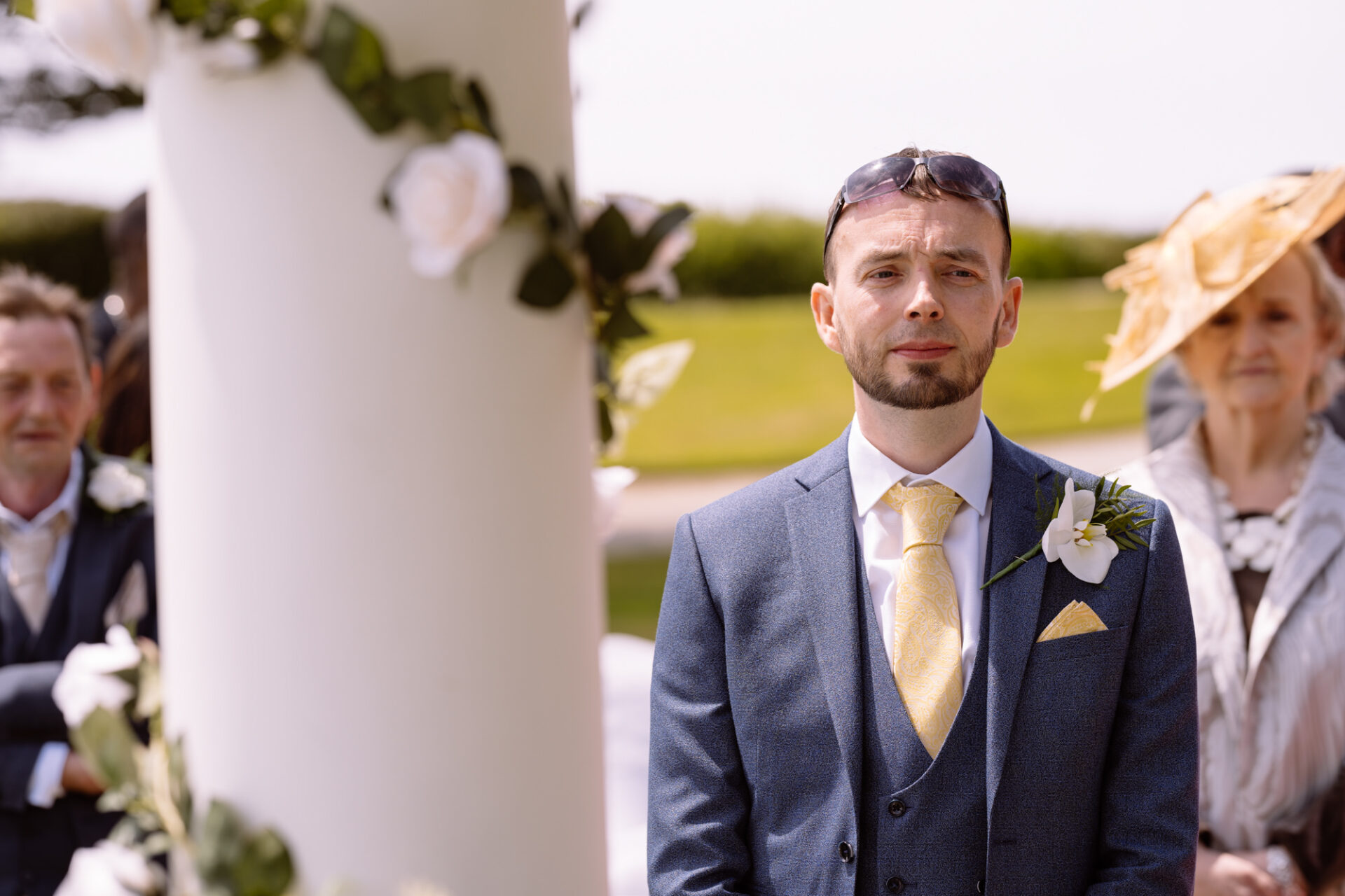 The Carlyon Bay Hotel has quite simply the most stunning gardens. Words like, lush, green, idyllic don’t really do them justice. Therefore, maybe you shold just picture a National Trust sub-tropical type scenario. Now add in a white stone pillared dome under which wedding ceremonies take place. Put all this into a scene with an ivy covered hotel as the backdrop. Next, add in a red carpet acting as an aisle. There you have the arena that met Ruby’s eyes as she exited the Hotel with her mother and bridesmaids. Almost all was perfect. I say almost as although we had wall-to-wall sunshine, there was a gusty wind blowing in from the sea. At certain points during the ceremony, hotel staff had to wrestle the red carpet as if it was an angry snake!