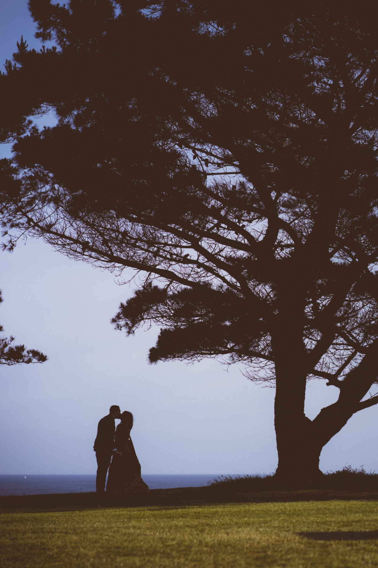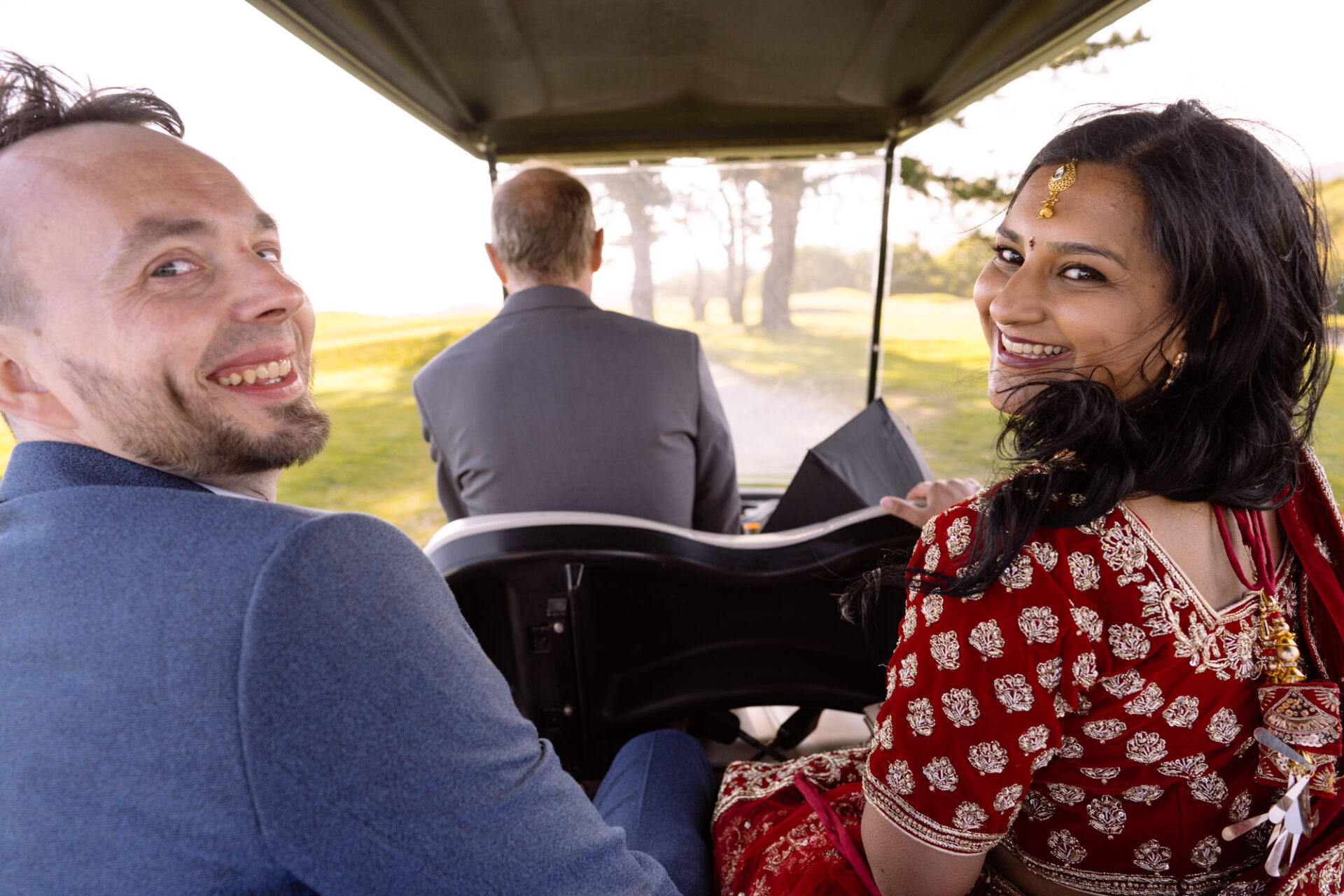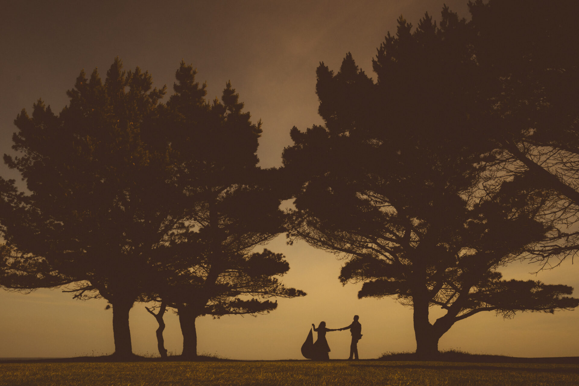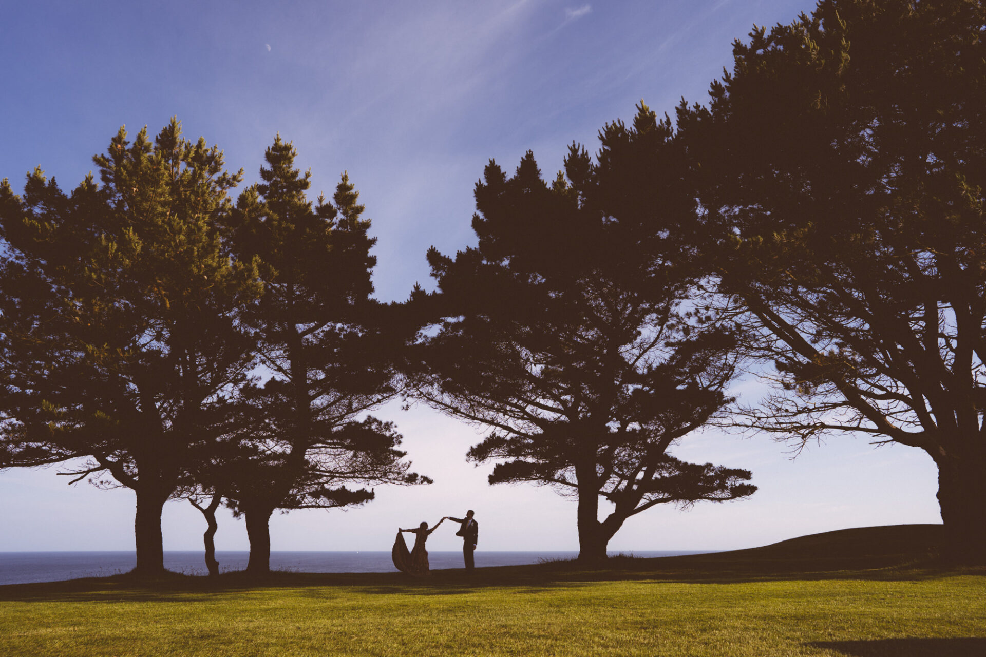 Most importantly, The Carlyon Bay Hotel has it’s own private beach. This was a must have for Ruby and David on their wedding day. Certainly, the buggy ride along the hotel’s golf course is a nice relaxing way for couples to decompress. On arrival, Ruby and David had fun frolicking* around on the rocks. It wasn’t until we were on our return journey that I called a halt half way up the 12th Hole par 5 fairway. I had seen a likely photo location for a silhouette shot under some trees on the cliff edge. Consequently, we blocked the fairway for 5 minutes whilst Ruby and David danced their hearts out!