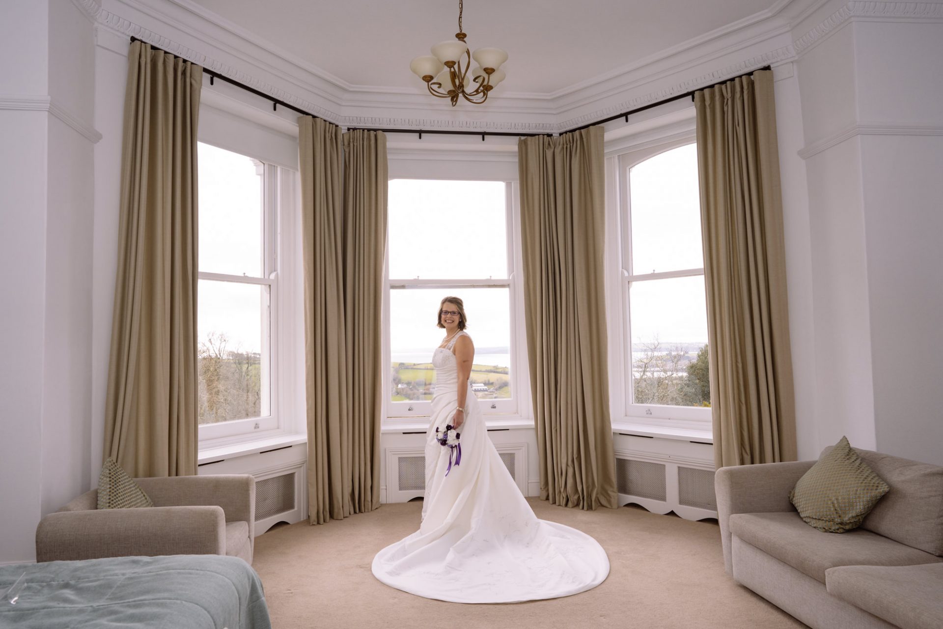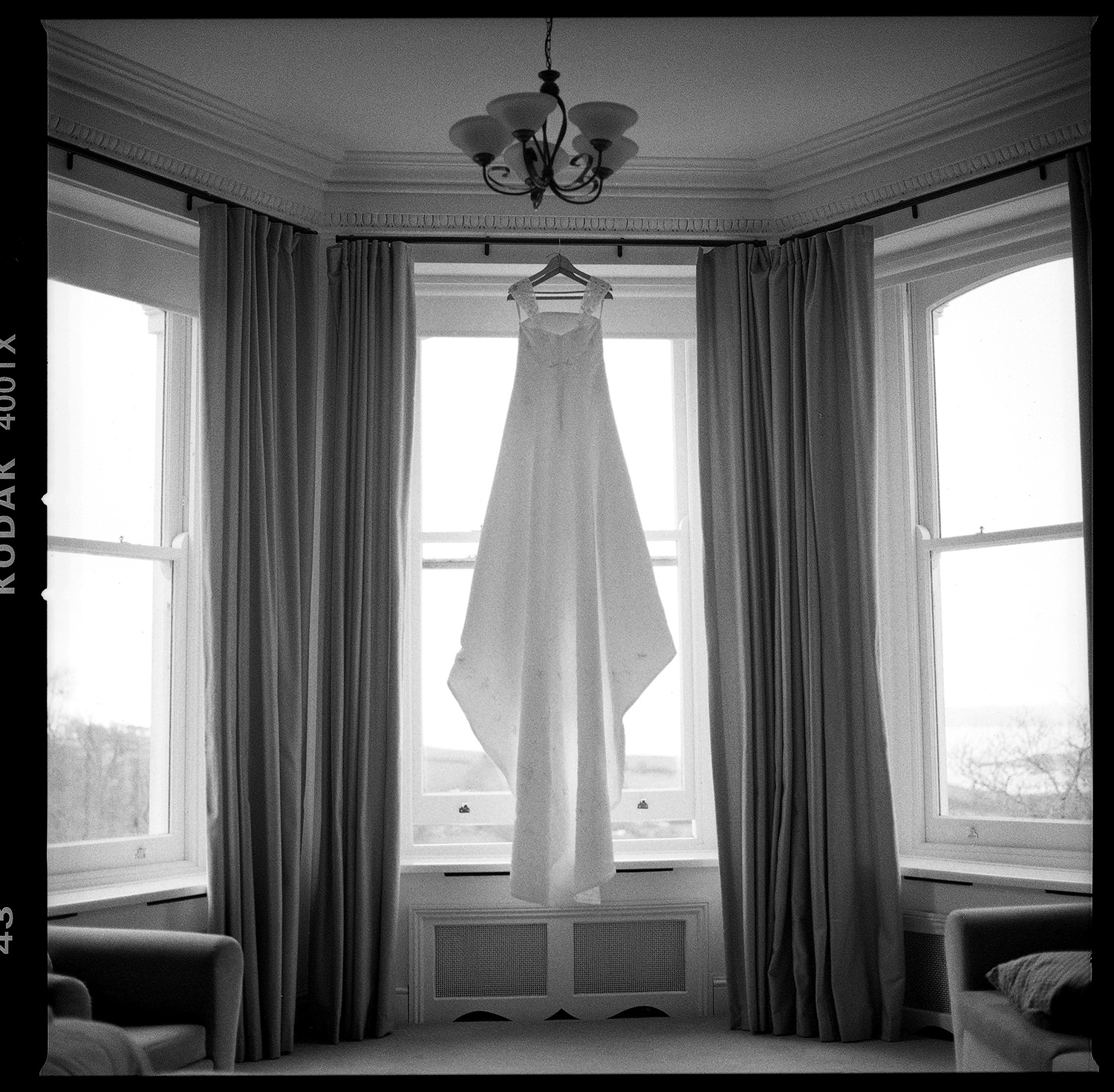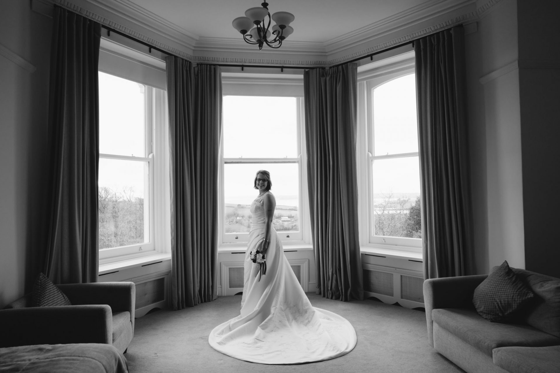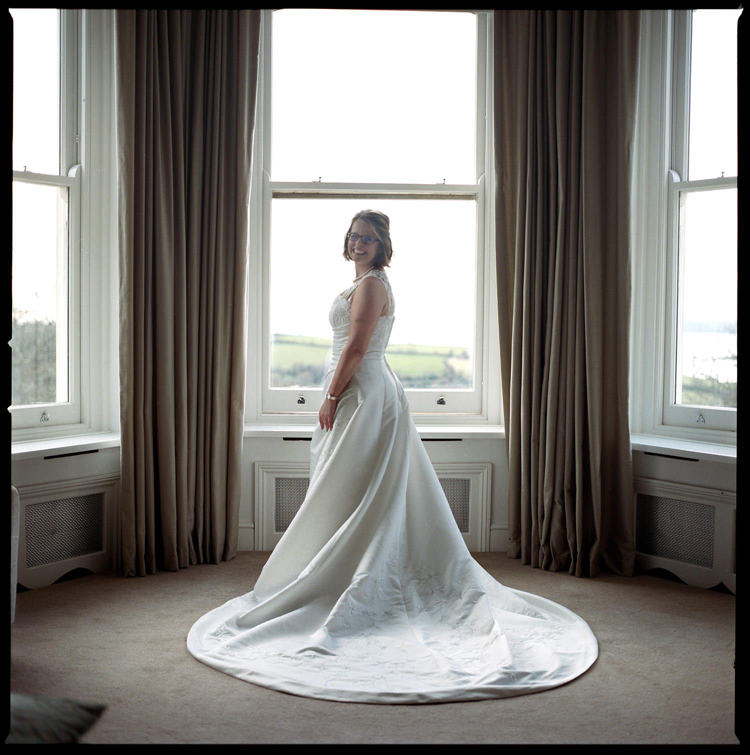 Meanwhile, Sam’s wedding preparations were contiuing with less hitches. I hung her dress in the stunning bay windows of the bridal suite which reaps beautiful light from across the St Austell bay. When Sam was ready, I shot her in her dress in the same spot using my Hasselbald camera and Black and White then Colour film. A Trenython Manor Wedding is special to say the least!