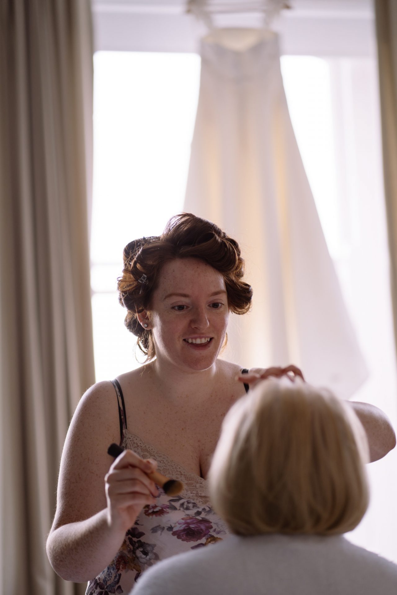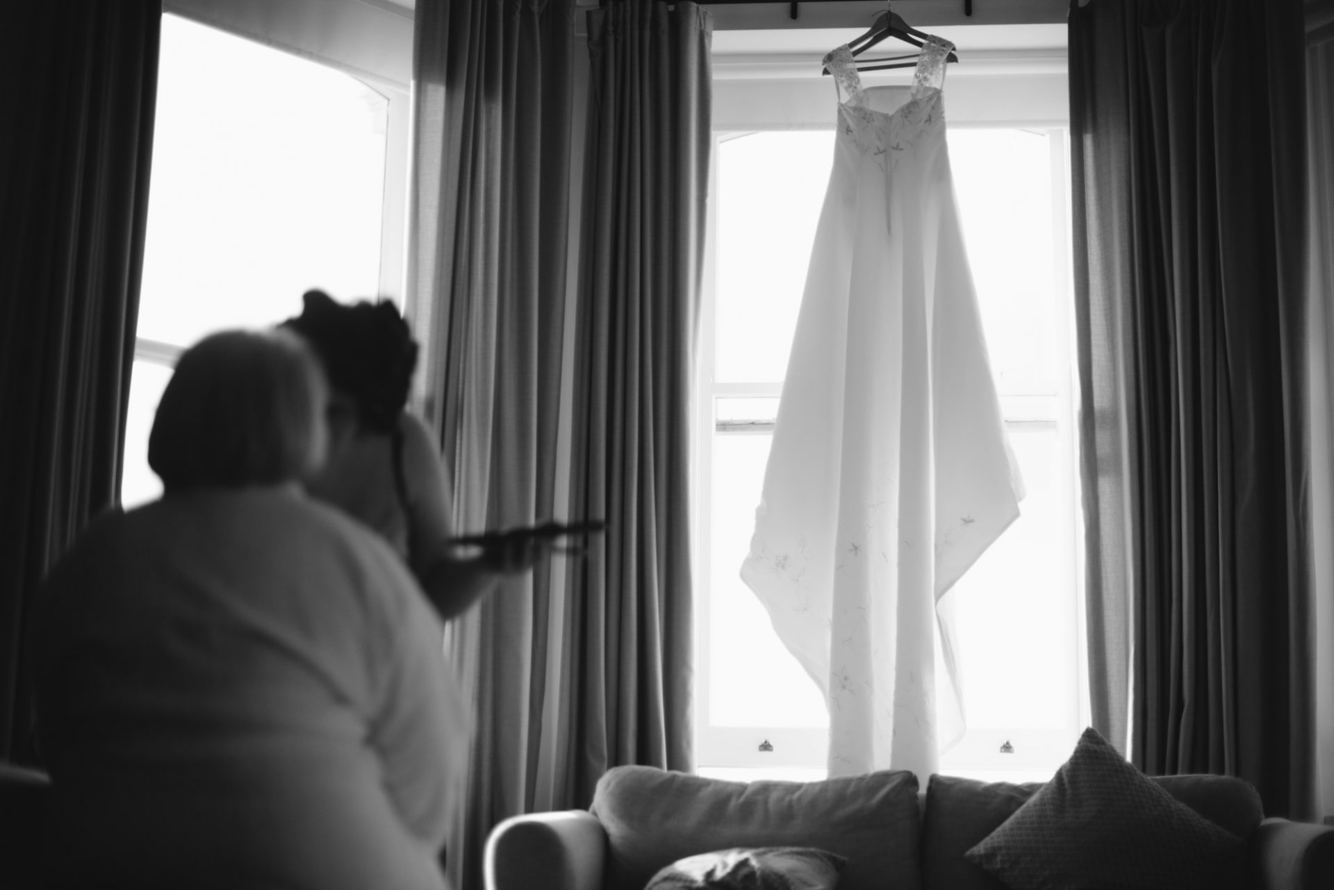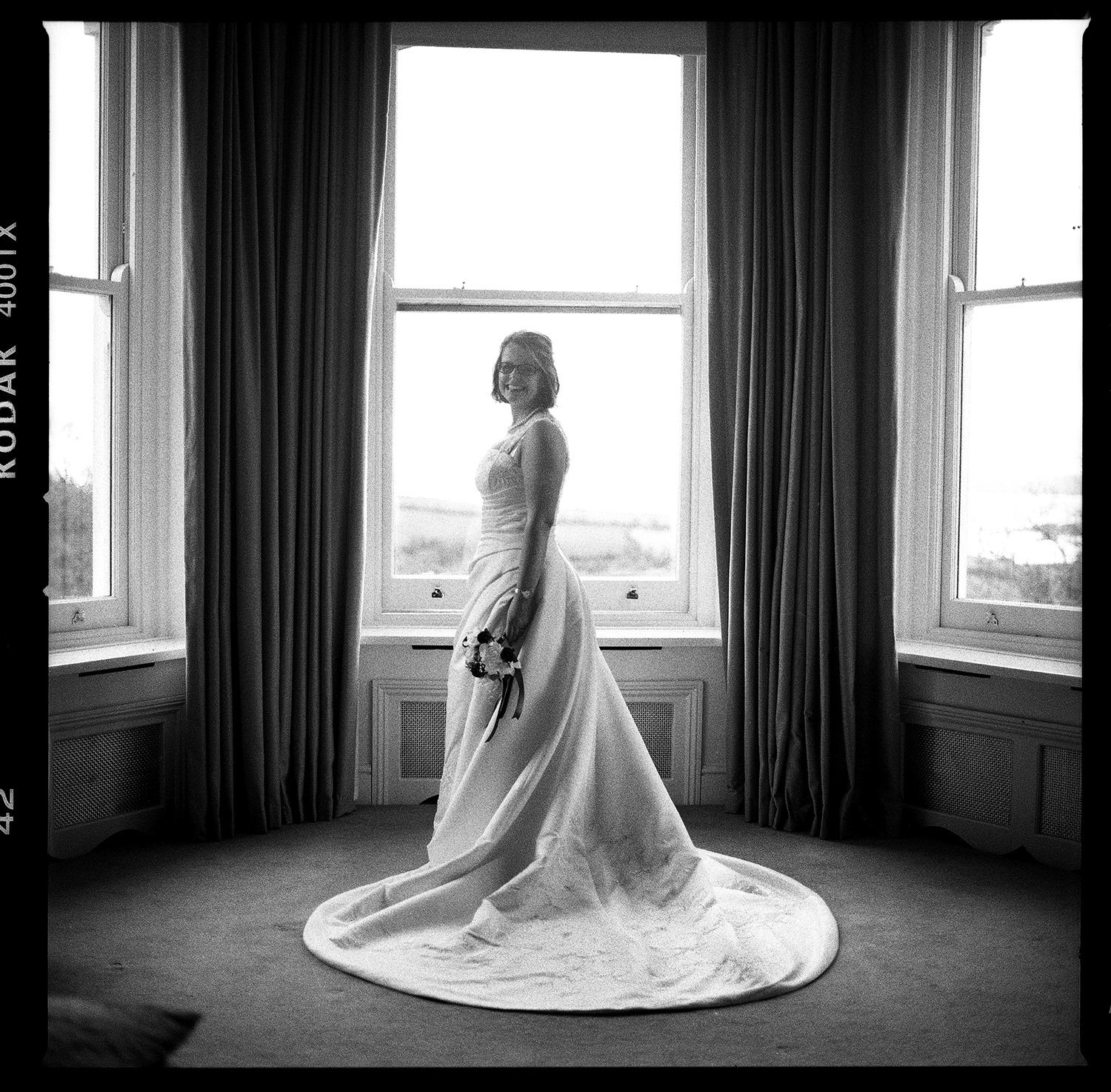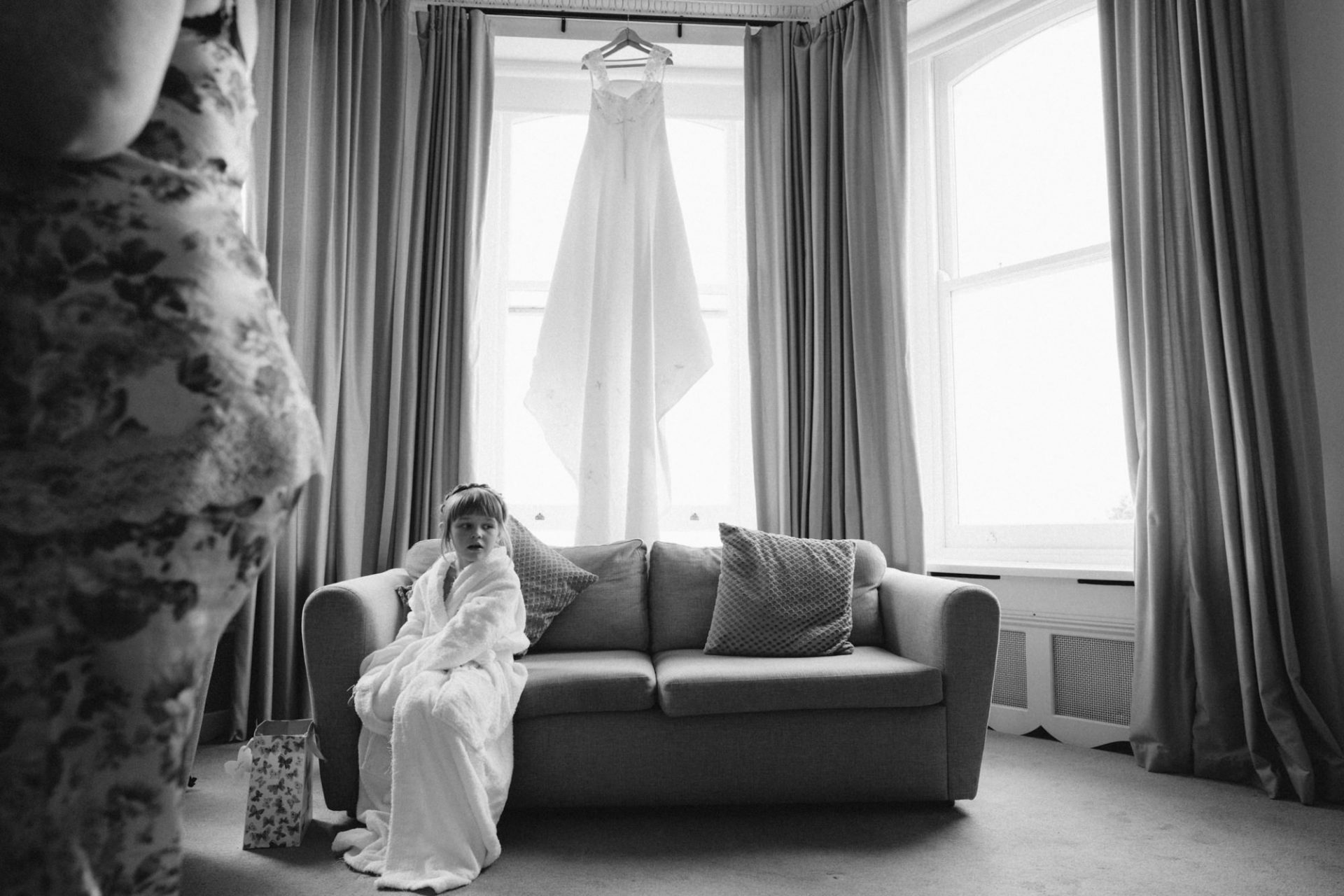 Meanwhile, Sam’s wedding preparations were contiuing with less hitches. I hung her dress in the stunning bay windows of the bridal suite which reaps beautiful light from across the St Austell bay. When Sam was ready, I shot her in her dress in the same spot using my Hasselbald camera and Black and White then Colour film. A Trenython Manor Wedding is special to say the least!