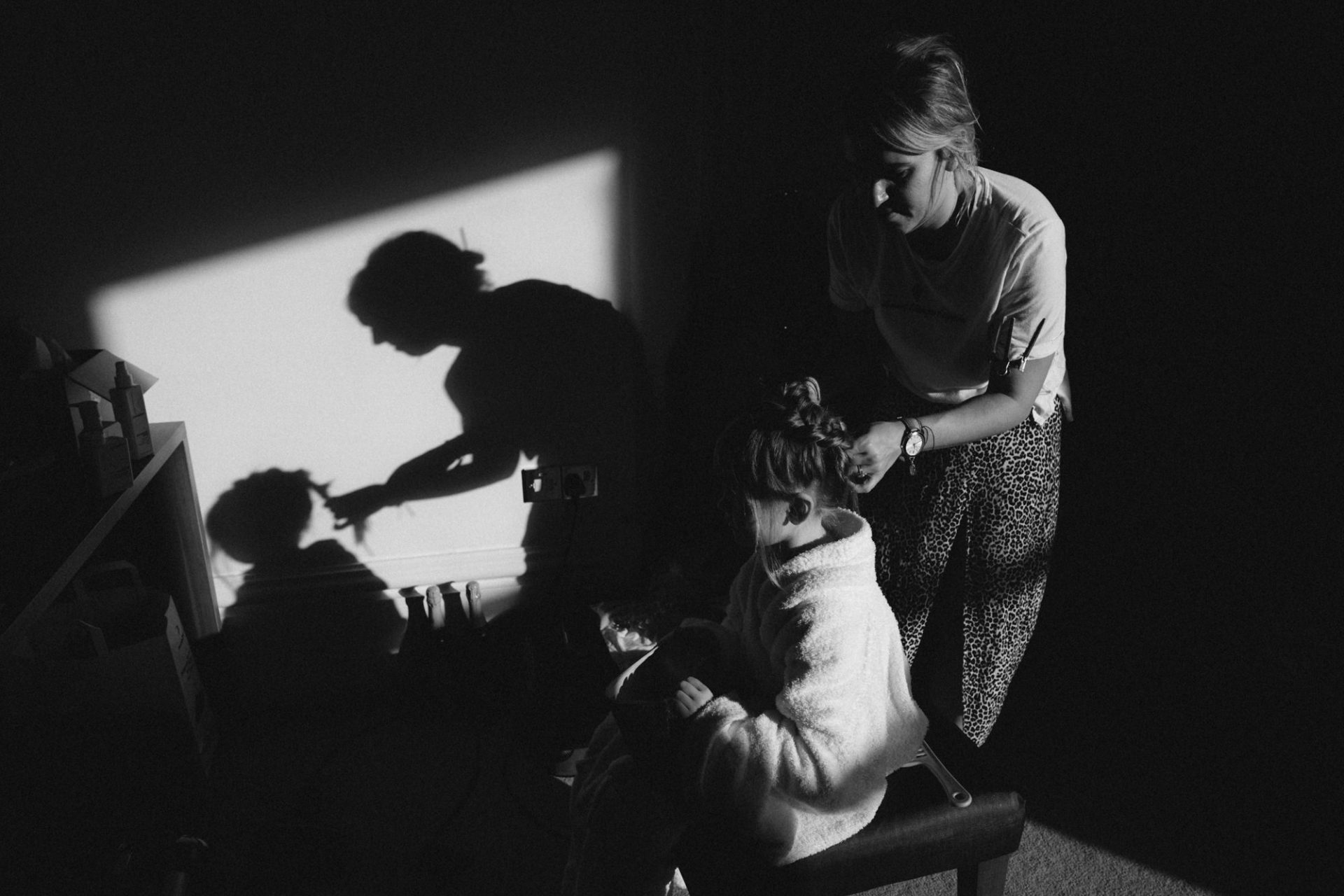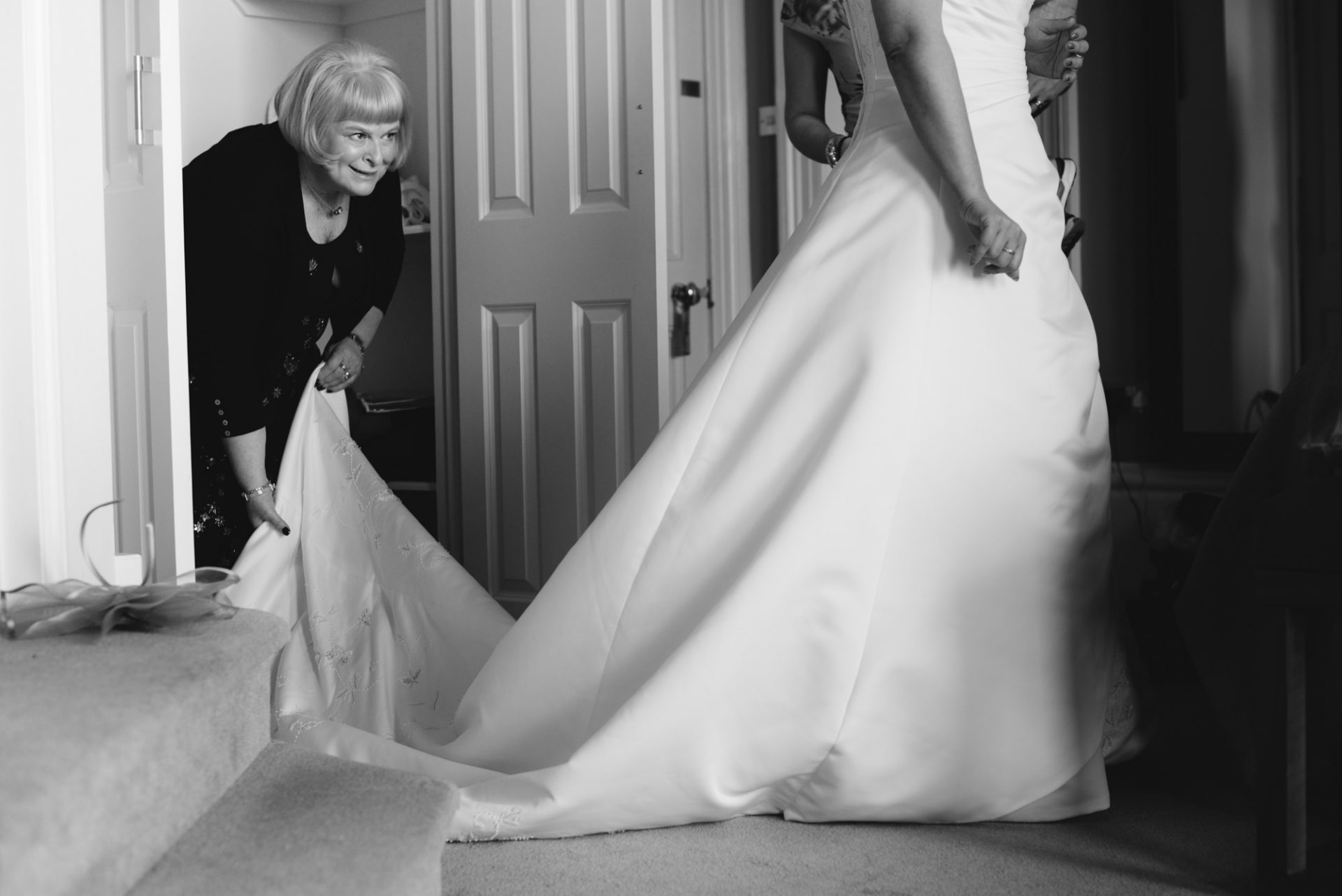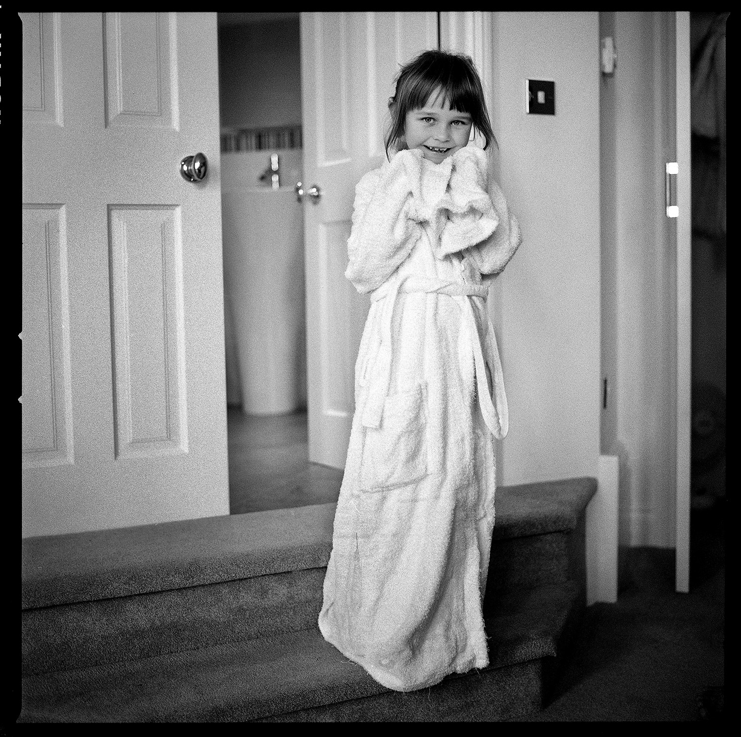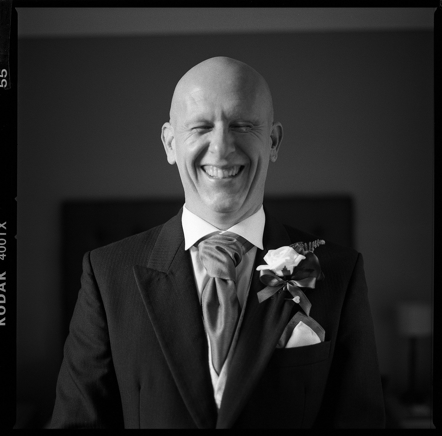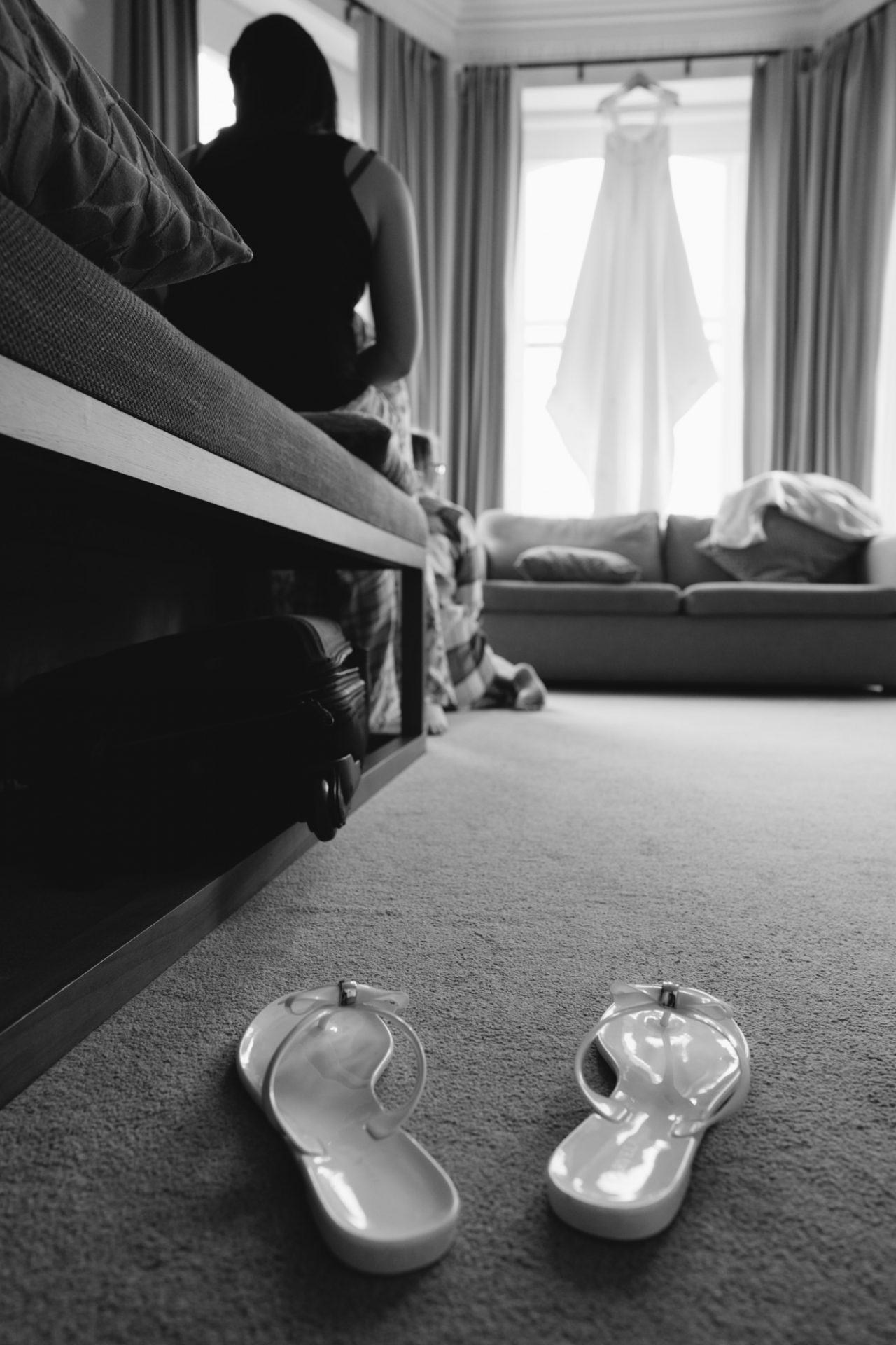 Meanwhile, Sam’s wedding preparations were contiuing with less hitches. I hung her dress in the stunning bay windows of the bridal suite which reaps beautiful light from across the St Austell bay. When Sam was ready, I shot her in her dress in the same spot using my Hasselbald camera and Black and White then Colour film. A Trenython Manor Wedding is special to say the least!
