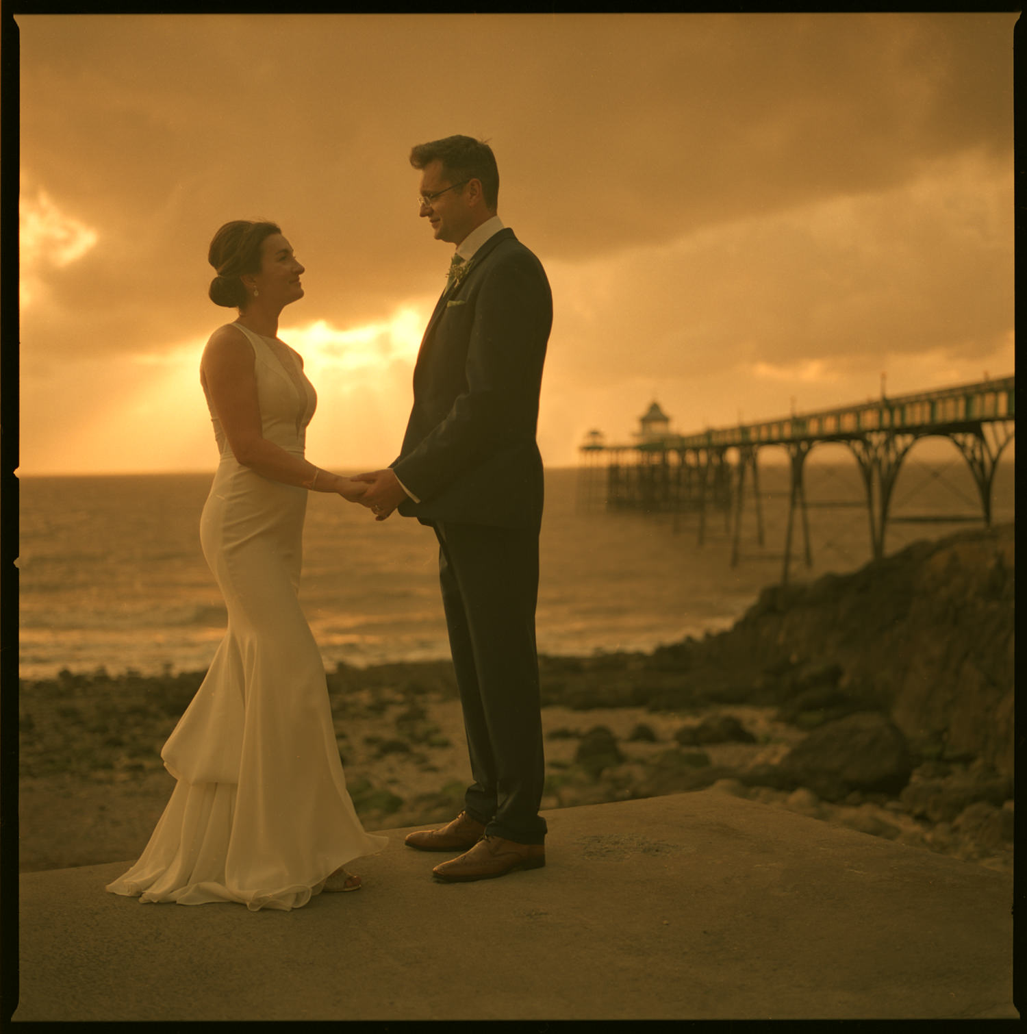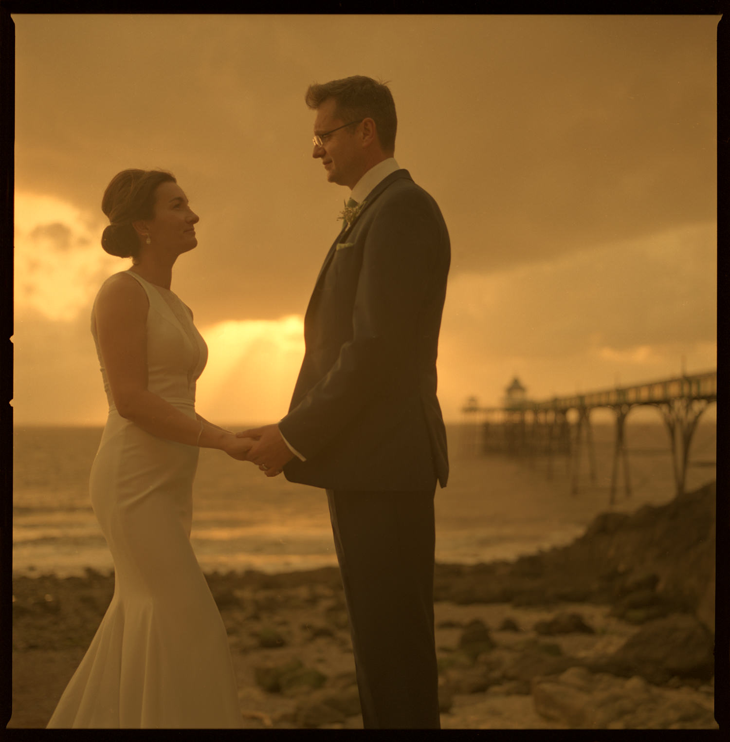 Matt rushed off to get his van and I grabbed the lighting equipment. I almost bundled the delighted and slightly breathless couple into the back and we were off! The pier was still closed, but that didn’t matter as it was still an awesome backdrop, especially with the dramatic sky and sunset. Matt and added our touches of camera and lighting magic. As a result, the shots we got look like stills from a movie! After that, I broke out my Hasselblad medium format film cameraand grabbed a last couple of images as the sun sunk belwo the horizon.