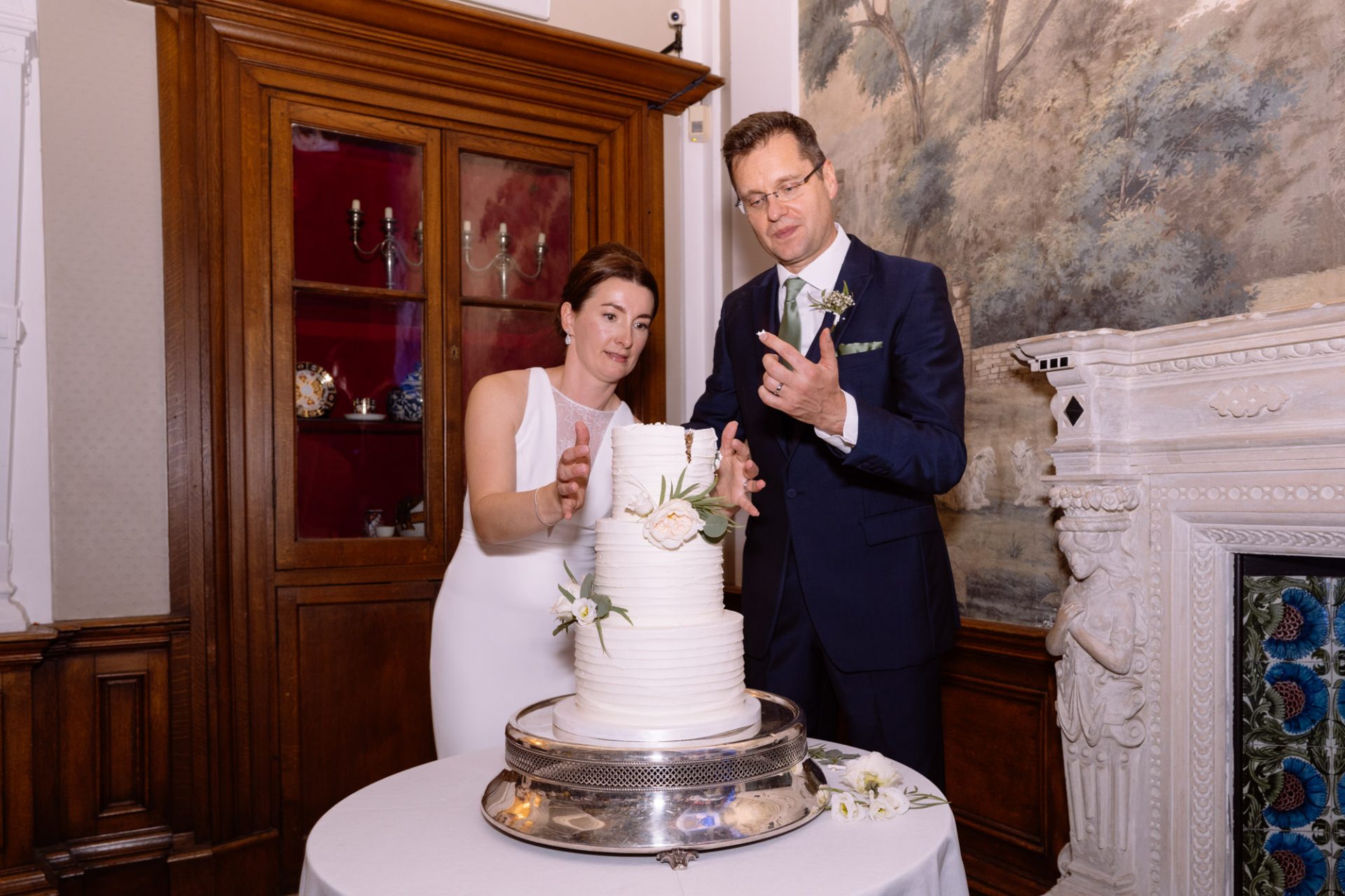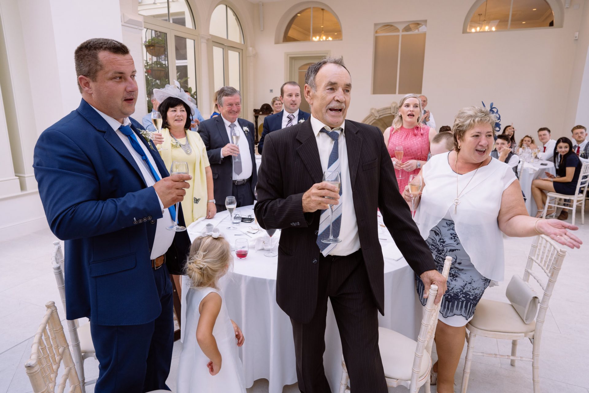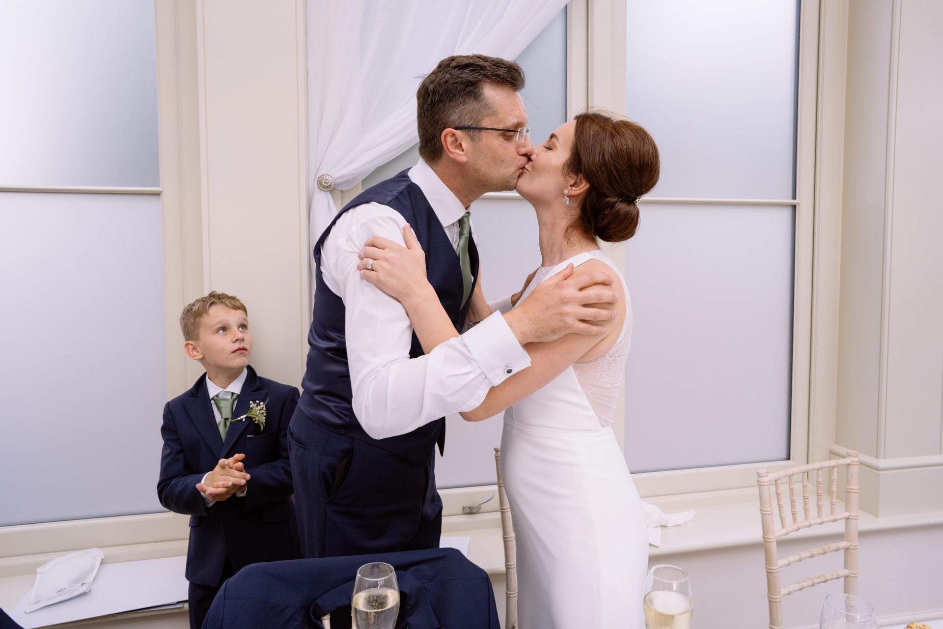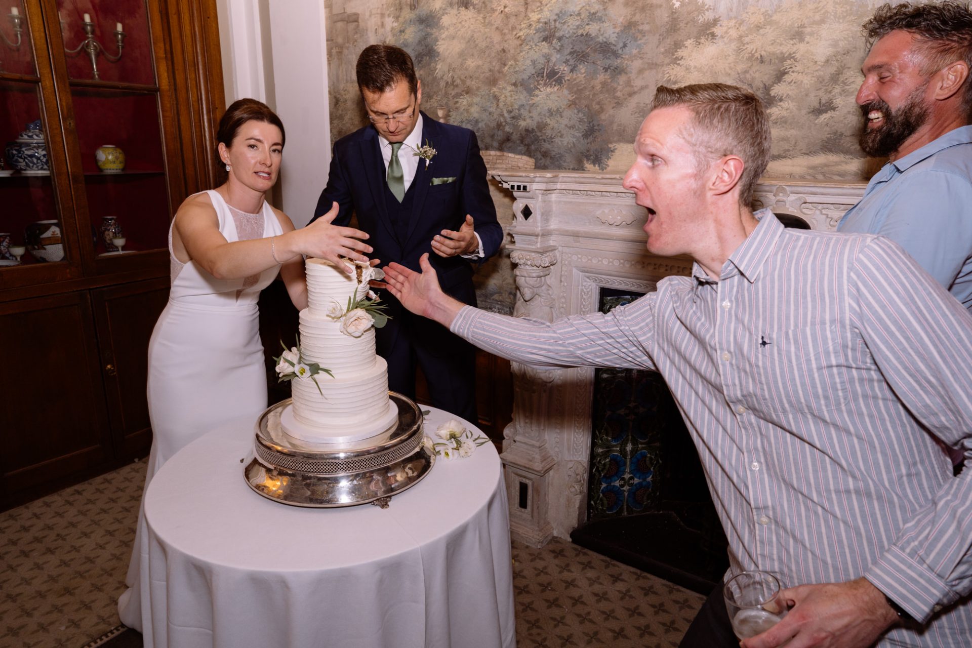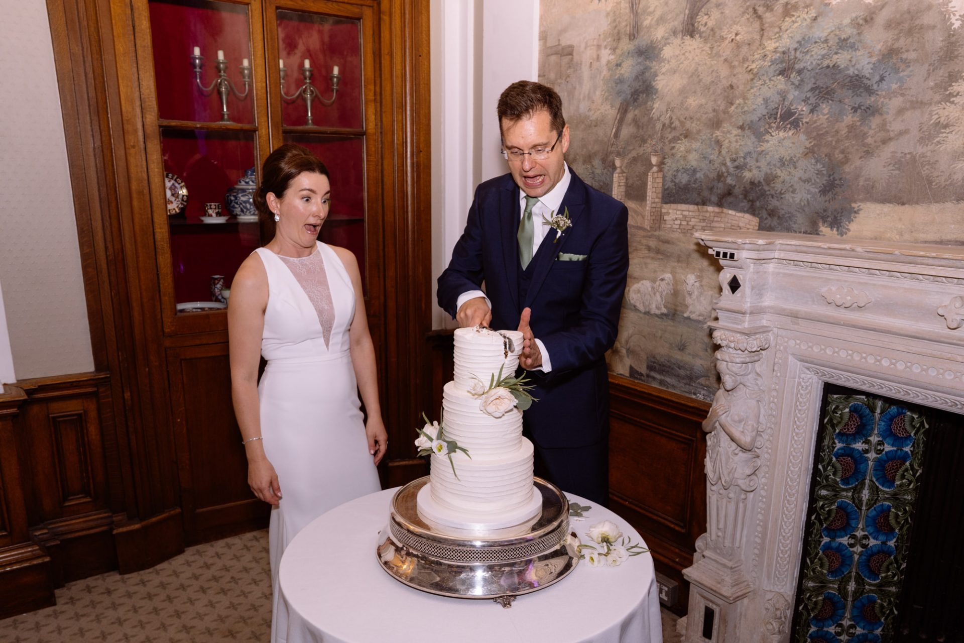 On a high from our pier shoot, Zuzanna, James, Matt and I returned to Clevedon Hall. After they had changed and made their big entrance, the first dance ensued. This went without a hitch, with James performing lifts that Torvill and Dean would have been proud of! However, it was during the cutting of the cake that proceedings took a turn for the worse. I snapped away as Zuzanna and James posed with the cake knife placed delicately atop the third tier. Their smiles radiated around the adoring onlookers. Therefore, when the actual incision was made no one expected the cake to wobble violently and almost disintegrate! Thankfully the staff were on hand to help avert disaster and distribute cake to the masses. I kept shooting throughout, capturing some amusing documentary images for the final edit.